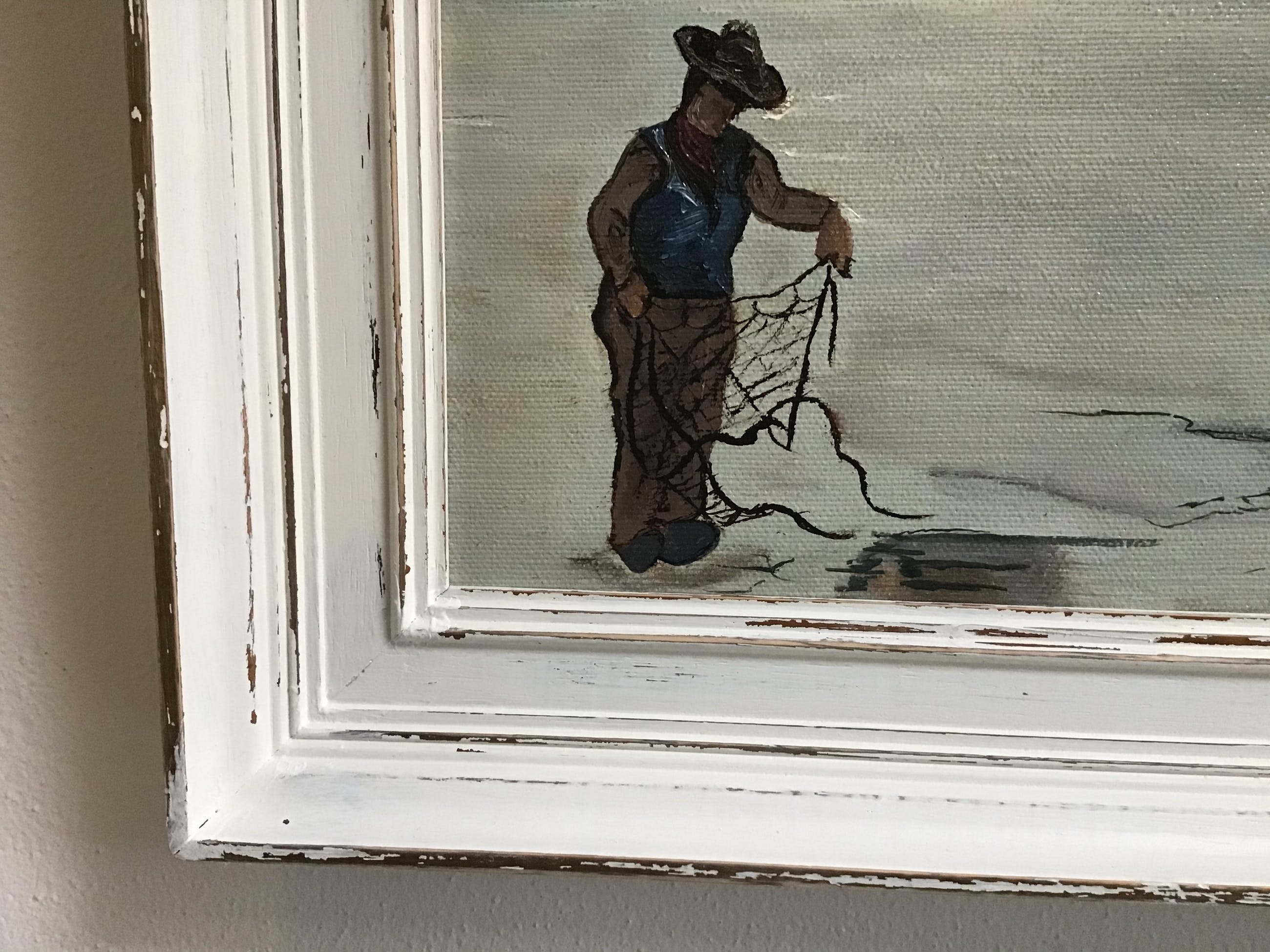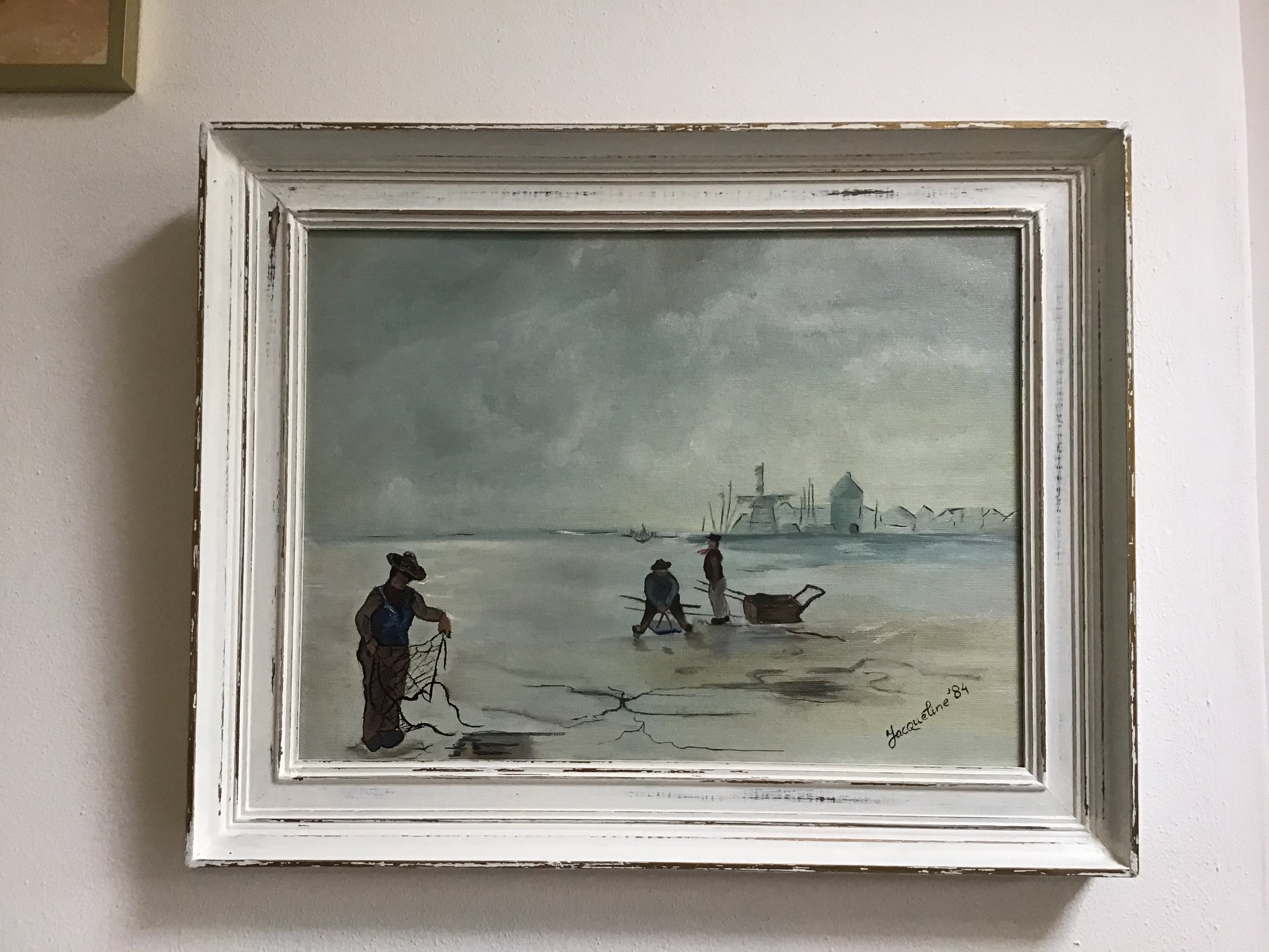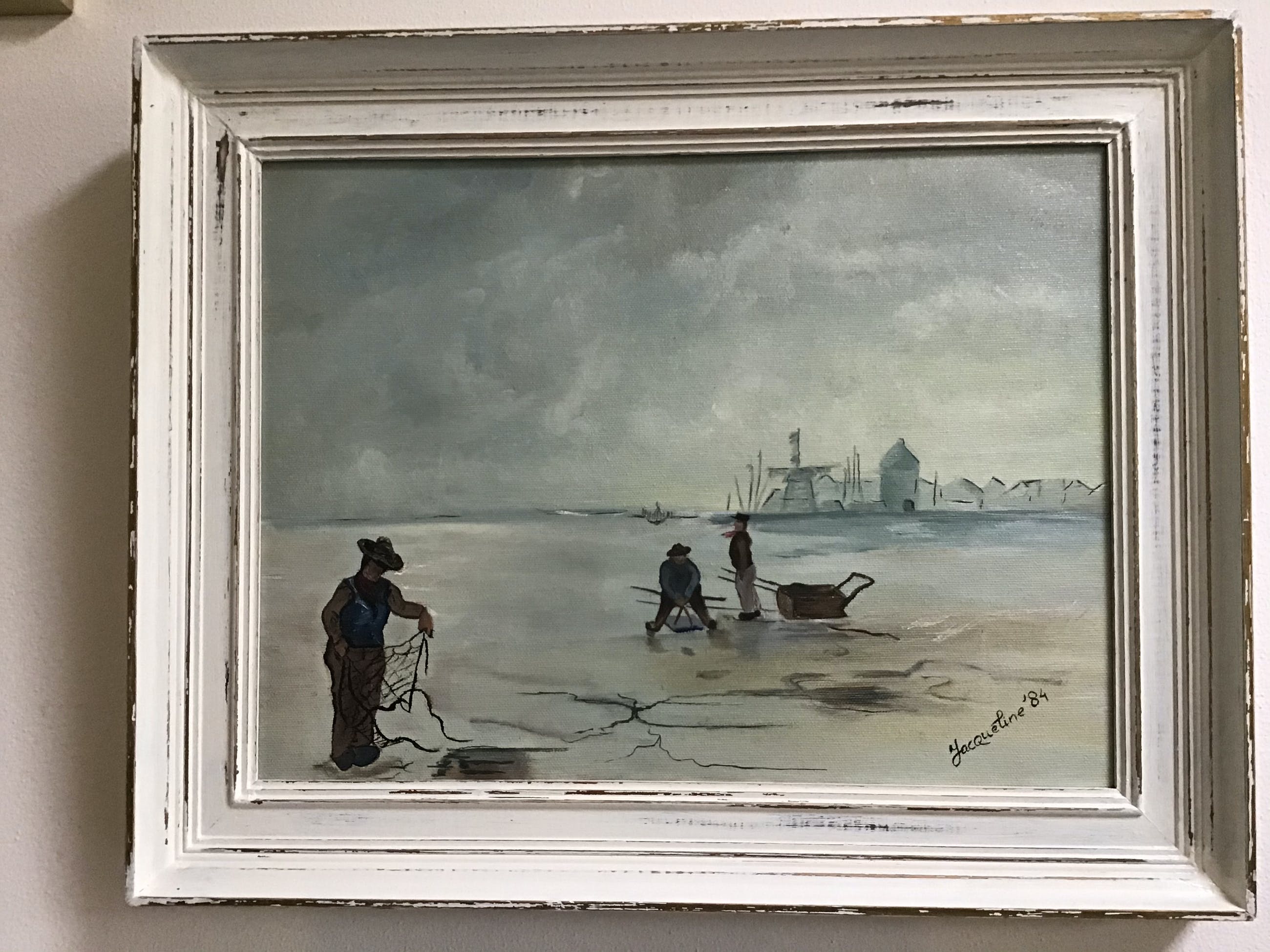 Ijsvissers op een Hollands water. Sfeervol winterlandschapje. Misschien ook mooi in een rustige lijst. Welke Jacqueline de maakster is weet ik niet.