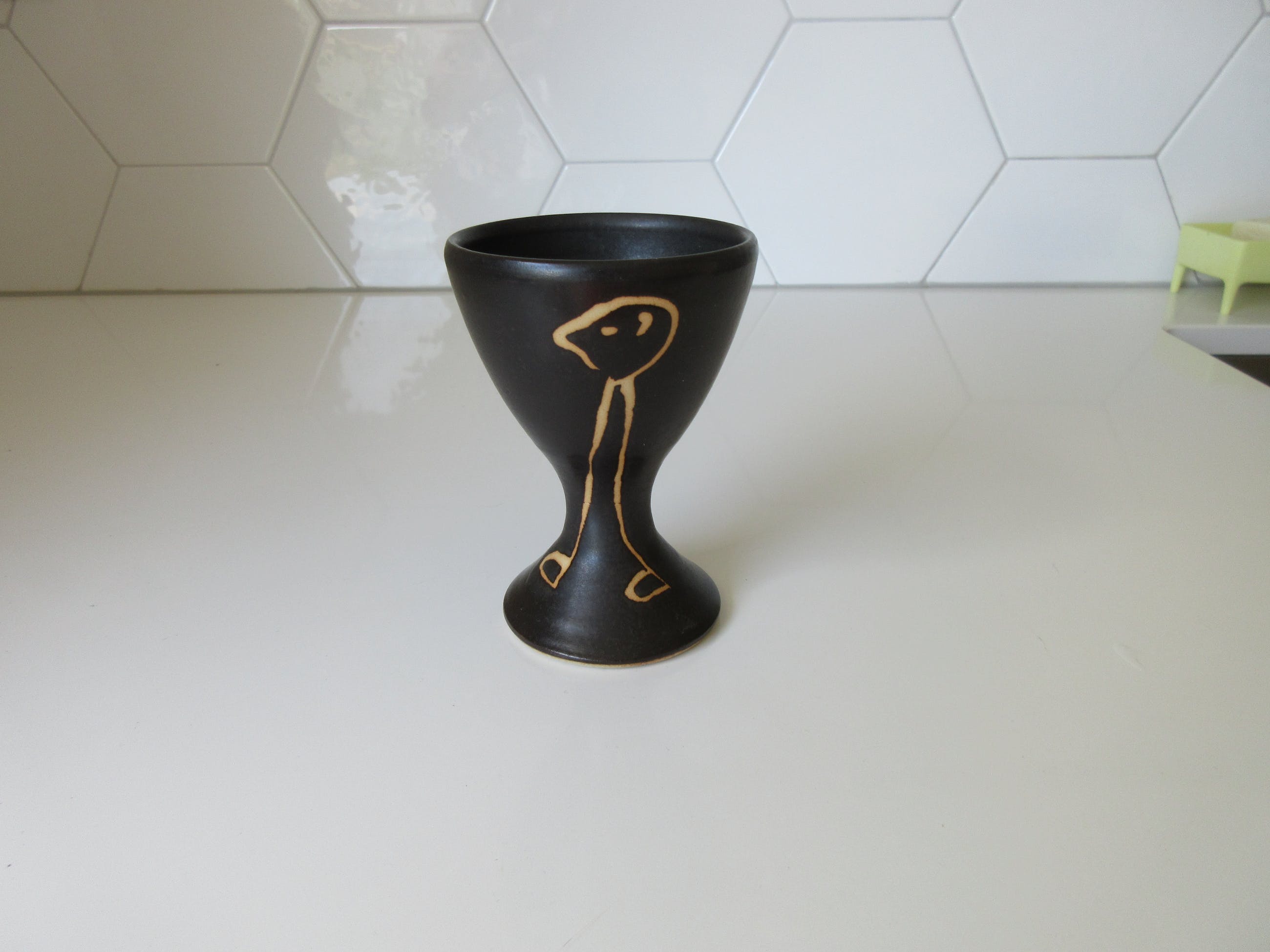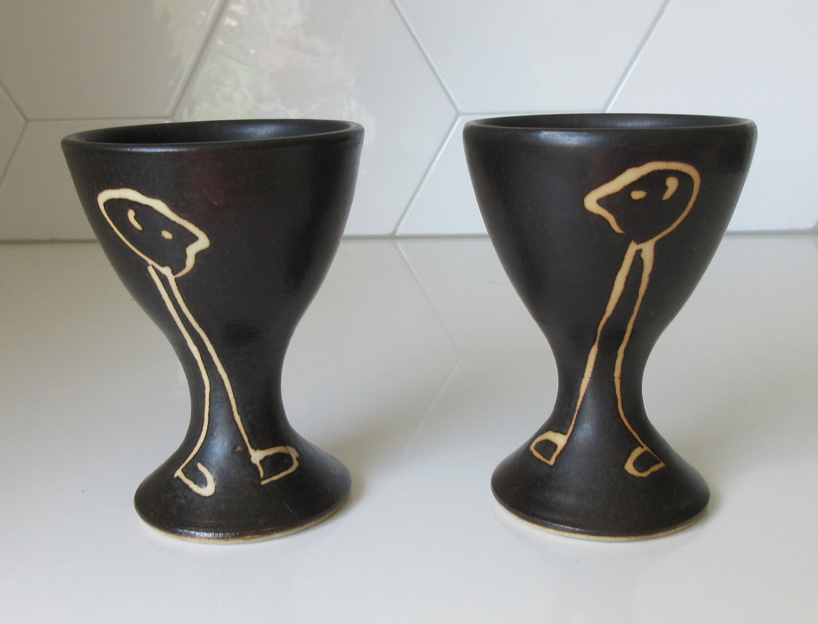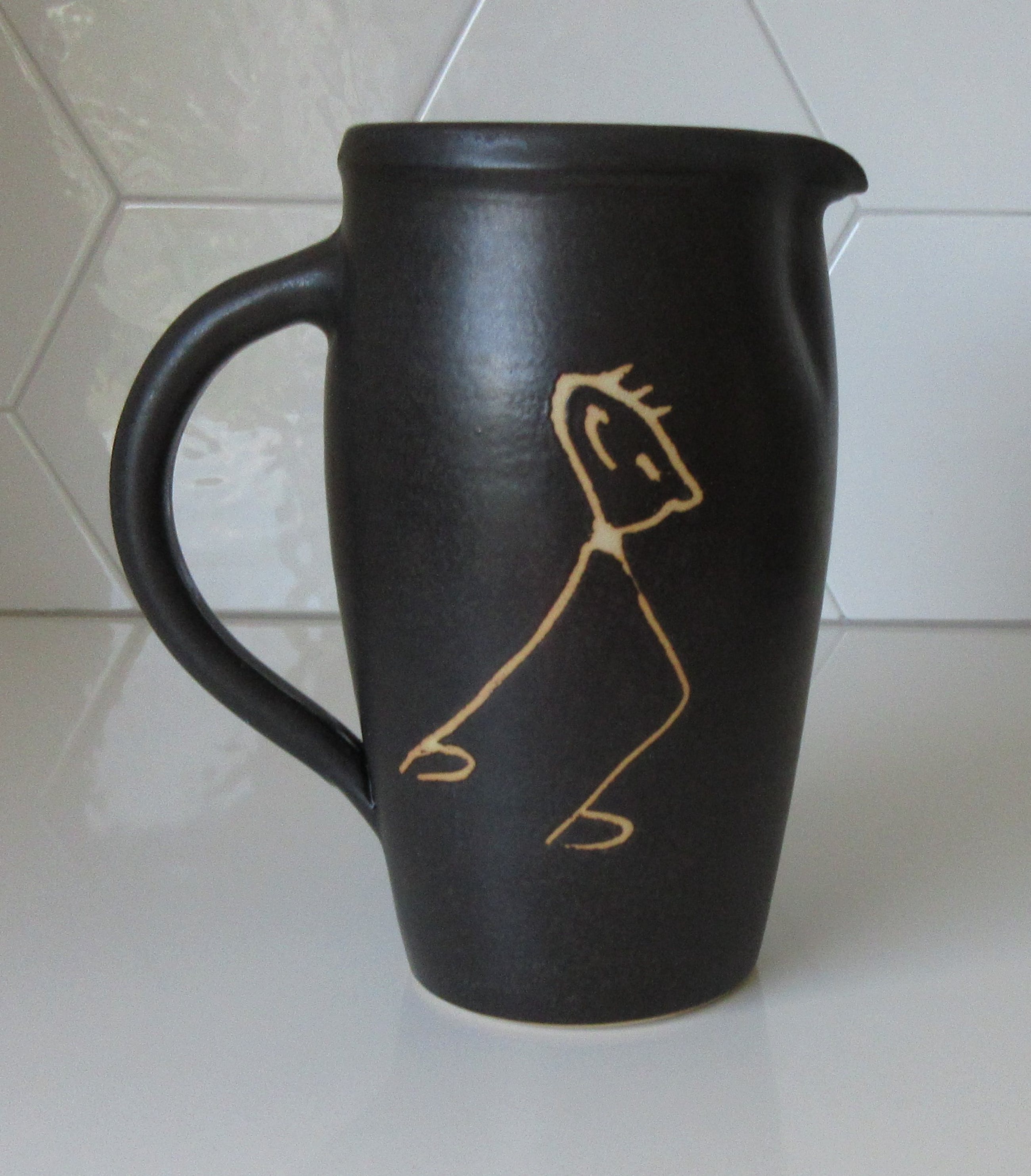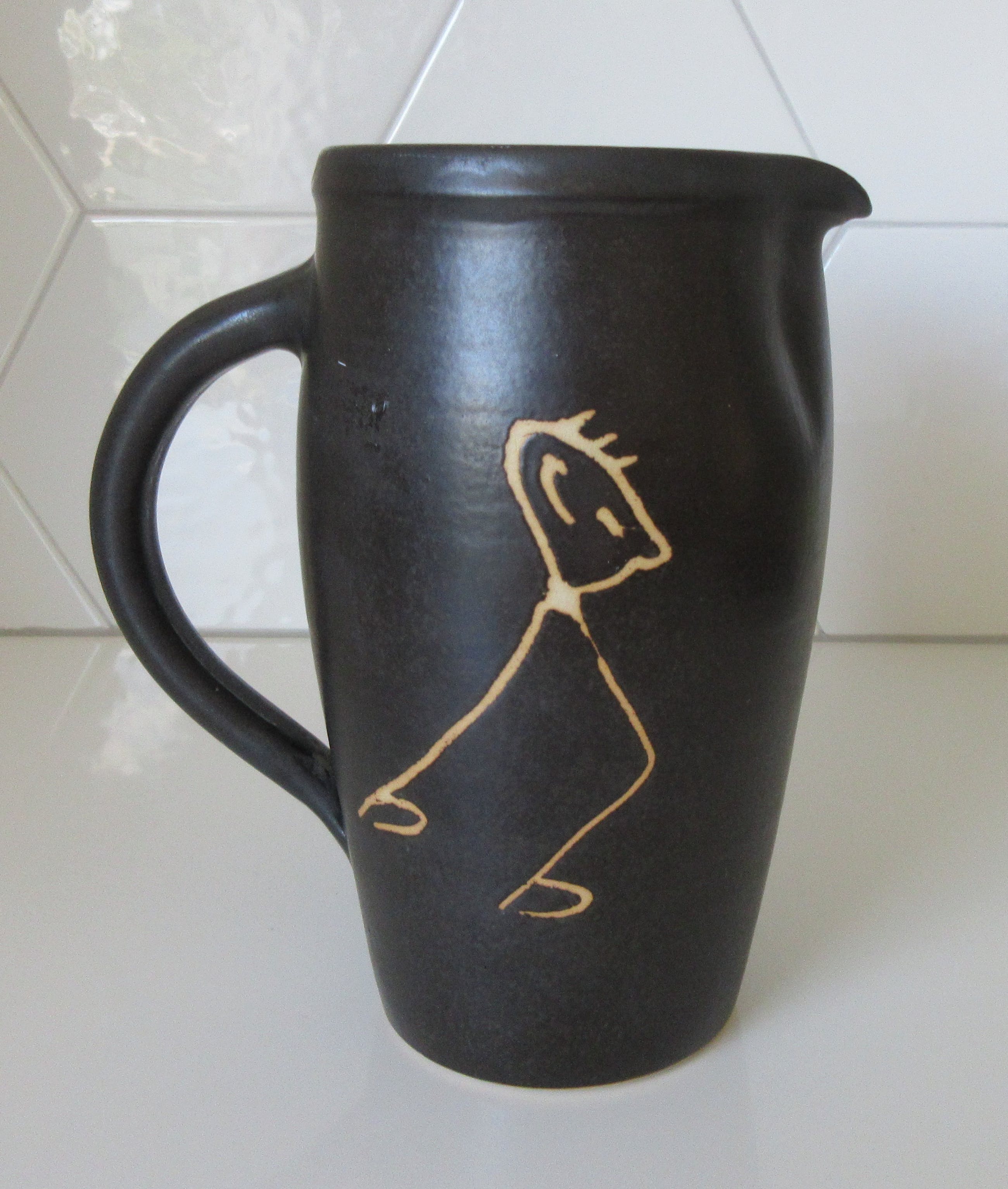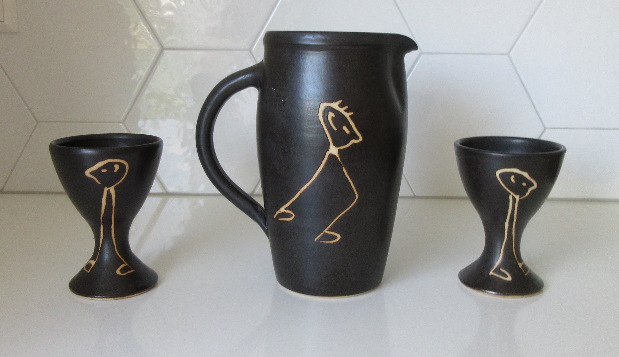 Waterkan met twee bekers gedecoreerd met gestileerde mensfiguren. Alle drie de stukjes zijn gaaf en met de hand gesigneerd aan de achterzijde.