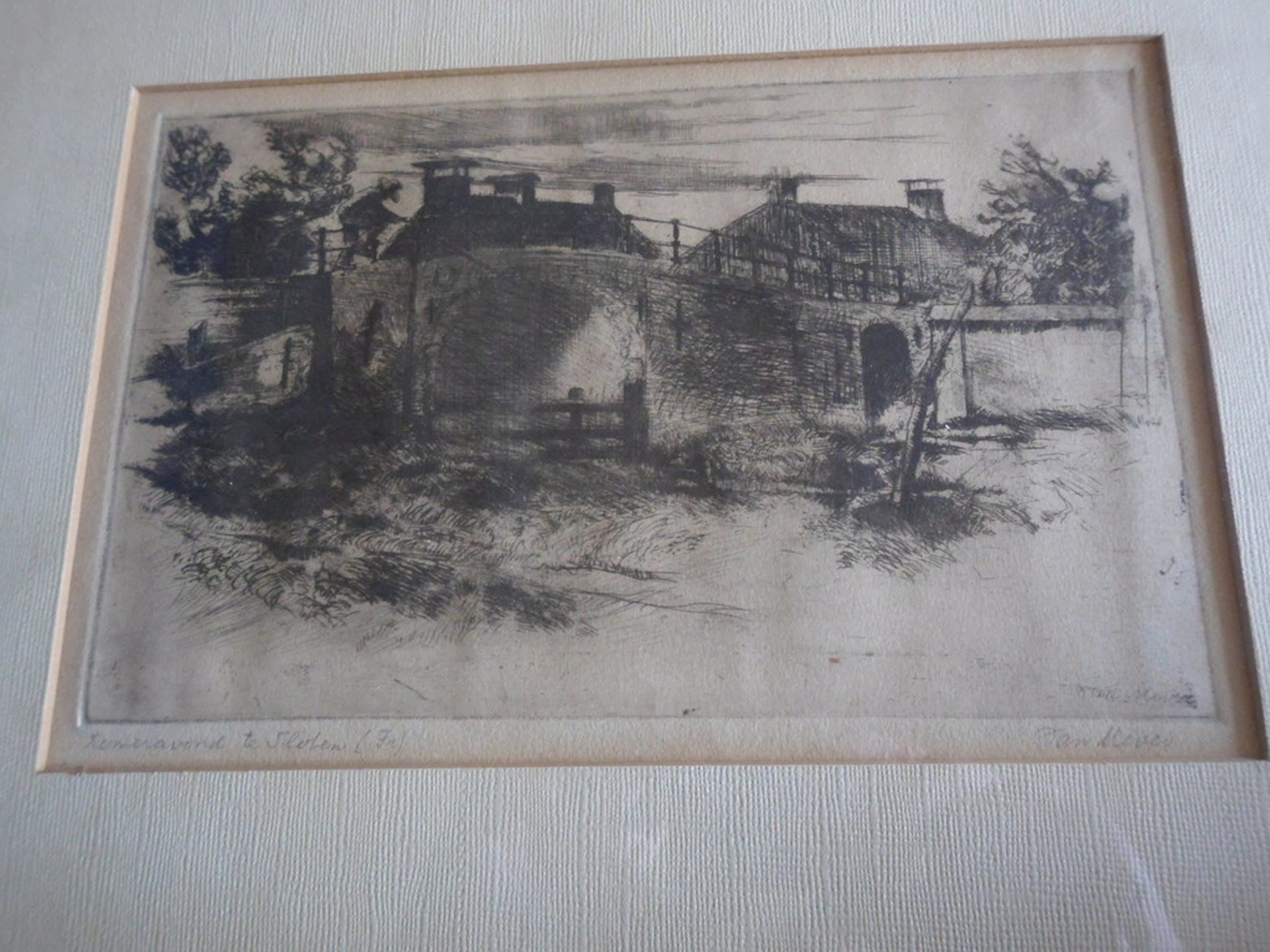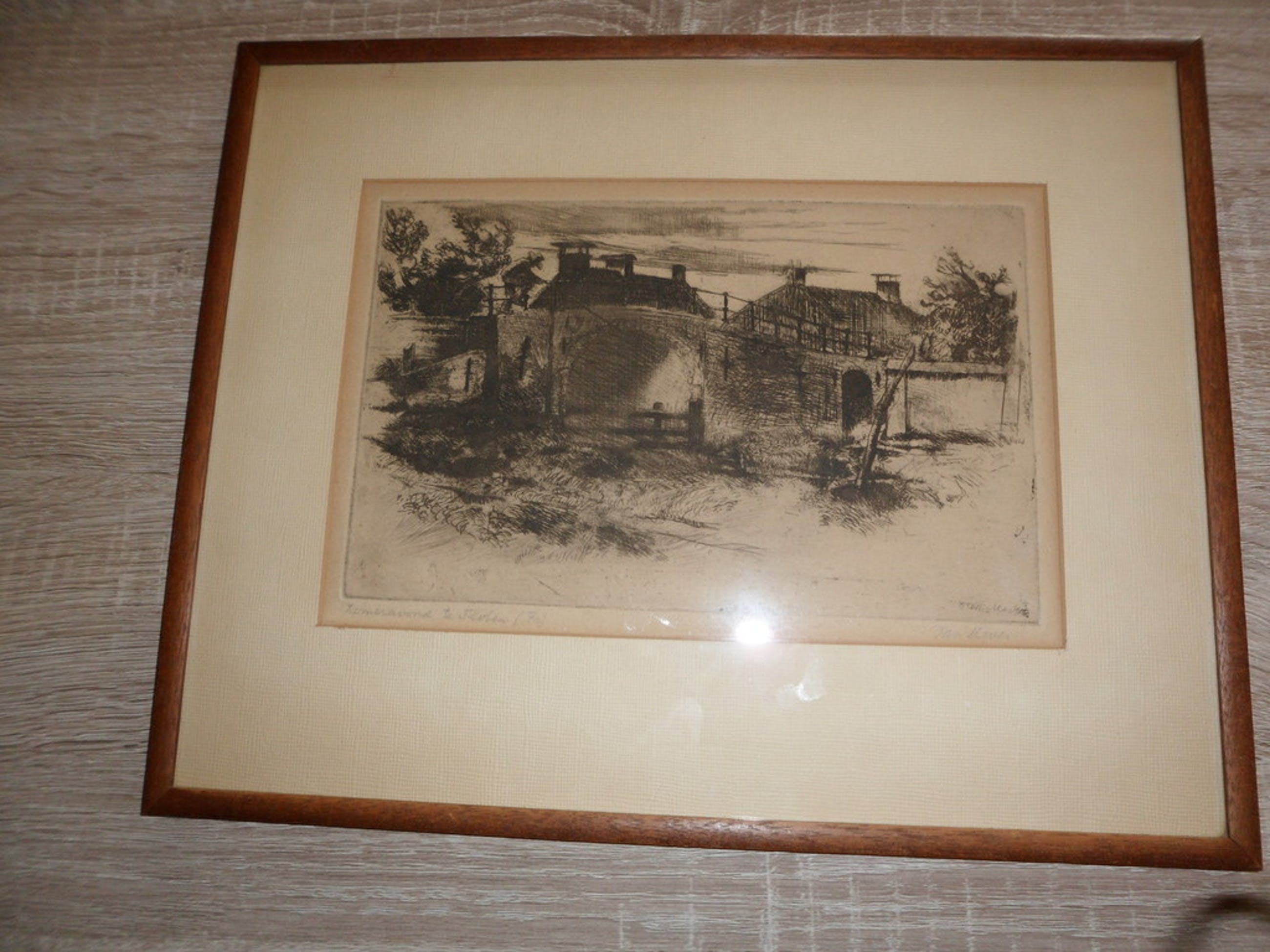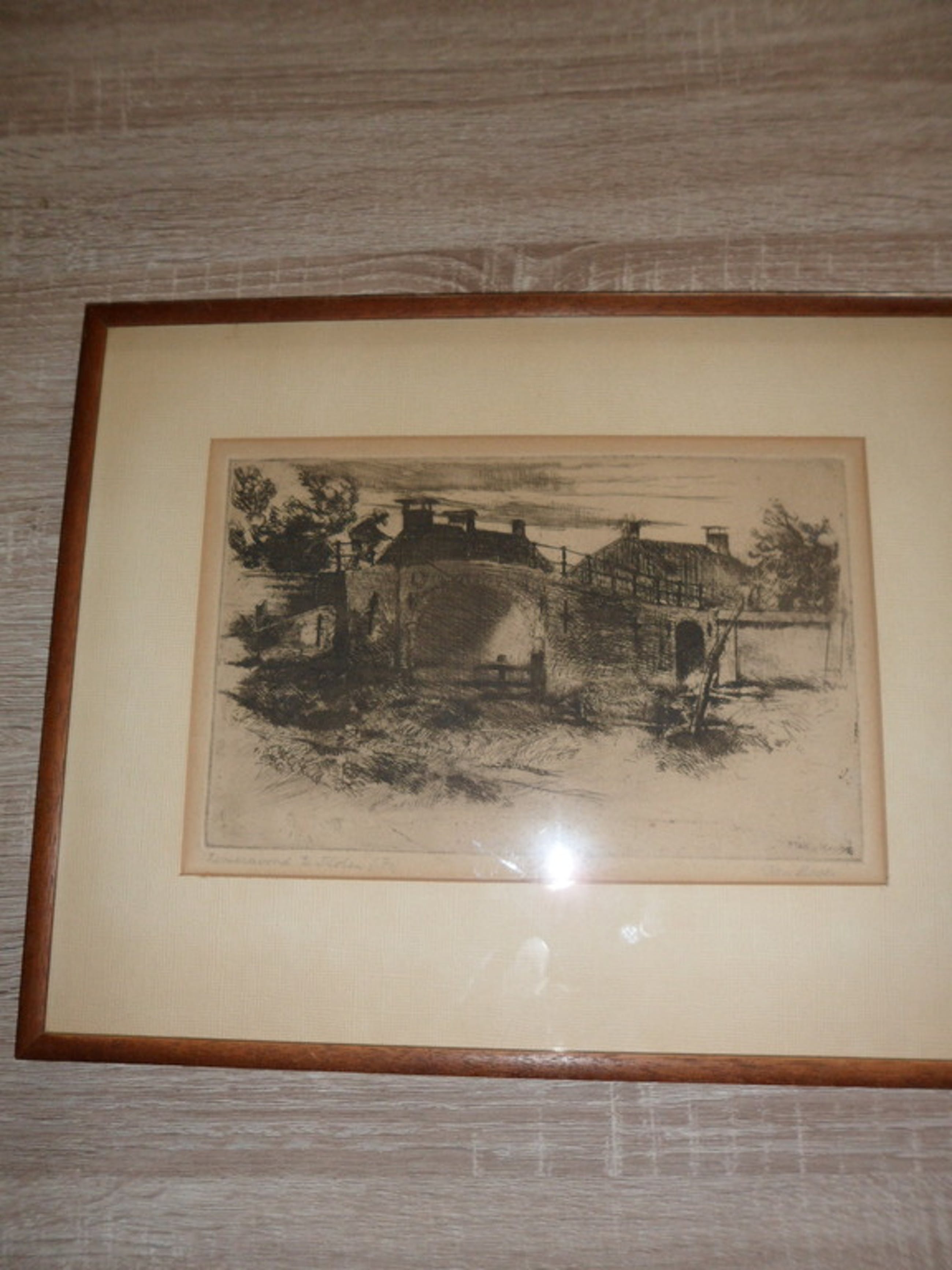 De ets zit in een lijst en is B 39 x H 31 cm.
