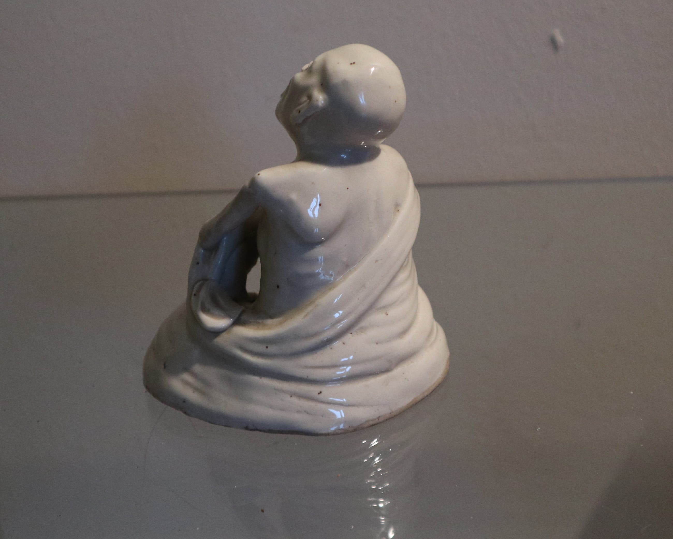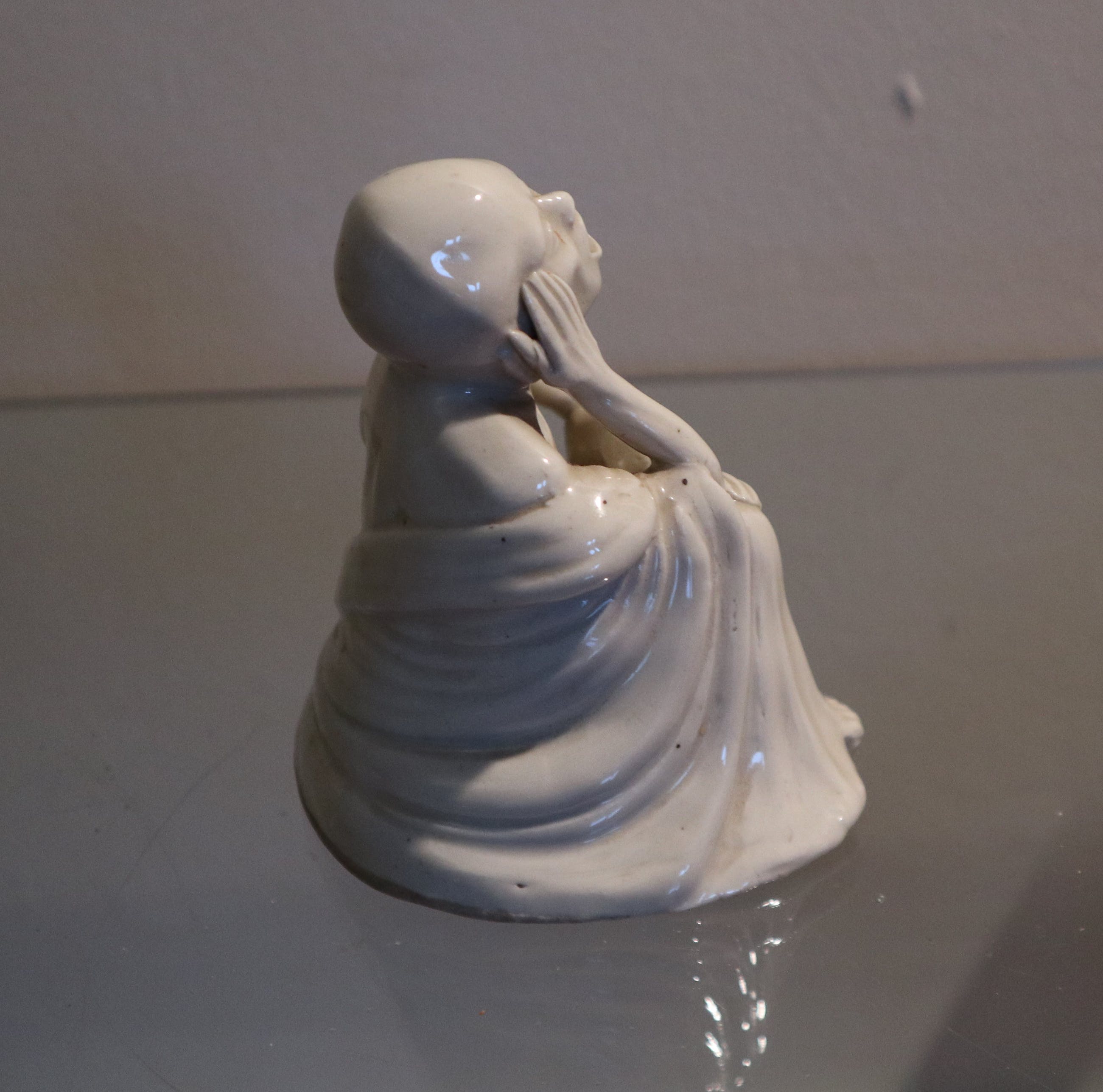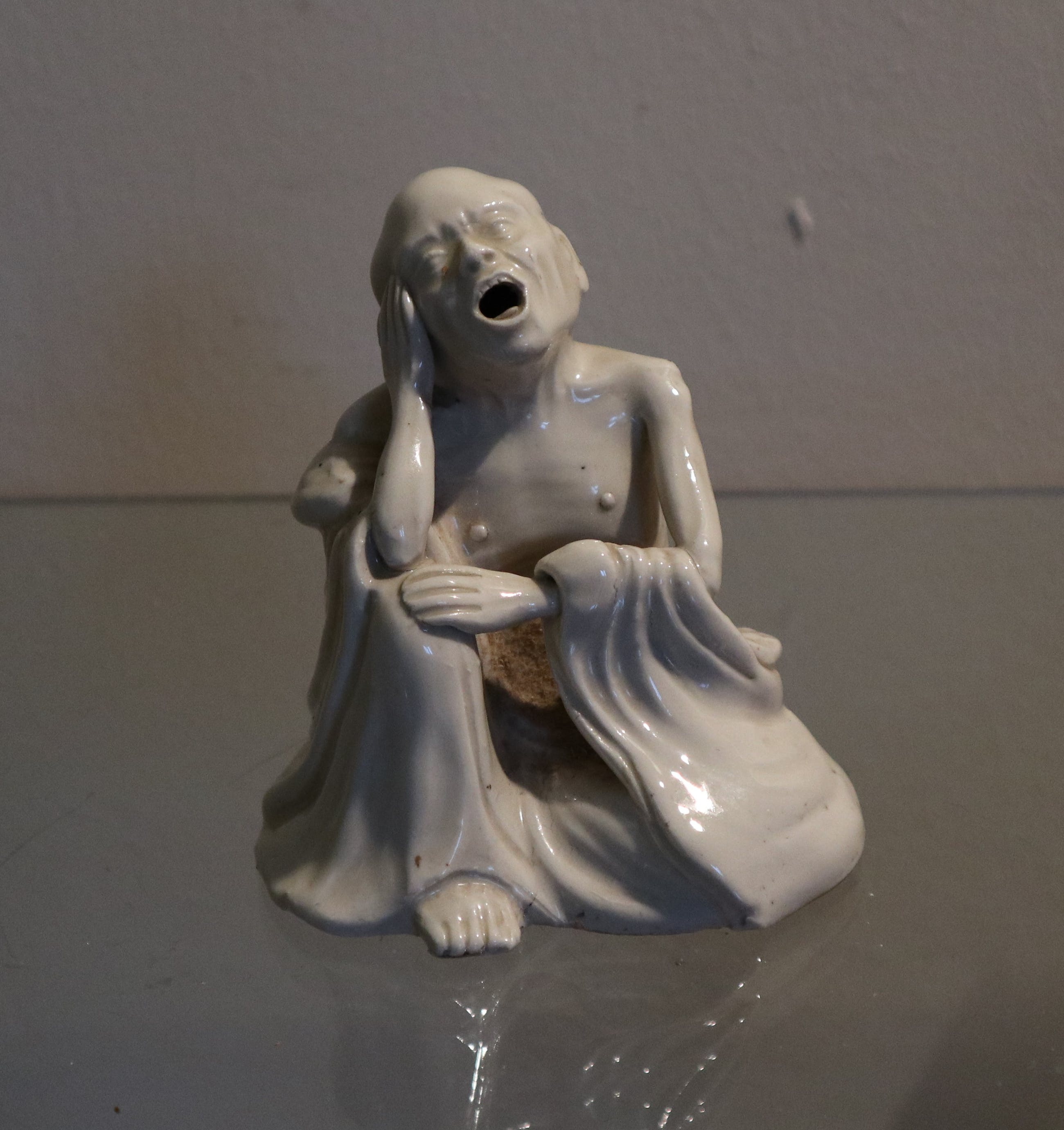 Beeldje van porselein, Japans, zittende man met open mond. Fraai!