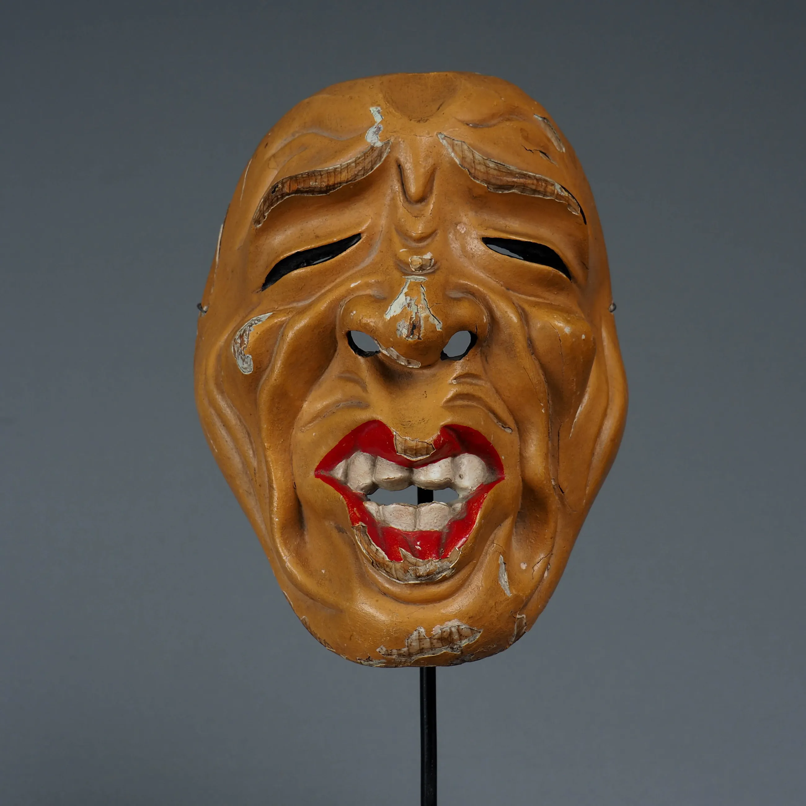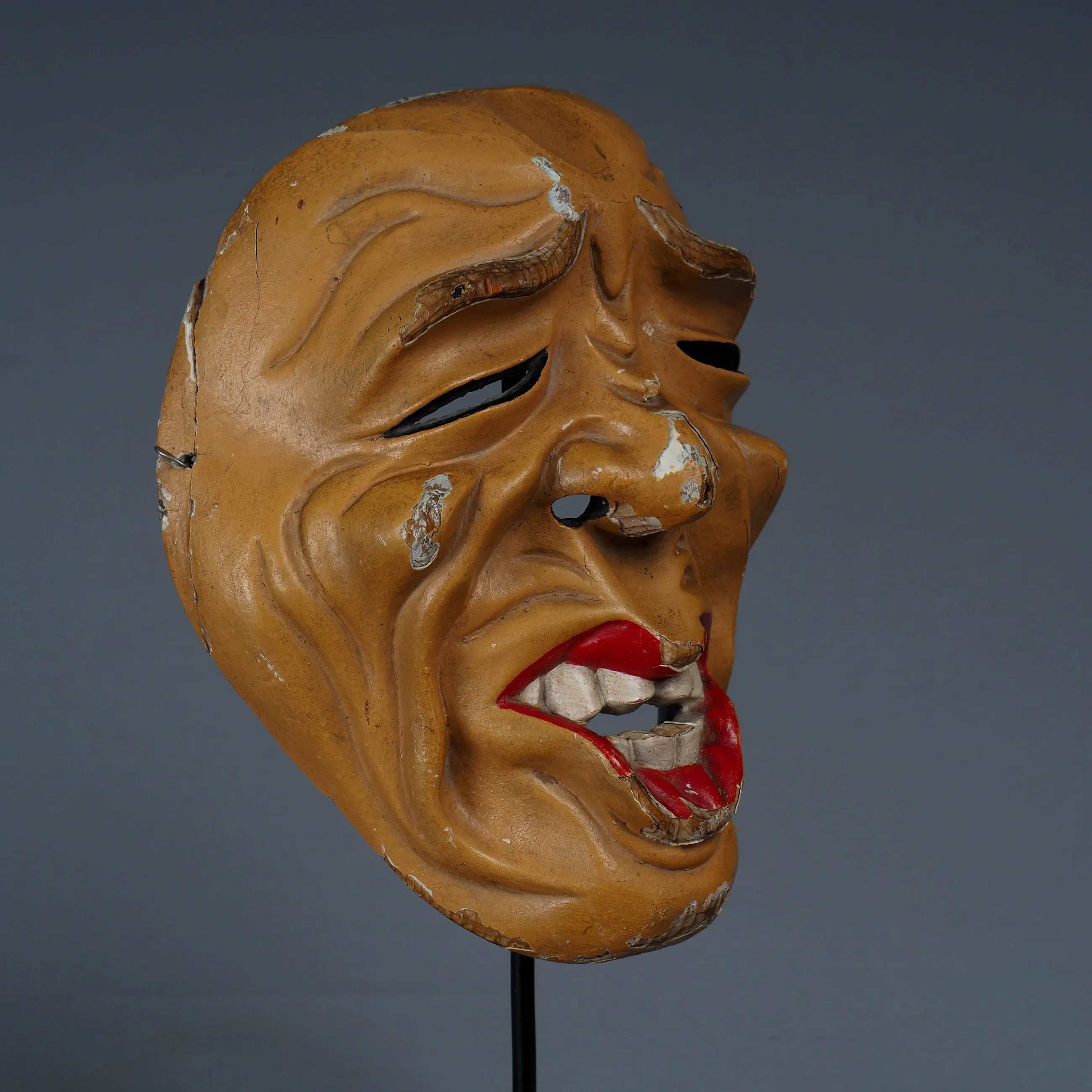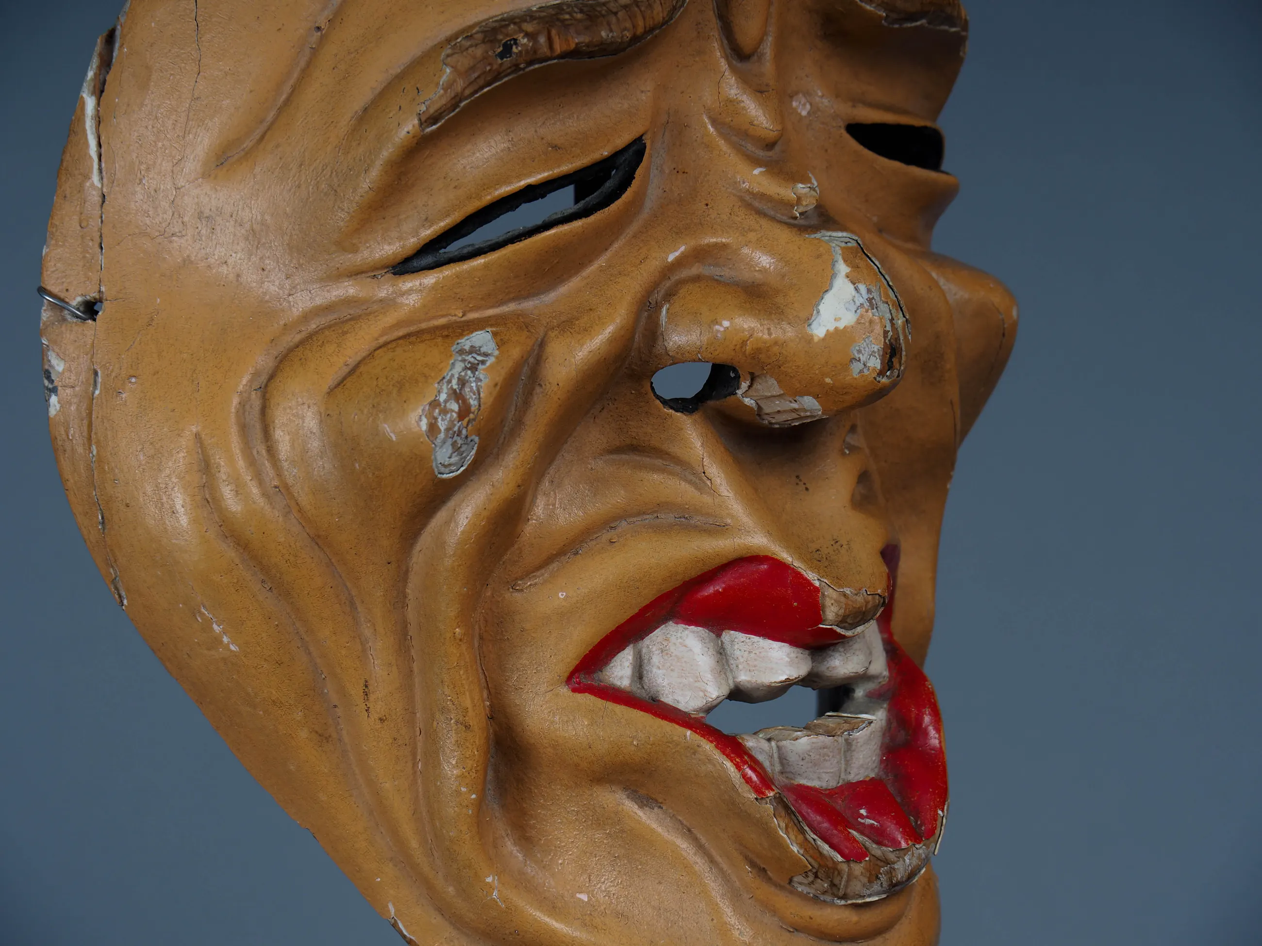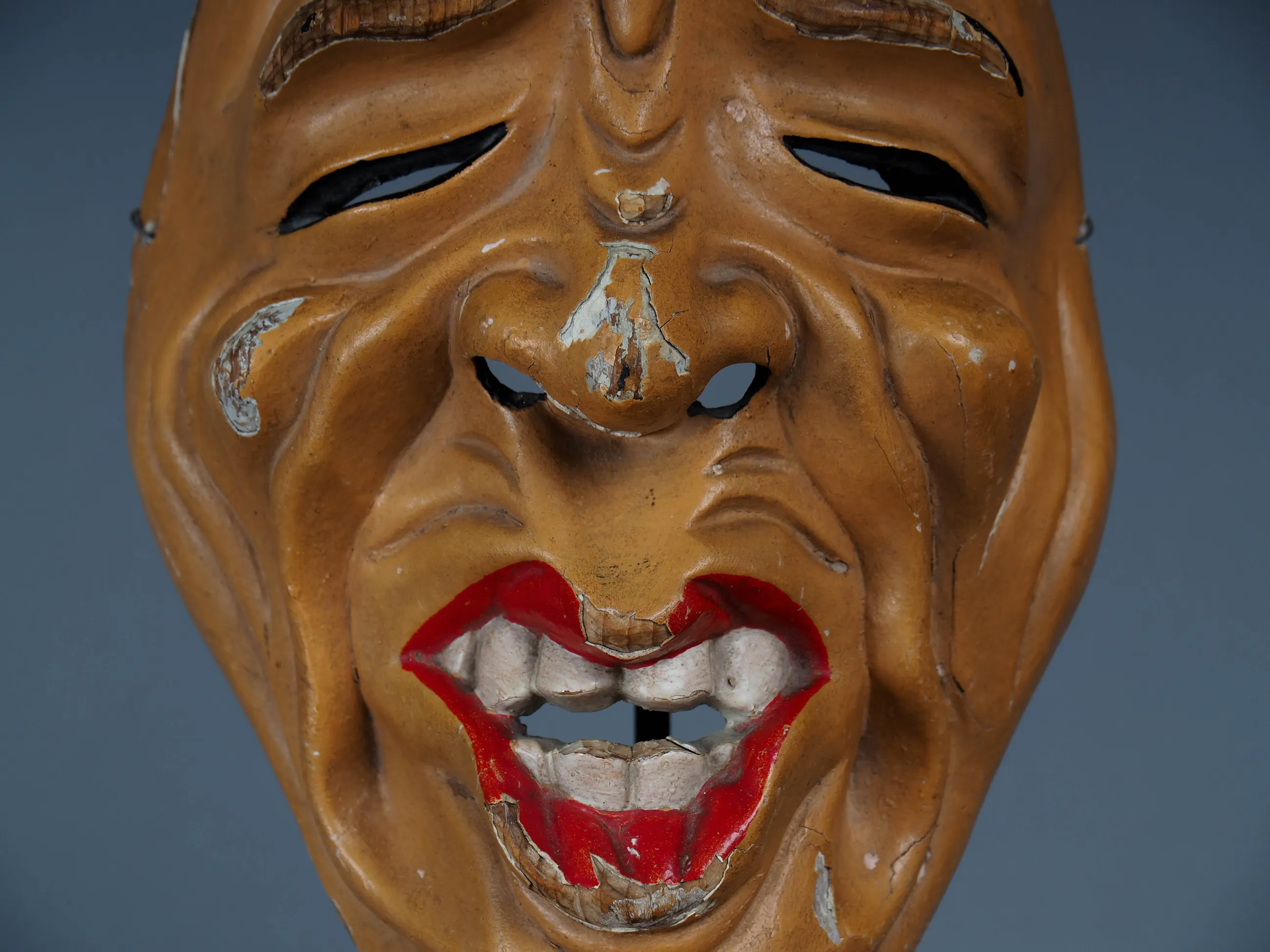 Bijzonder Japans oud Noh theater masker met een zeer markante uitstraling. Zeer expressief, uit hout gesneden met gedetailleerde rimpels en fijnste lakwerk. In matige staat, maar gezien de leeftijd toch nog redelijk. De datering is begin 20e eeuw en wellicht ouder, in 1920 gekocht op een veiling in Nederland en sindsdien in privé bezit.