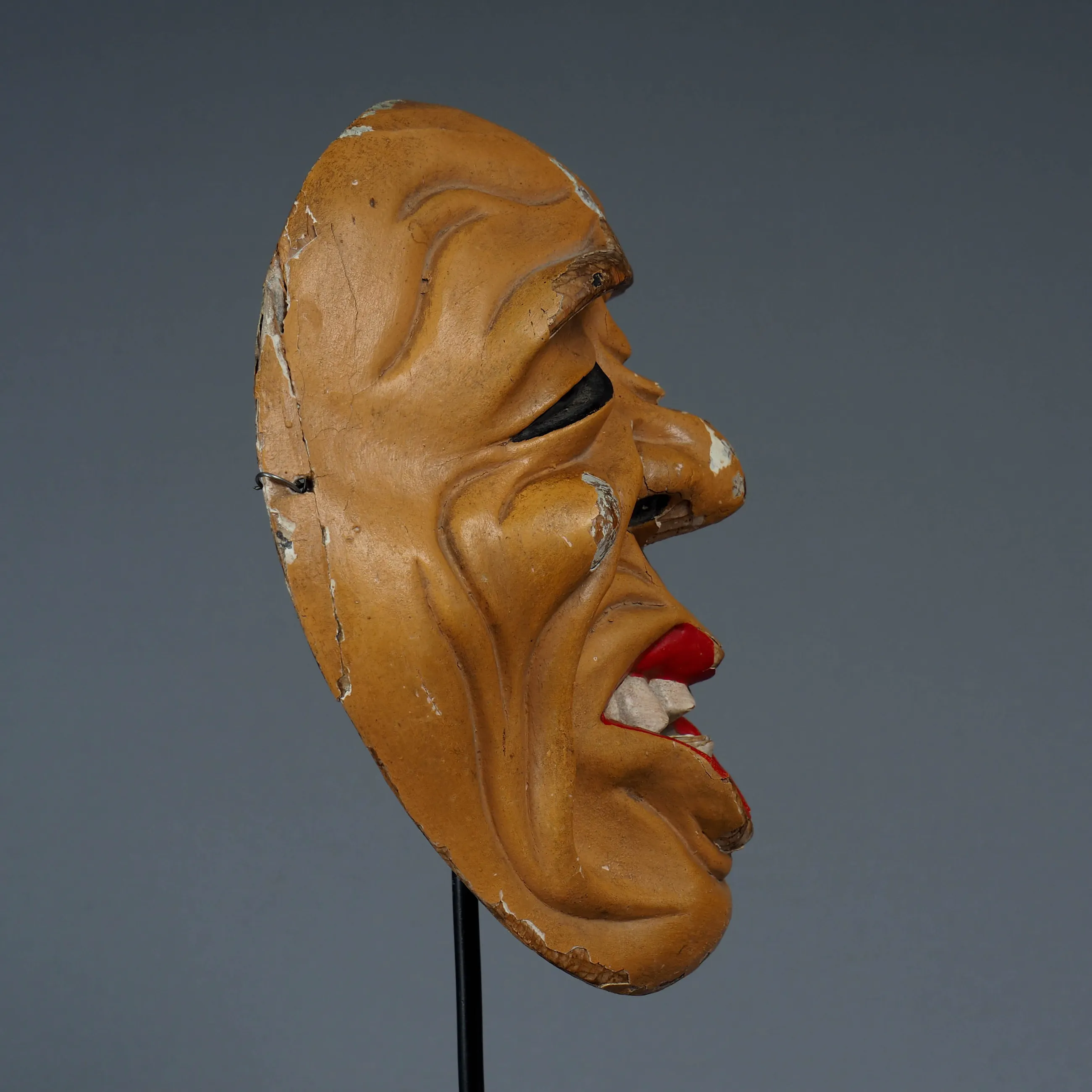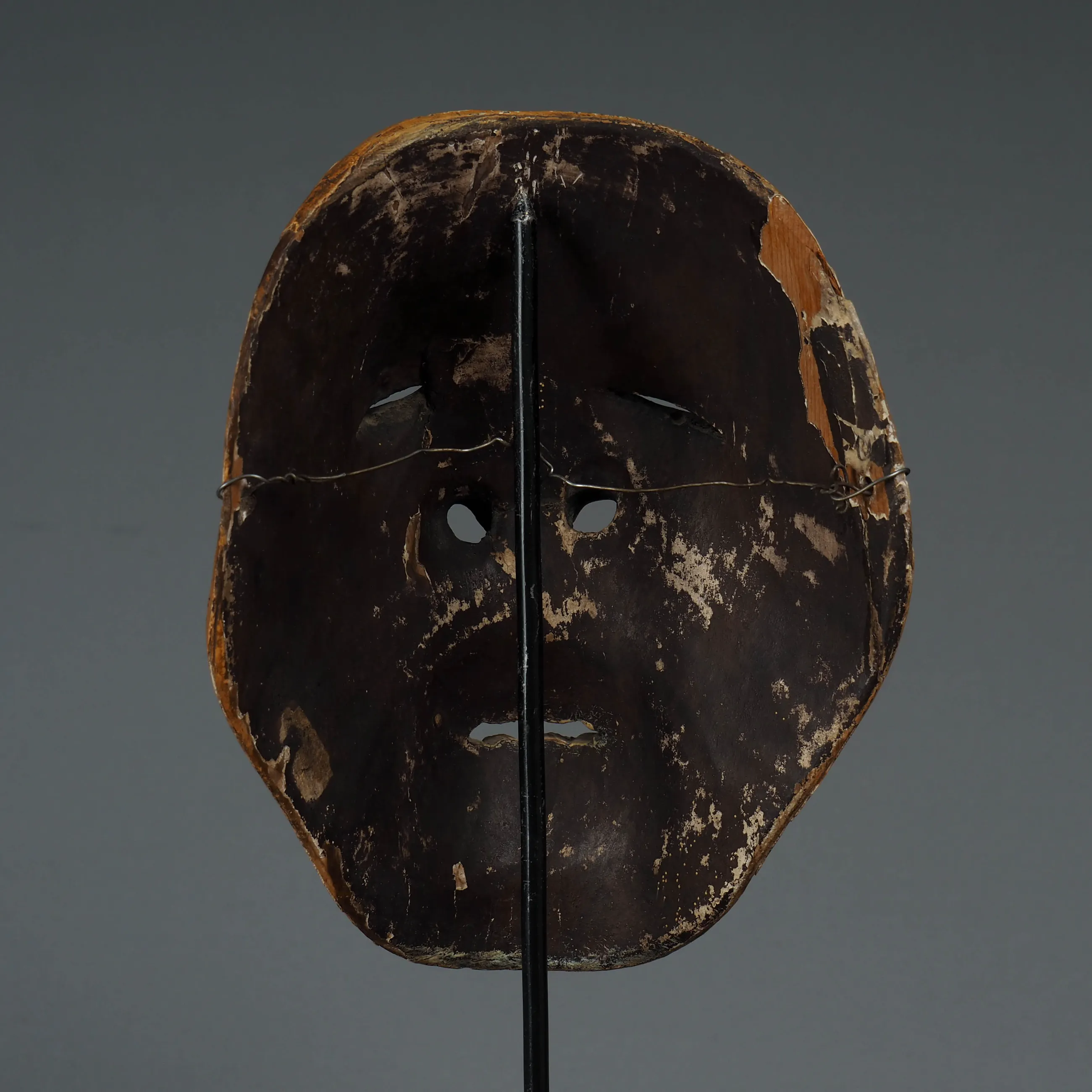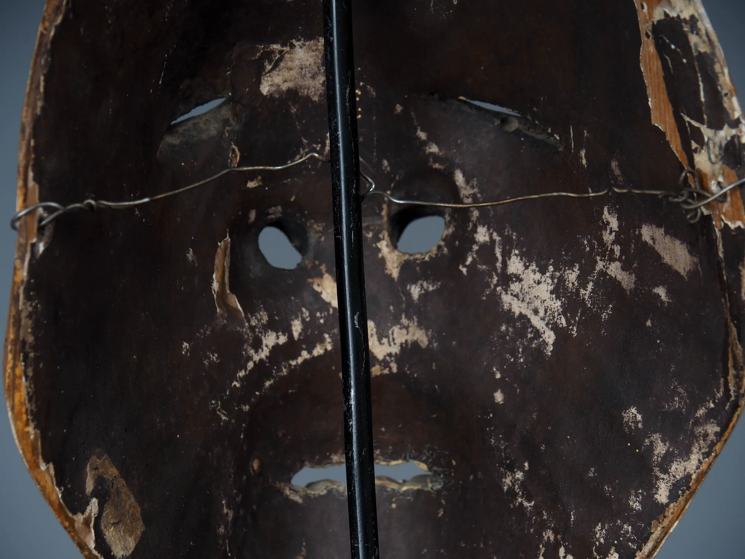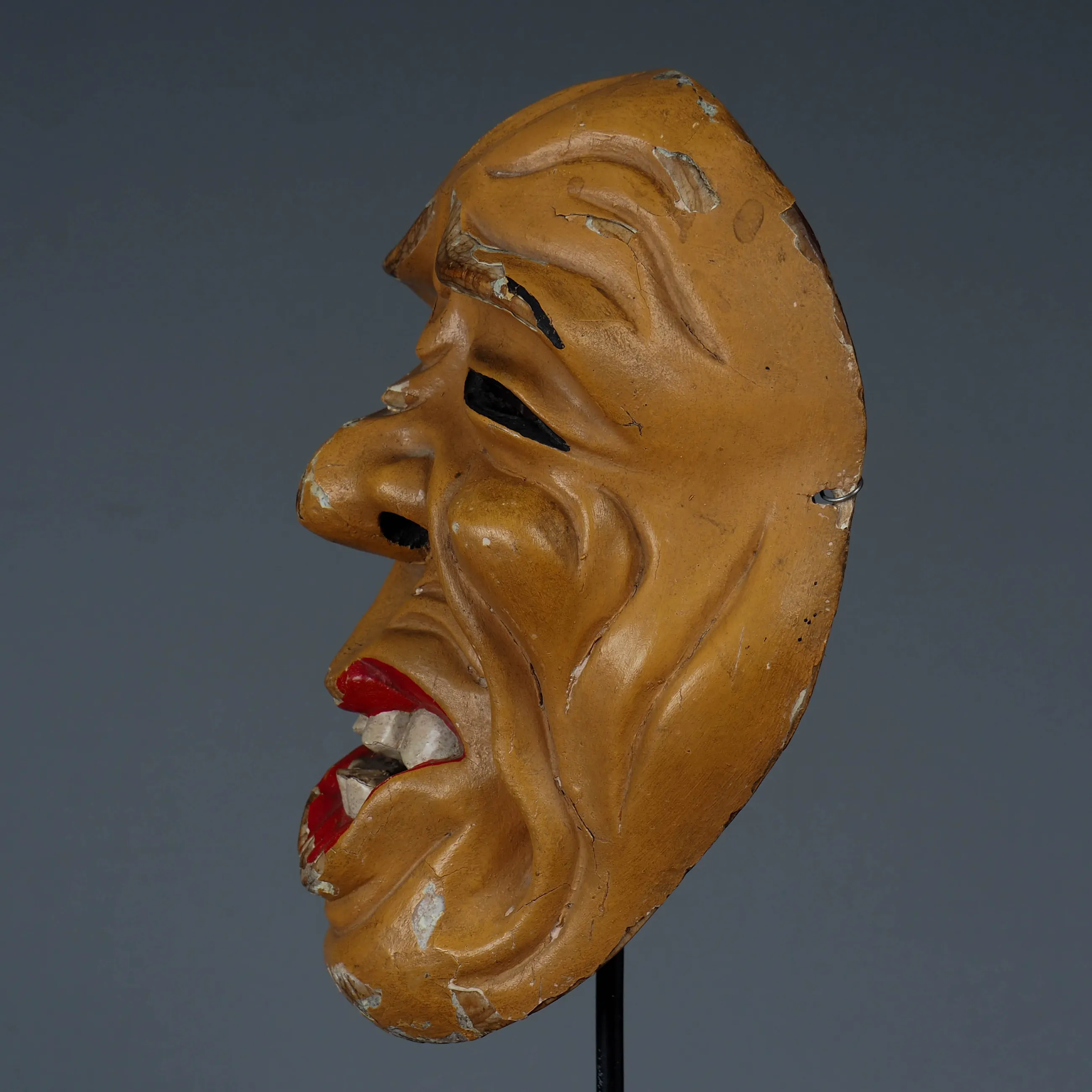 Bijzonder Japans oud Noh theater masker met een zeer markante uitstraling. Zeer expressief, uit hout gesneden met gedetailleerde rimpels en fijnste lakwerk. In matige staat, maar gezien de leeftijd toch nog redelijk. De datering is begin 20e eeuw en wellicht ouder, in 1920 gekocht op een veiling in Nederland en sindsdien in privé bezit.