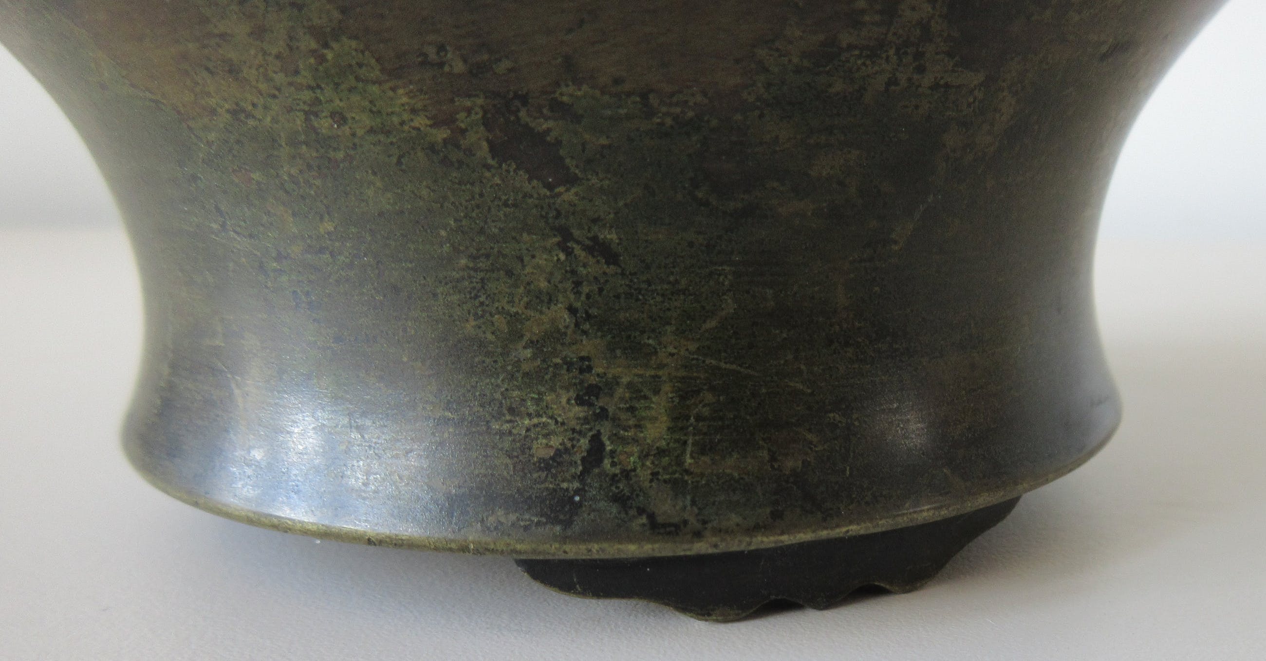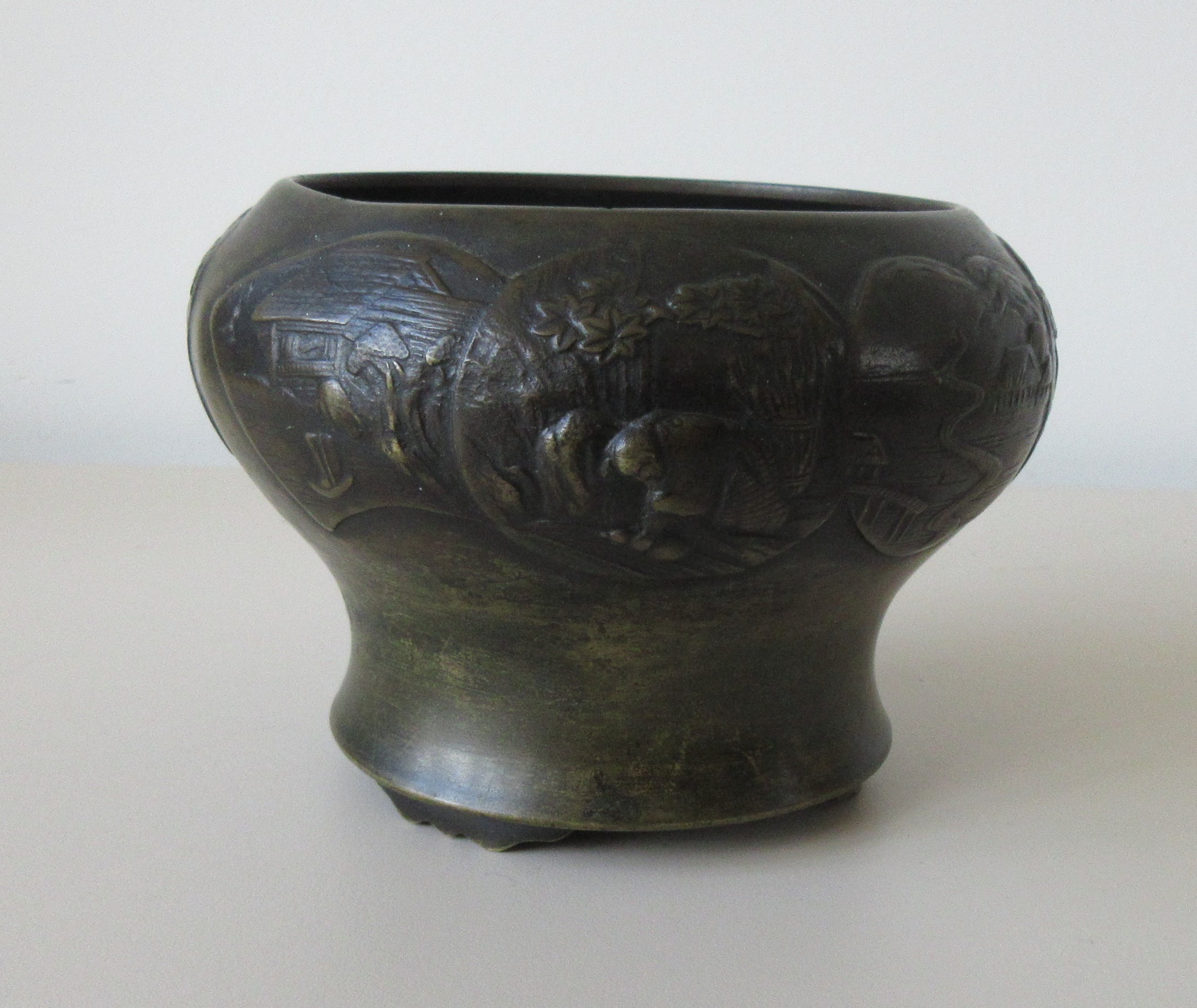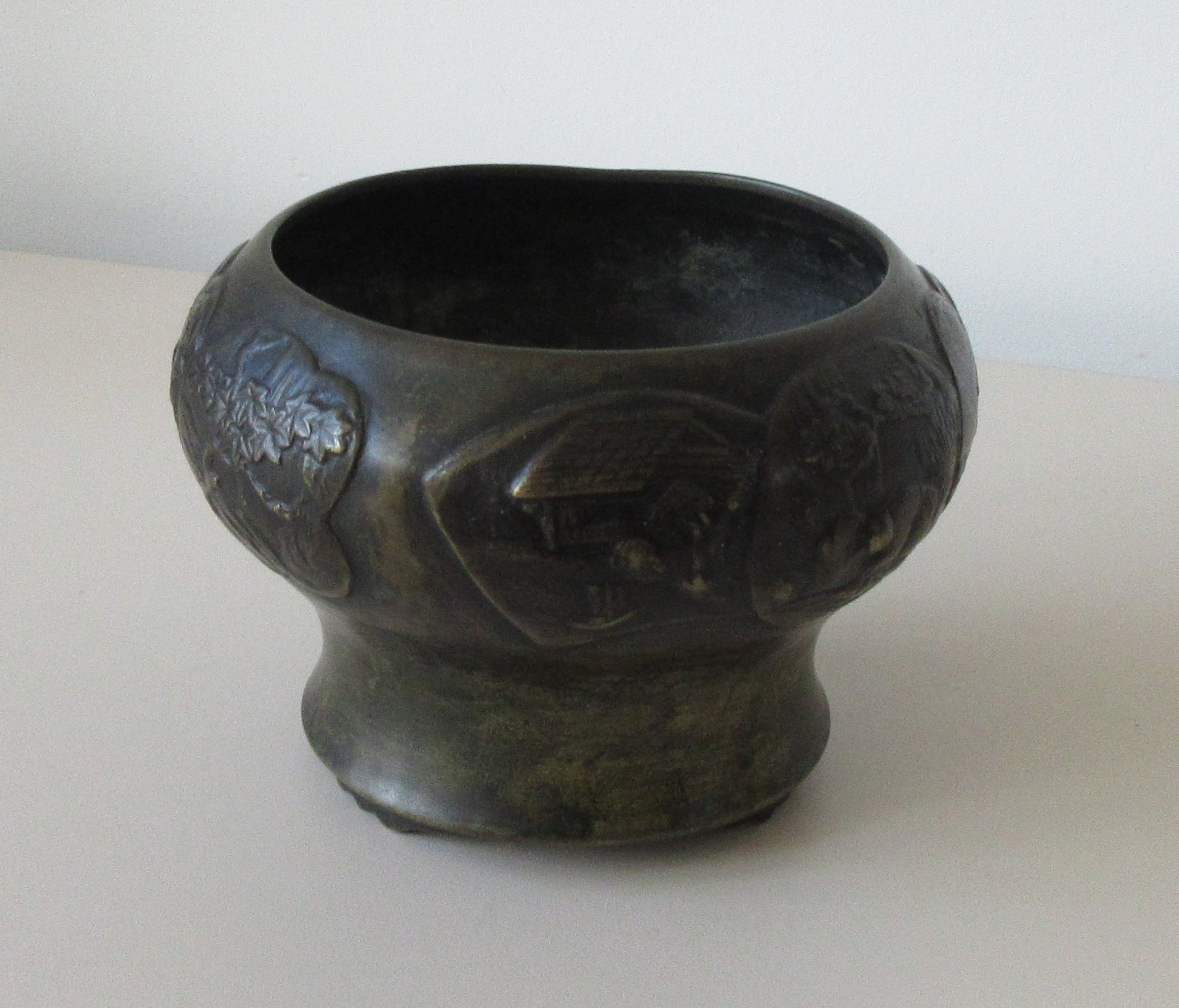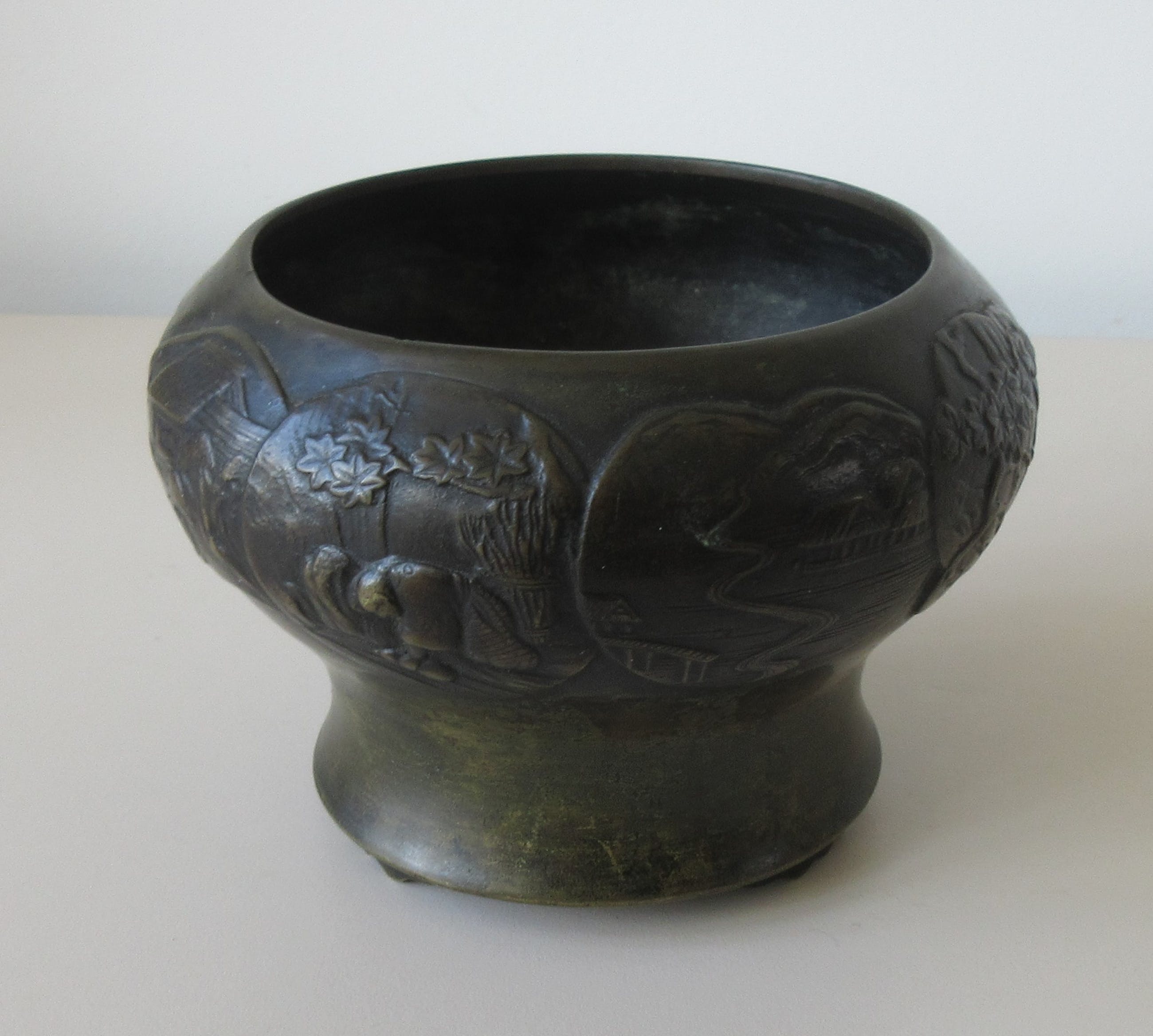 Mooie Japanse bronzen potje of kom op voeten uit de Meiji periode in de 19e eeuw. De pot heeft drie uitgezaagde lage brede poten en er zijn drie landschapsafbeeldingen afgebeeld. In goede gebruikte conditie, de pot heeft een klein deukje. De pot is gesigneerd aan de onderzijde, signatuur is mij helaas onbekend.