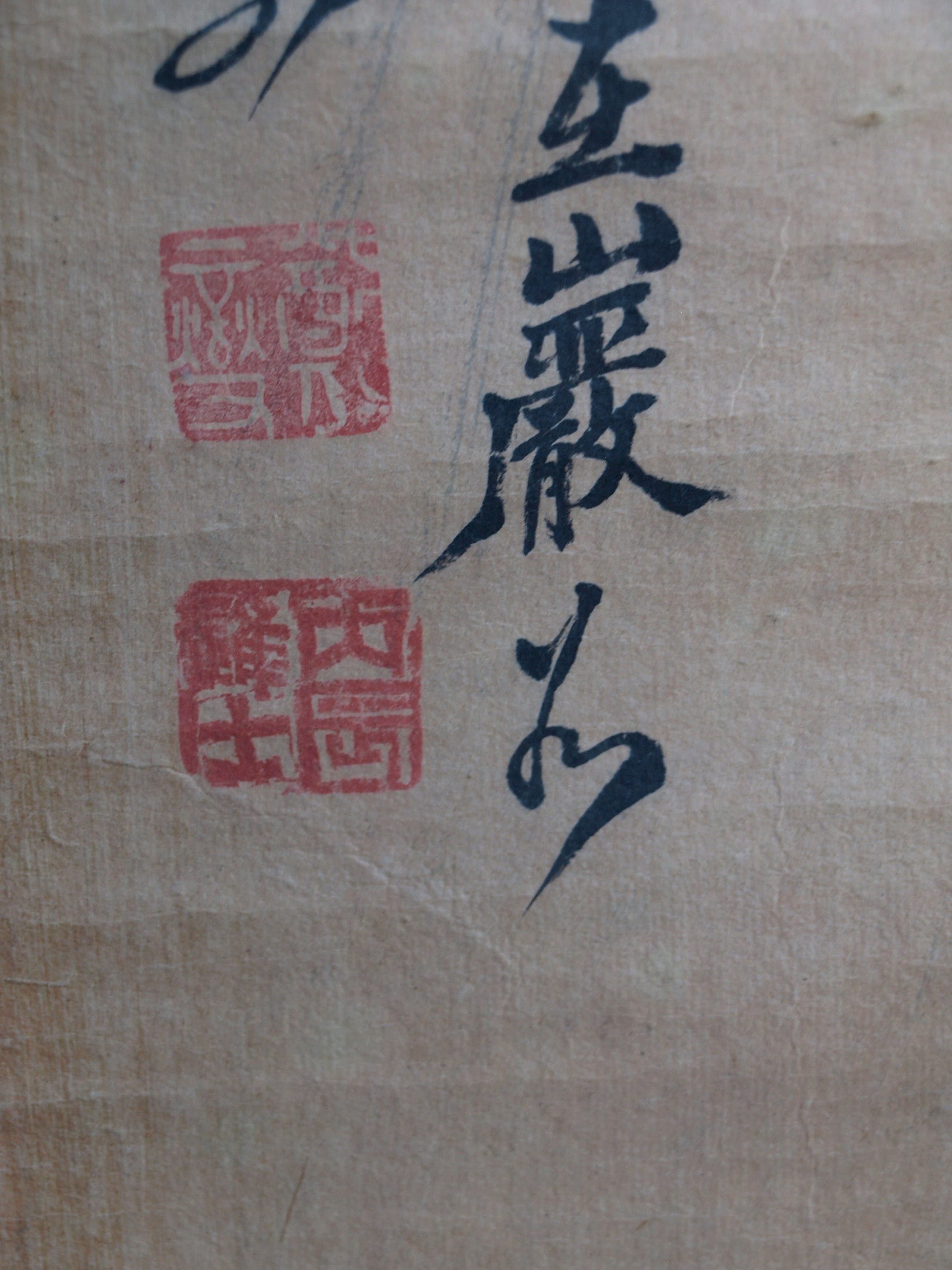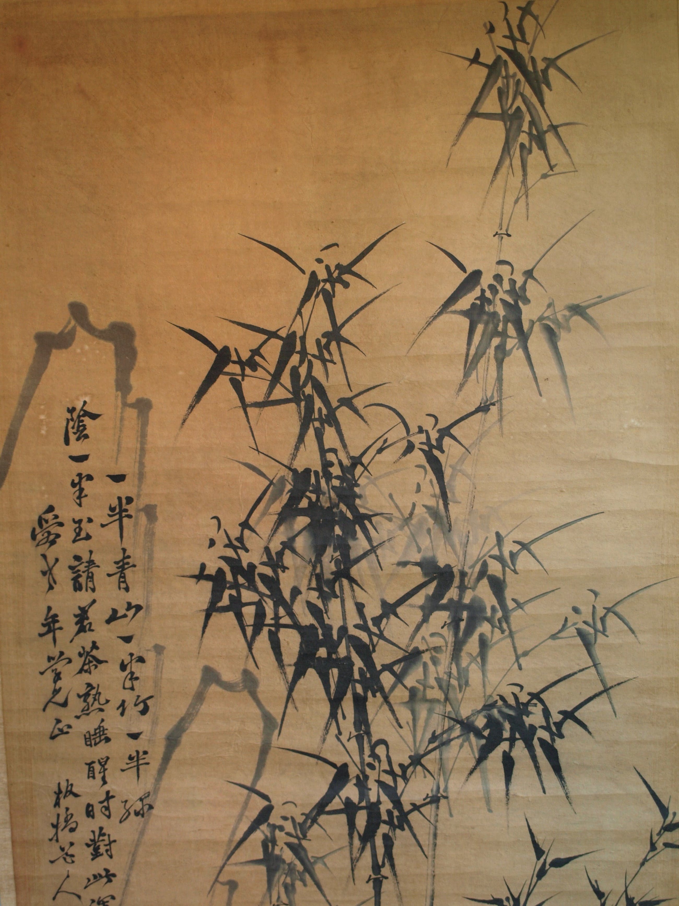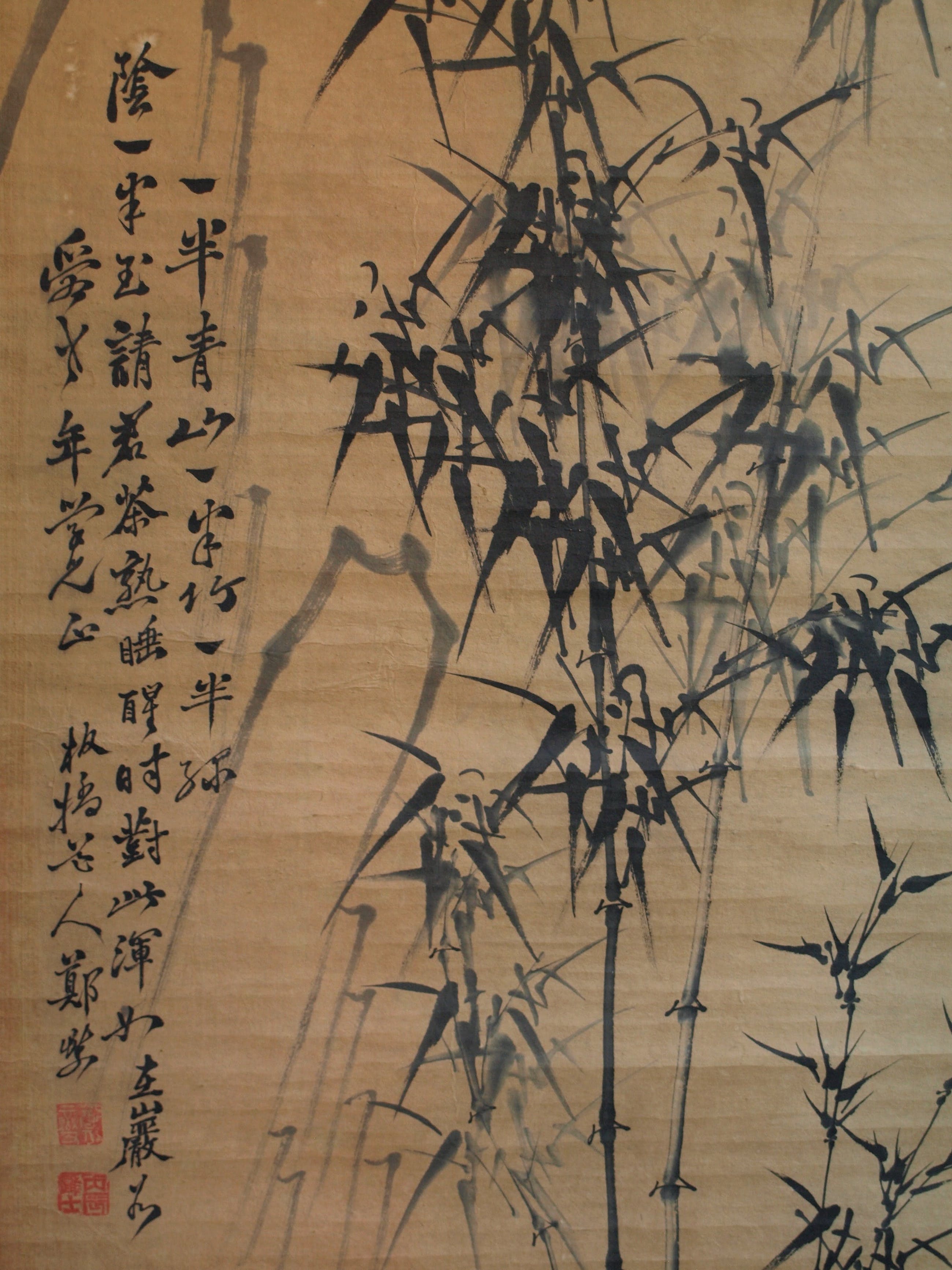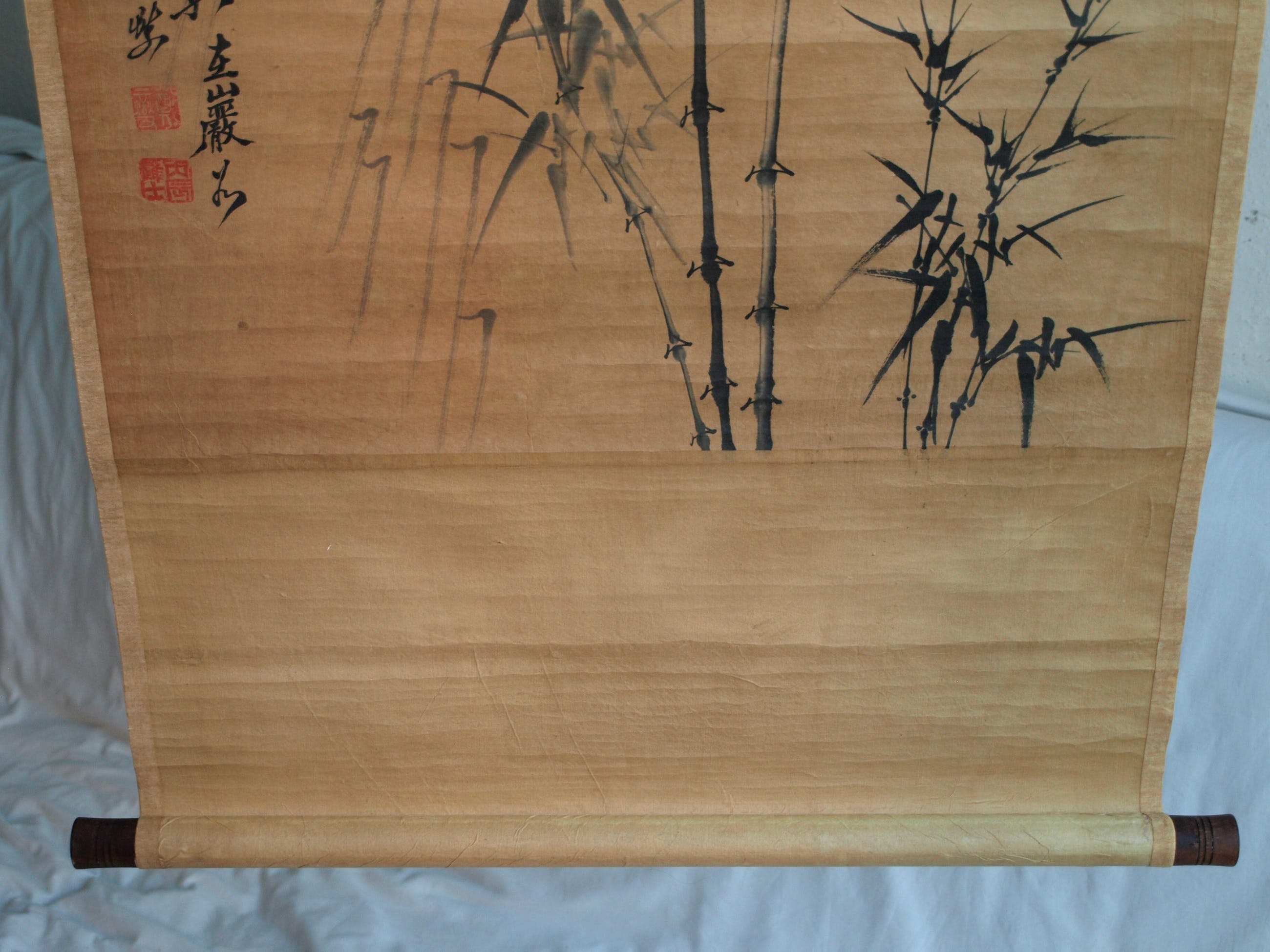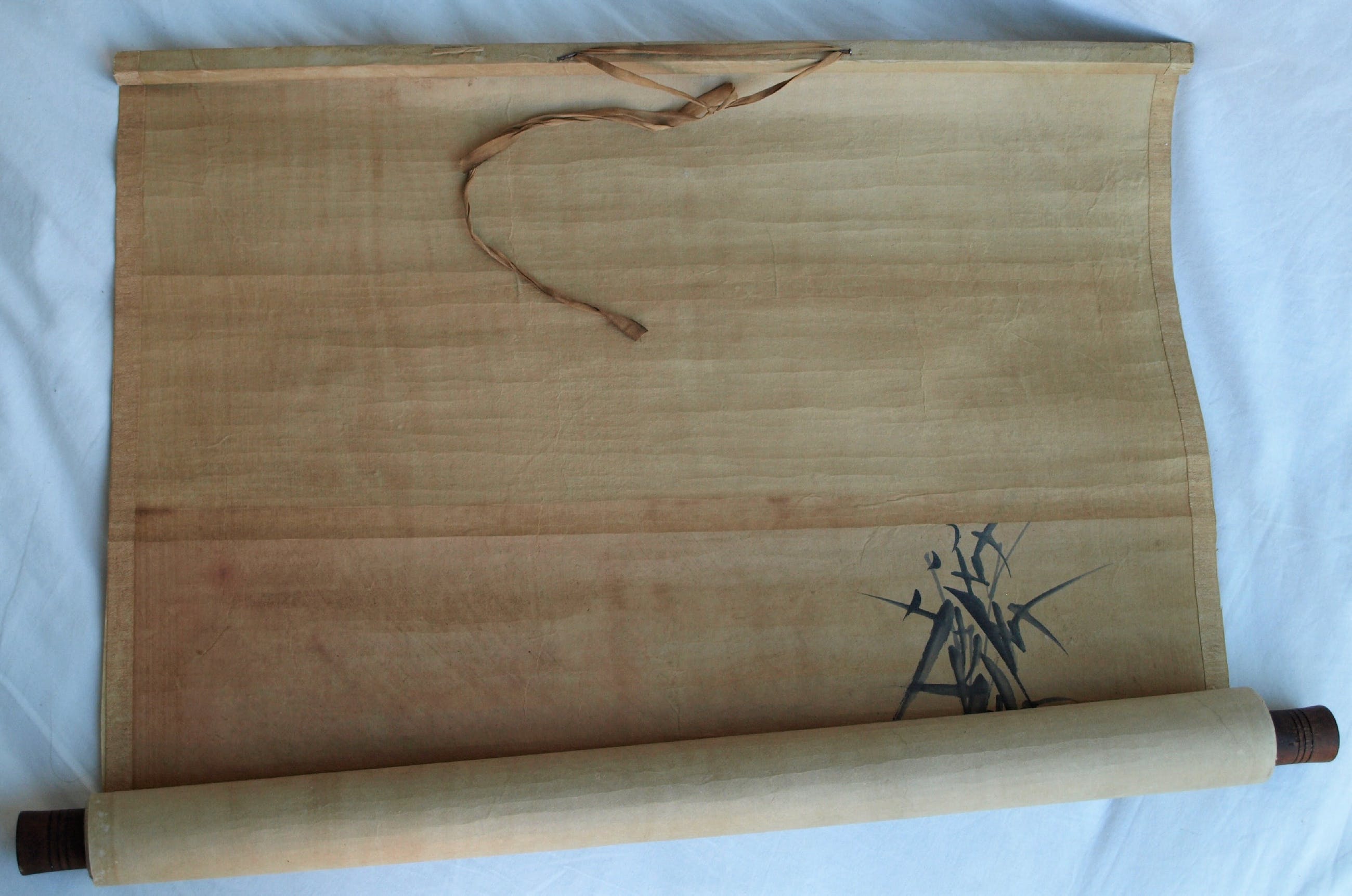 -Inkt op papier, opgerold en bevestigd aan een houten stok.