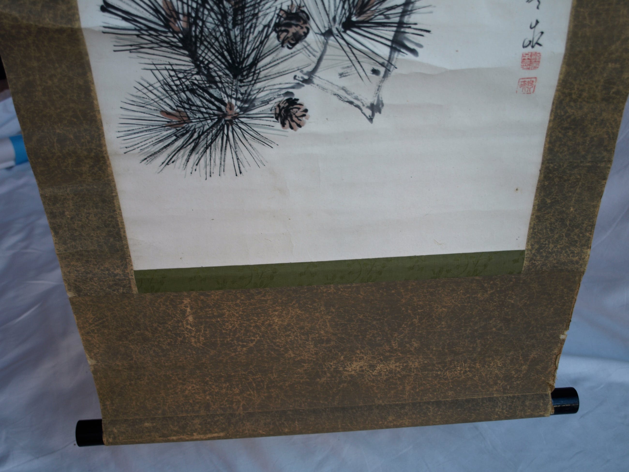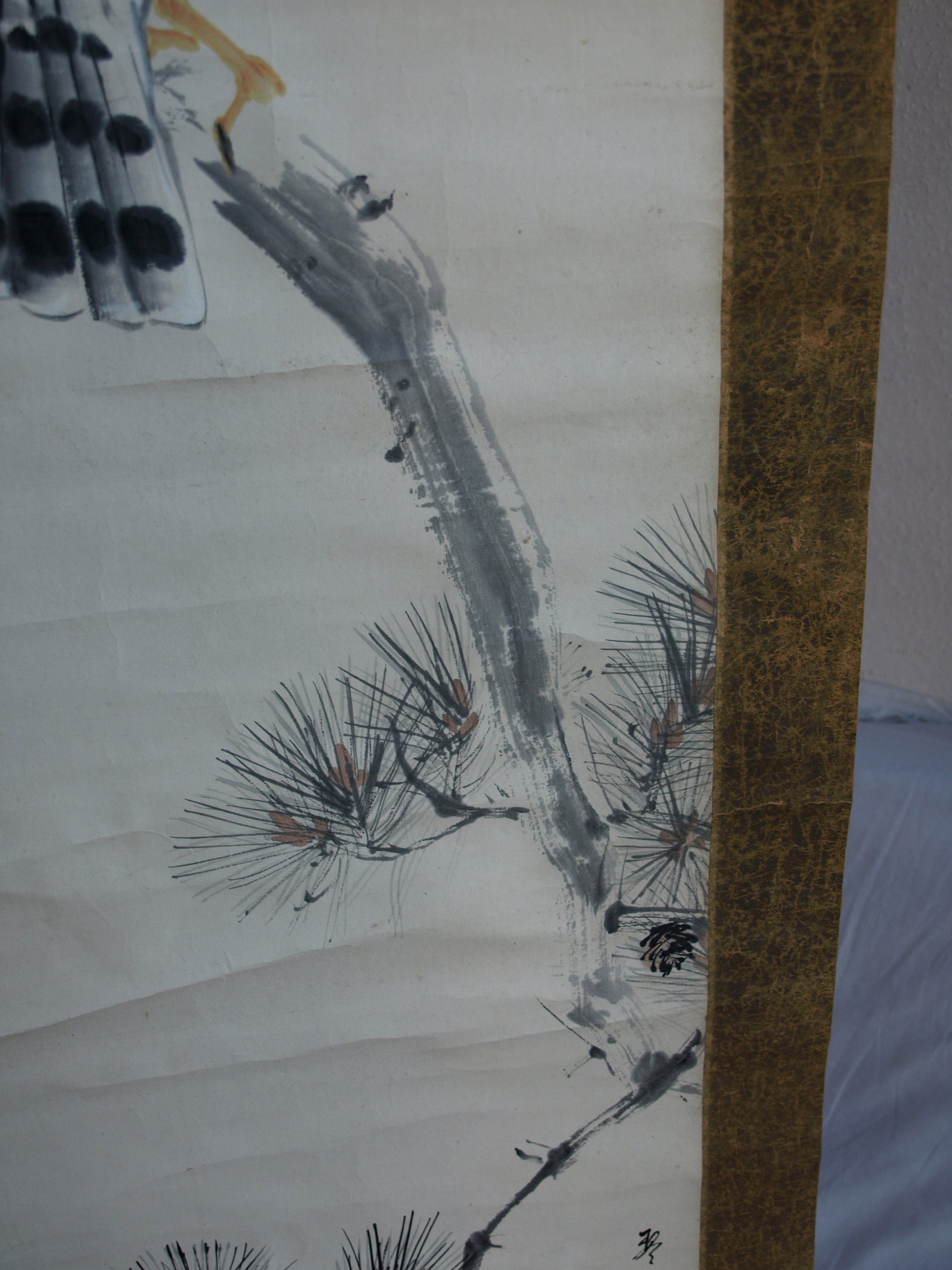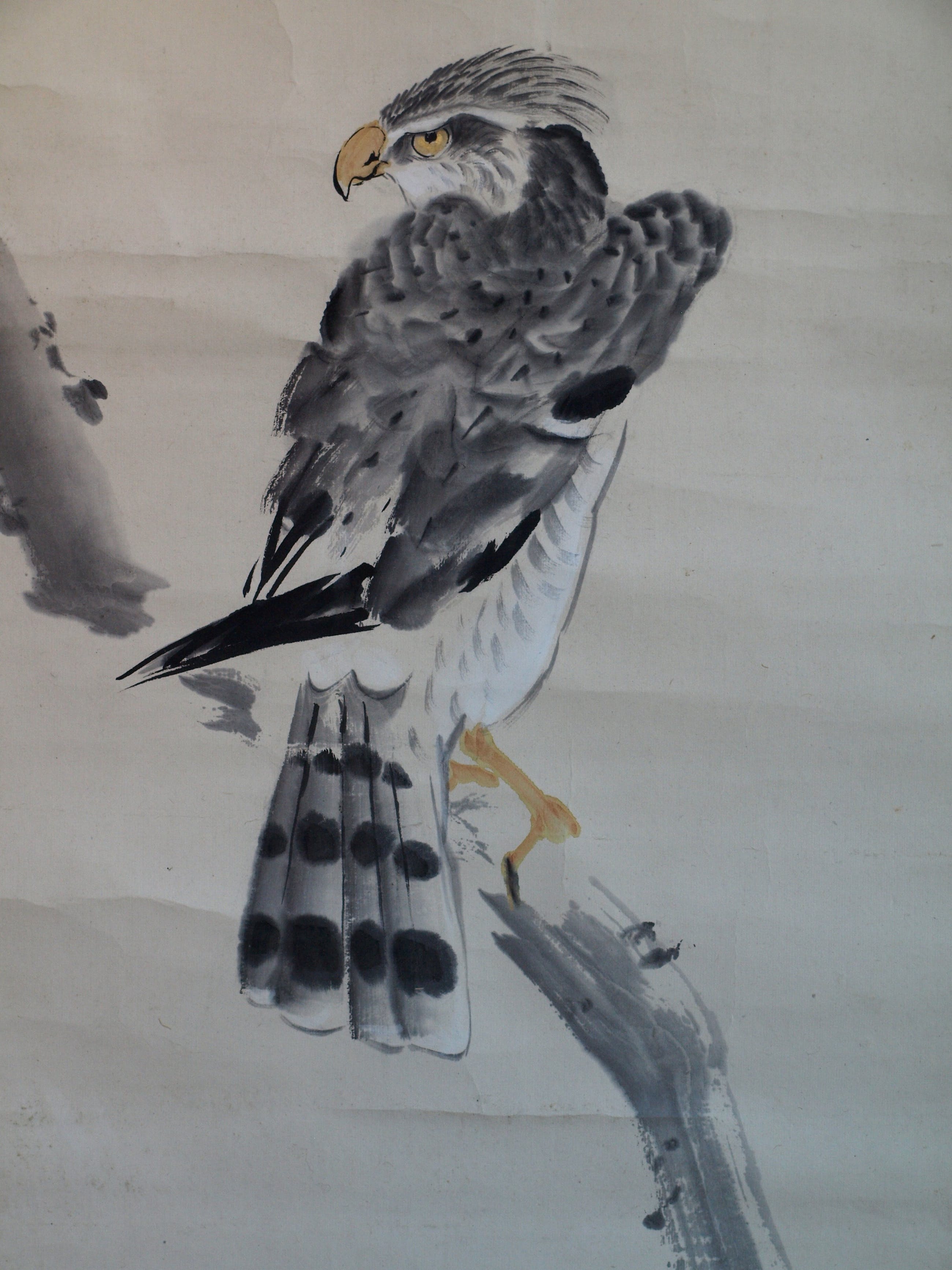 -Een ‘kakejiku’, ("hangingng scroll") uit de 19e eeuw, gemaakt door een Japanse of Chinese kunstenaar, met een voorstelling van een havik op een tak. Met zijden stroken aan de boven- en onderkant.