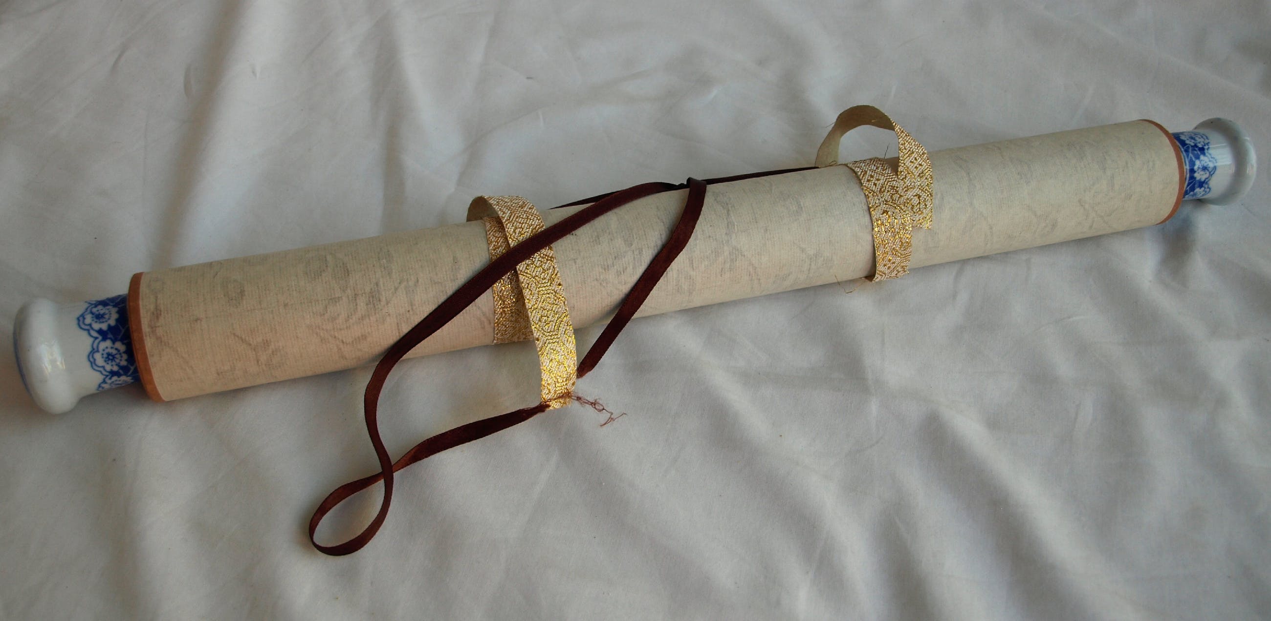 -Aquarelverf en inkt op papier, opgerold en bevestigd aan