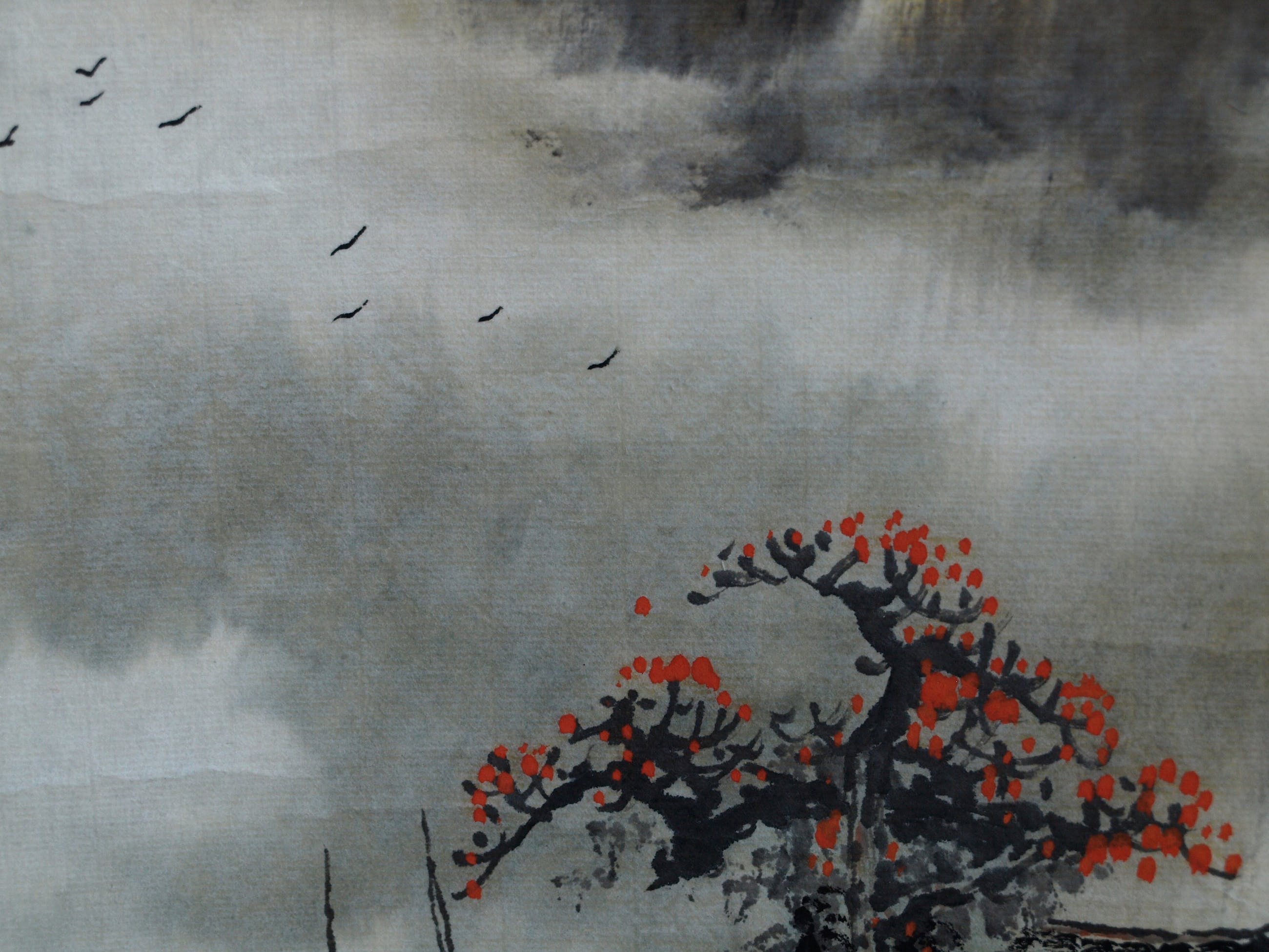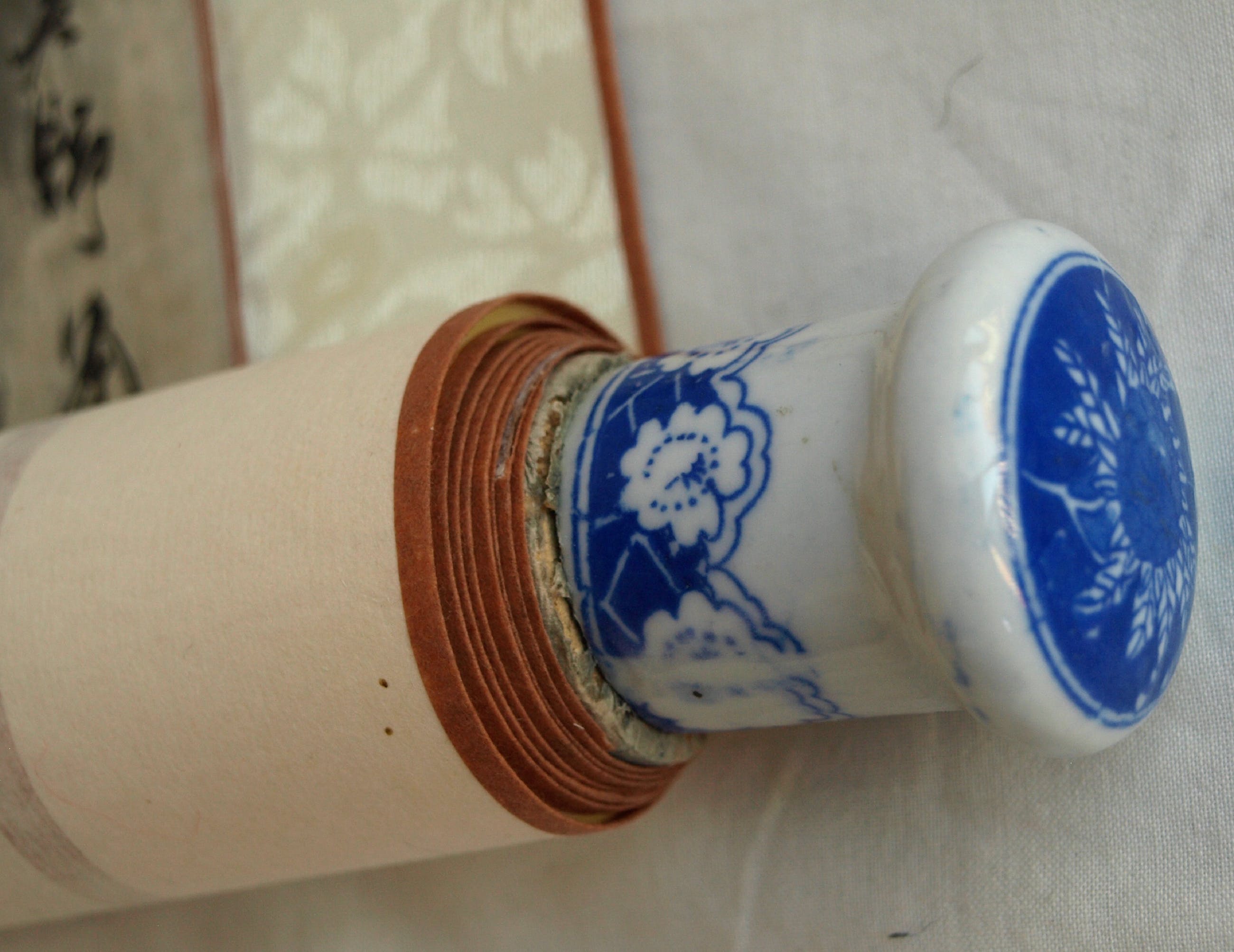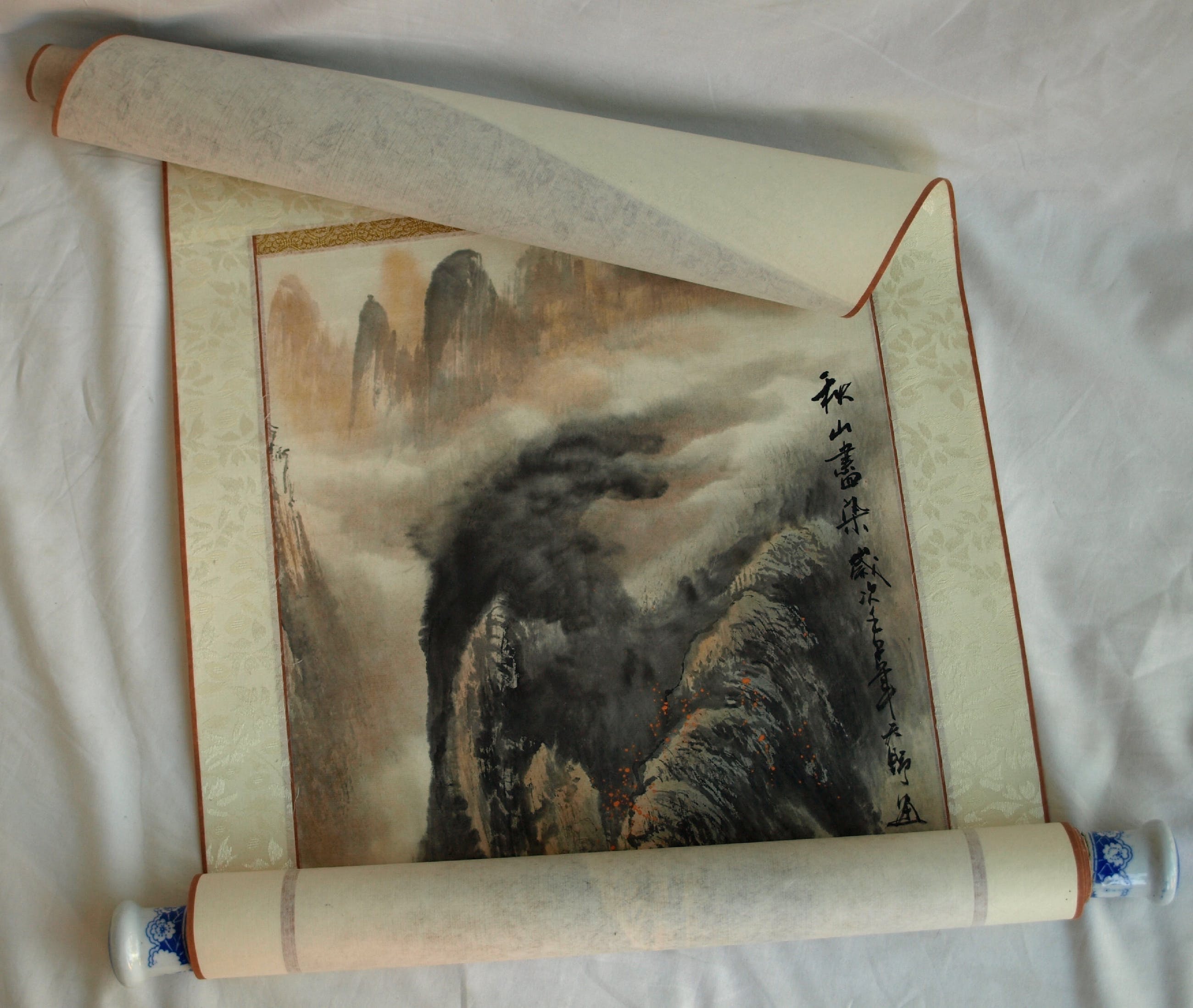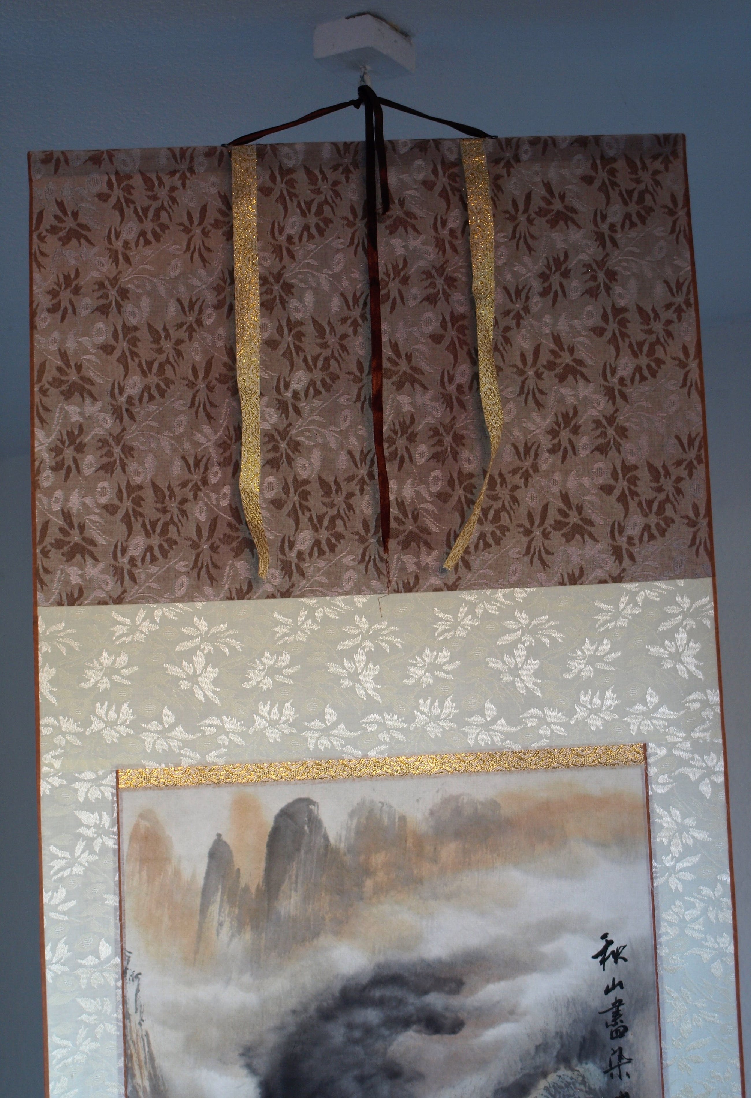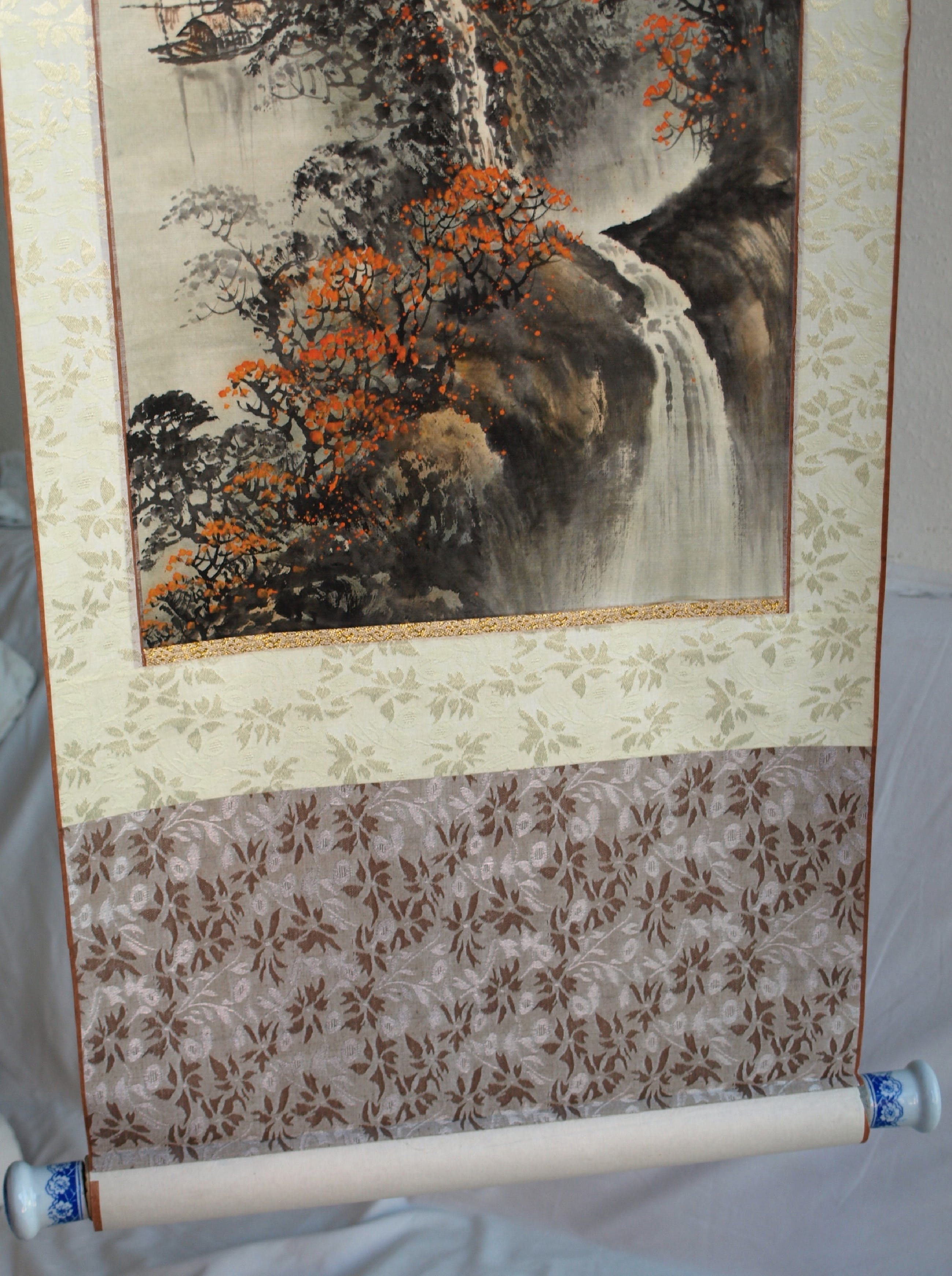 -Een ‘kakejiku’, ("hung scroll") uit het begin van de 20e eeuw, gemaakt door een Japanse (of Chinese?) kunstenaar, met een voorstelling van een landschap met bergen, bootjes, huizen, bomen met bloesem en een waterval. Met zijden stroken rondom de voorstelling.