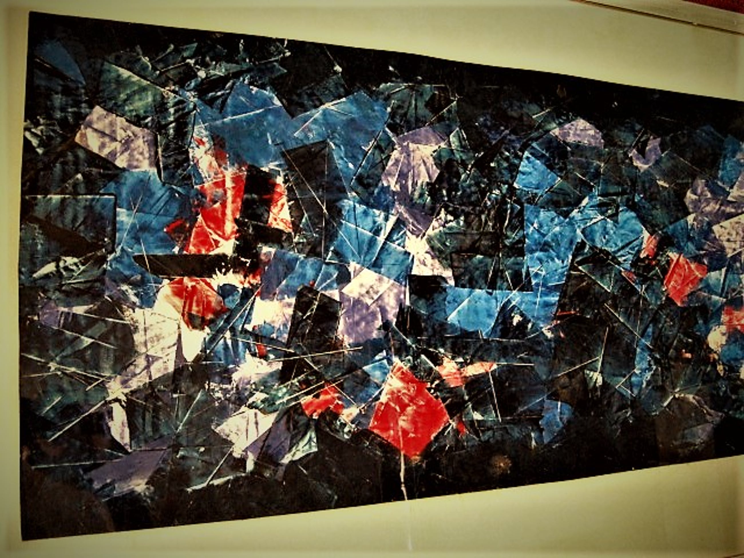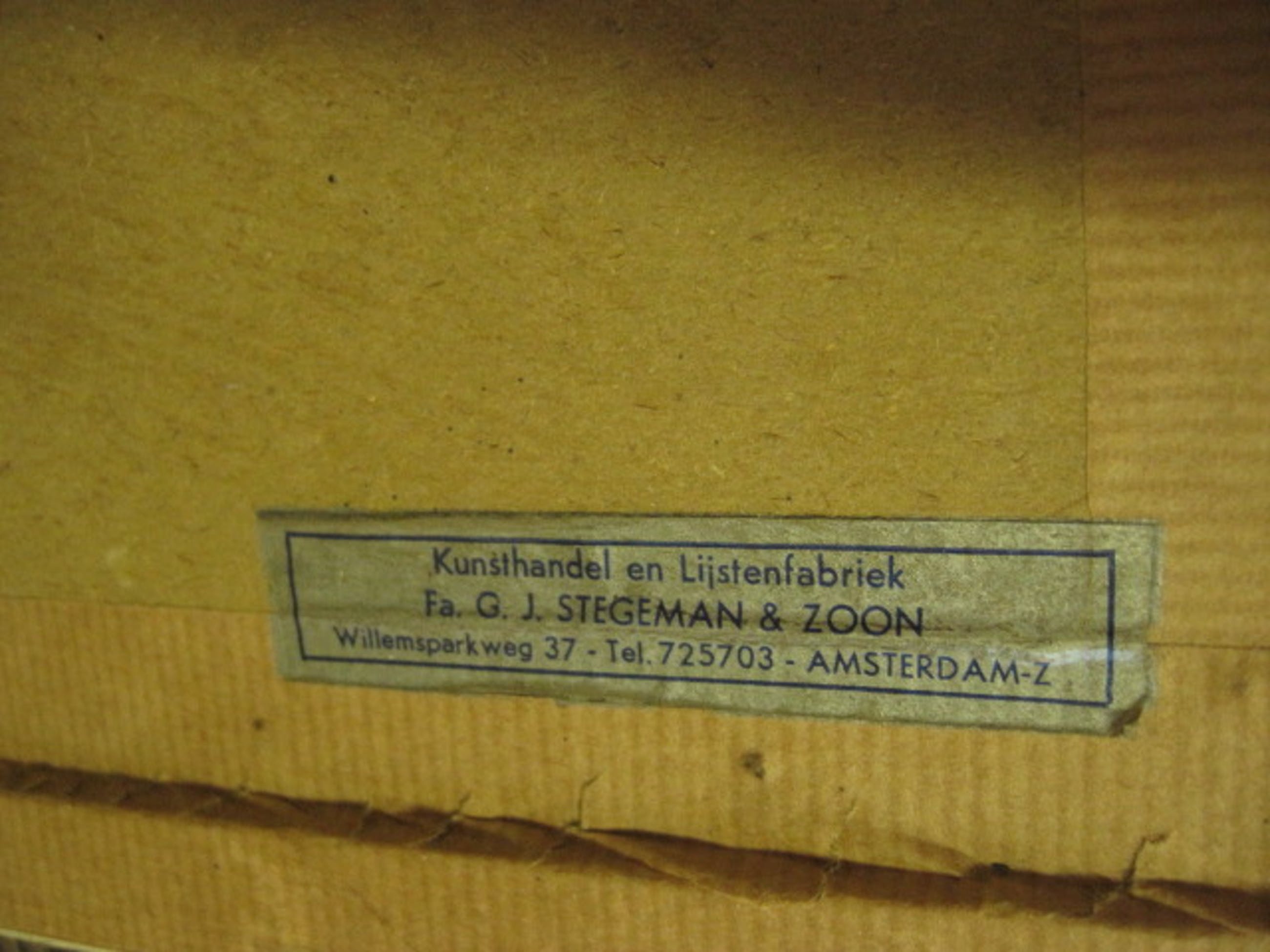 de collage is nog goed van kleur. Het onderliggende papier is wat gelig. In originele jaren 50 lijst.