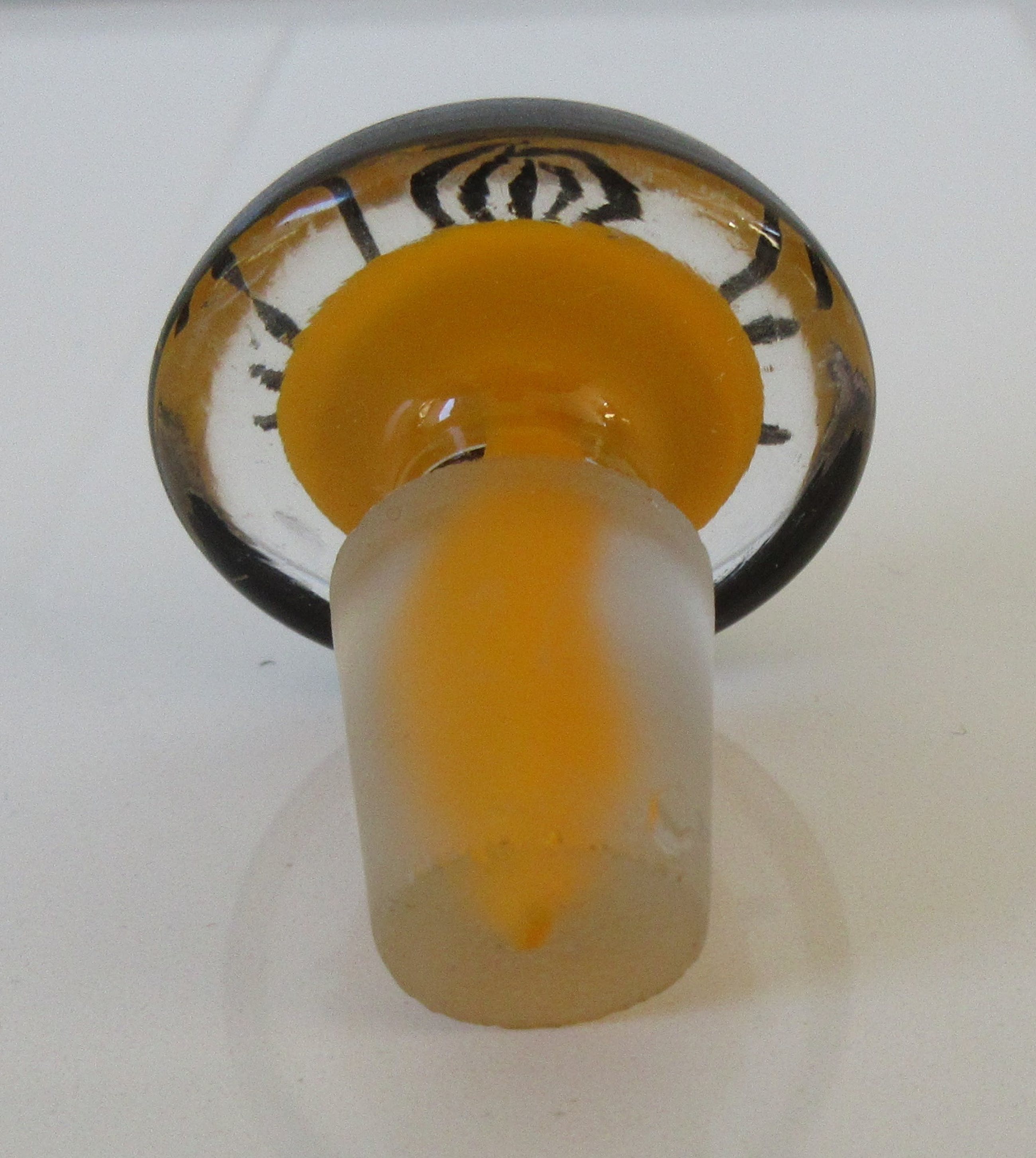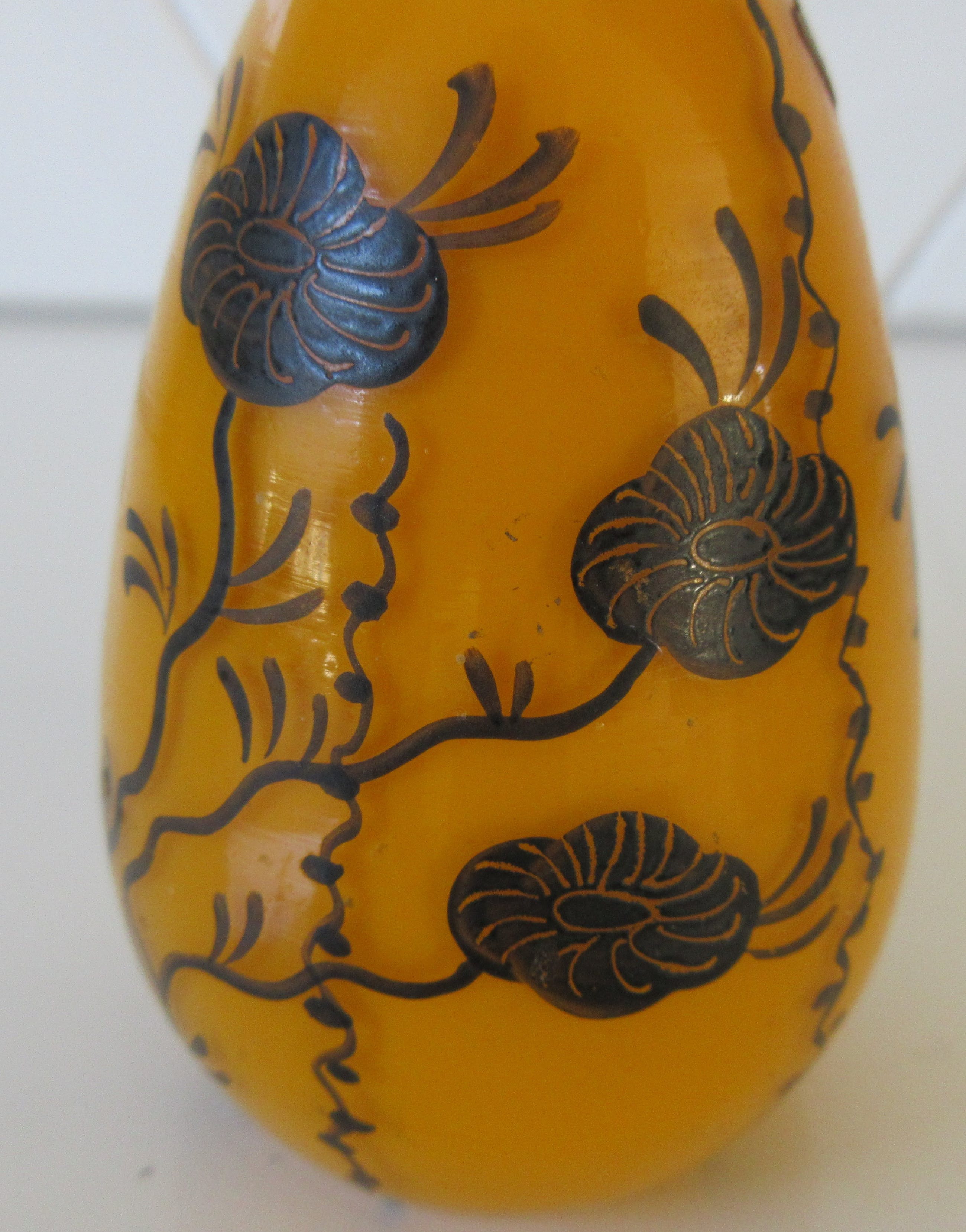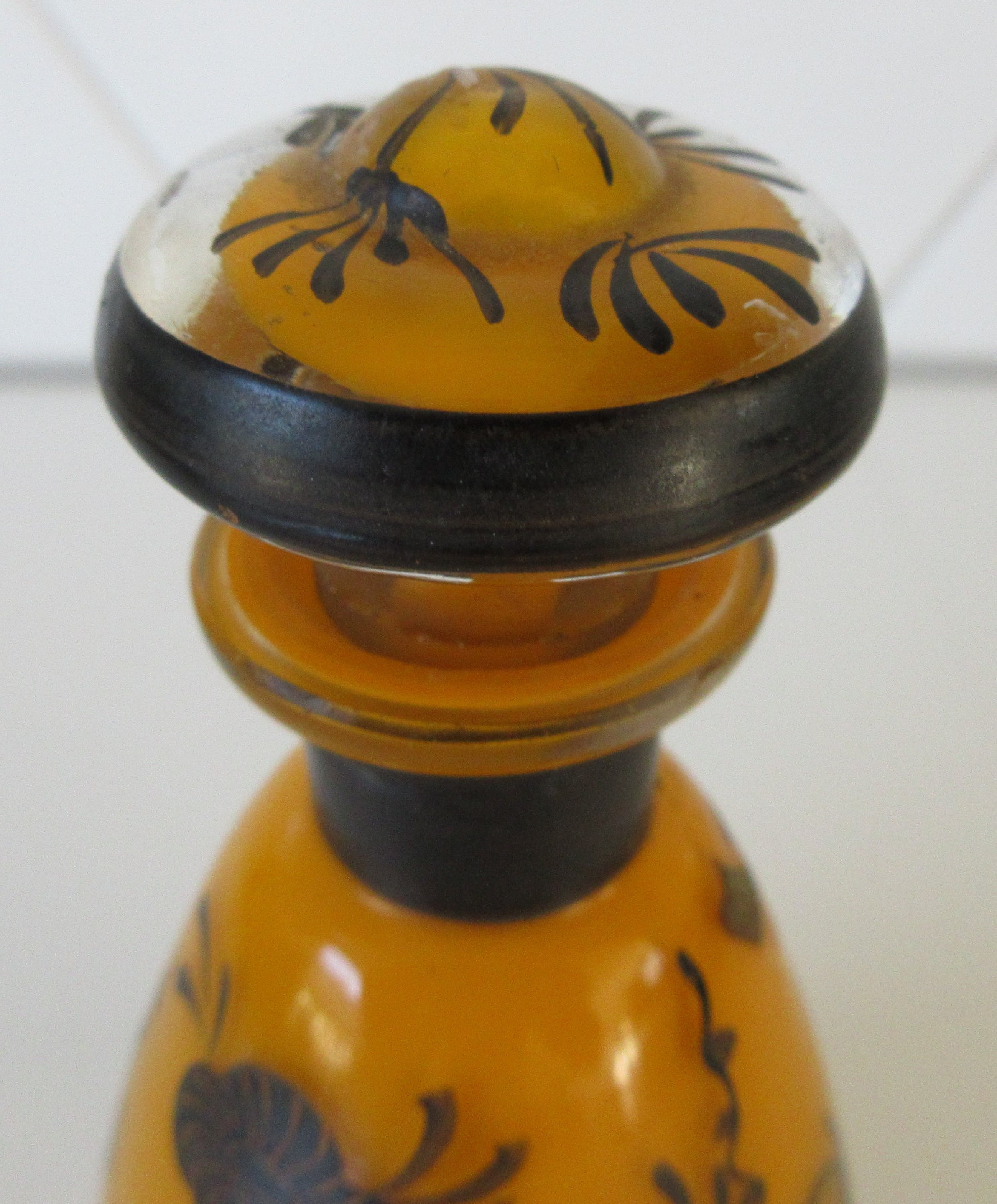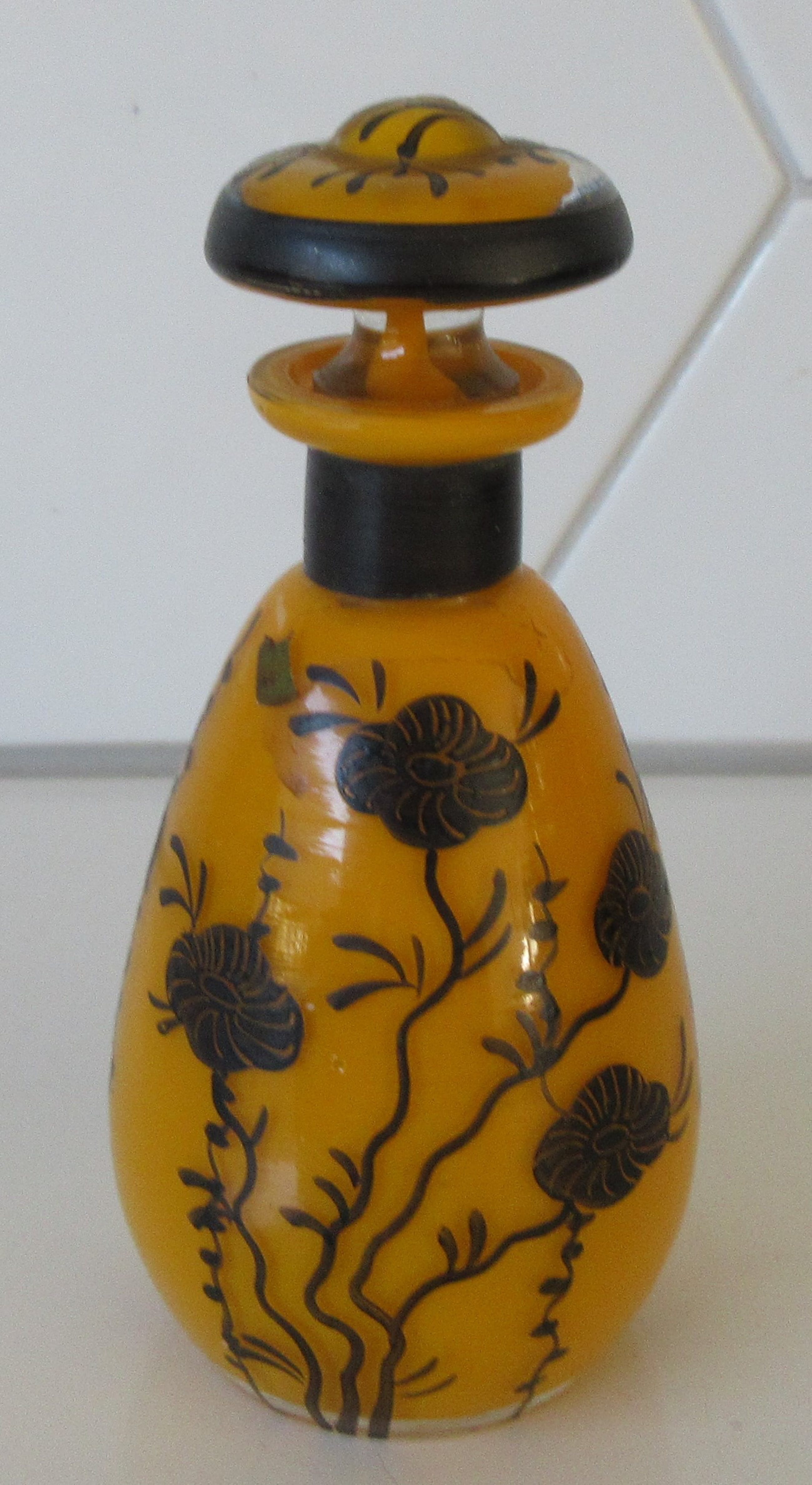 Prachtig oranje/geel glazen parfum of eau de cologne flesje van J.C. Boldoot uit Amsterdam. Het flesje is in het zwart met de hand gedecoreerd met sierlijke bloemen. Aan de onderzijde voorzien van een papieren plakker van J.C. Boldoot uit Amsterdam.