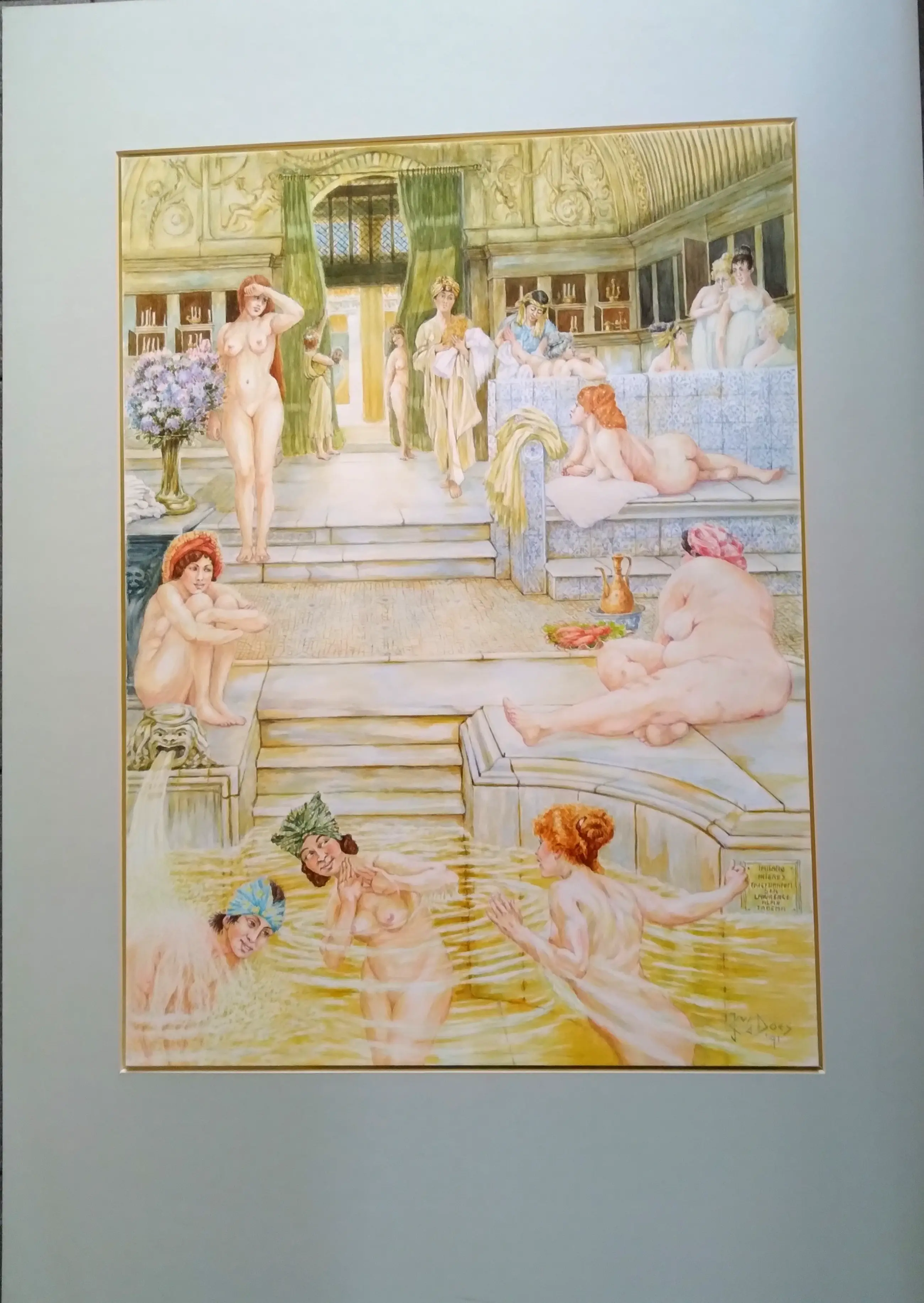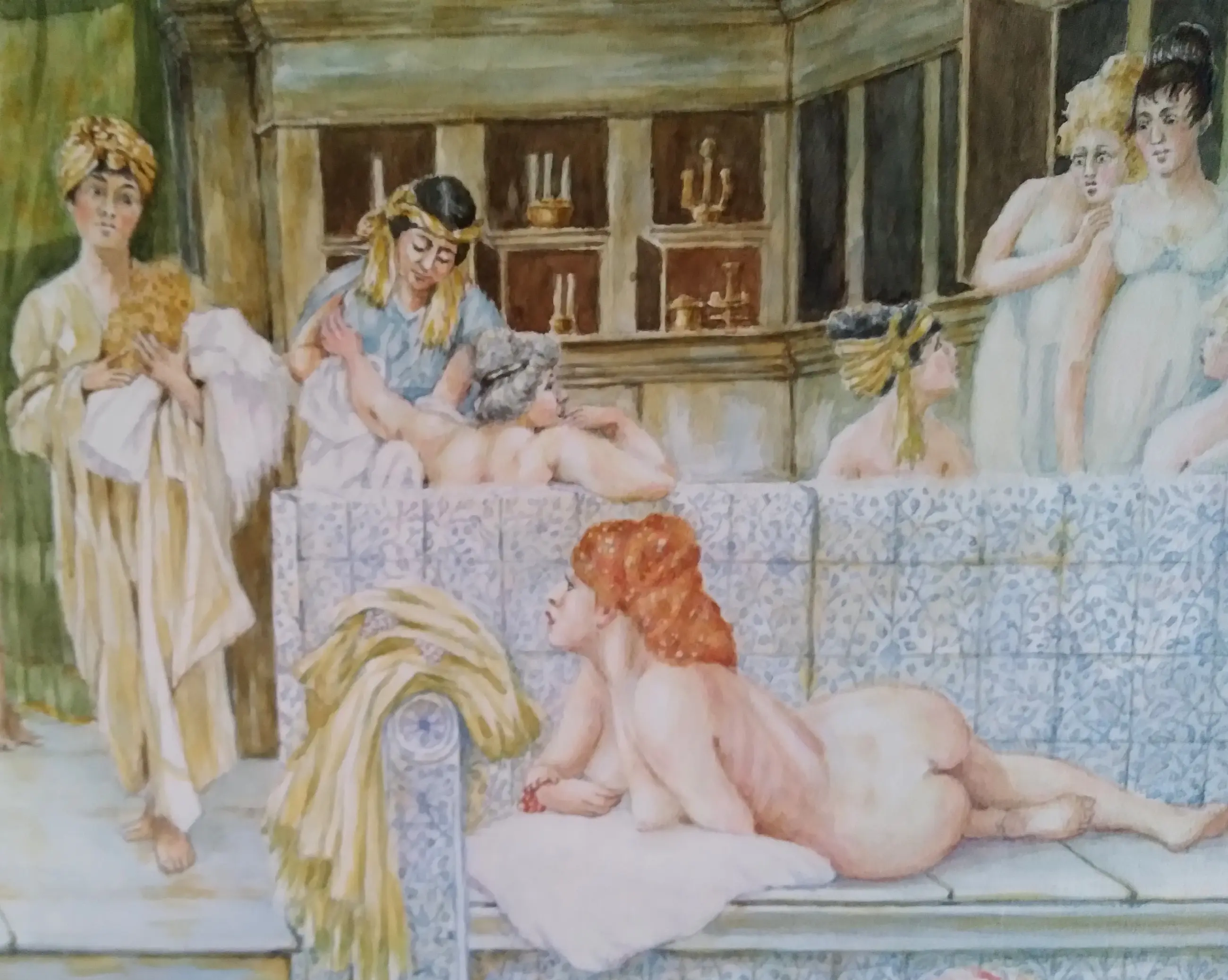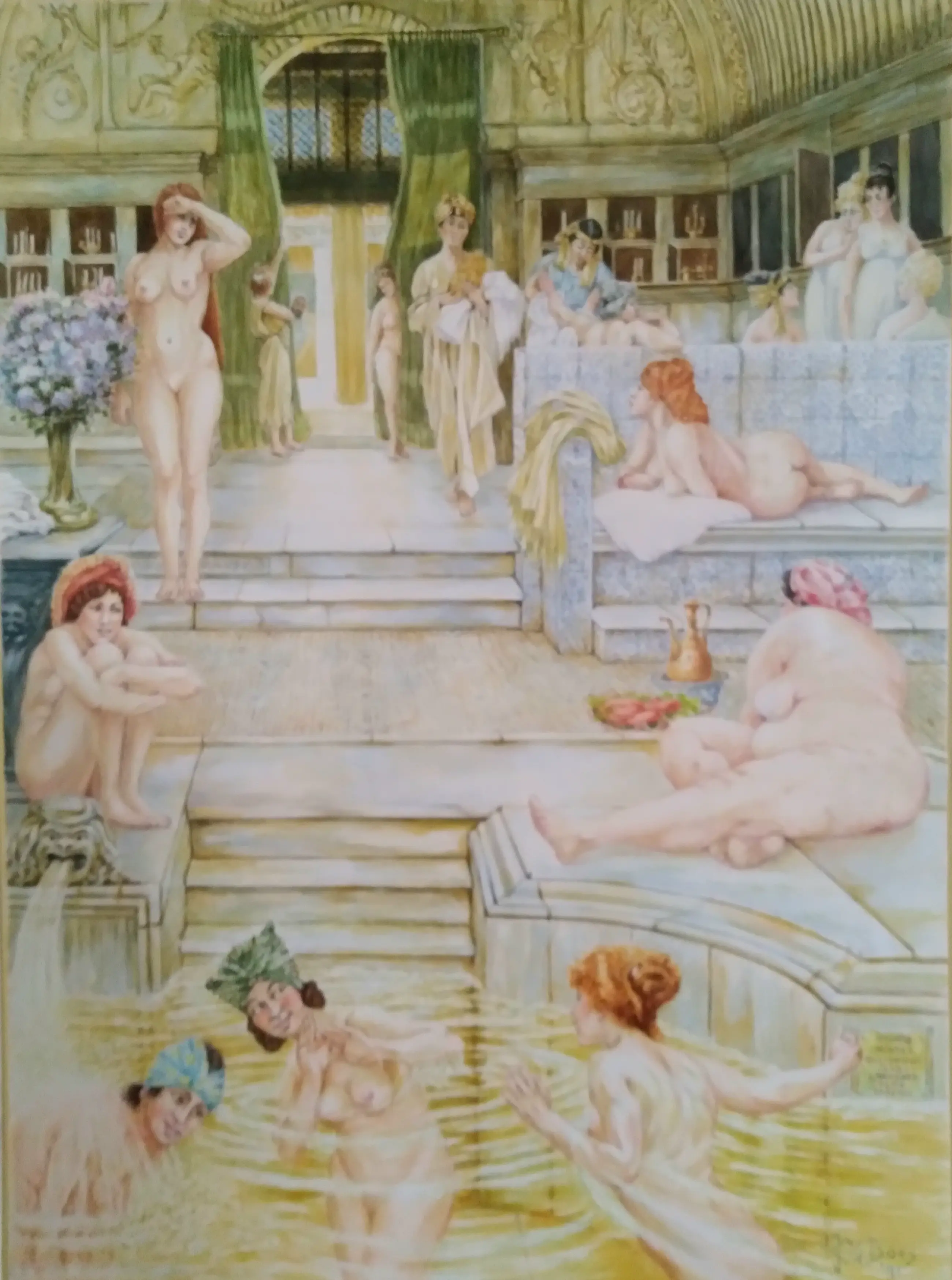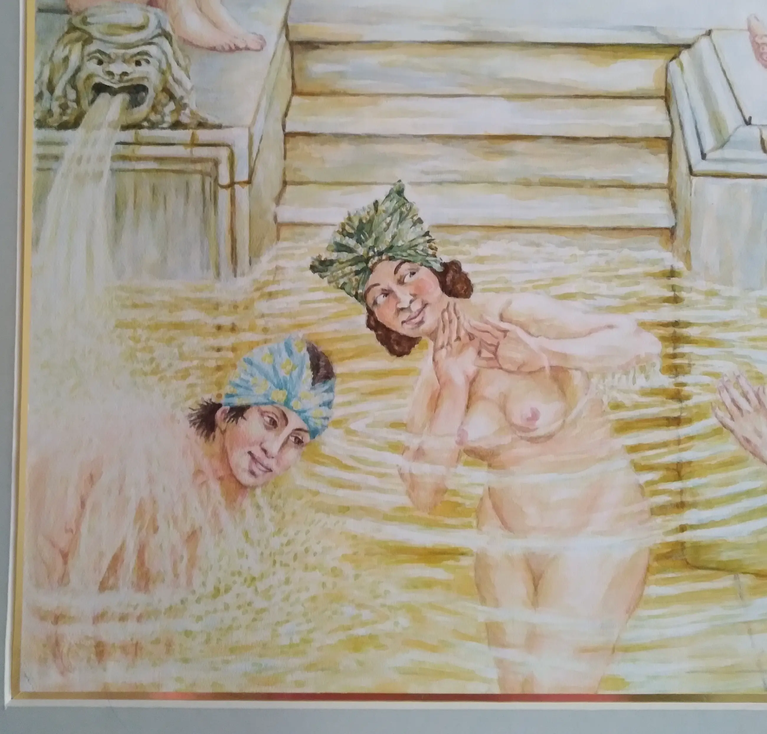Verfijnd en gedetailleerd schilderij van badende dames. Deze scène speelt zich af in de baden van Pompeii.