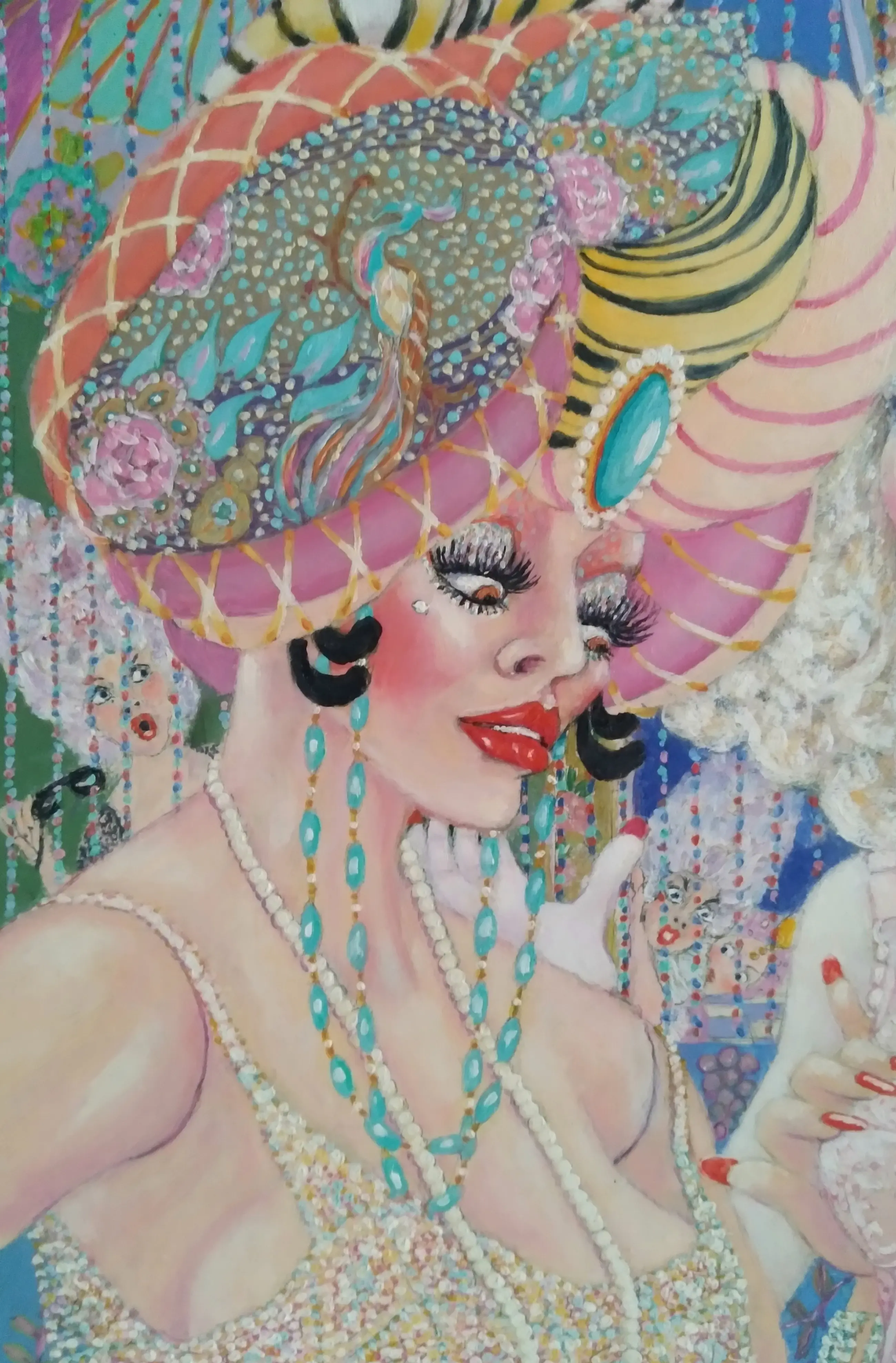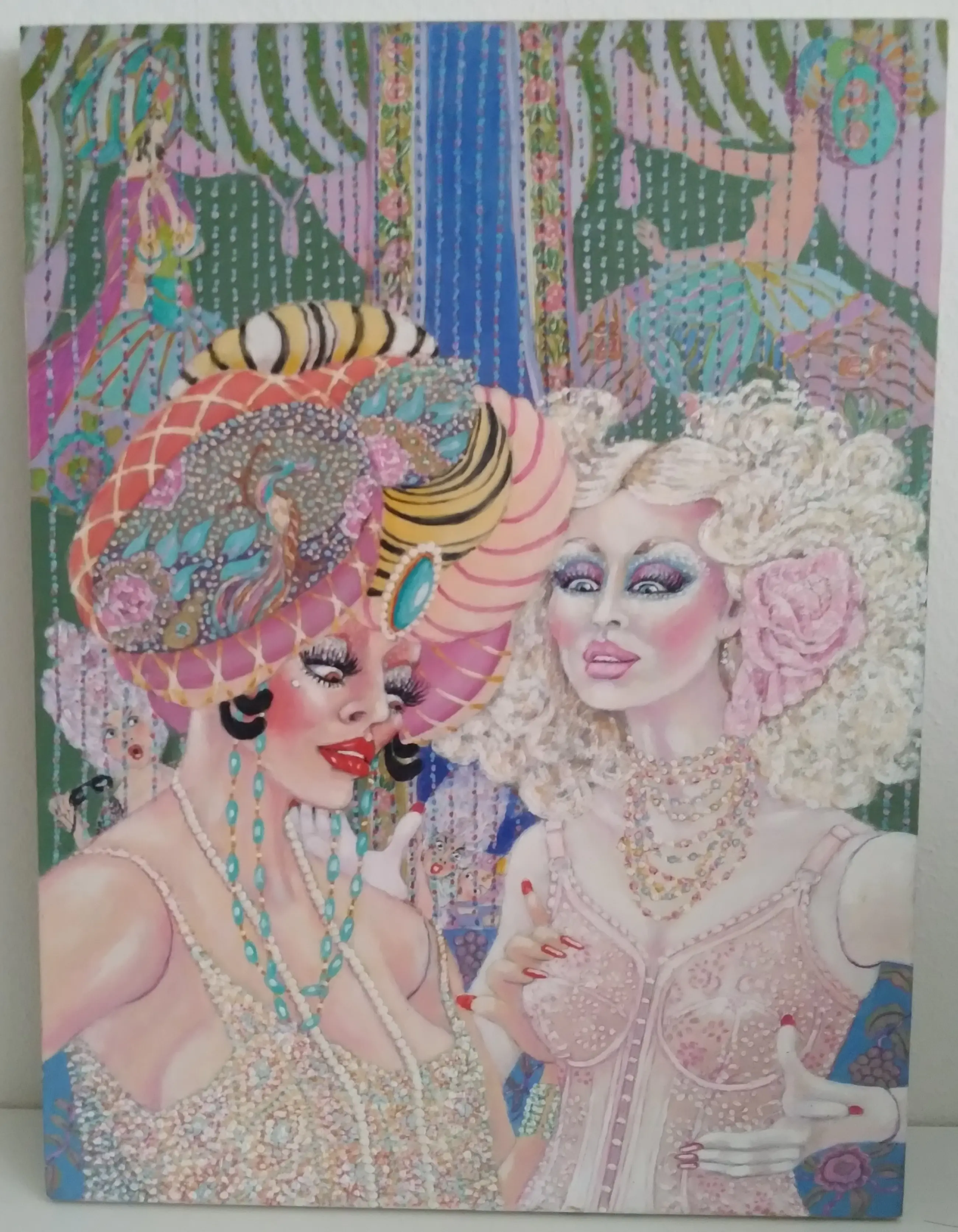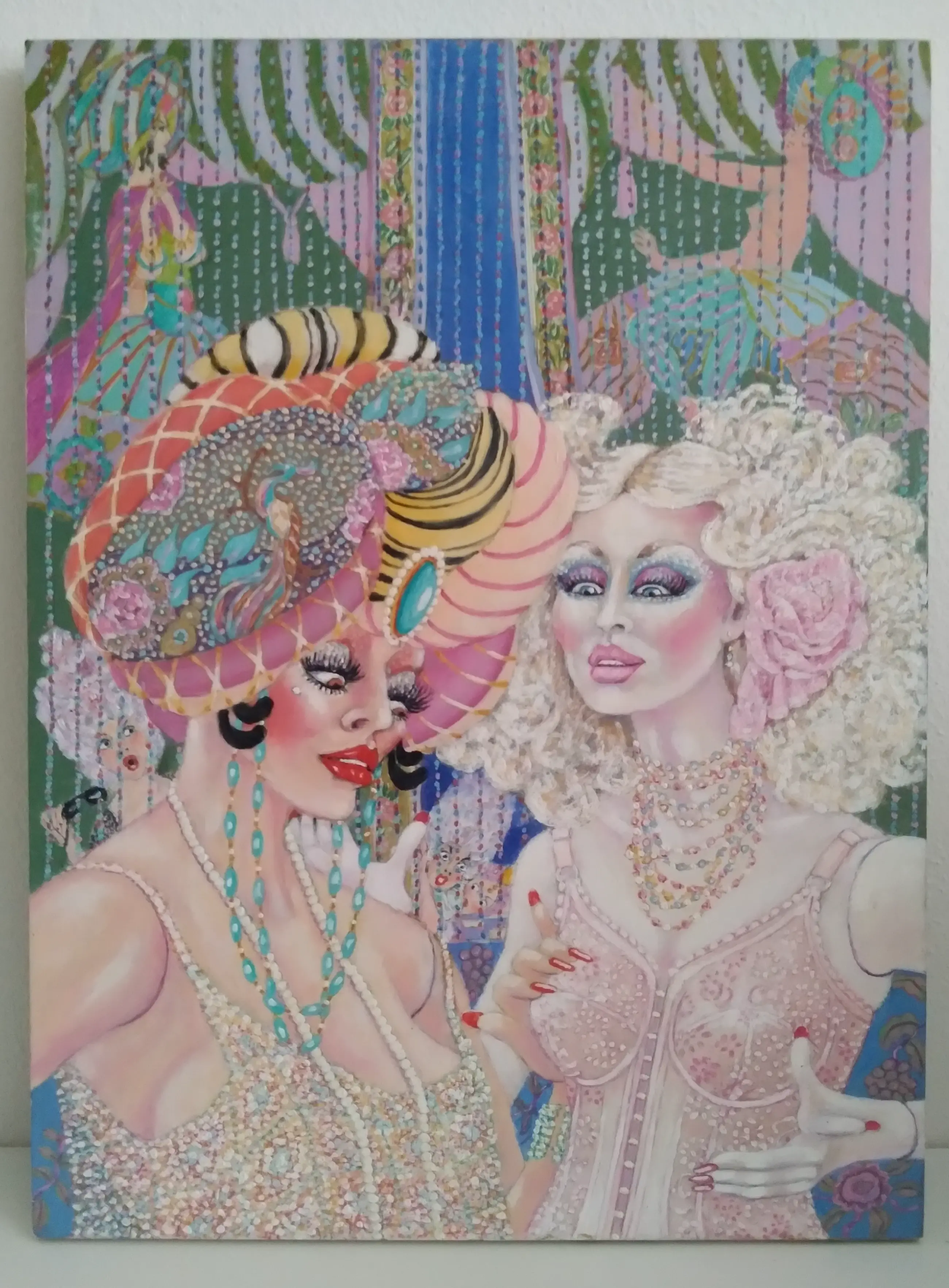 De voorstelling is geschilderd op een paneel en is gedetailleerd uitgewerkt. Het stelt twee dames voor op een feestje, er zijn in de coulissen nog meer feestgangers te ontdekken.