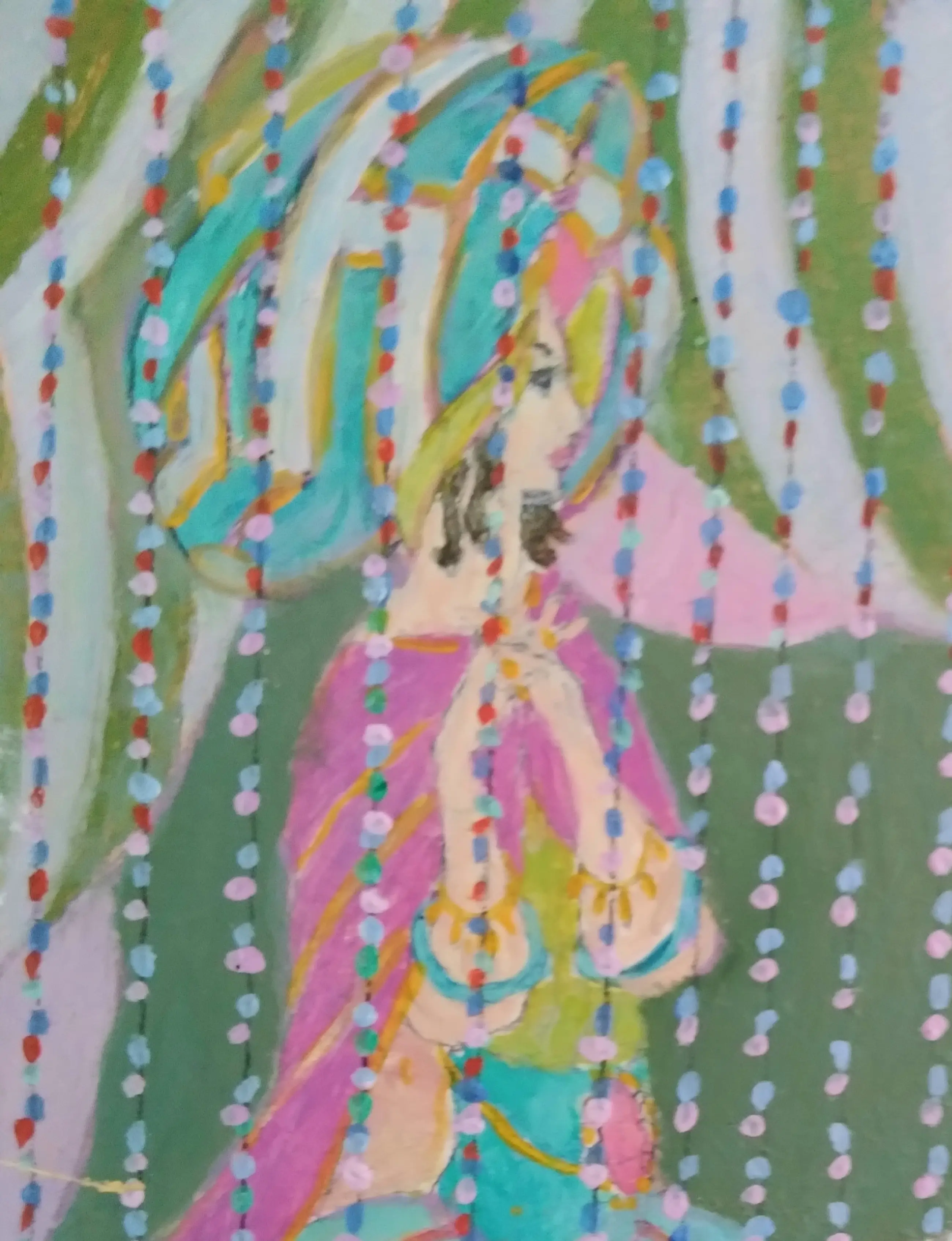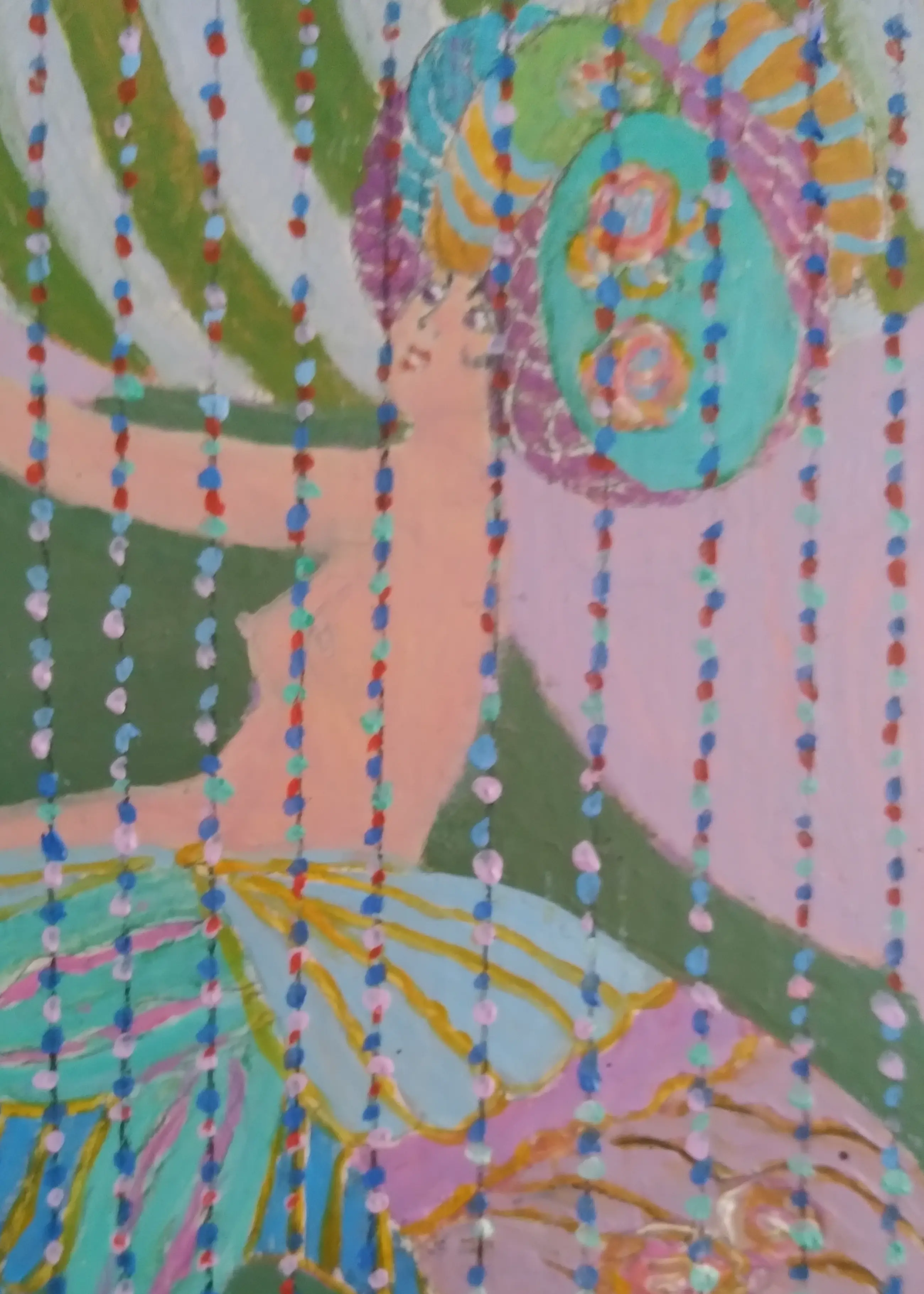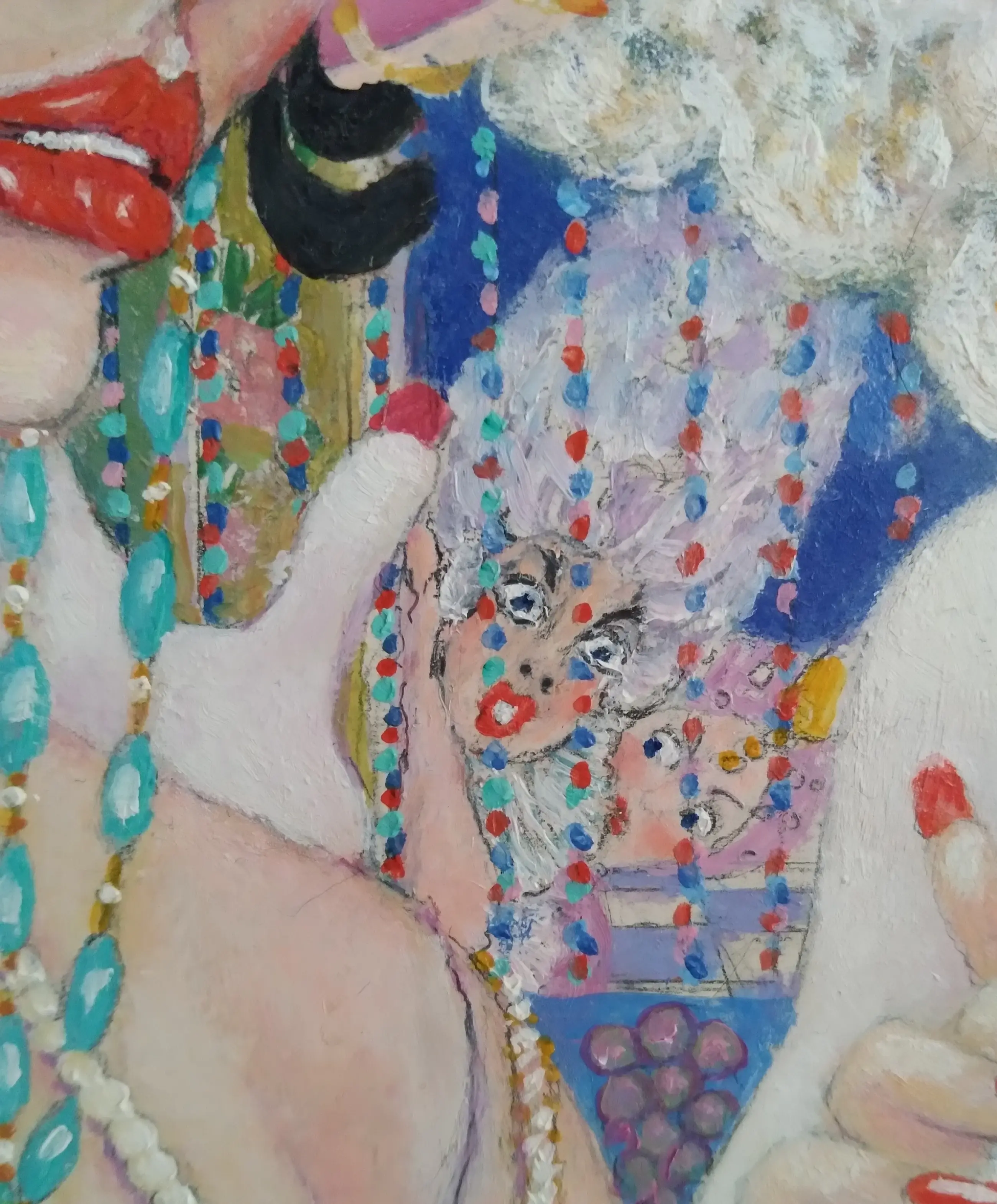 De voorstelling is geschilderd op een paneel en is gedetailleerd uitgewerkt. Het stelt twee dames voor op een feestje, er zijn in de coulissen nog meer feestgangers te ontdekken.