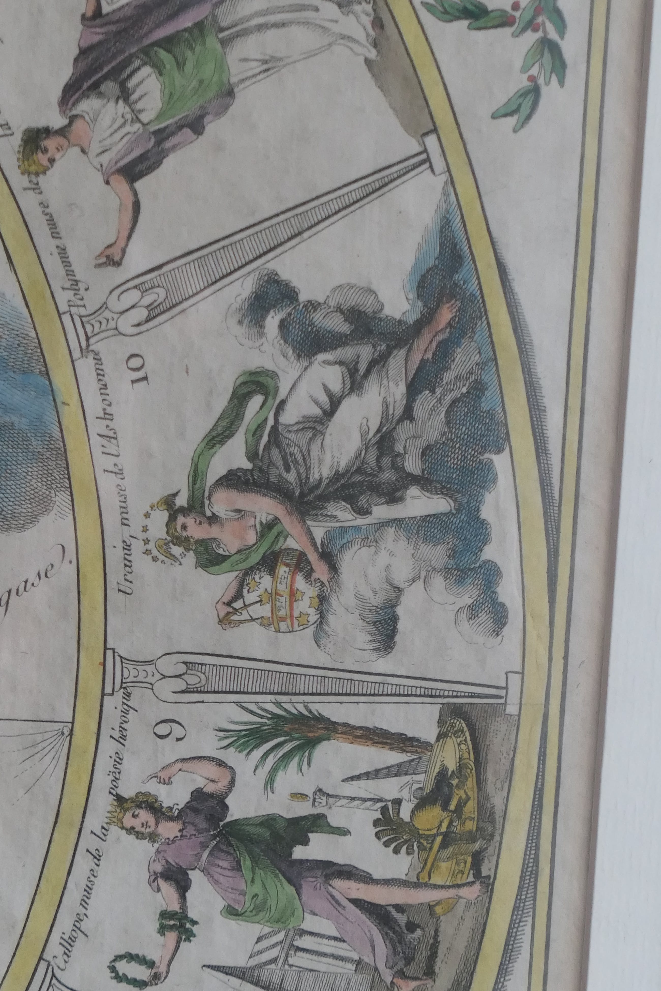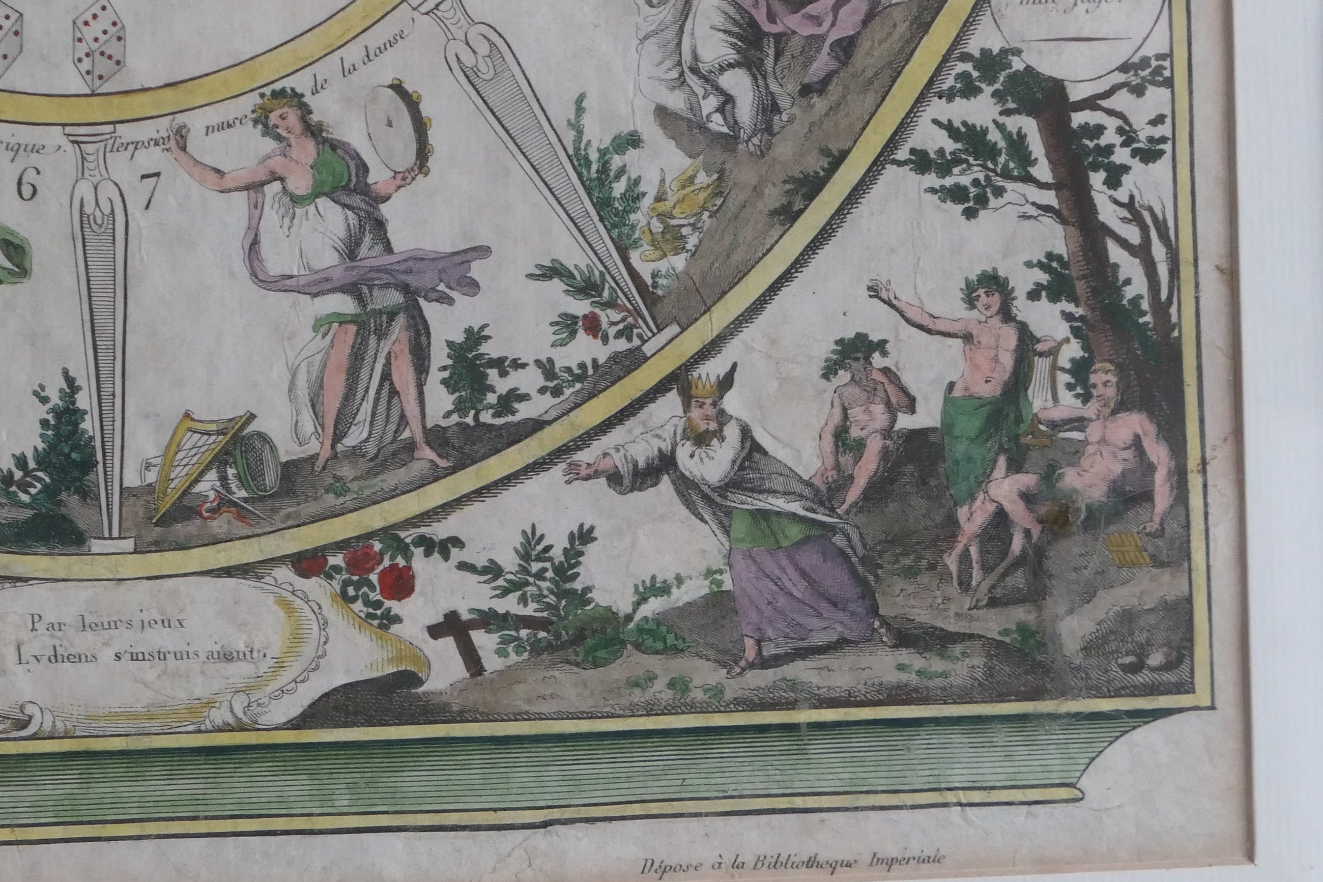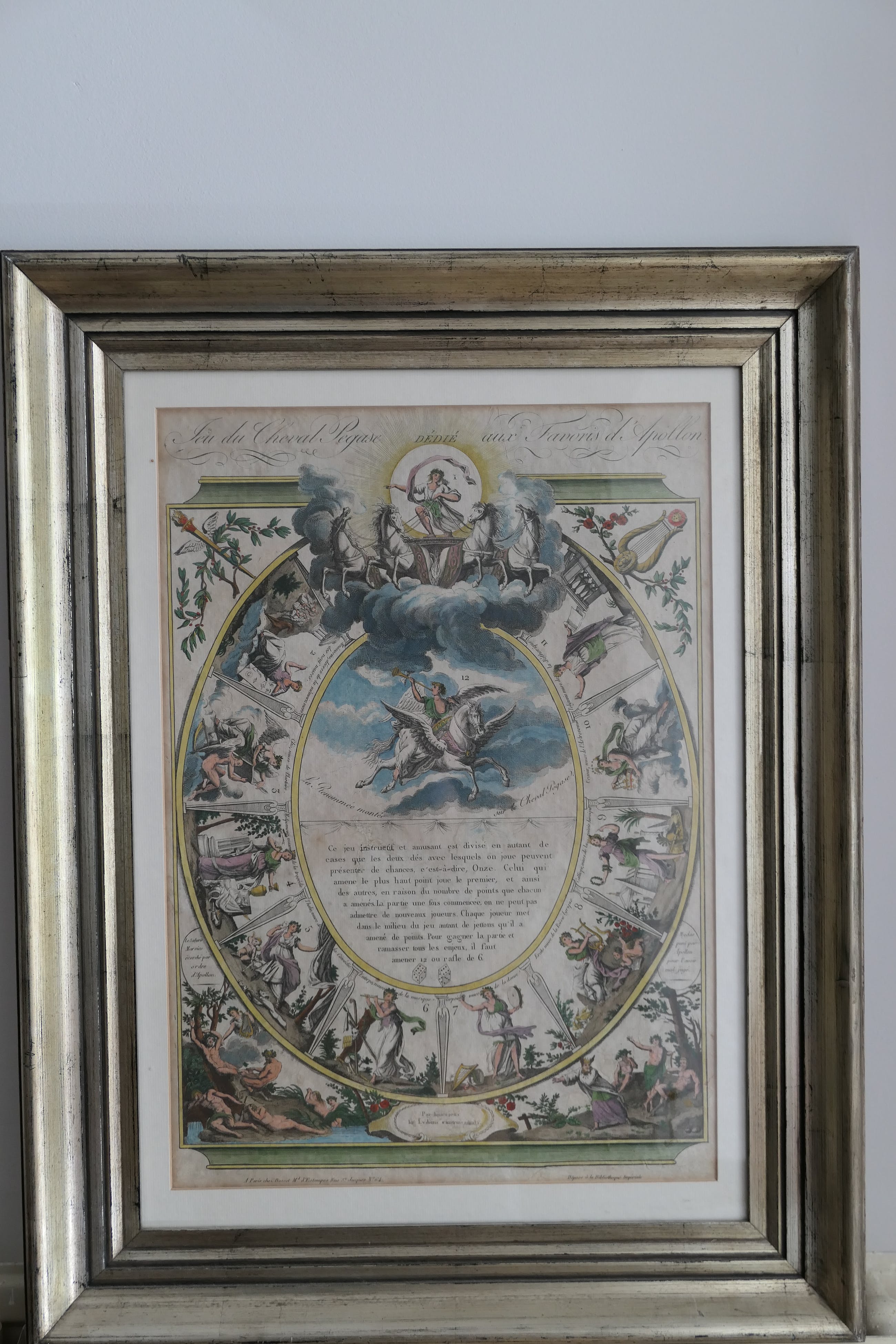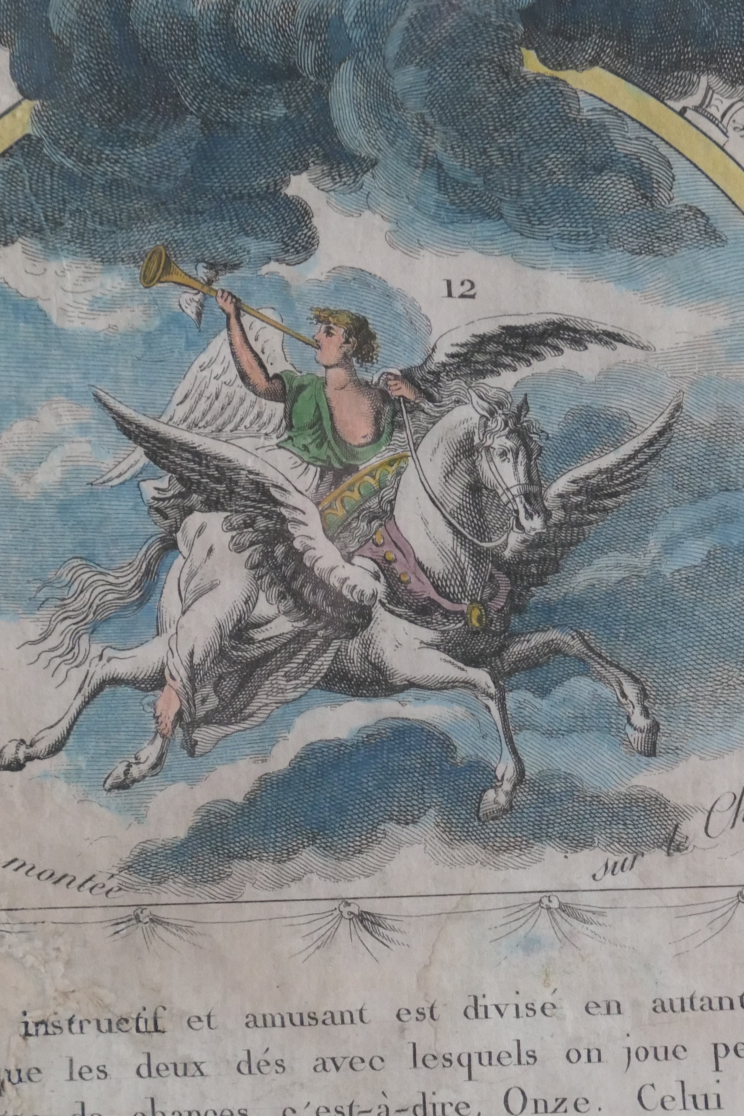 - het is mooie ingelijste gekleurde afdruk van "Jeu du cheval Pegase dédié aux favoris d'Apollon" het origineel is uit 1810 het is een spel met dobbelstenen van 12 vierkanten, spiraalvormig, tegen de klok