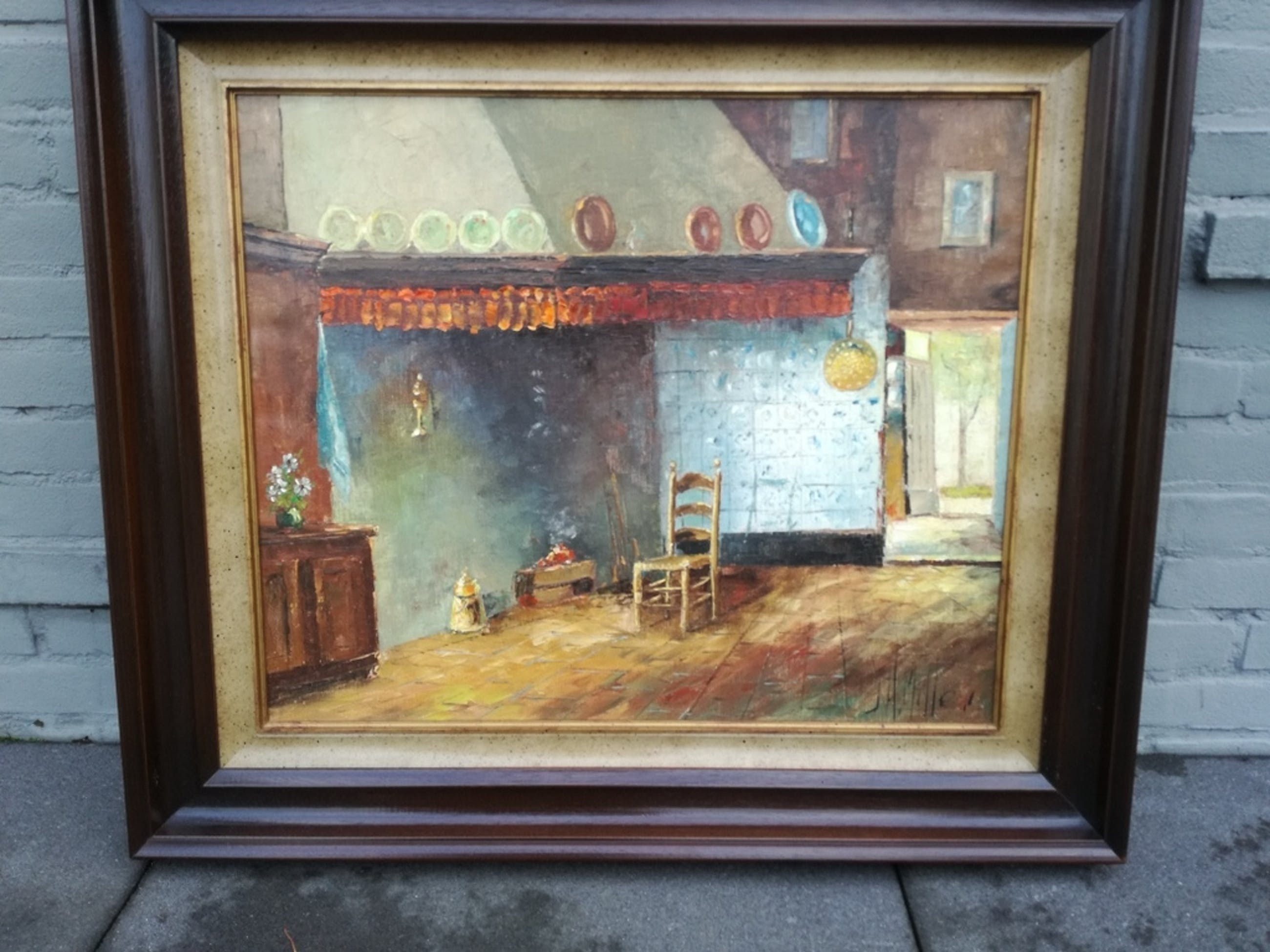 J.H. Miller,  olieverf op doek, oud Hollandse boeren keuken kopen? Bied vanaf 75!