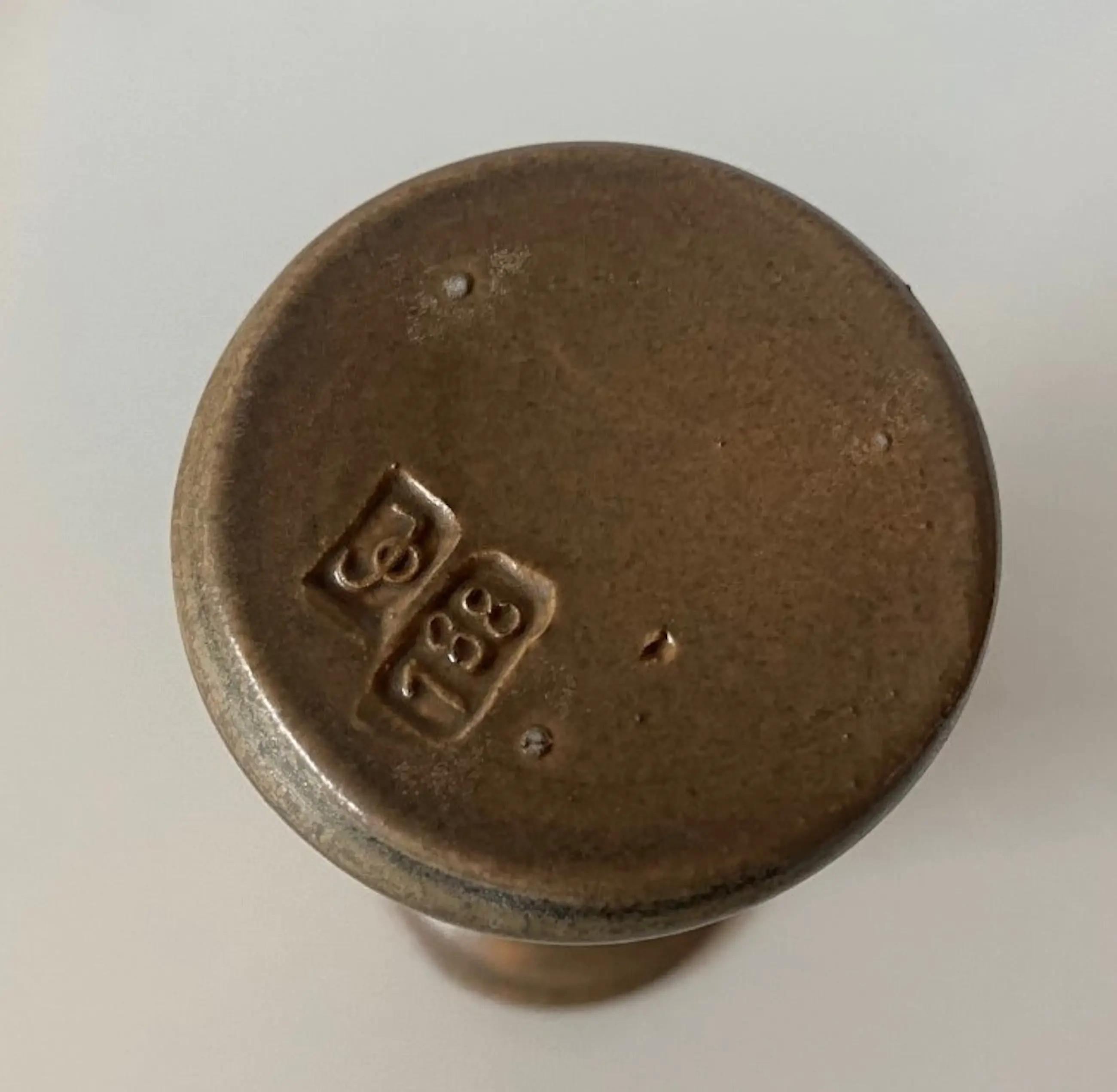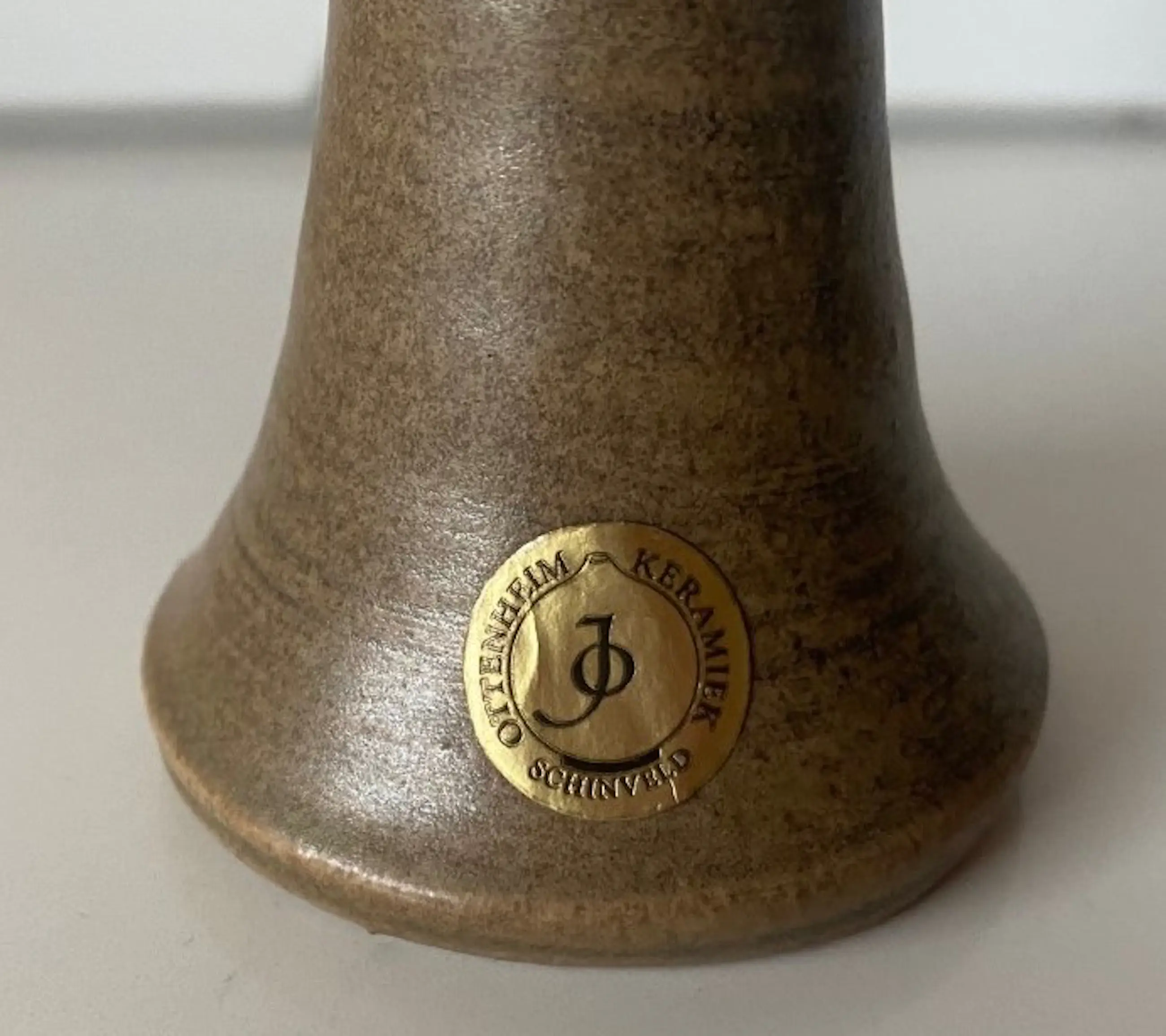 Steengoed solifleur vaasje met mat bruin-grijs glazuur van Jo Ottenheim uit Schinveld, gemaakt in eigen atelier. Voorzien van een ingedrukt monogram en modelnummer aan onderzijde en een merksticker aan de voorzijde. In prima onbeschadigde conditie.