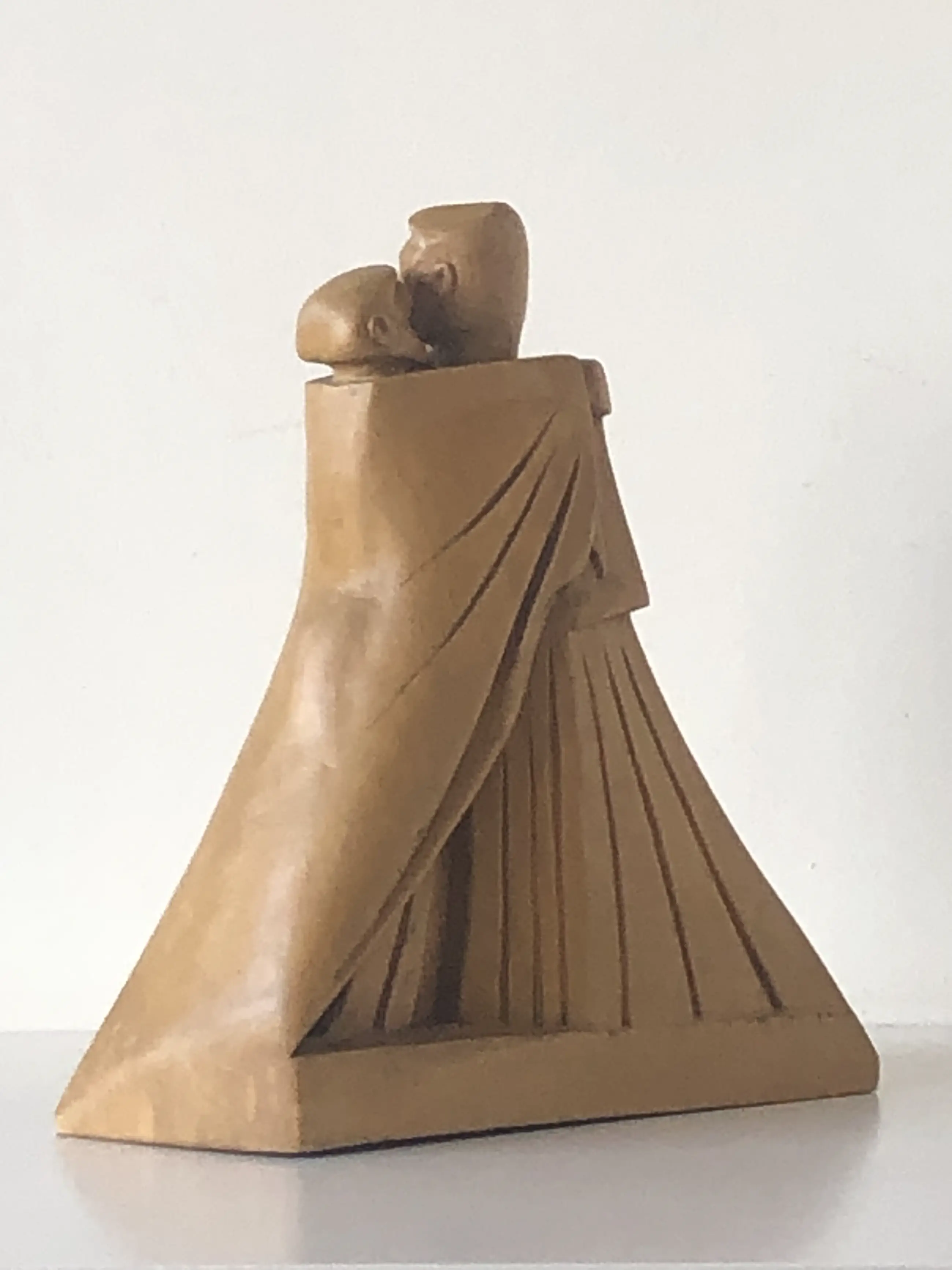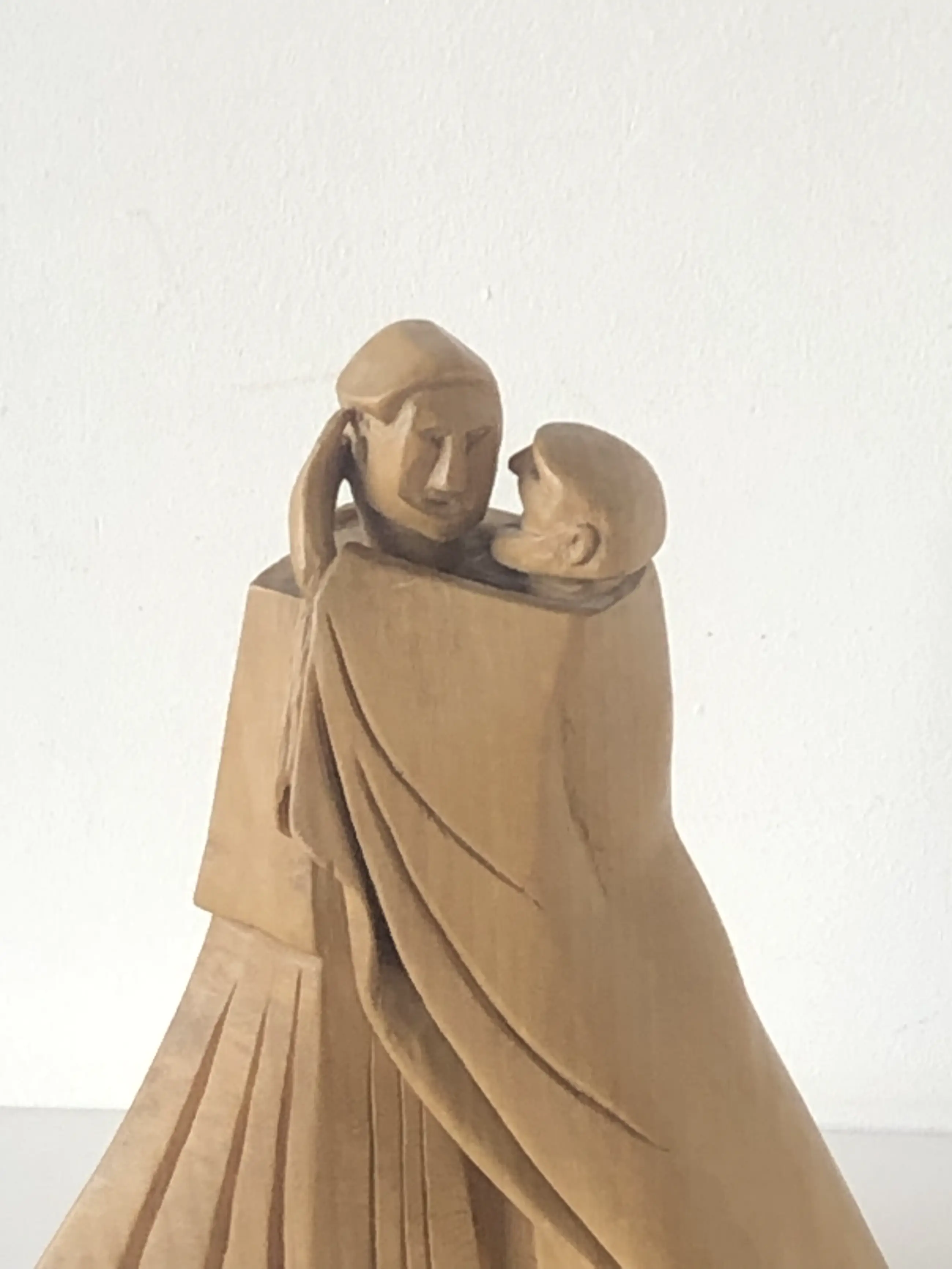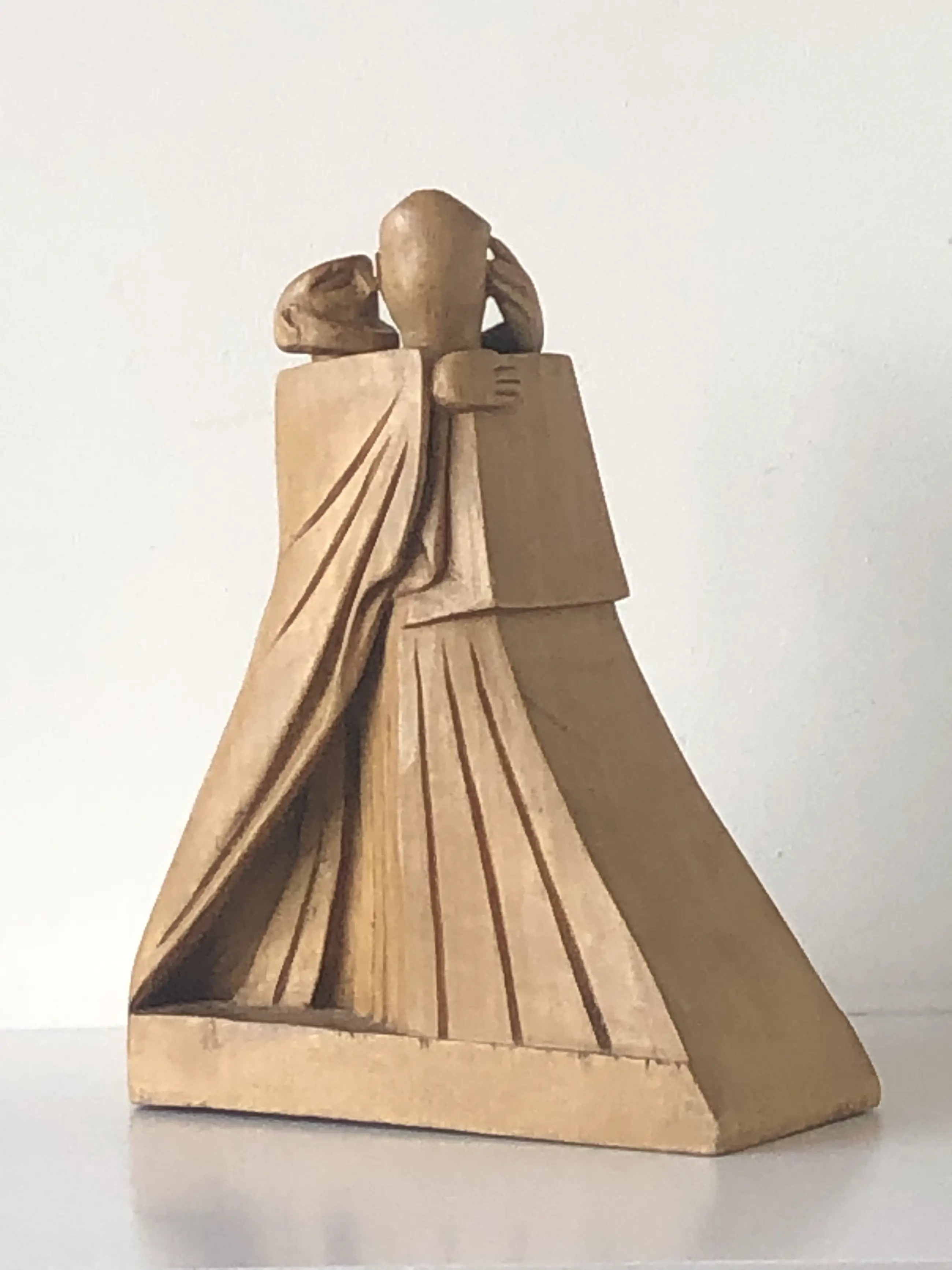 Knap gesneden houten beeld geinspireerd op de Judaskus van Josep Maria Subirachs uit 1883, Sagrada Familia Barcelona. Gesigneerd HC en gedateerd 01 zo lijkt het.. (1901/2001?)