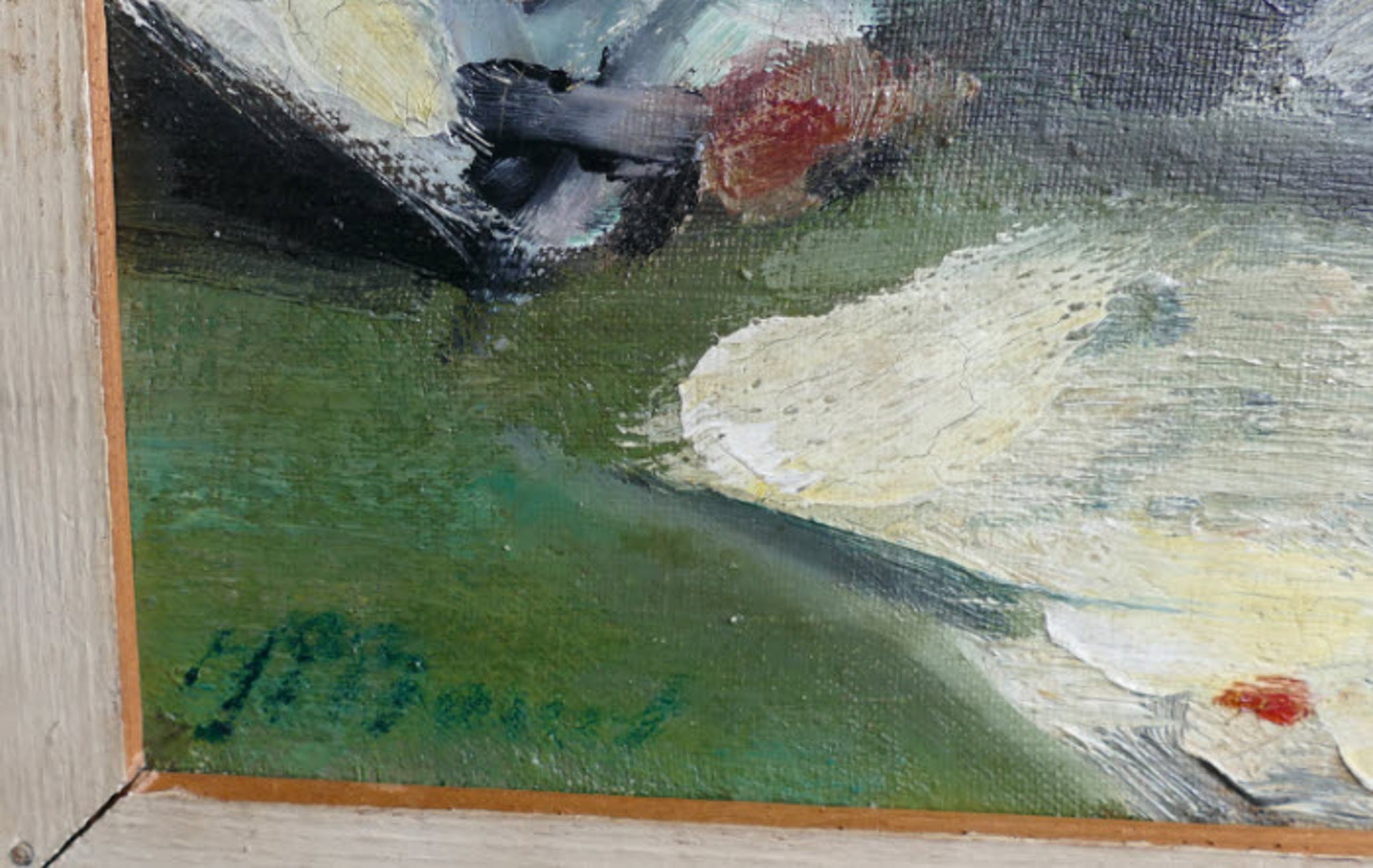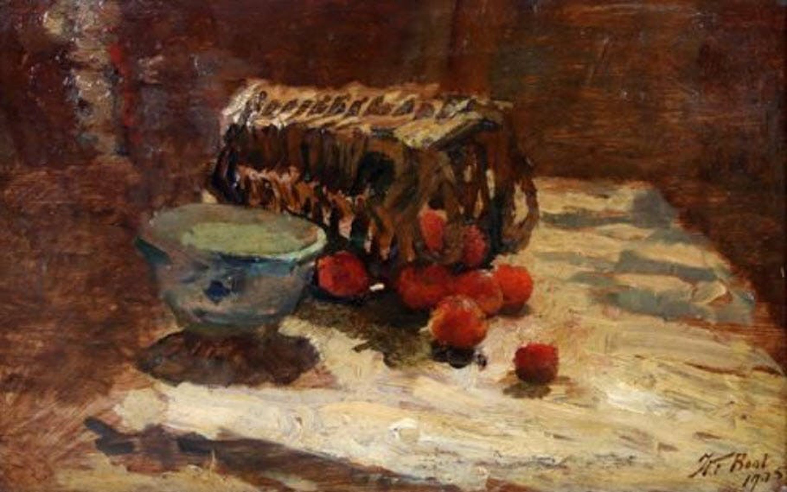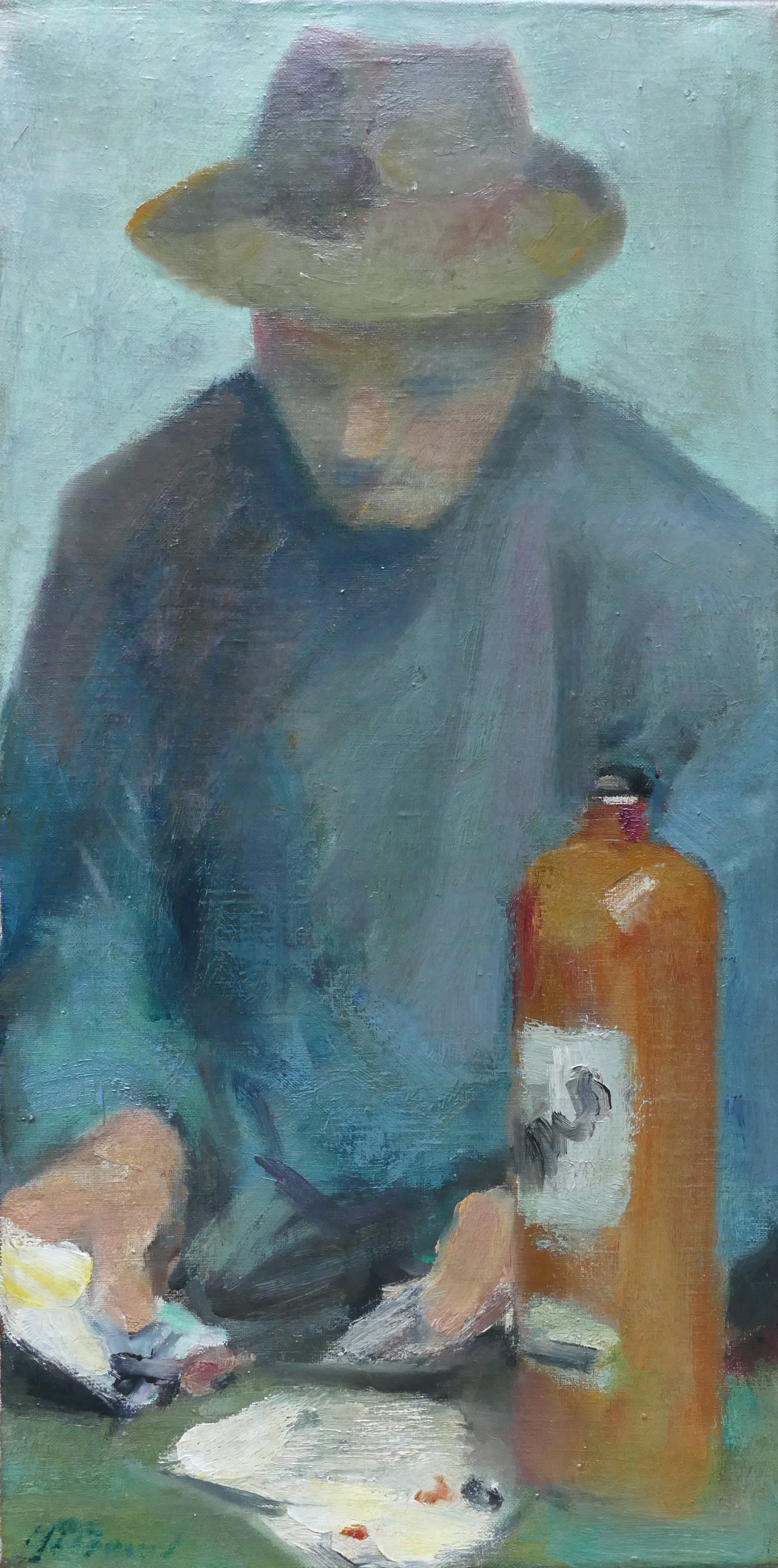 Bijzonder knap geschilderd werk van een kaartspeler met jenever fles Onduidelijk gesigneerd , maar signatuur lijkt op de vroege signatuur van HF Boot (zie laatste afbeelding van "een mandje met aarbeien ", een werk wat in 2014 bij het vendu notarishuis in Rotterdam geveild werd). Dus het werk is mogelijk van deze kunstenaar.