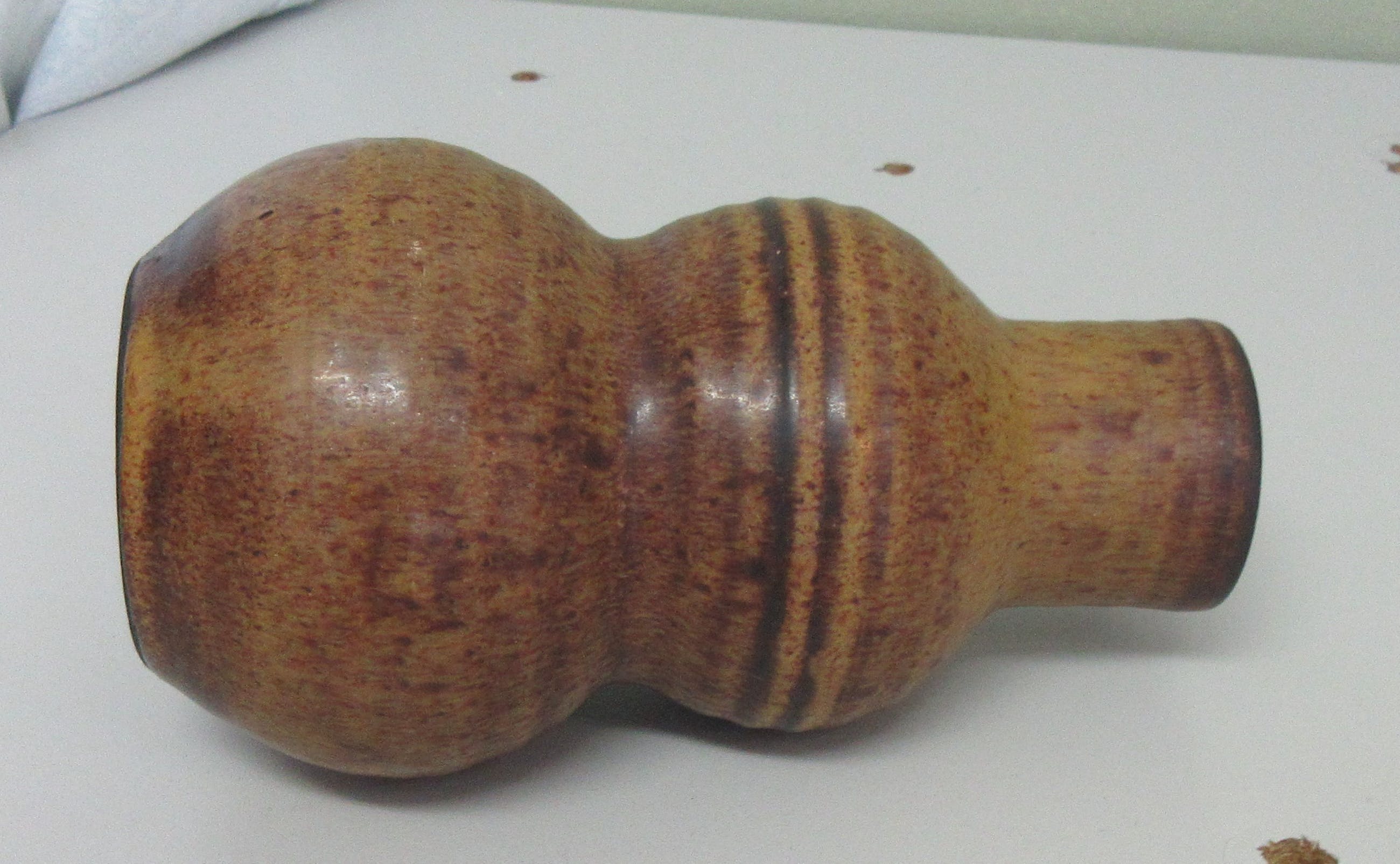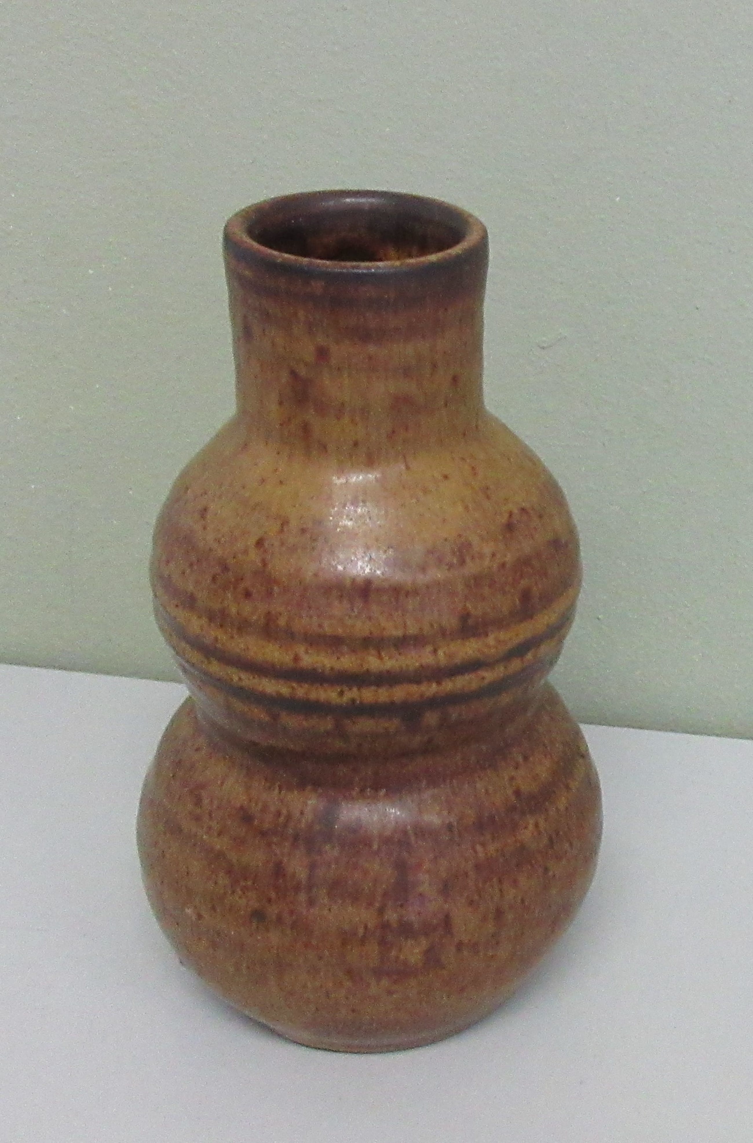 Kalebas vormig aardewerk vaasje voorzien van matbruin stroomglazuur. Met de hand gesigneerd en gedateerd '82 op de achterzijde. Helaas is de signatuur onbekend dus de maker ook.