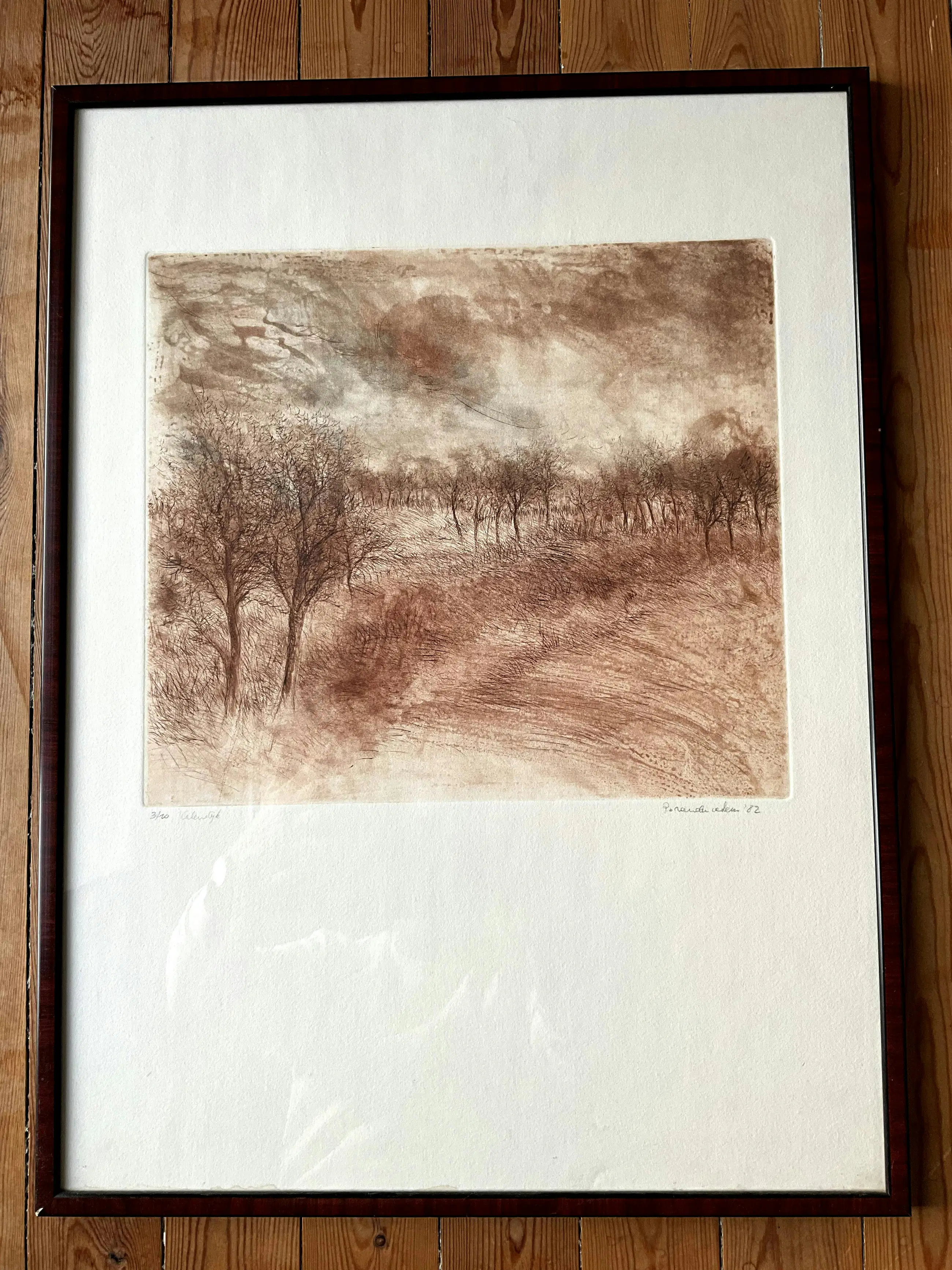 Deze sfeervolle landschapsprent toont "Kalendijk" (Dendermonde). Het monochrome, warmbruine kleurgebruik geeft het werk een tijdloos karakter en benadrukt de ambachtelijke kwaliteit van de grafische techniek. Technisch heel goed gedaan. Heel degelijk ingekaderd.