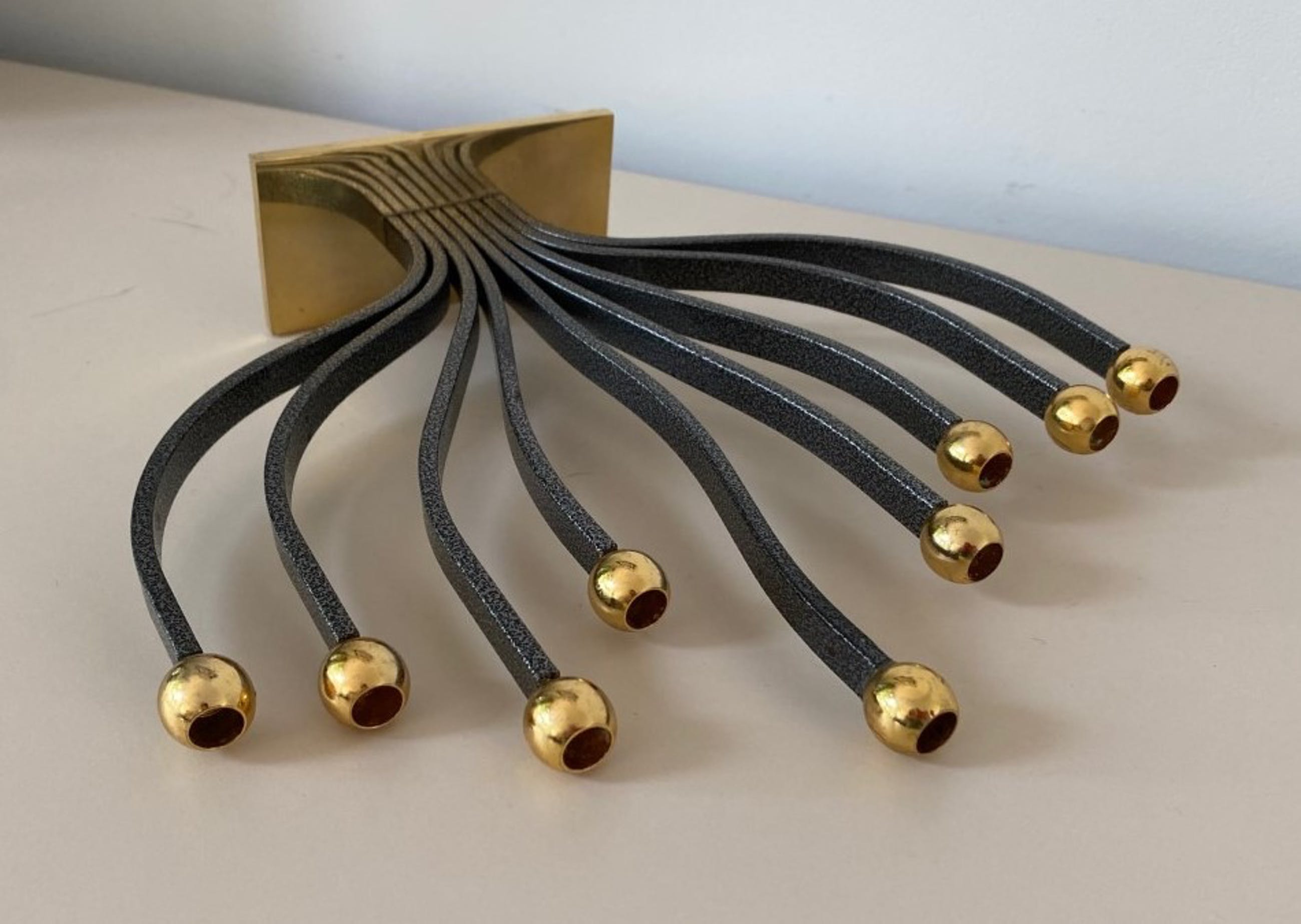 Fraaie moderne Joodse Kandelaar met 9 armen. Afkomstig uit Jerusalem. Goldplated (24k) by Karshi. Mooi vormgegeven en in keurige conditie. op de voet voorzien van ingedrukt merk en sticker aan de achterzijde.