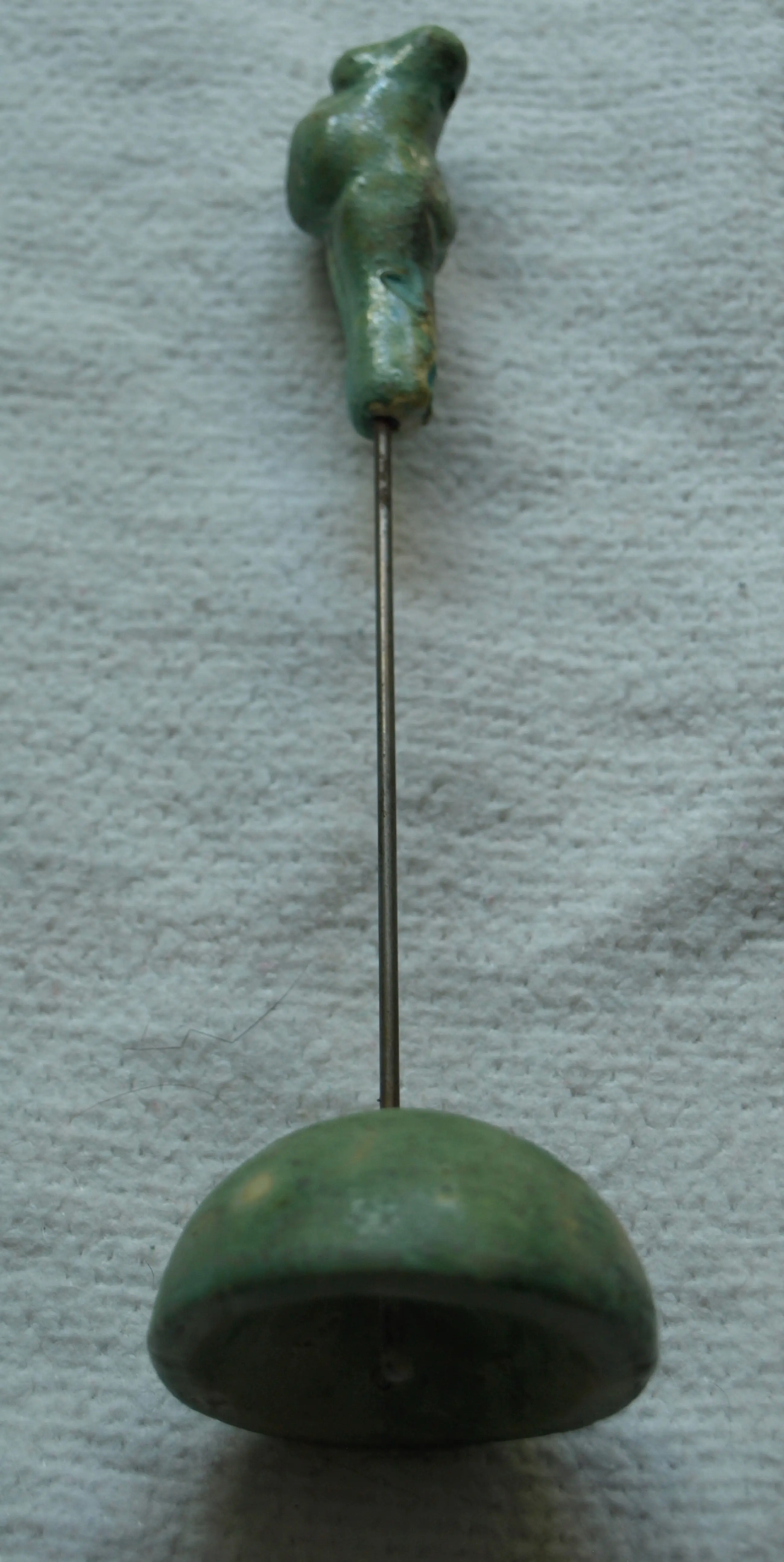 Een keramieken beeldje van een ons onbekende kunstenaar. -De voet is ook van keramiek. -Afmetingen: Beeldje, 6½ x 3 x 2½ cm (hoogte x breedte x diepte). -Totale hoogte (inclusief voet), 18 cm. -Gewicht: 74 gram. -Jaartal onbekend. -Herkomst: Uit een inboedel. -Conditie: Het beeldje is in goede staat. Zie ook de foto’s voor een eigen indruk.