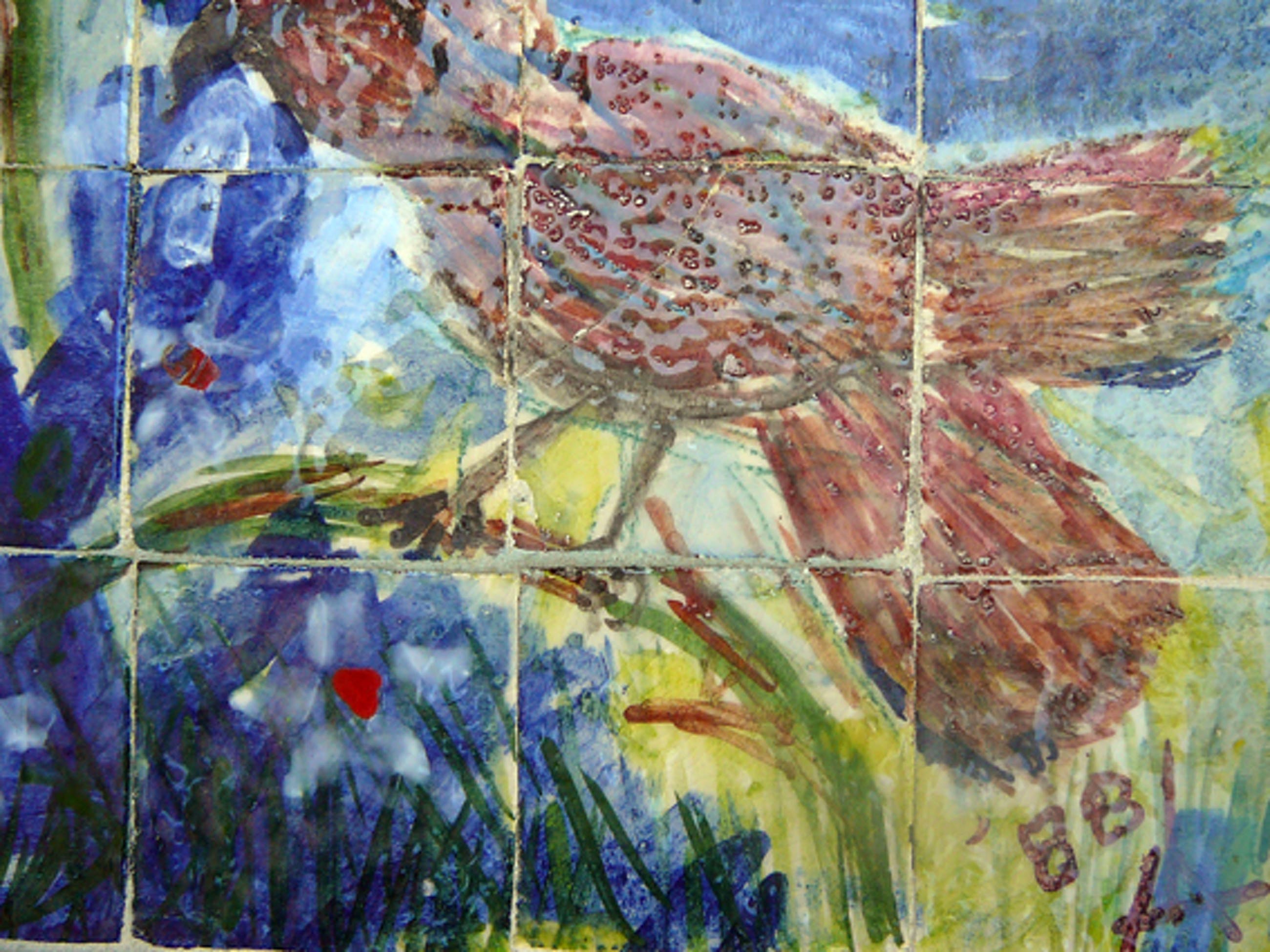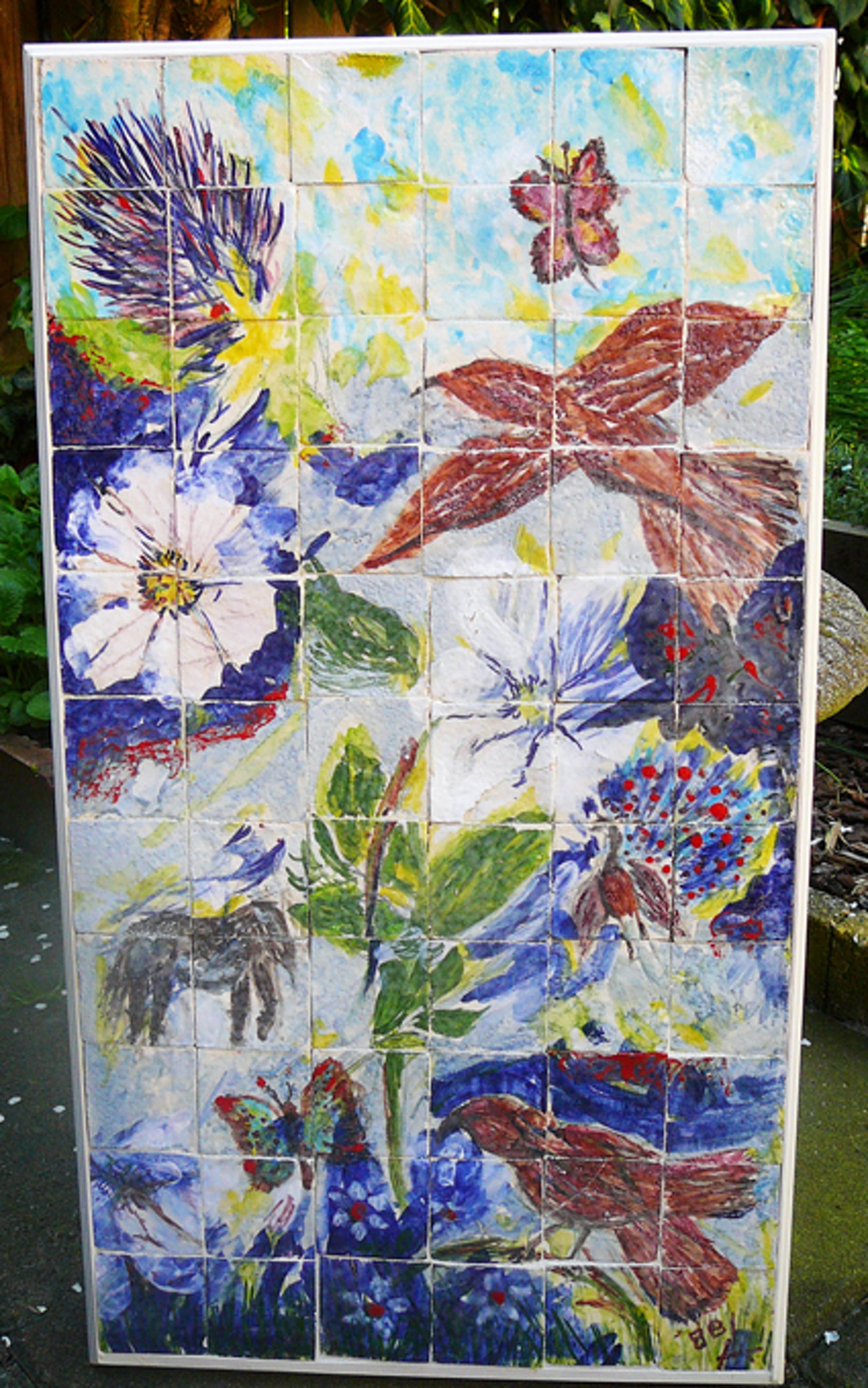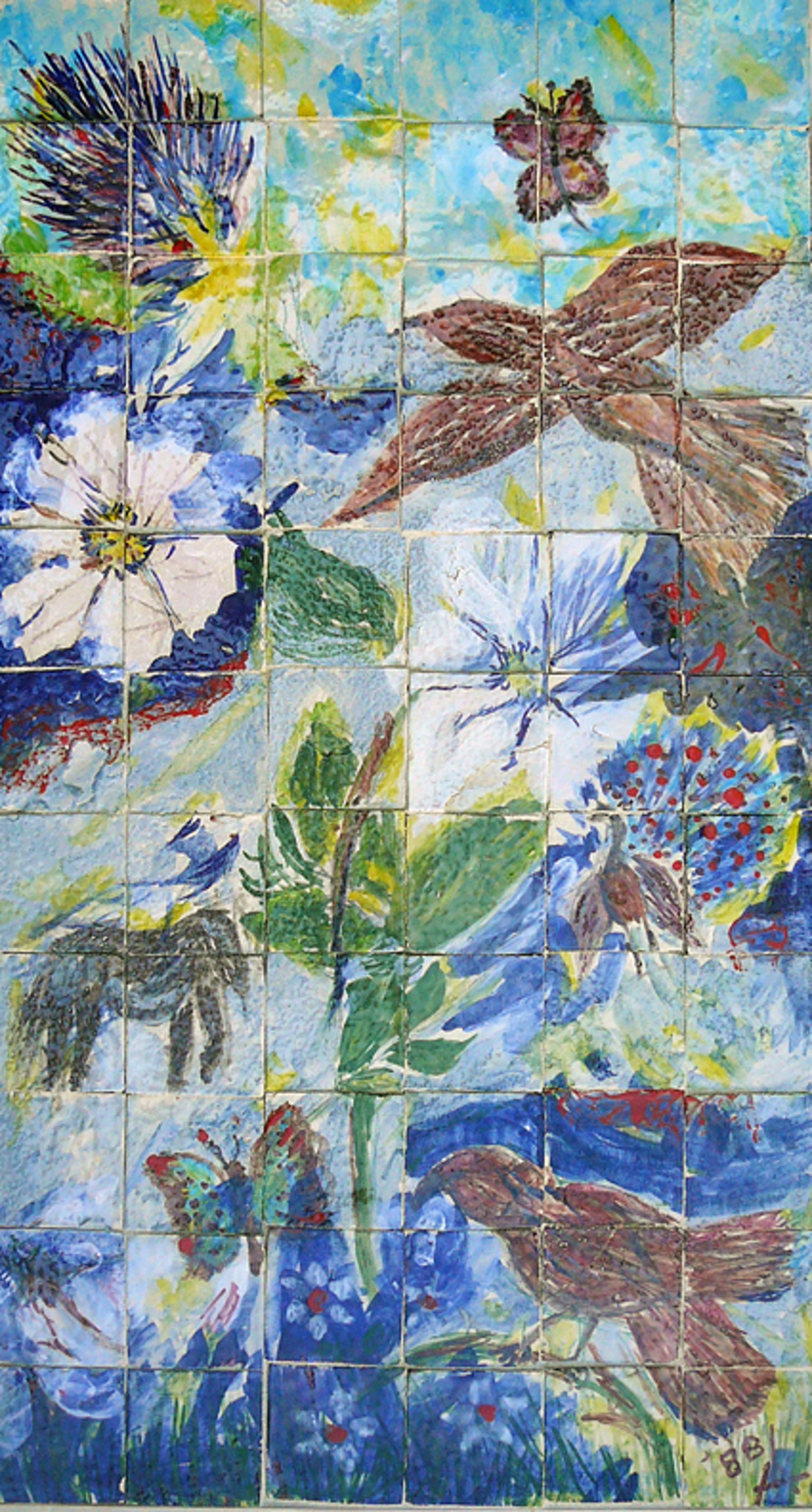 Schitterend zomers tegeltableau met afbeeldingen van vogels en vlinders, bloemen en planten, een stekelvarken, een pauw en een paard. Het geheel heeft een cobra-achtige uitstraling voorzien van een smalle witte lijst. De kunstenaar is mij helaas onbekend. Rechtsonder voorzien van een monogram kapitale A met een verticaal streepje in het hart en jaartal 88. Het tableau bestaat uit 66 geglazuurde tegeltjes in de maat 5,5 x 5,5 cm. In uitstekende conditie en fraai afgewerkt.Gezien kwetsbaarheid en gewicht uitsluitend af te halen in Utrecht.