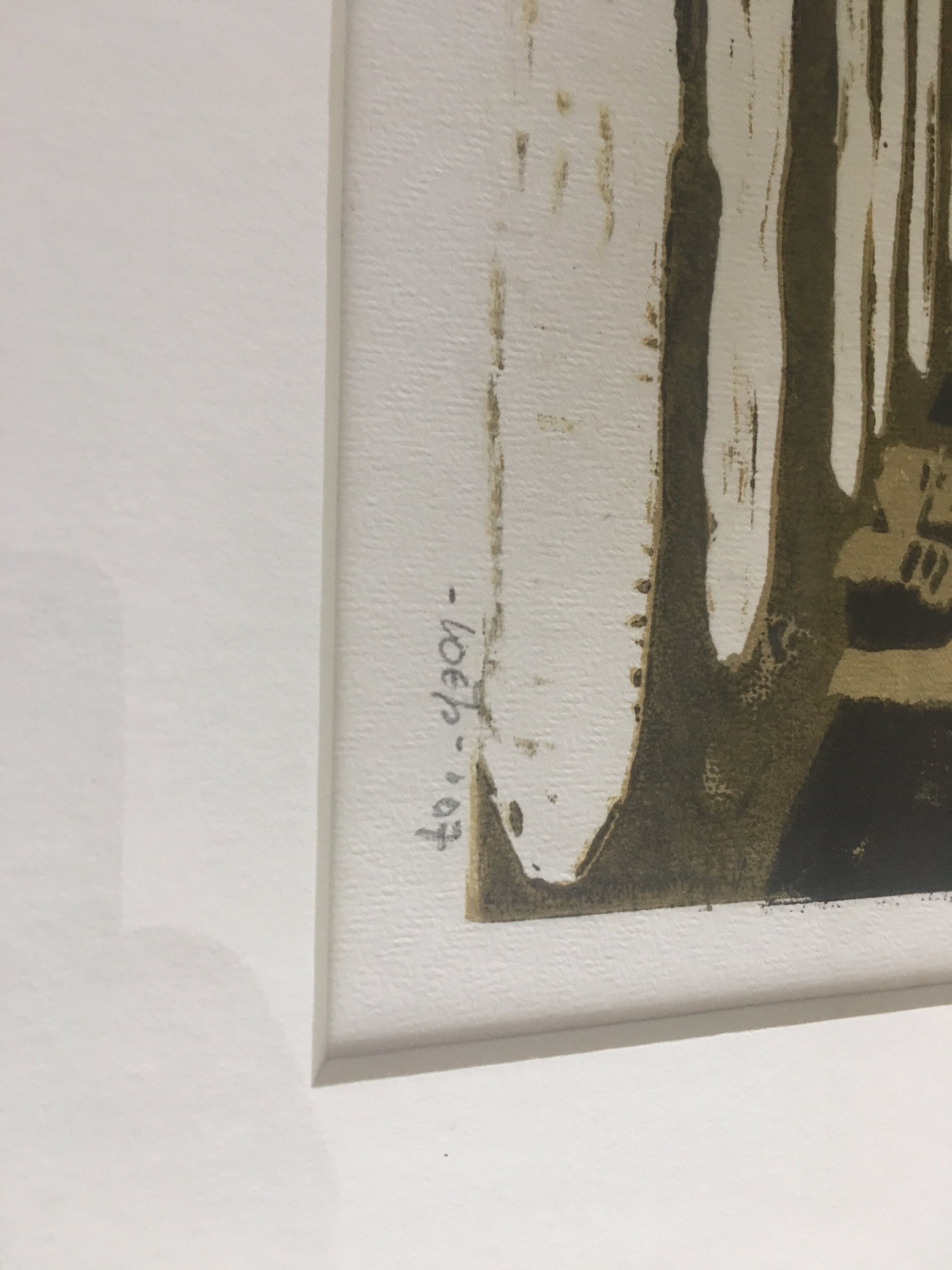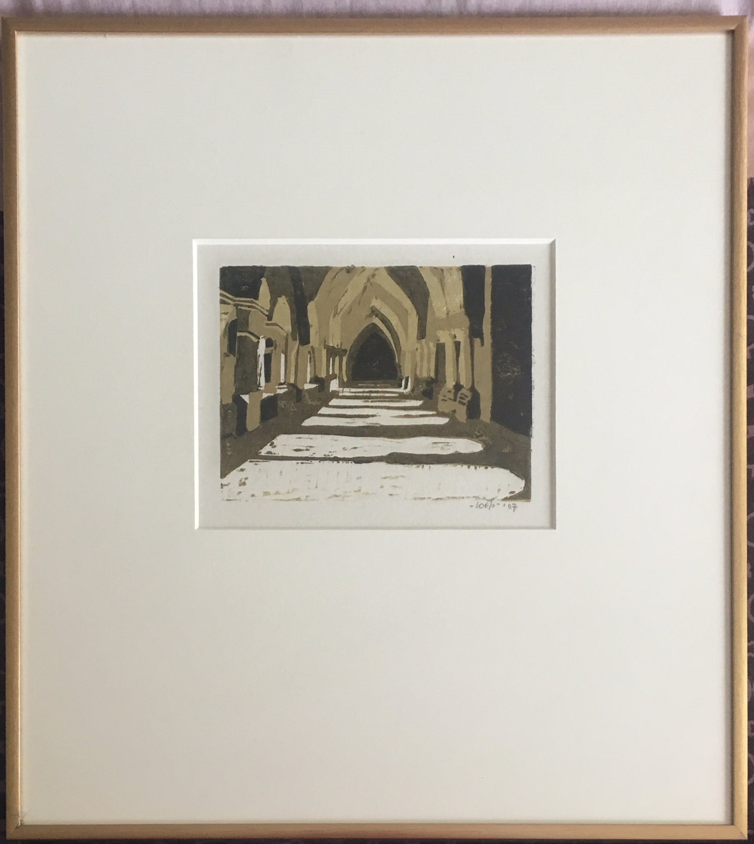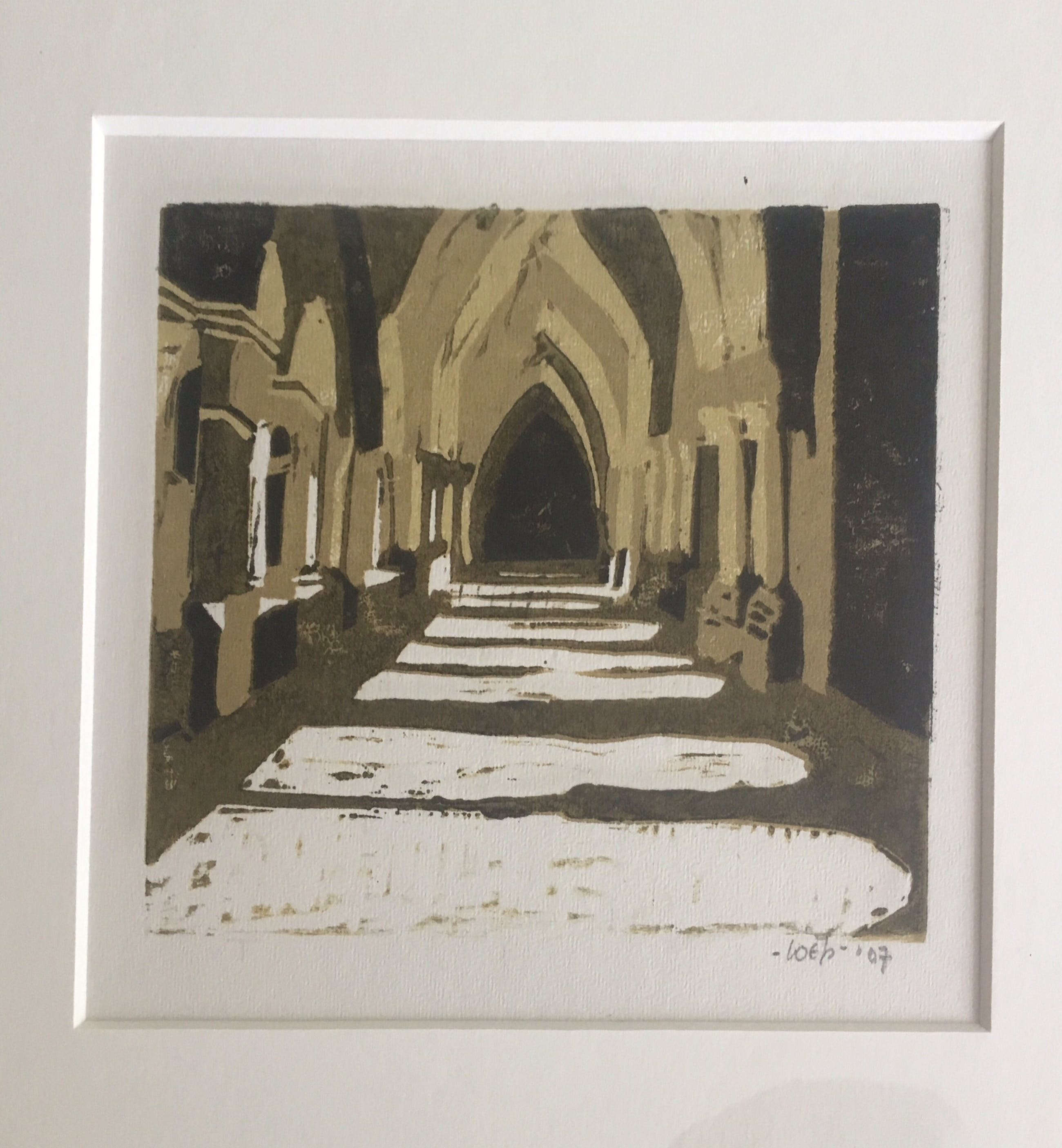 Het werk is een prachtig geheel van groen/beige tinten druk. De rust van een kerkgang, de warmte die vanuit het zonlicht de koele overkapping van de gang inkomt straalt er vanaf.