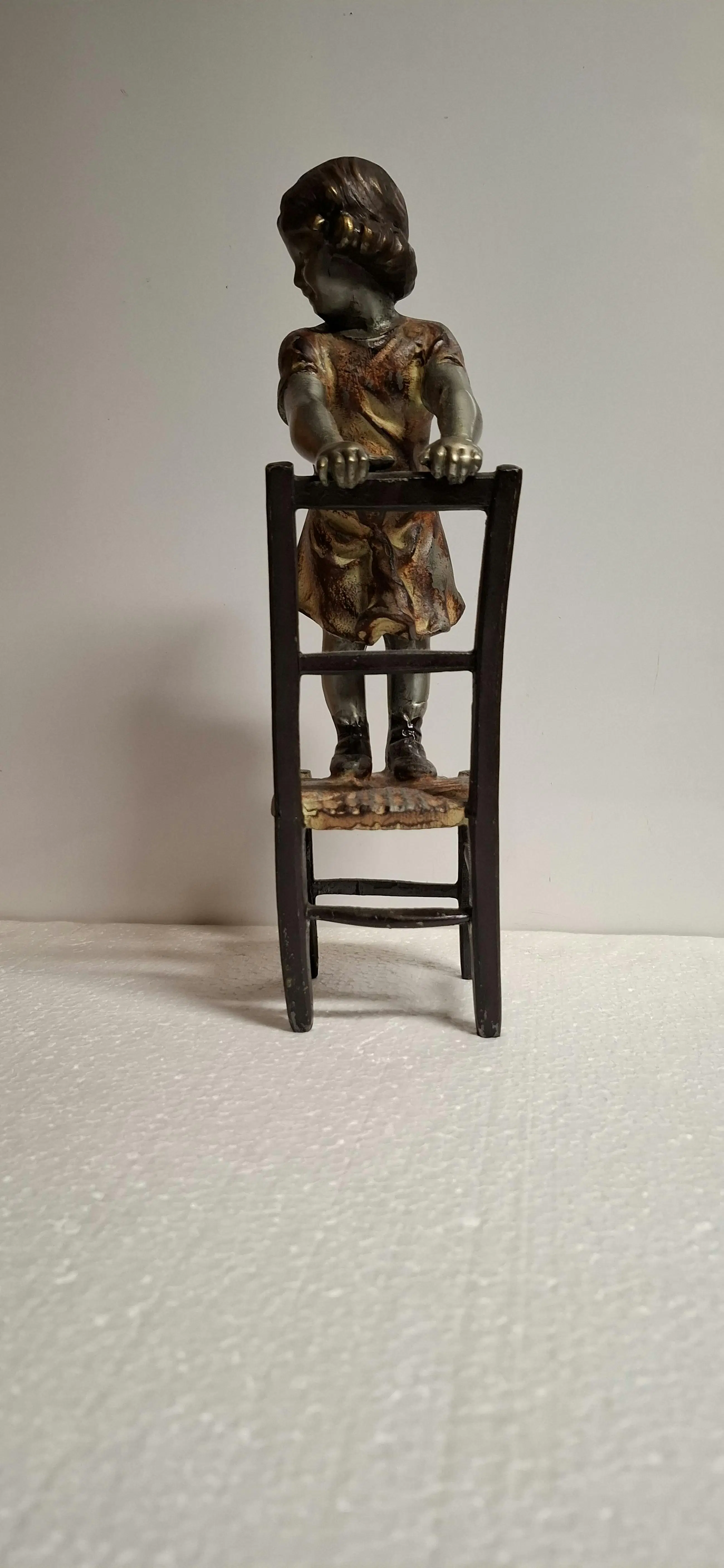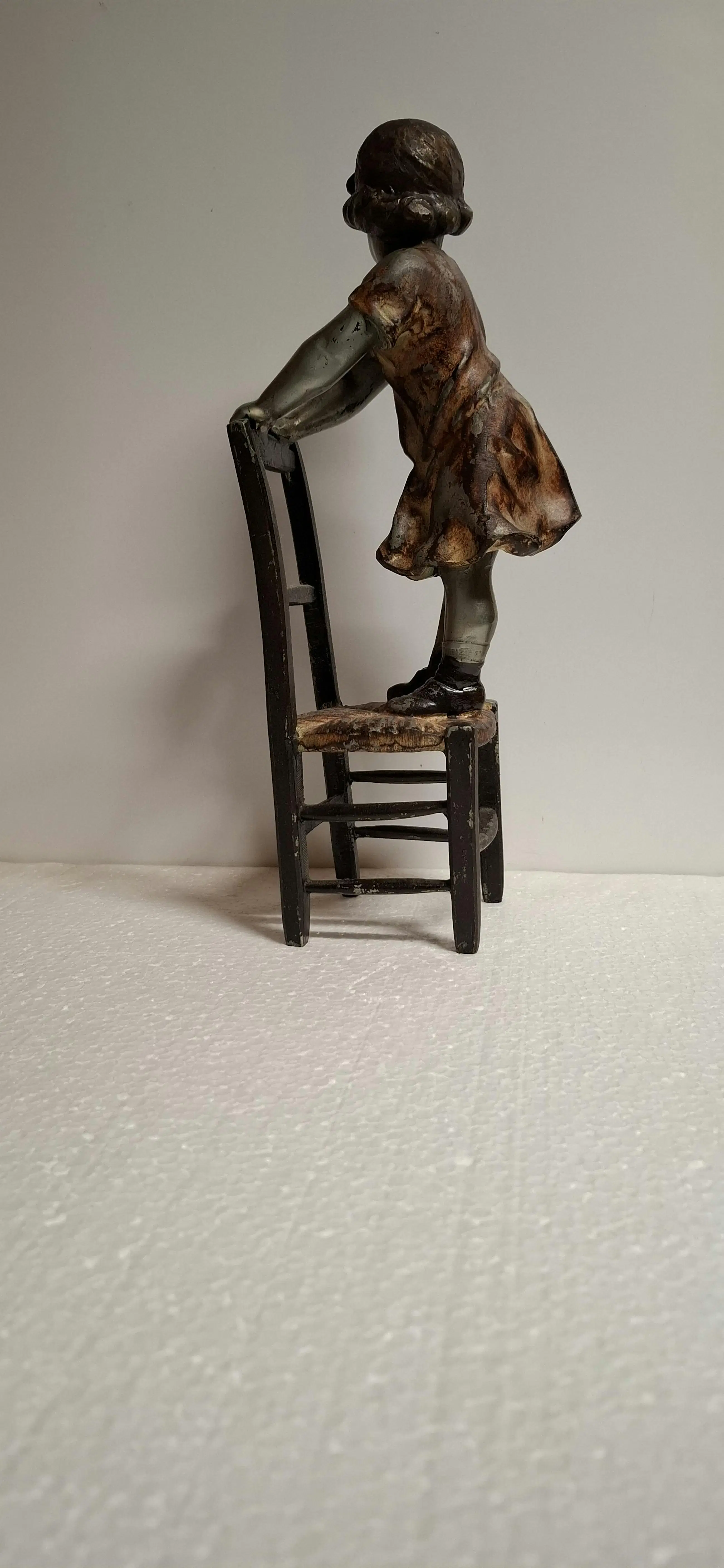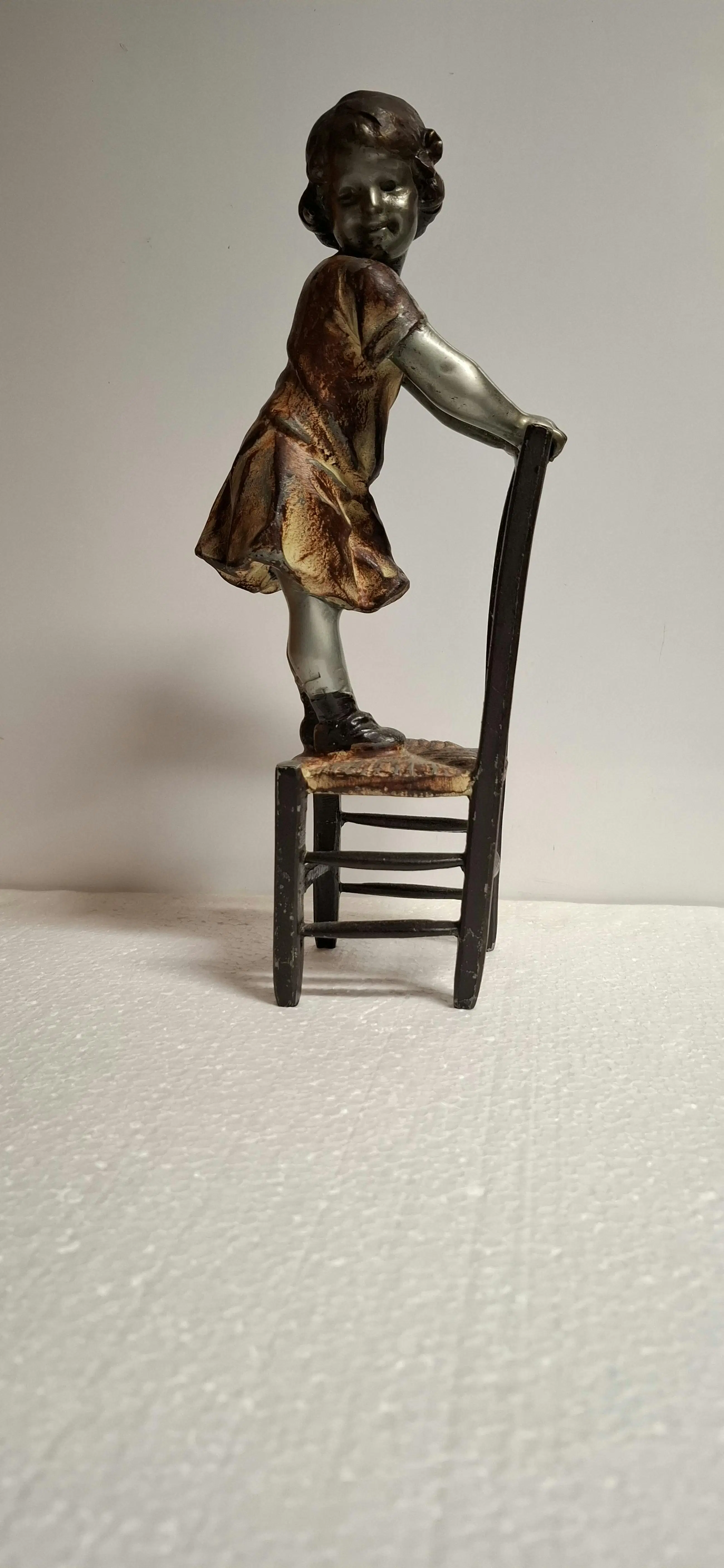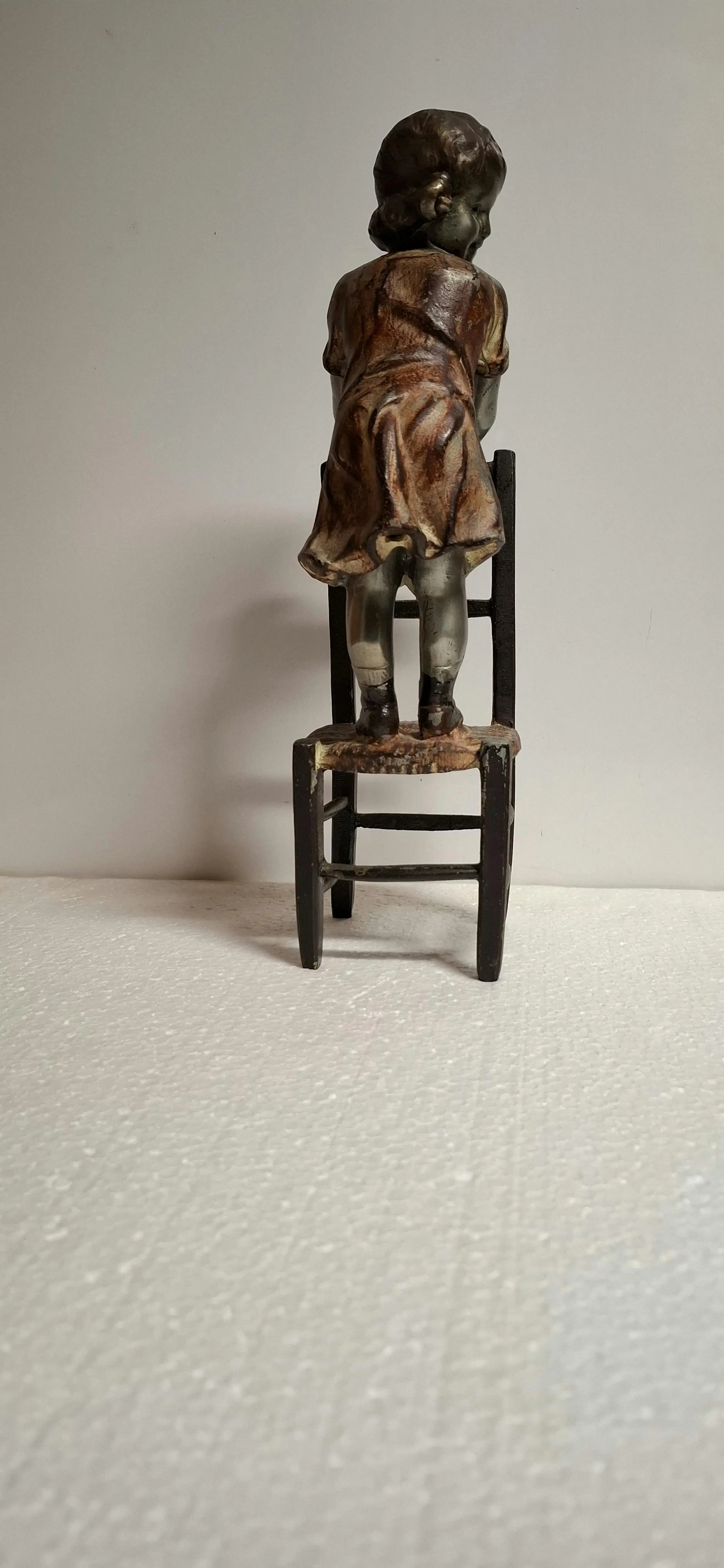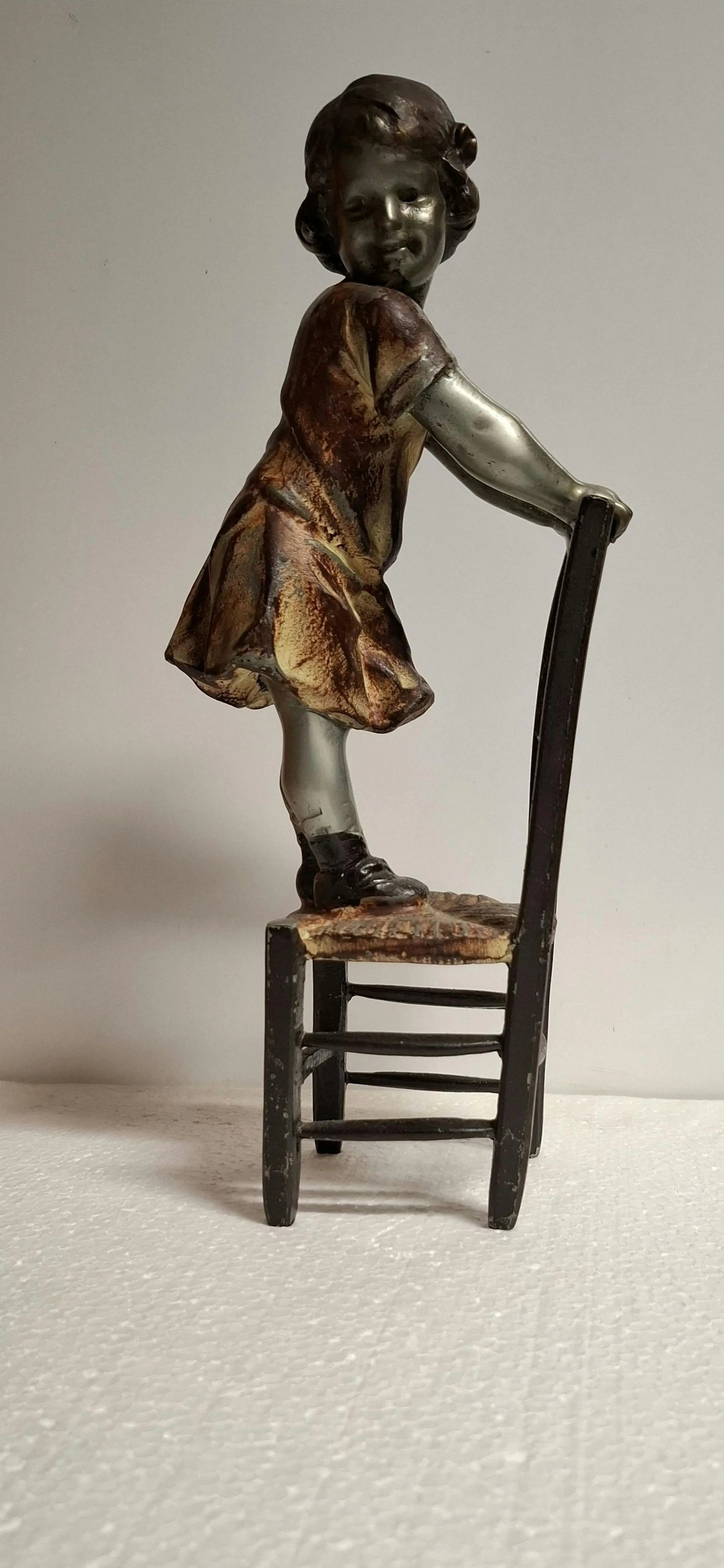 Polychroom gepatineerd metalen beeld naar een ontwerp van de Spaanse beeldhouwer Juan Clara Ayats (1875-1958). Dit exemplaar is niet gemerkt of gesigneerd Juan Clara Ayats staat bekend om zijn bronzen en onyxen kinderfiguren. Slijtage aan de patine is op te merken. Afmetingen: 30x13x8,5cm: Gewicht: 1553g