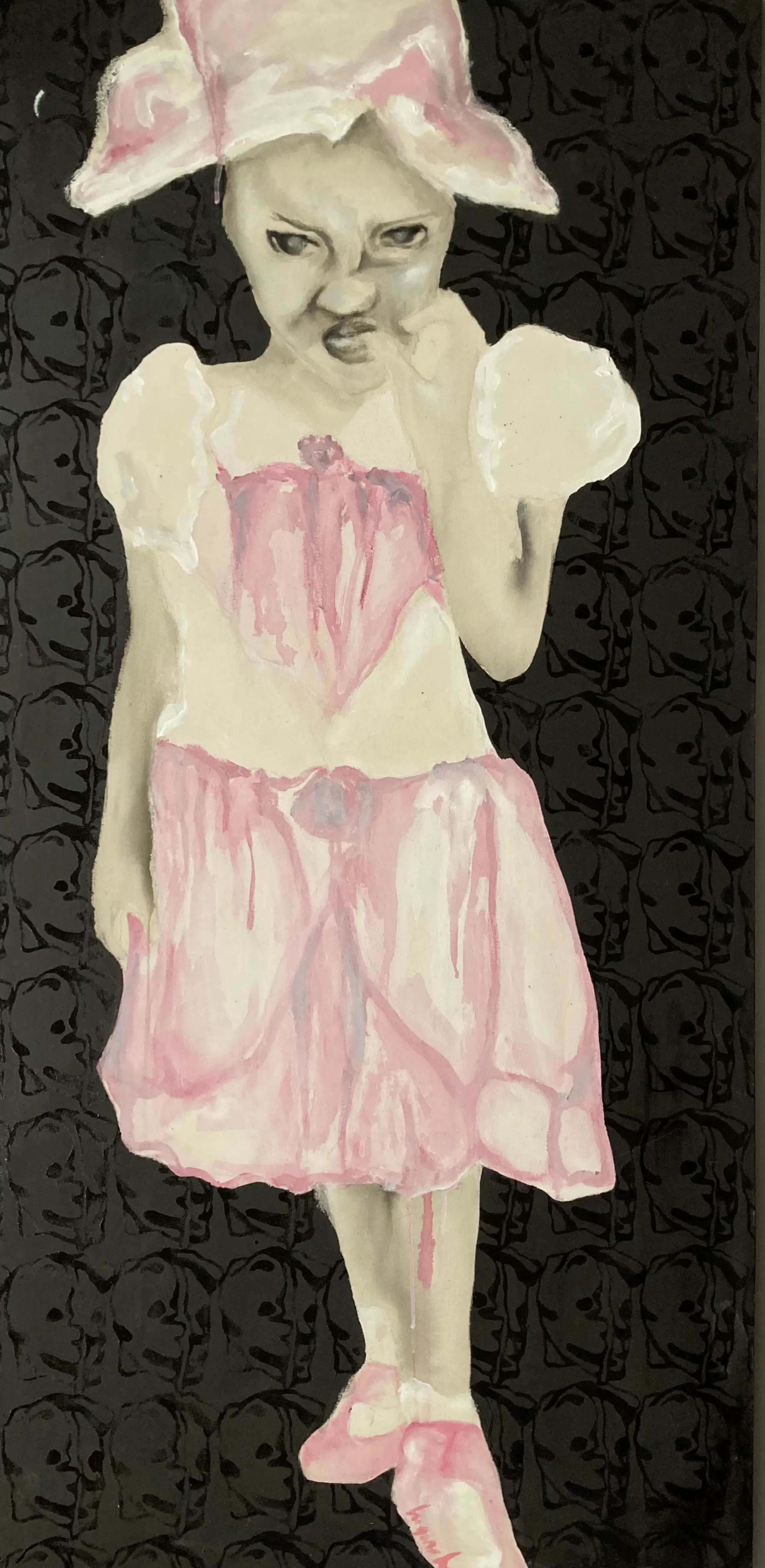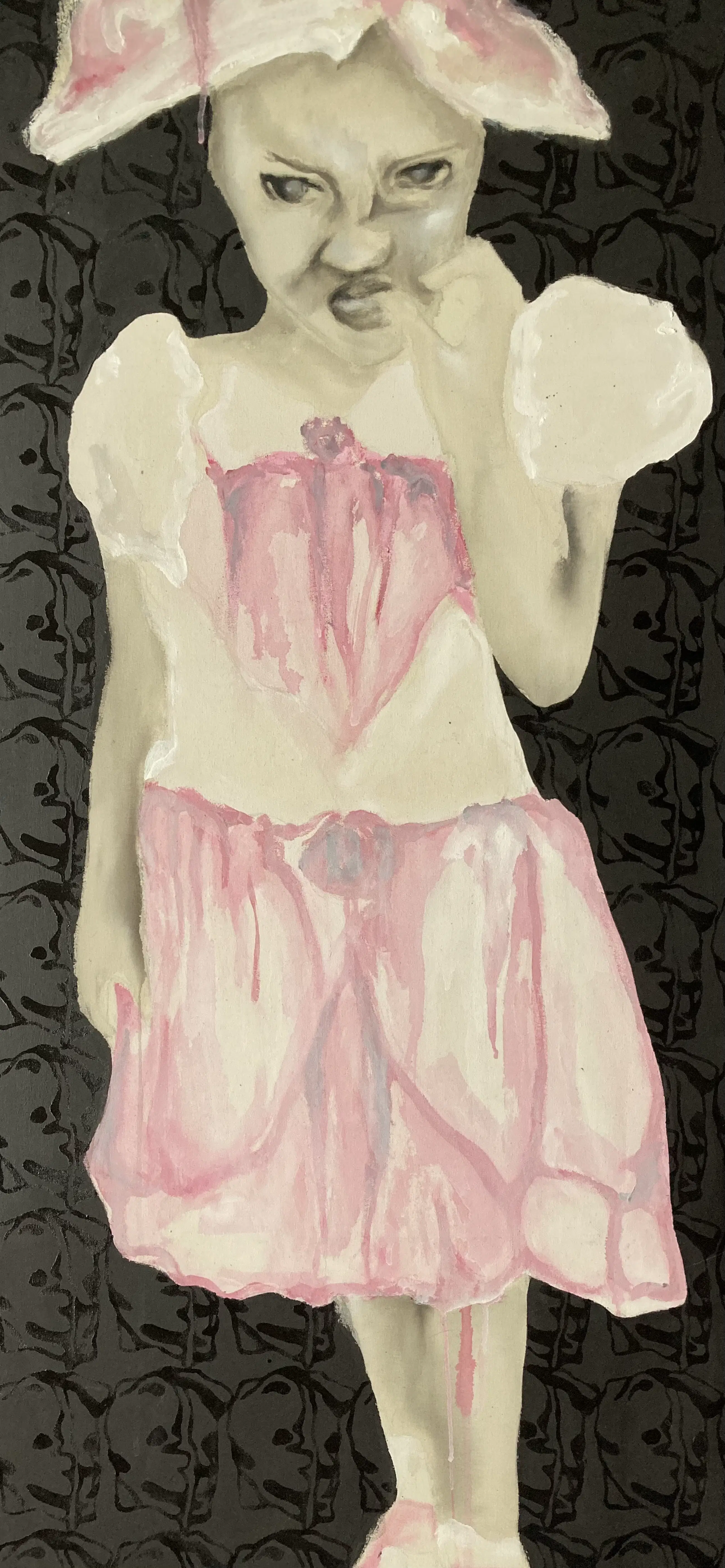 Krachtig schilderij op doek. Afbeelding van een kind tegen een zwarte achtergrond. In deze achtergrond zijn gezichten zichtbaar, met een herhaalde afbeelding. Het schilderij is met een onbekende verfsoort gemaakt. Het doet denken aan werk van Marlene Dumas. Signatuur verso is niet leesbaar. 05 is bijgeschreven. Afmeting 137 x 65 cm. Handgemaakt stevig houten raamwerk, geen lijst.