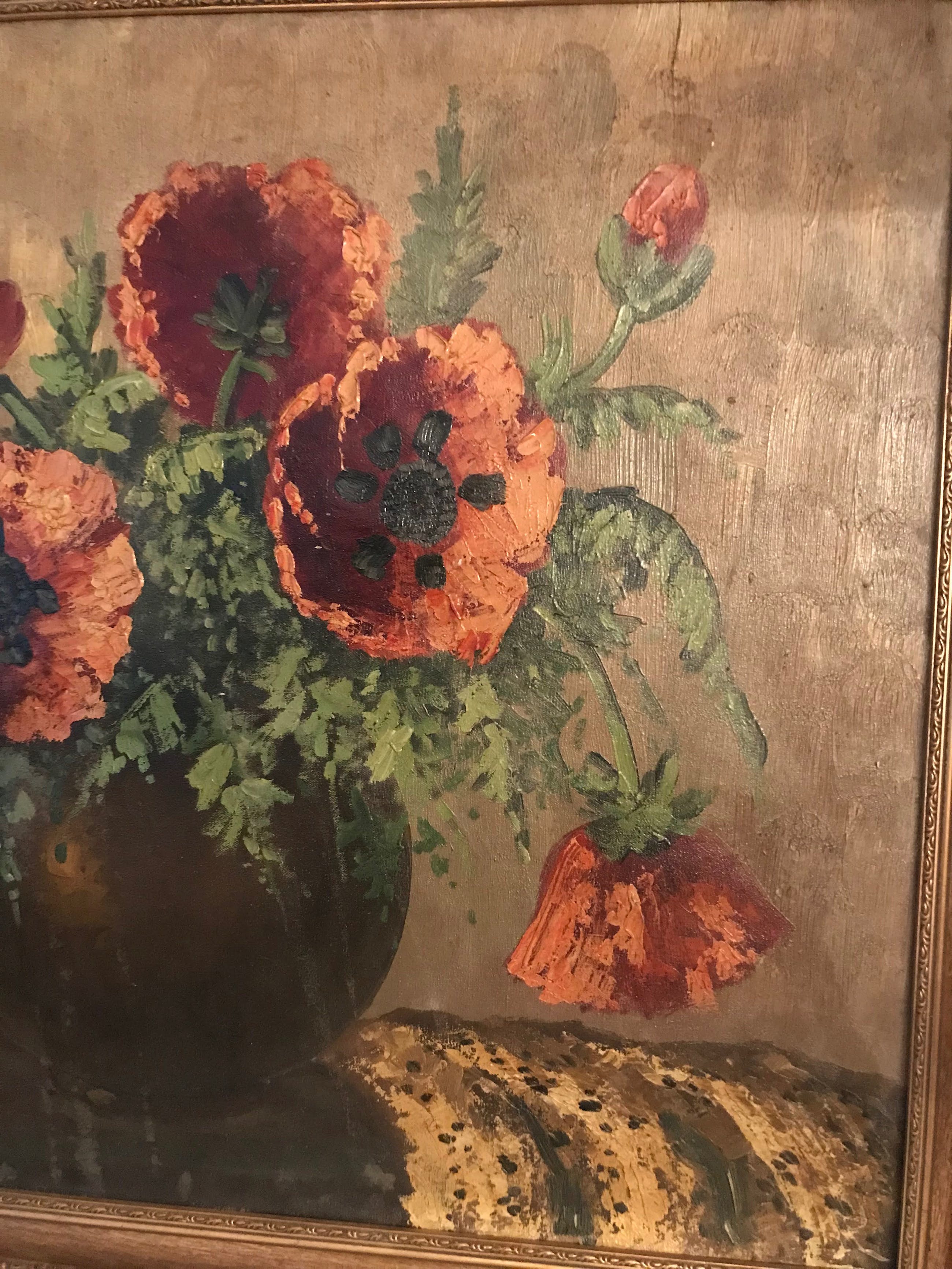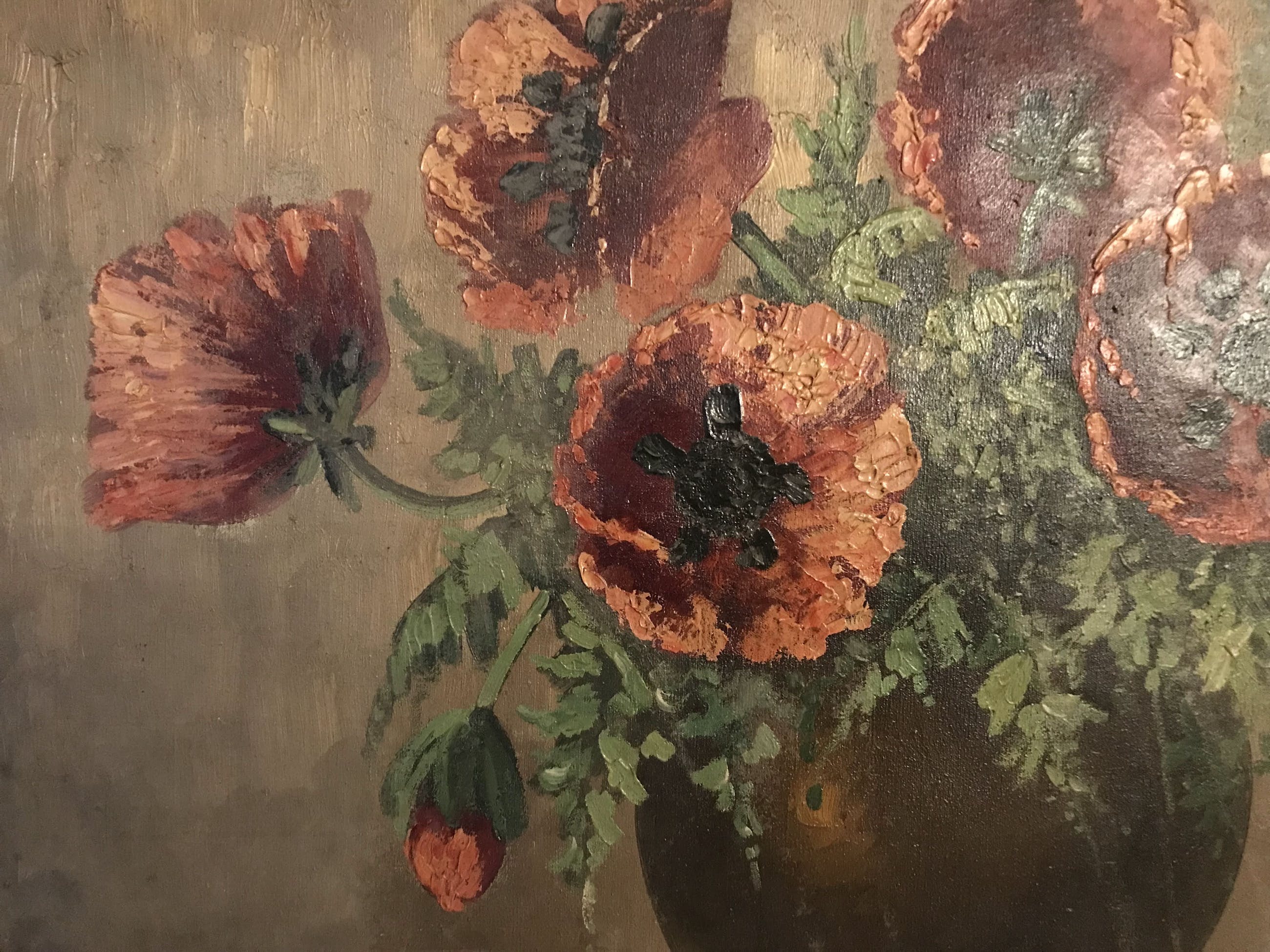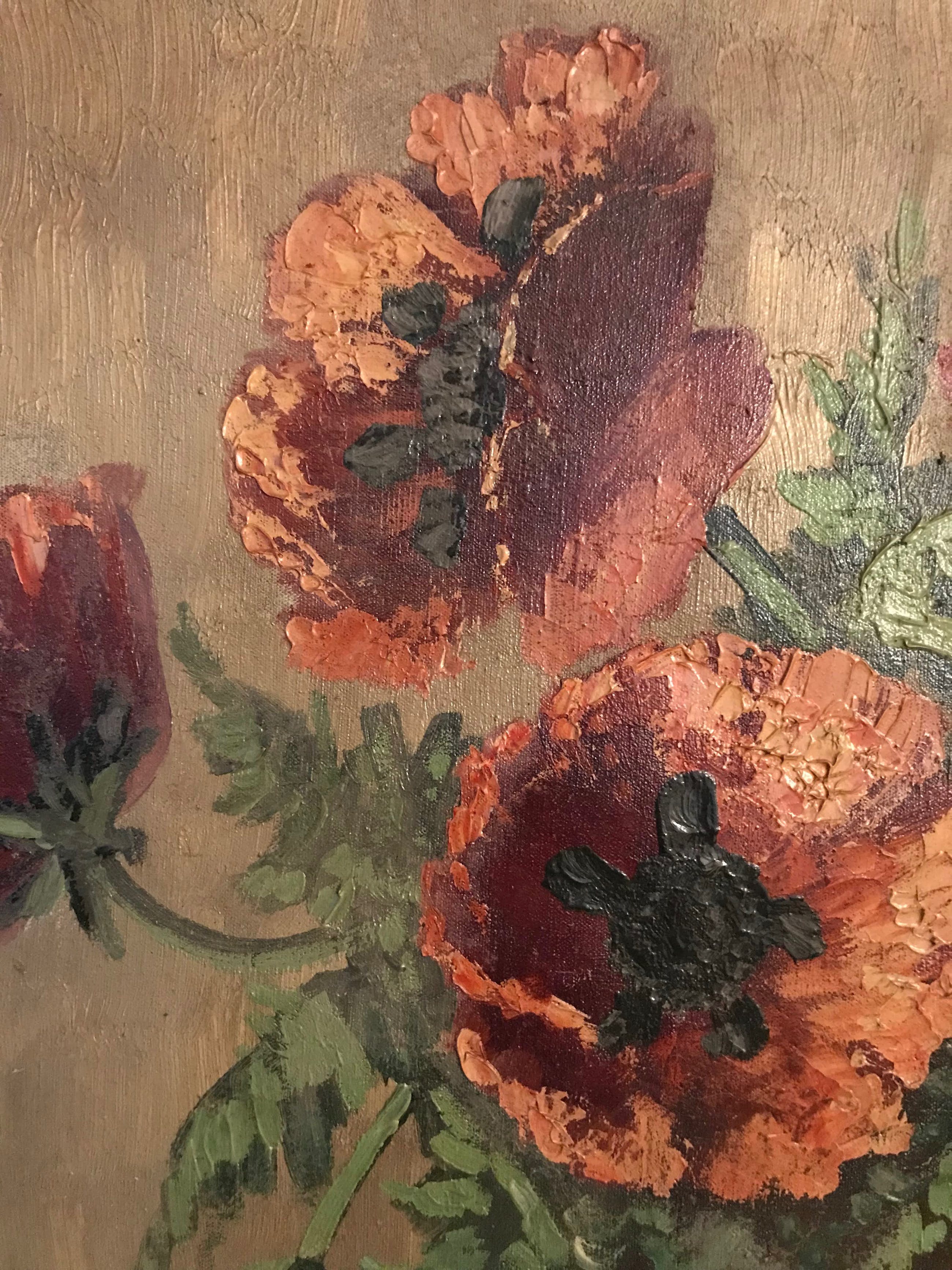 Mooi met losse toets geschilderde papavers. Geschatte ouderdom ca 70 jaar. Signatuur moeilijk leesbaar.
