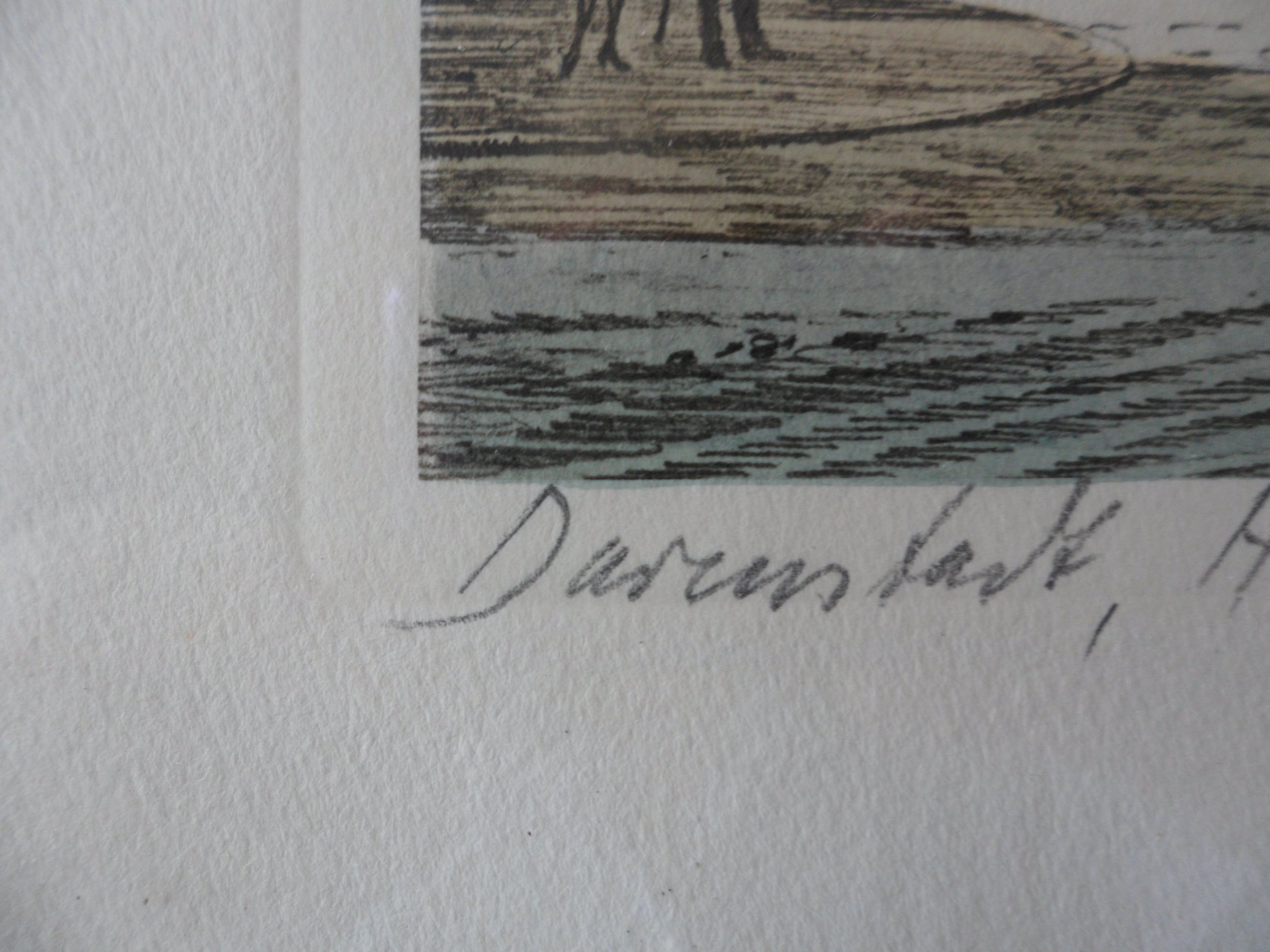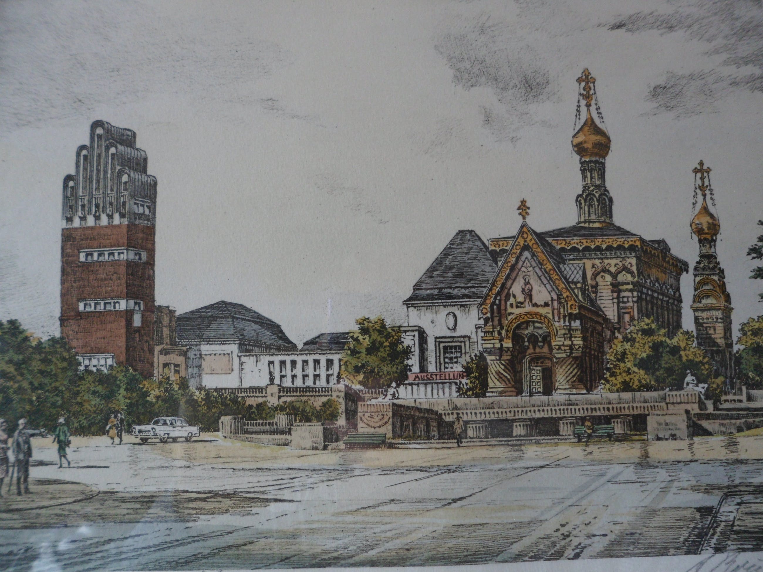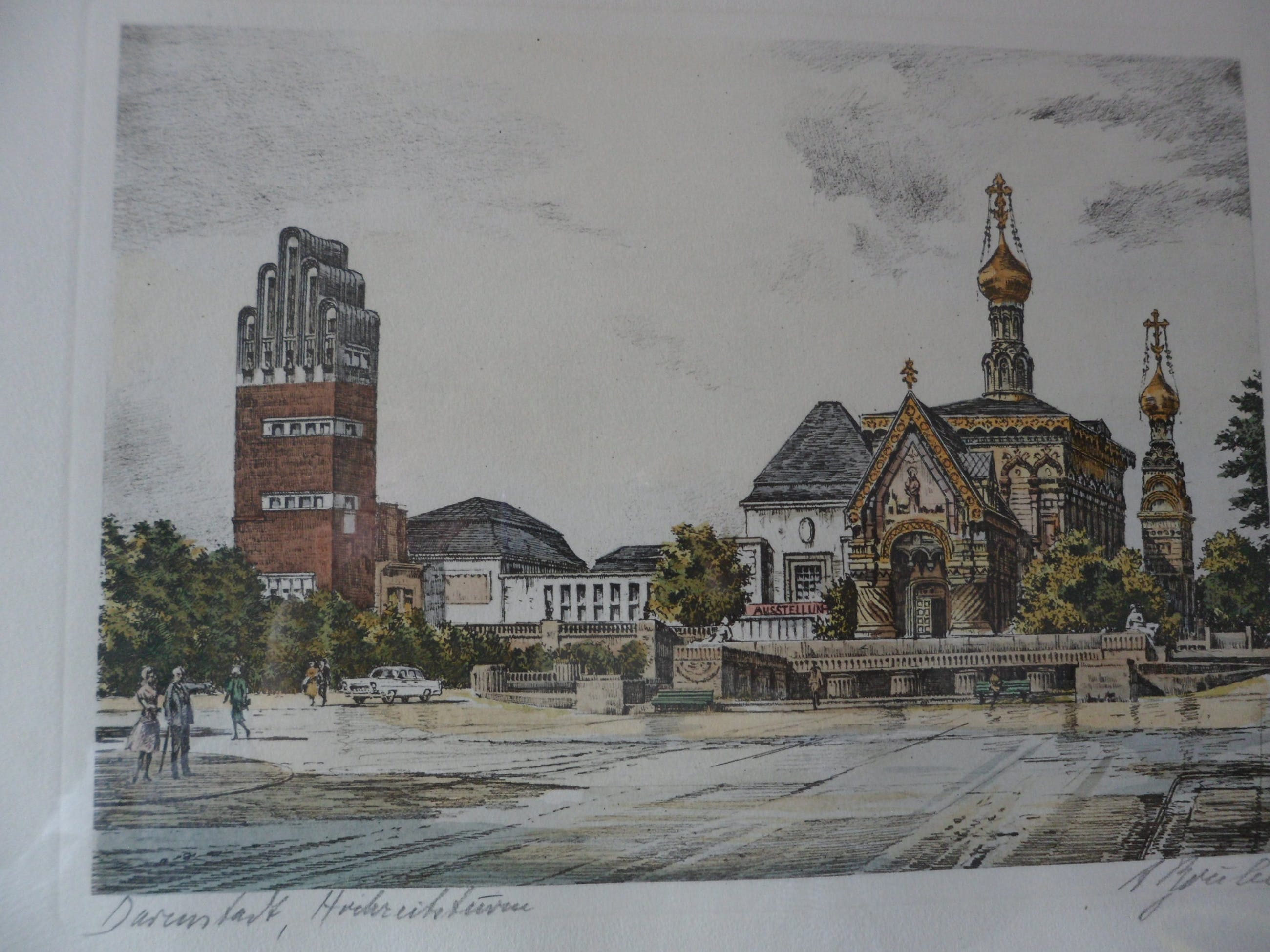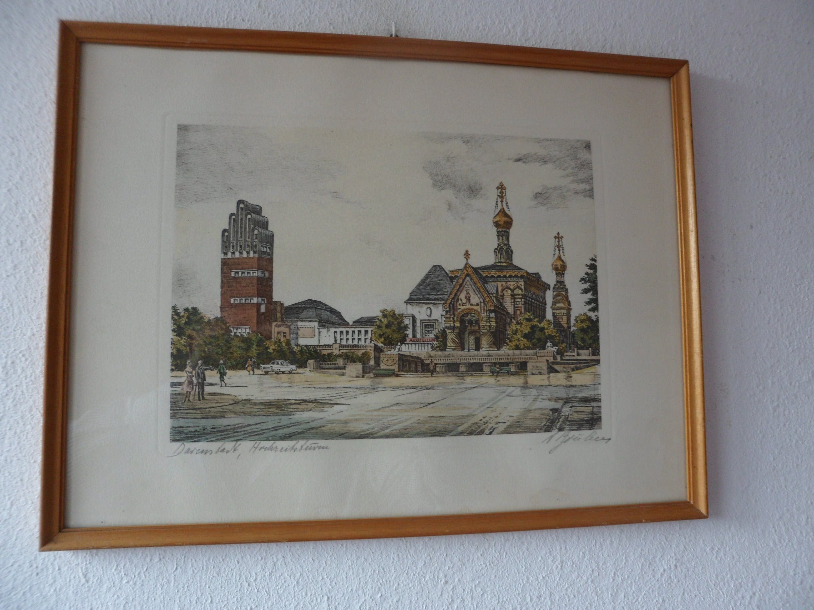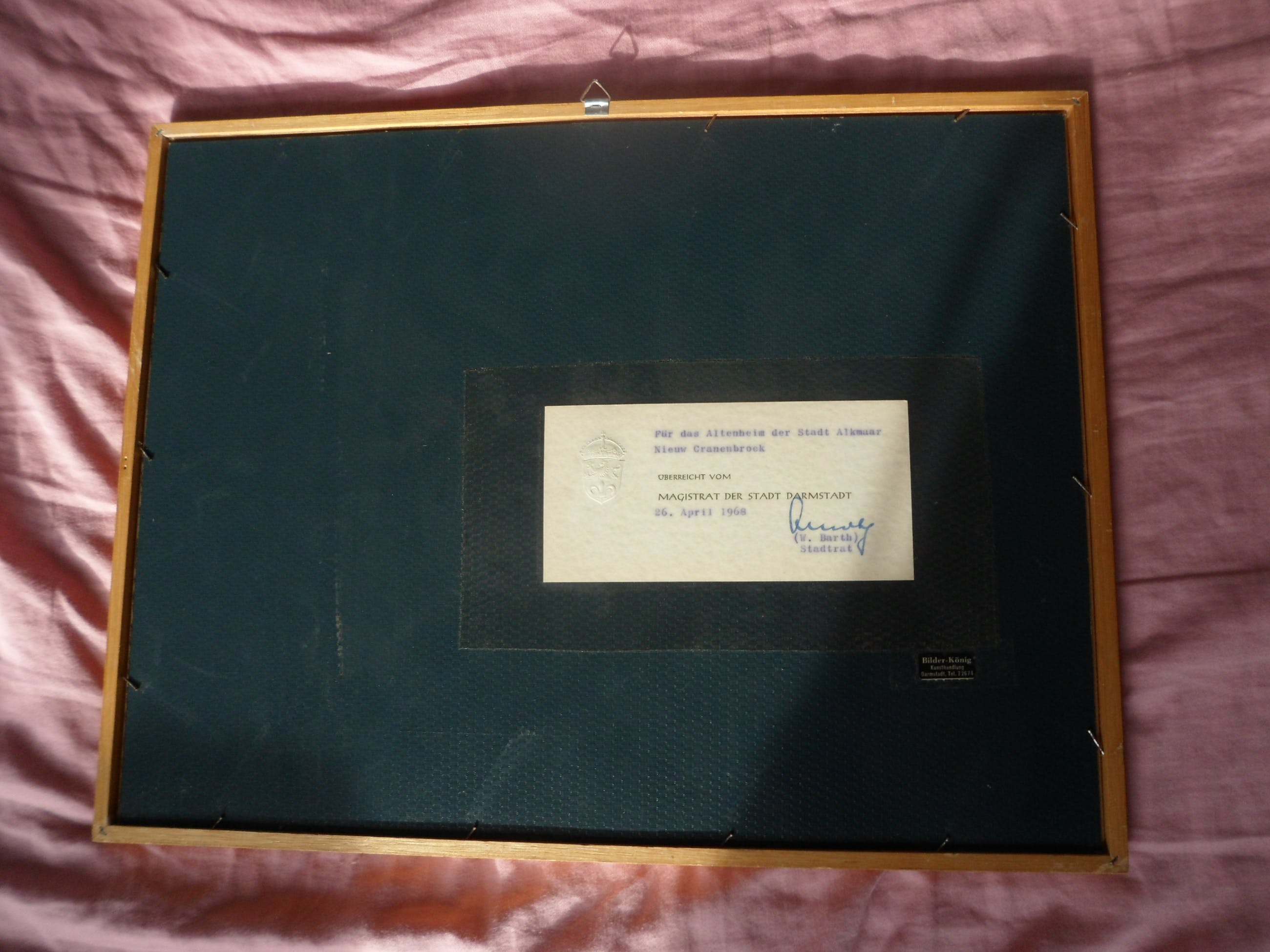 Kleuren ets. Volgens de gegevens die op de achter kant staat is het een geschenk van de stad Darmstad aan de stad Alkmaar op 26 April 1968. Naam van de kunstenaar kan ik niet lezen.