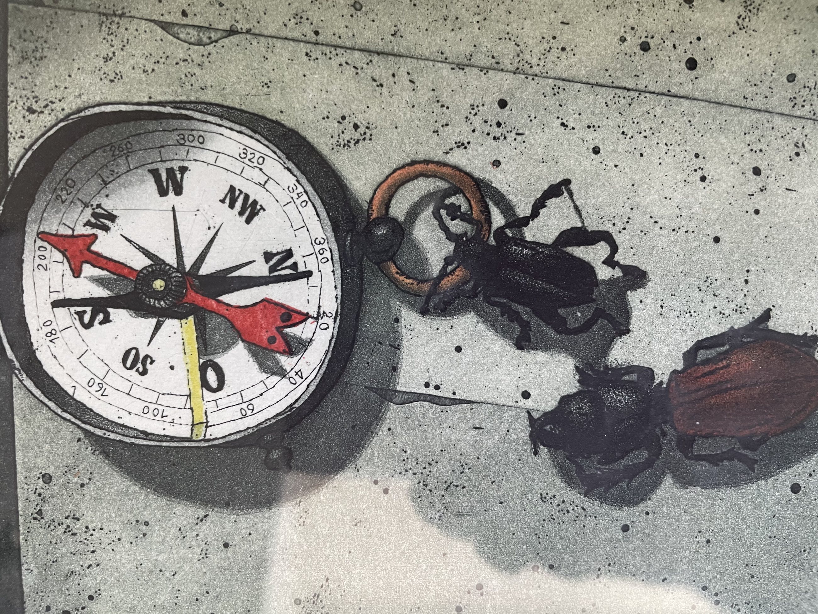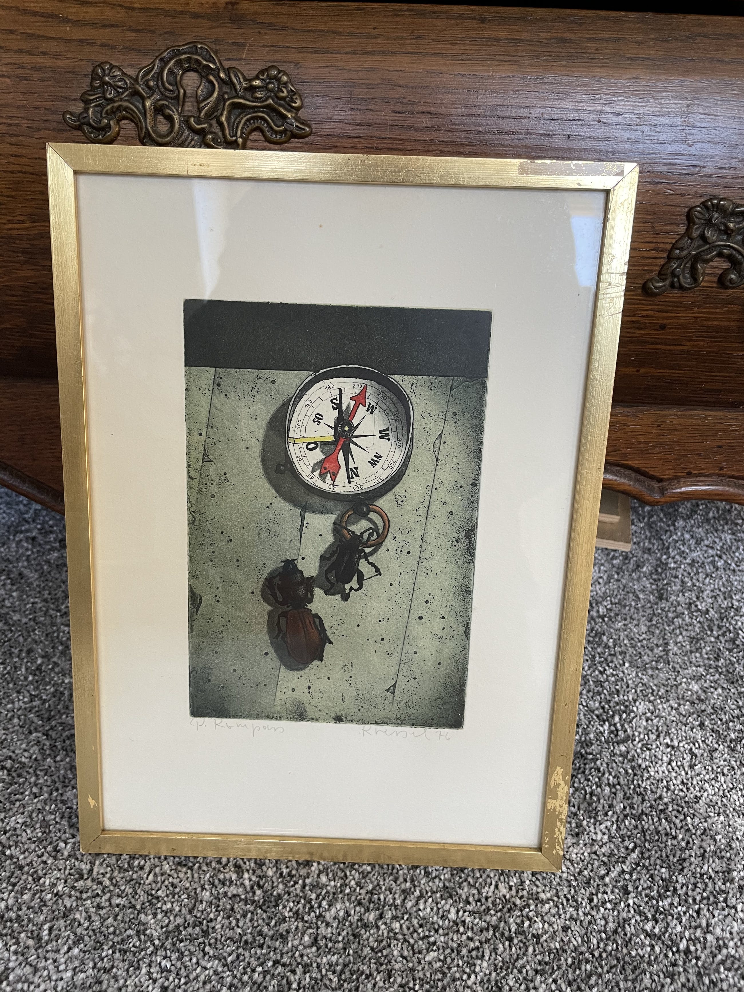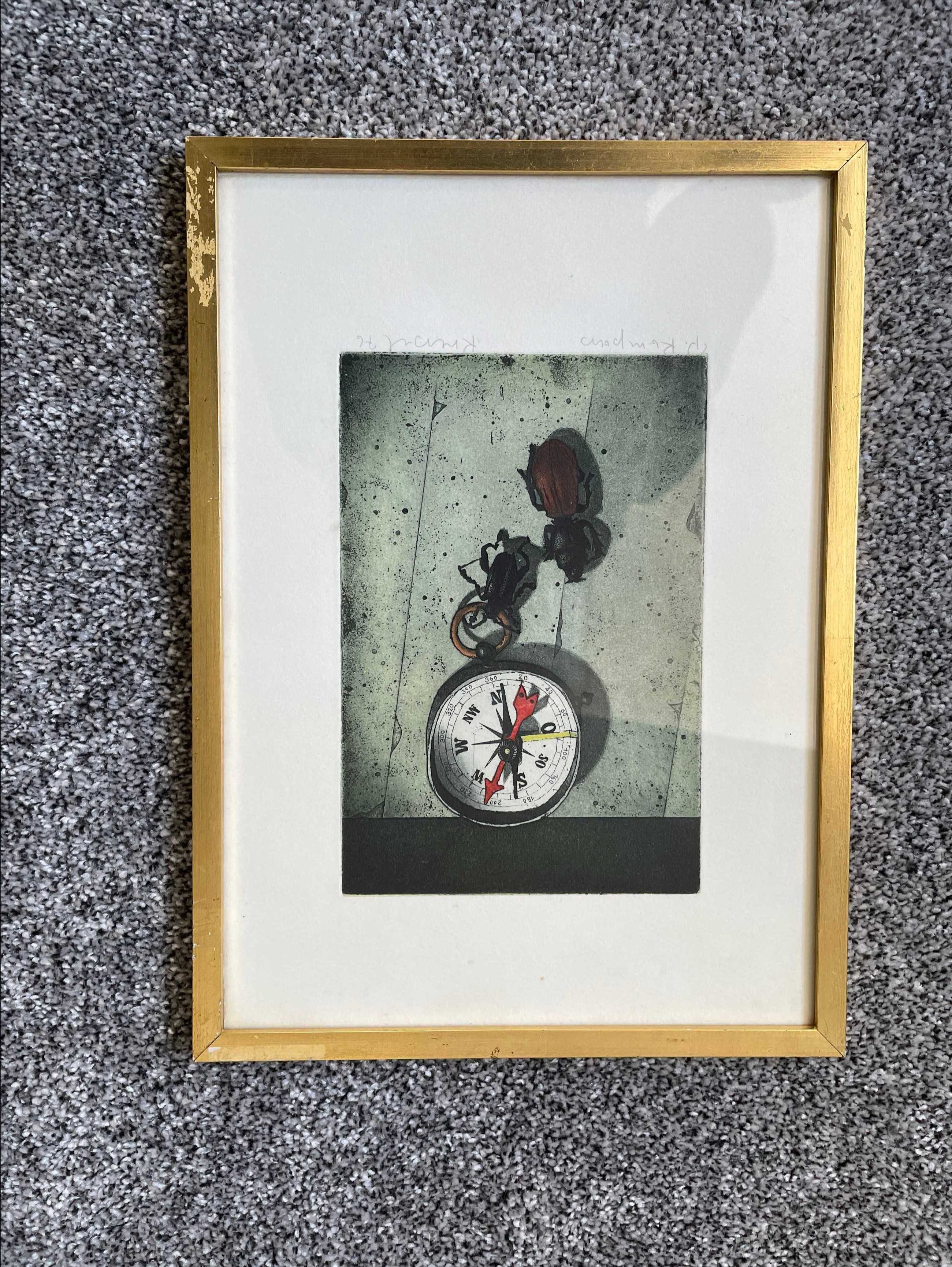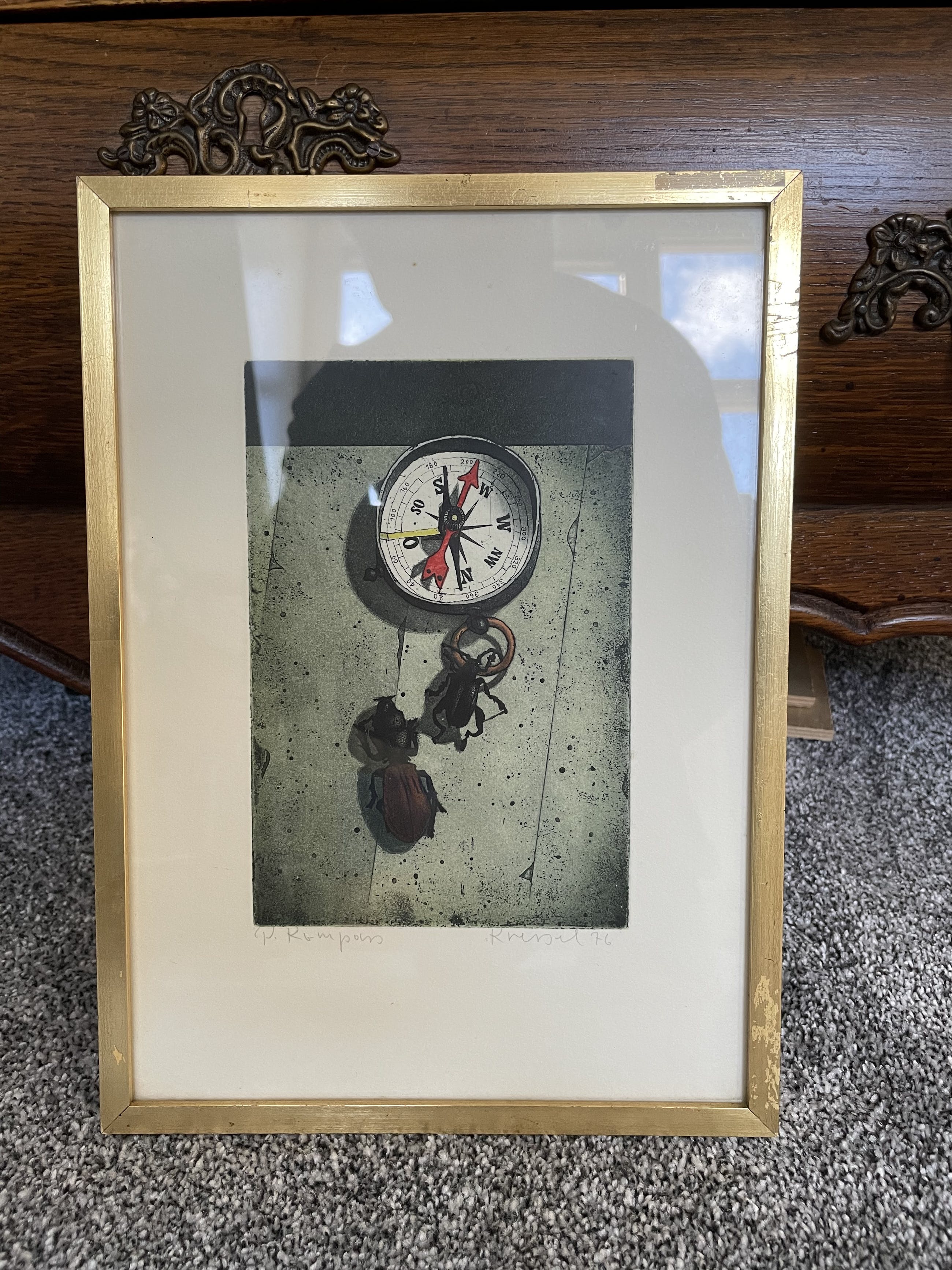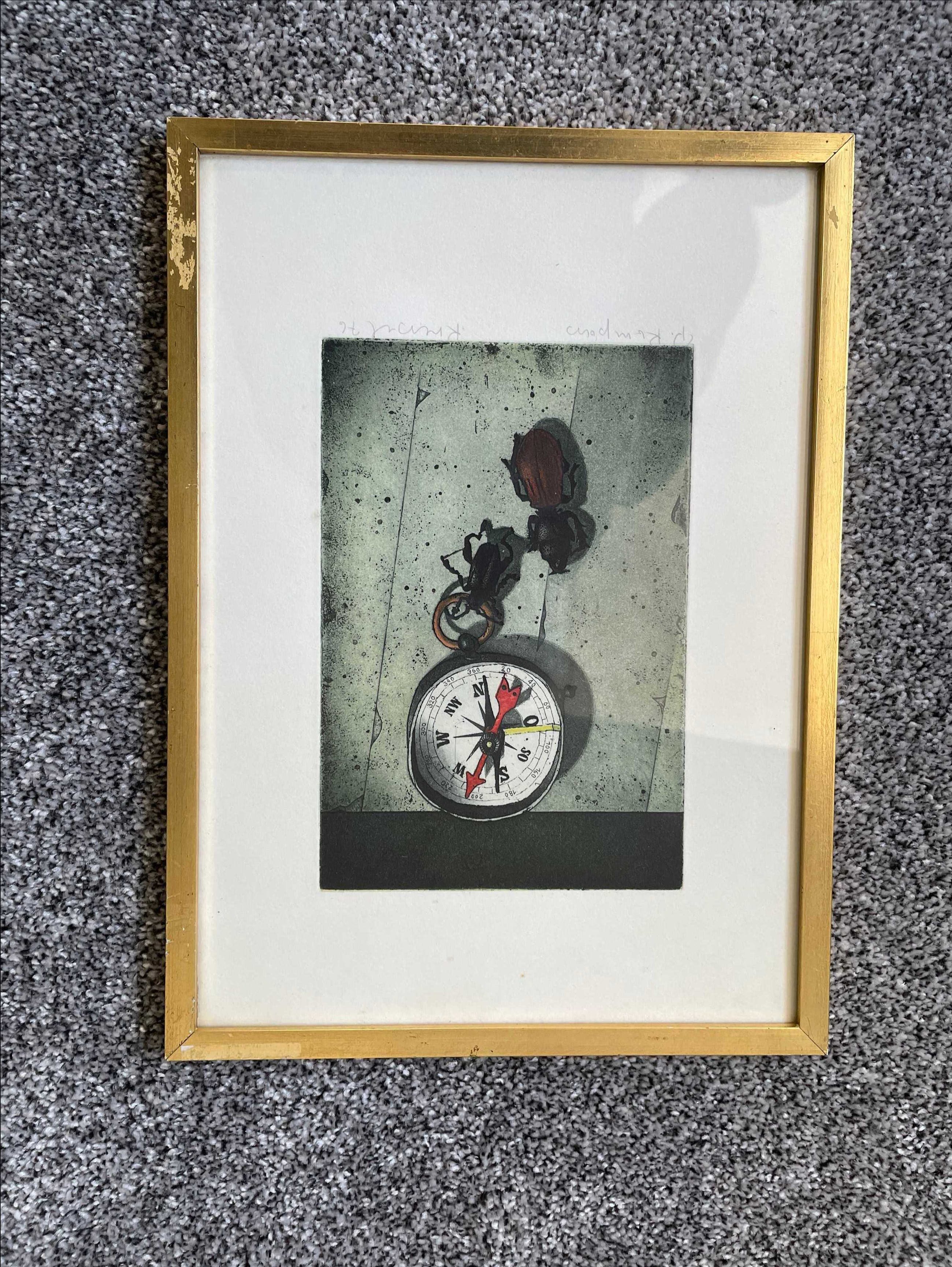 Gewoon een prachtige ets van een kompas. Fraai van kleur en uitvering. Het werk is gemaakt in 1996 - Is gesigneerd. Dit werk maakte eerder deel uit van de eigen kunstveiling collectie. En heeft een sticker van galerie Polder uit Borne.