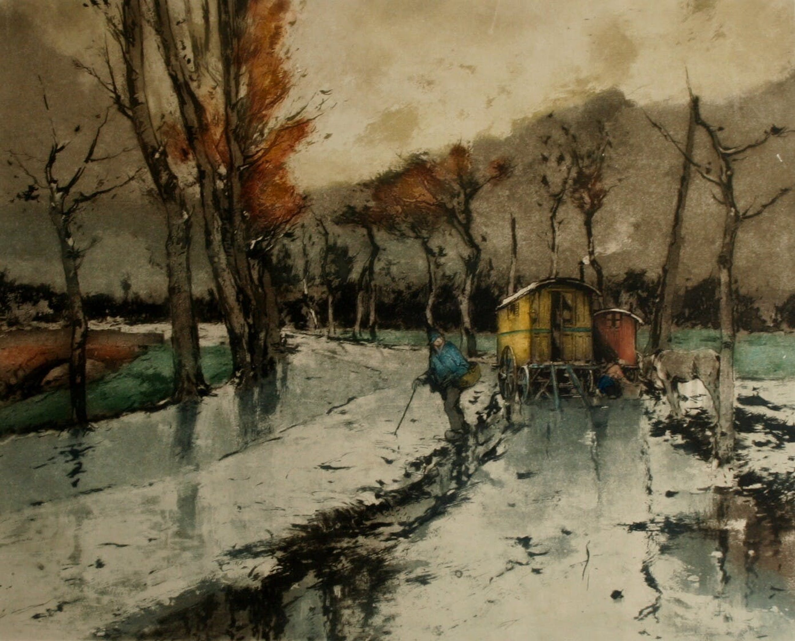 Niet of onleesbaar gesigneerd - kleurenets - Ferdinand Luigini - tafereel met woonwagen langs herfstweg - gesign kopen? Bied vanaf 1!