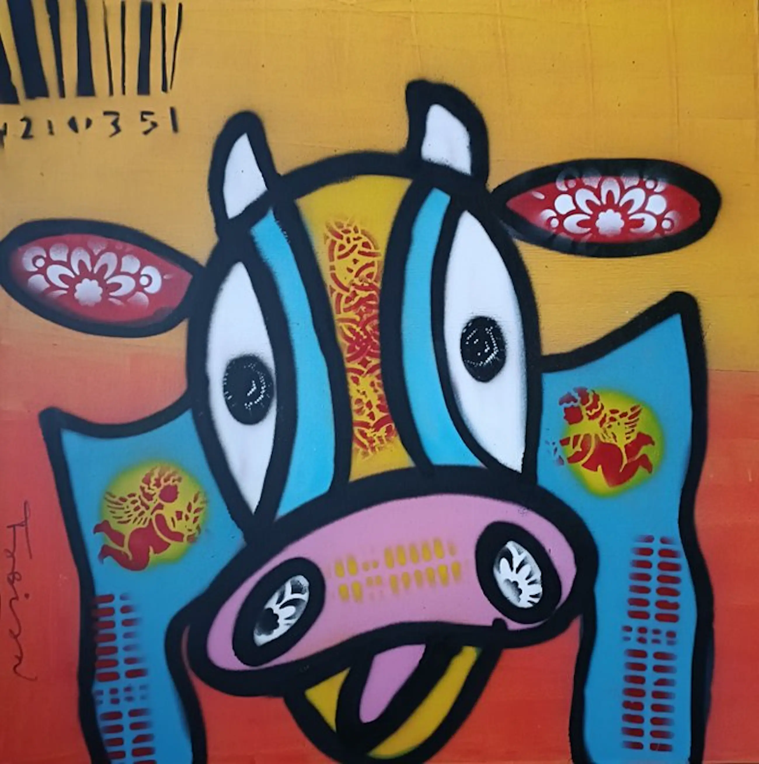 Techniek is acrylverf met gebruikmaking van sjablonen. De randen zijn mee geschilderd, dus een lijst is niet nodig ! Zeer goede / uitstekende staat.