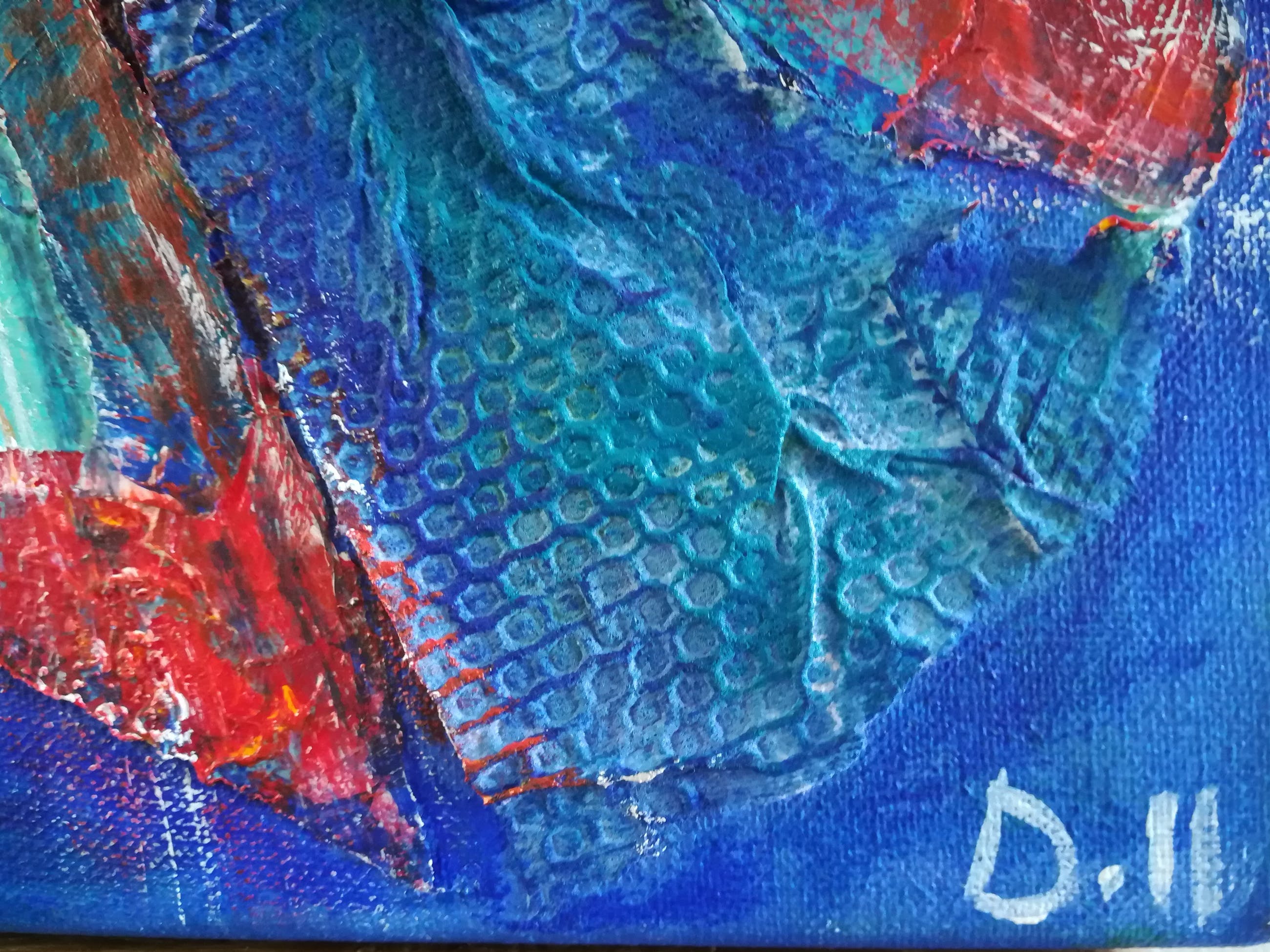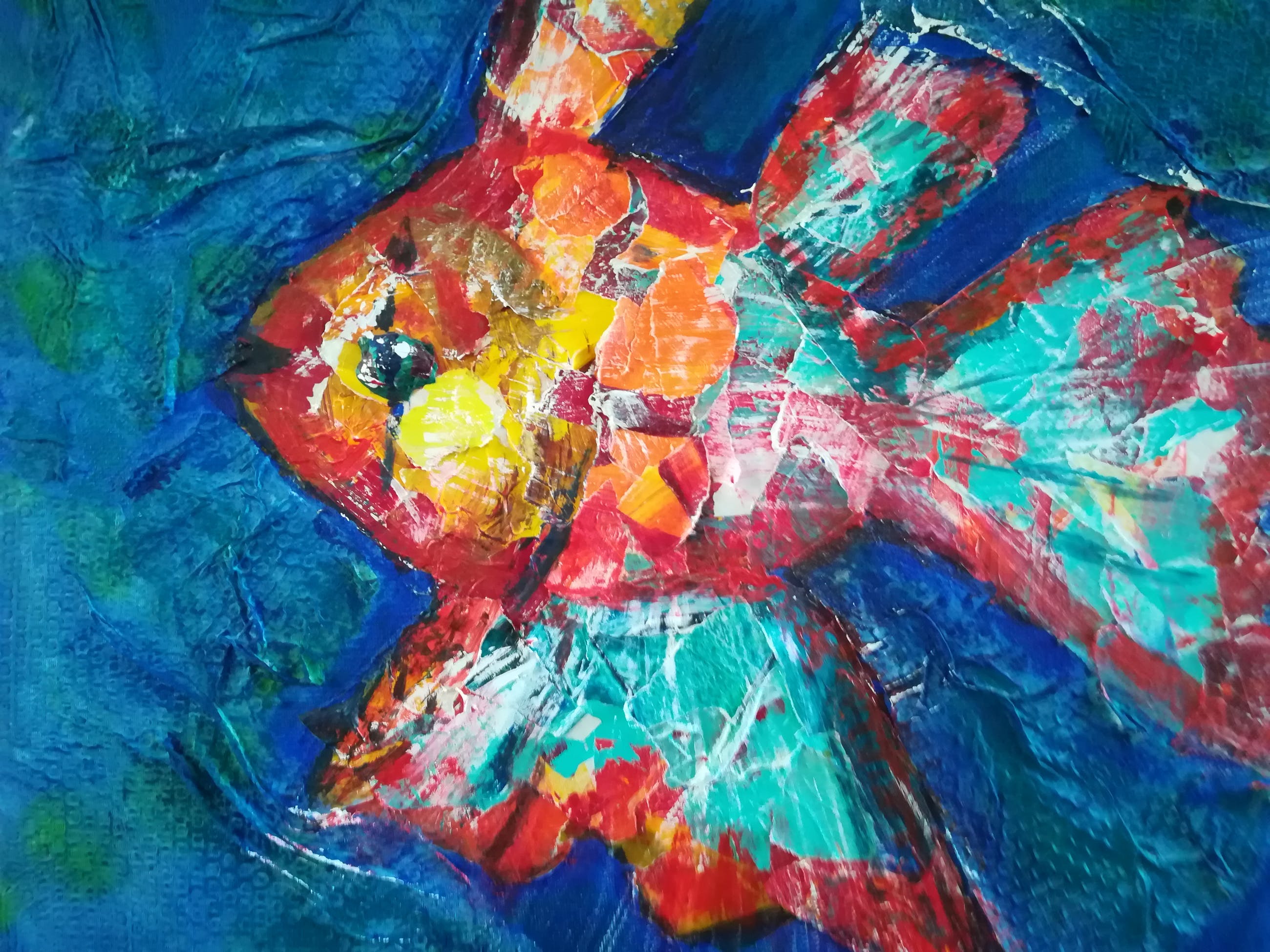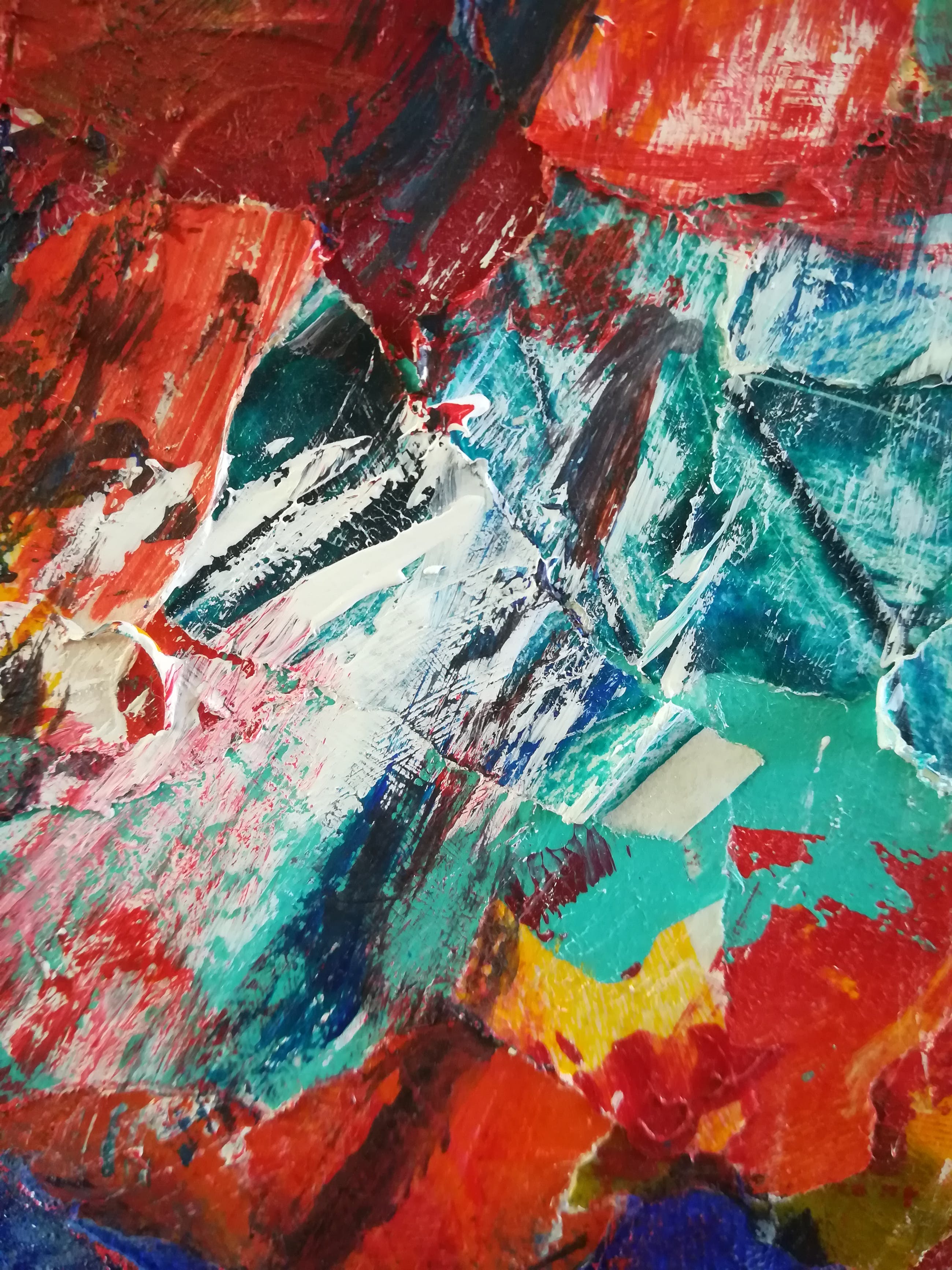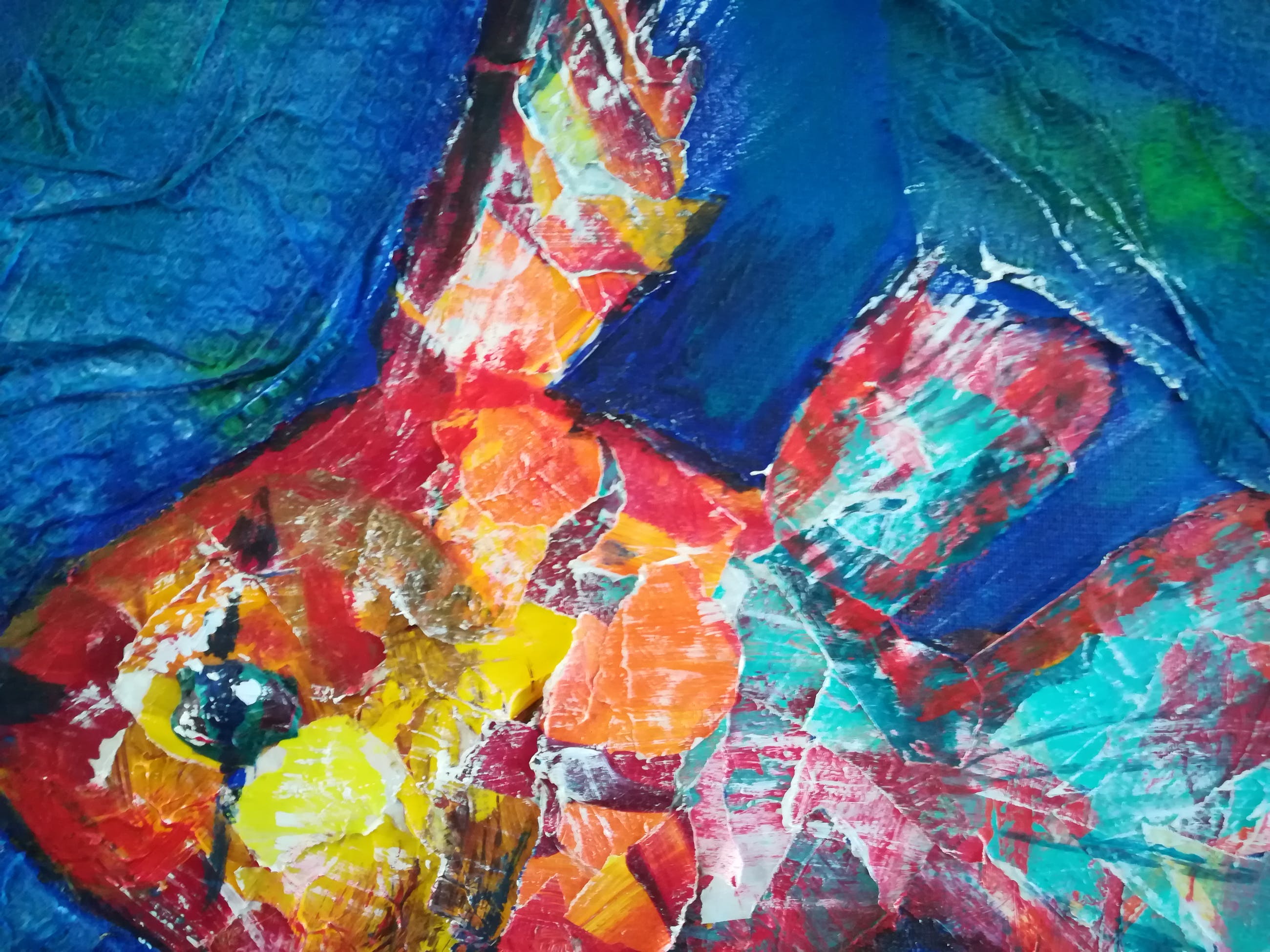 Heldere kleuren, uitgevoerd met gemengde technieken en in reliëf. Dit geeft een levendig effect.