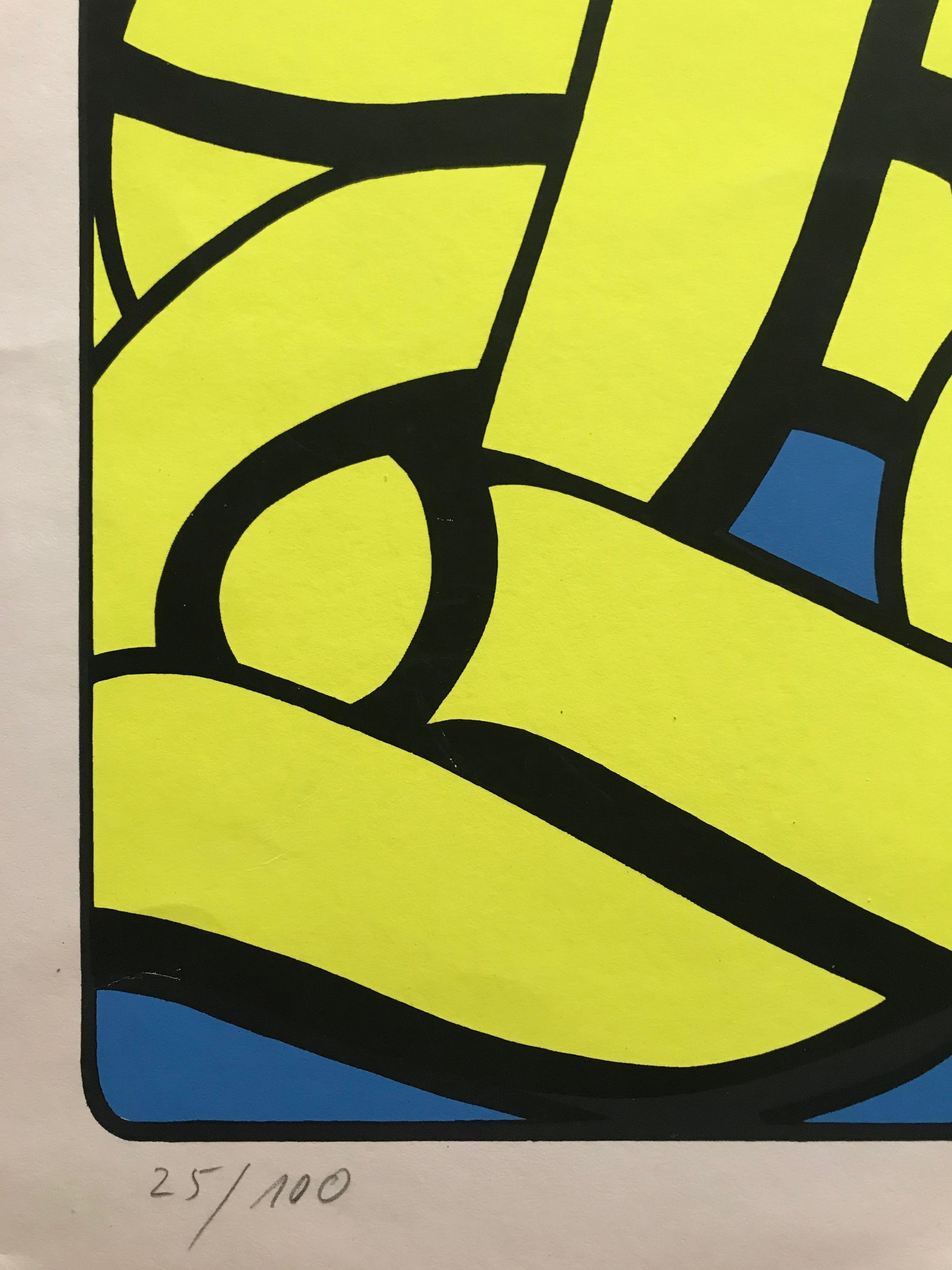 Mooie originele en grote zeefdruk van een voor mij onbekende (onleesbaar) kunstenaar. Kleurrijk werk! Gesigneerd, genummerd en gedateerd in potlood door de kunstenaar. Editie: 25/100 Jaar van uitgave: 1971 Goede algemene staat. 2 scheurtjes aan de randen