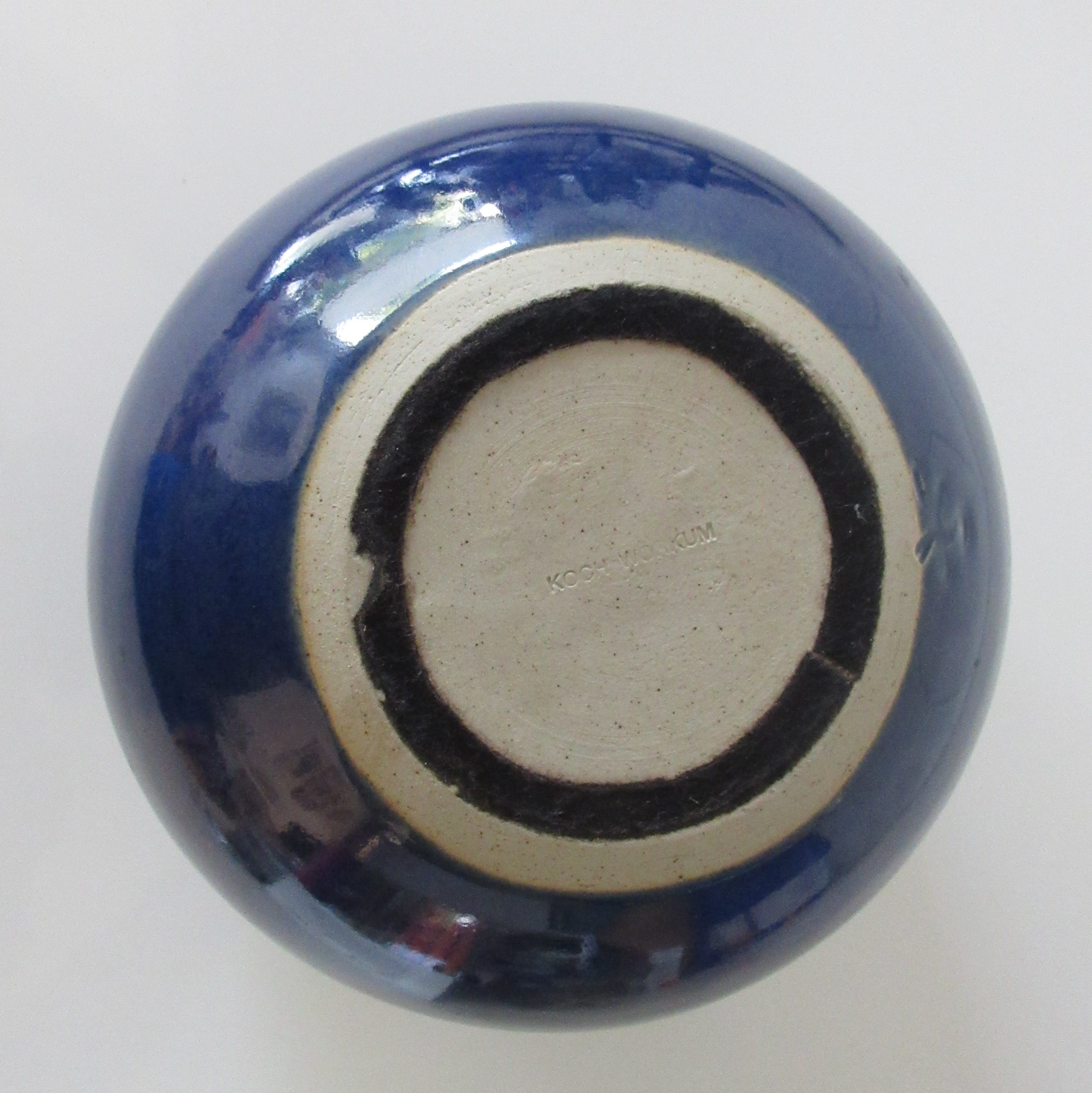 Mooie diepblauw studio keramische bolvaas van Koch Potterie uit Workum. Op de bovenrand een klein chipje, verder onbeschadigd. Aan de onderzijde gemerkt met ingedrukt blindmerk en voorzien van monogram.