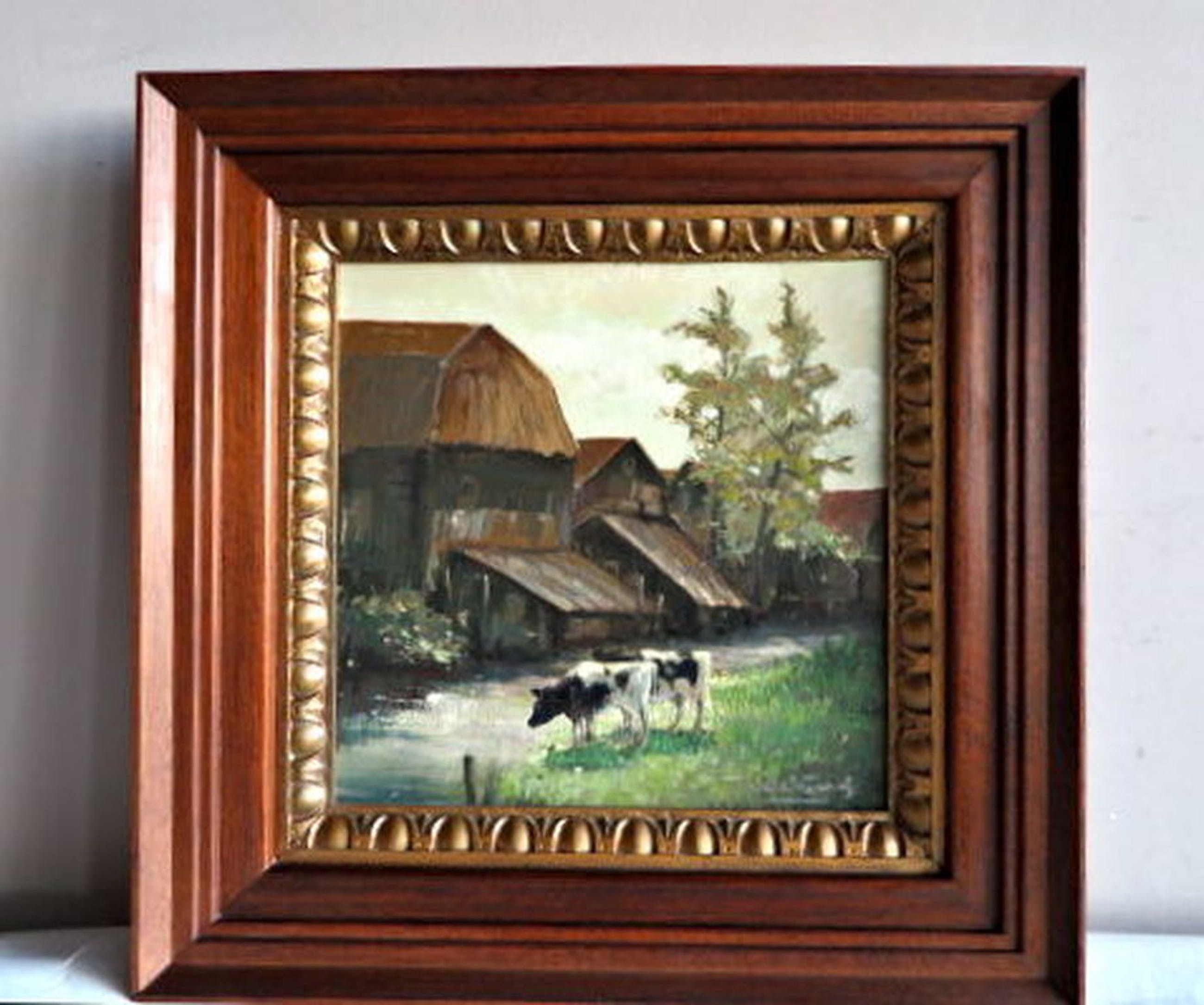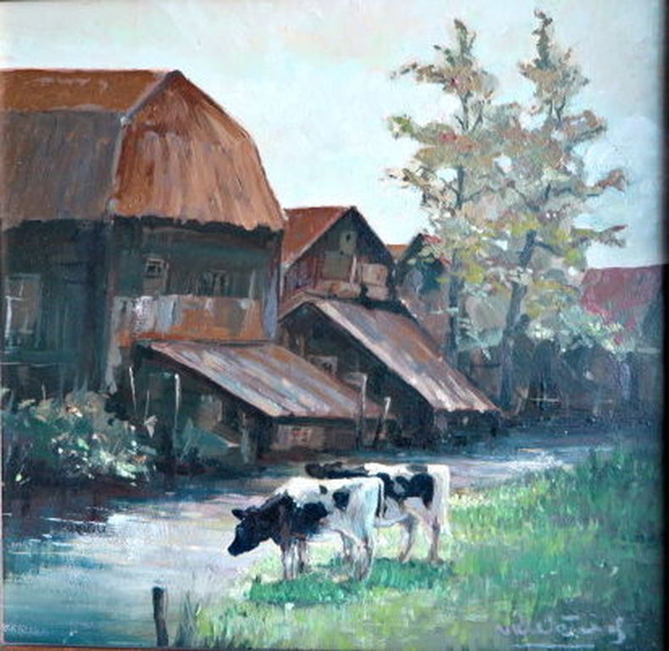 Fris schilderij van koeien aan de waterkant in een lenteachtige sfeer bij een grote oude boerderij.