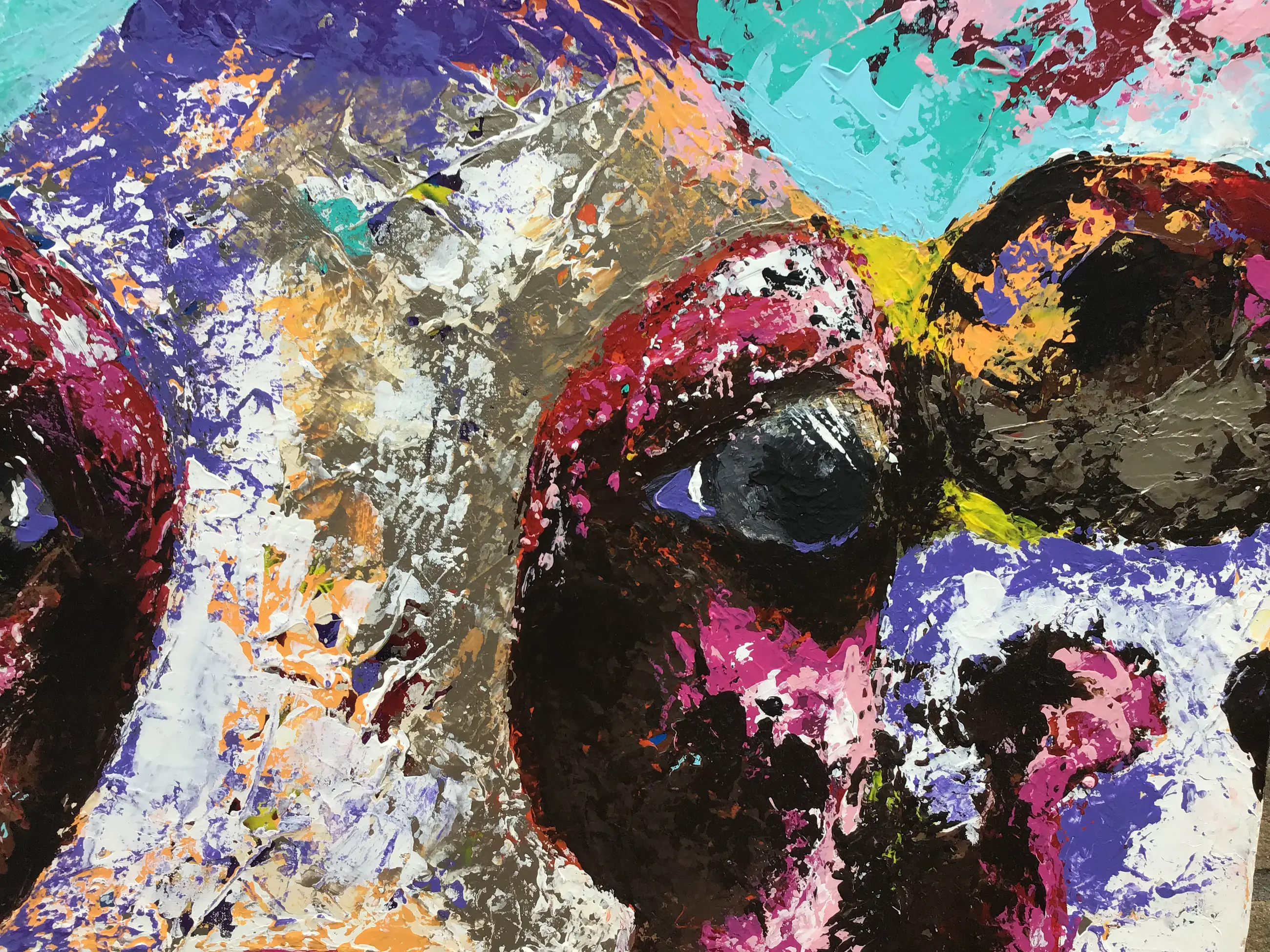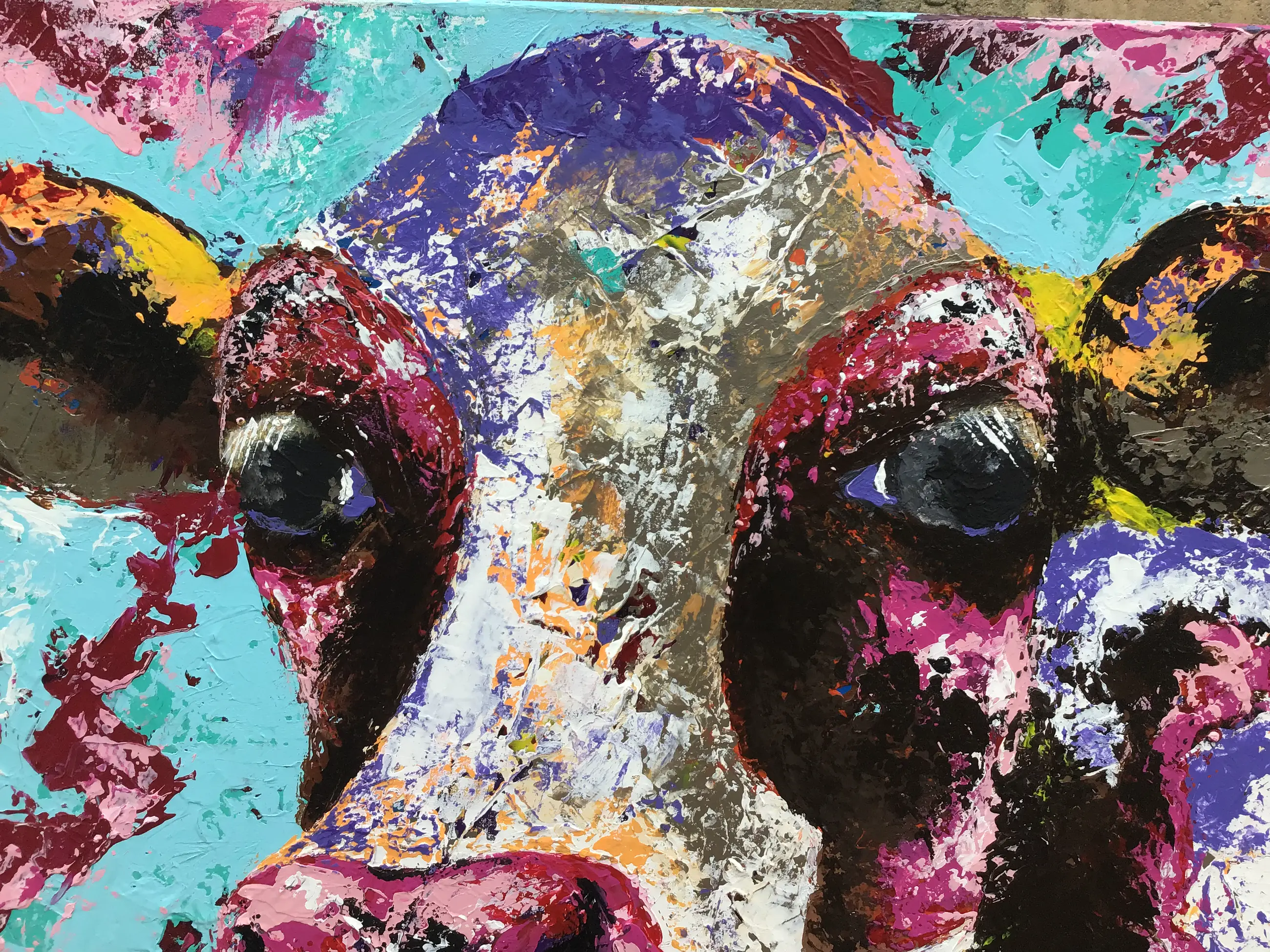 Expressief schilderij van een koe. Gesigneerd met initialen. Bedoeld om zonder lijst te gebruiken. Frame van 4cm dik.