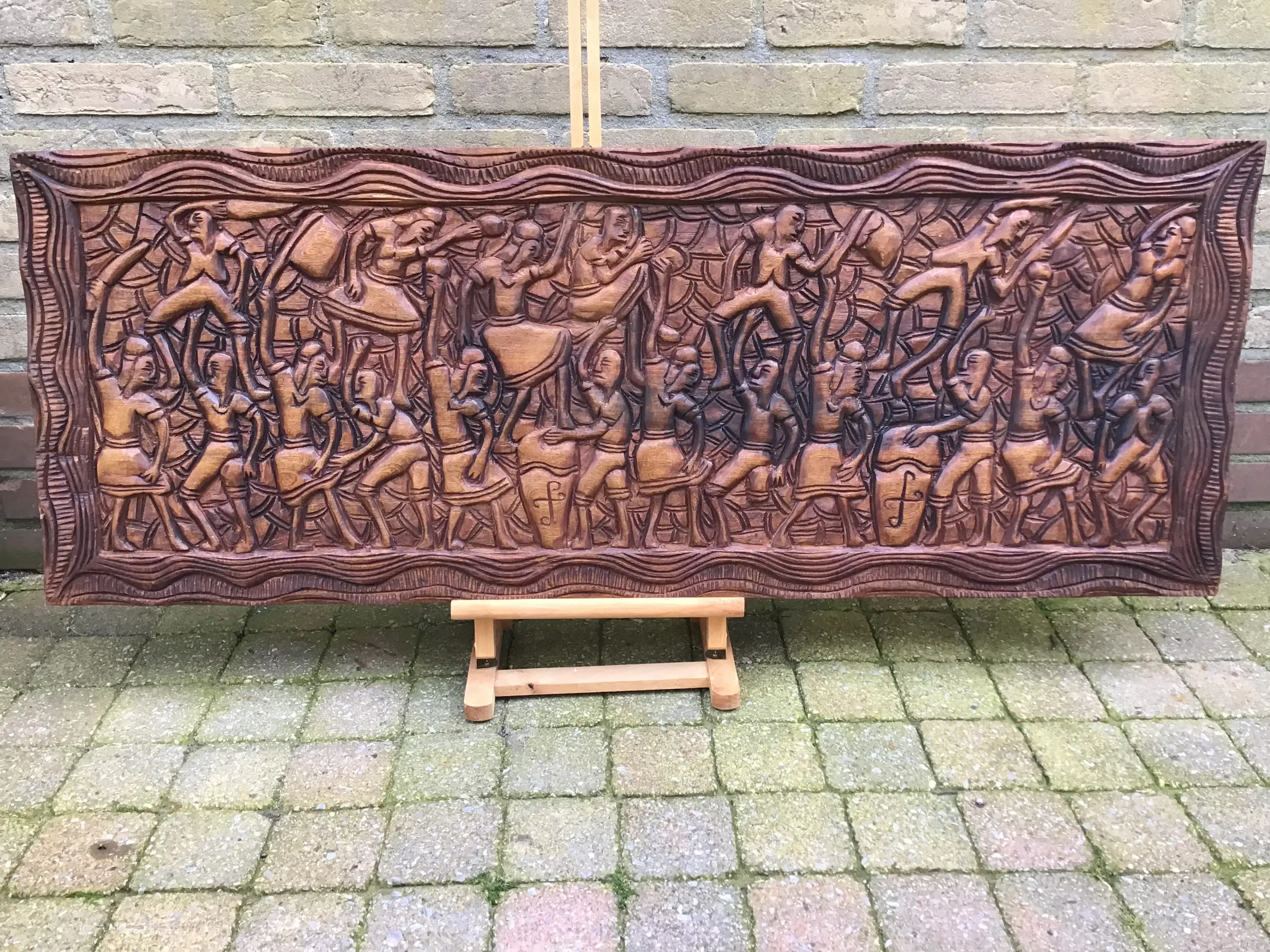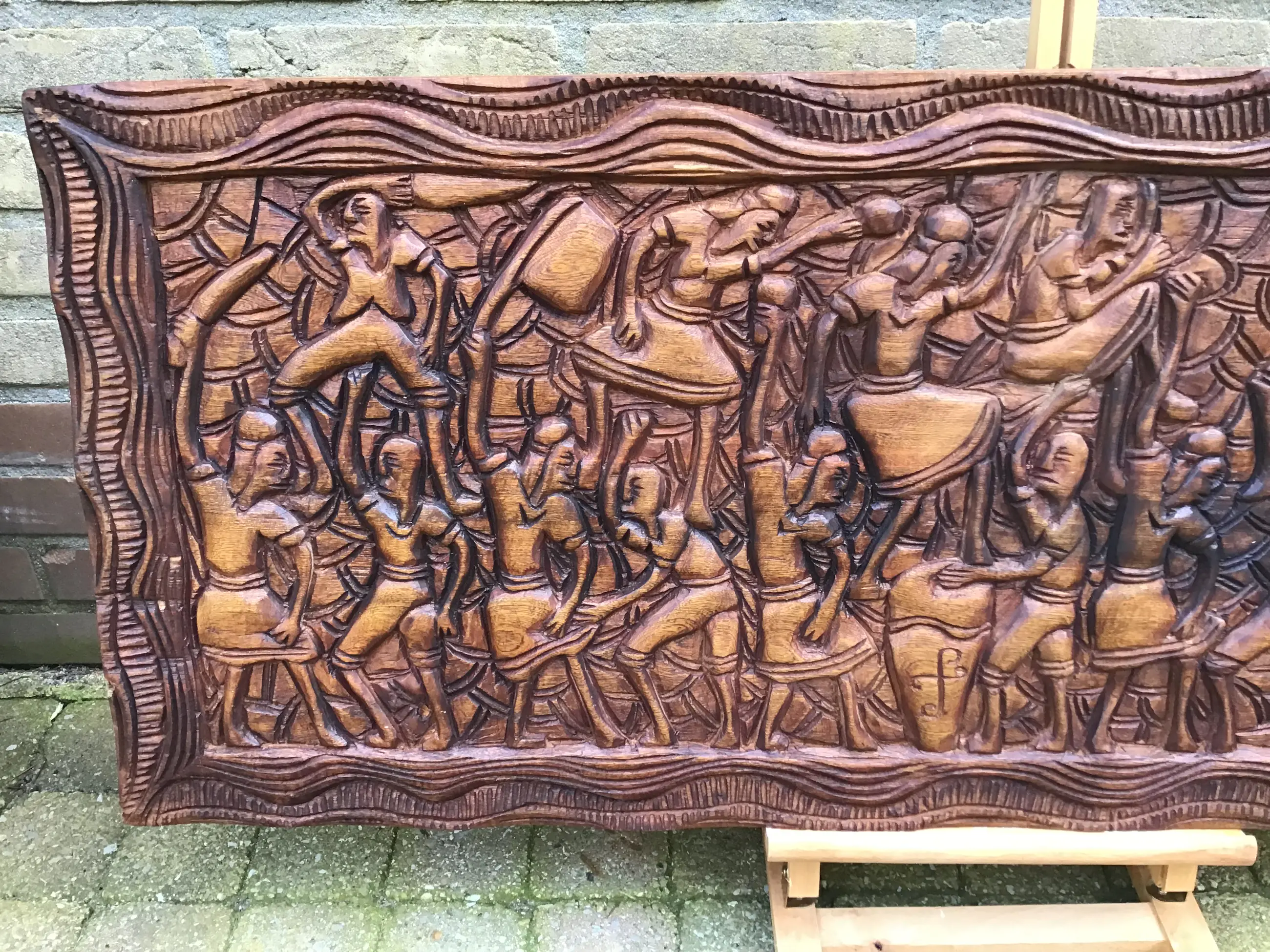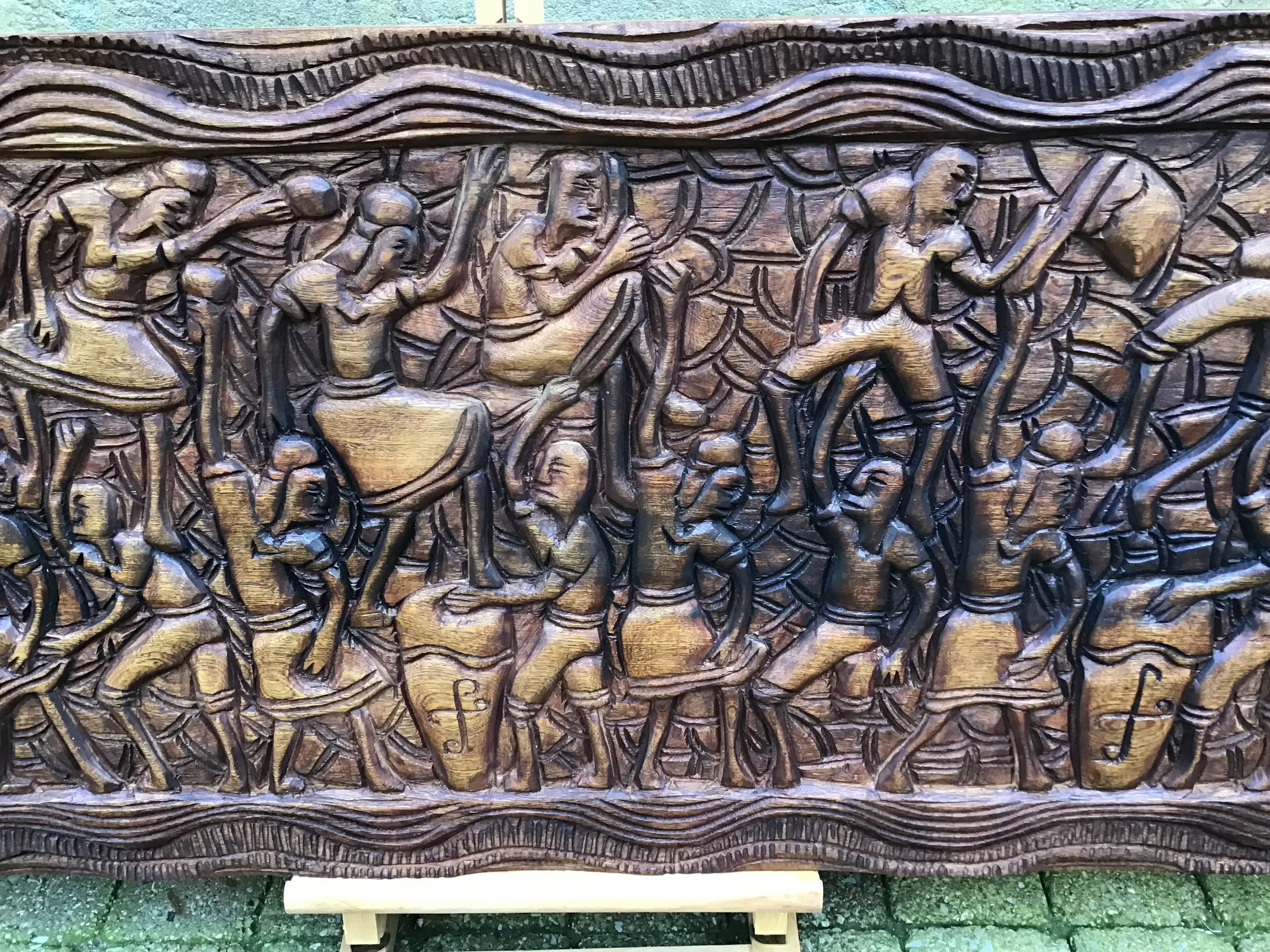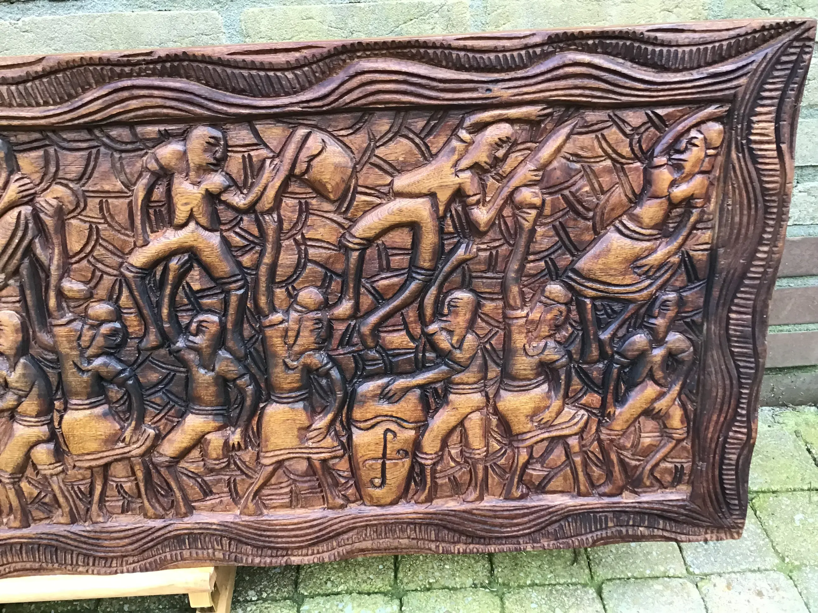 Groot Afrikaans blokreliëf van zwaar tropisch hardhout waarin strijders met wapens te zien zijn. Er is ook een man die een been mistige zien. Herkomst onbekend.
