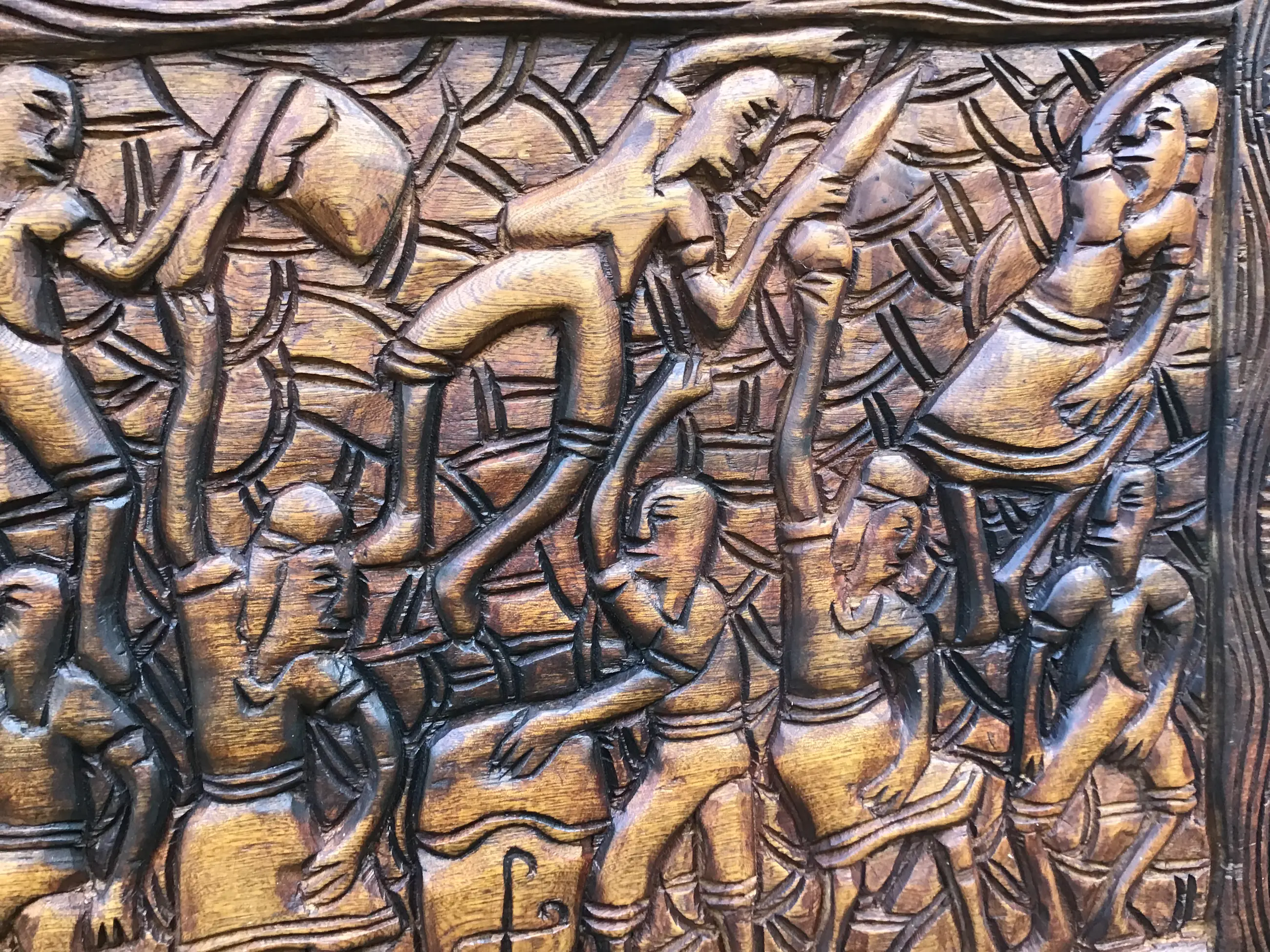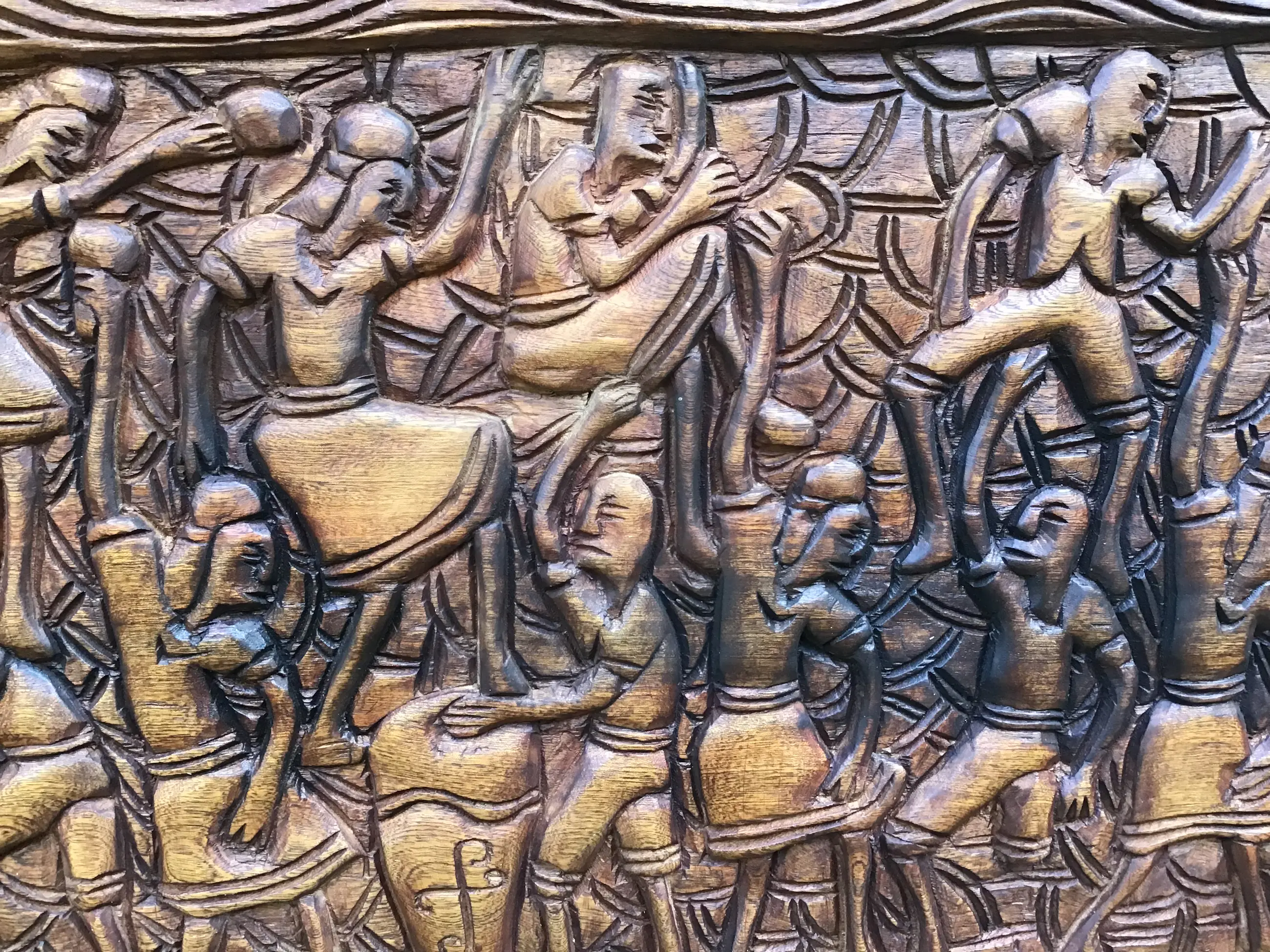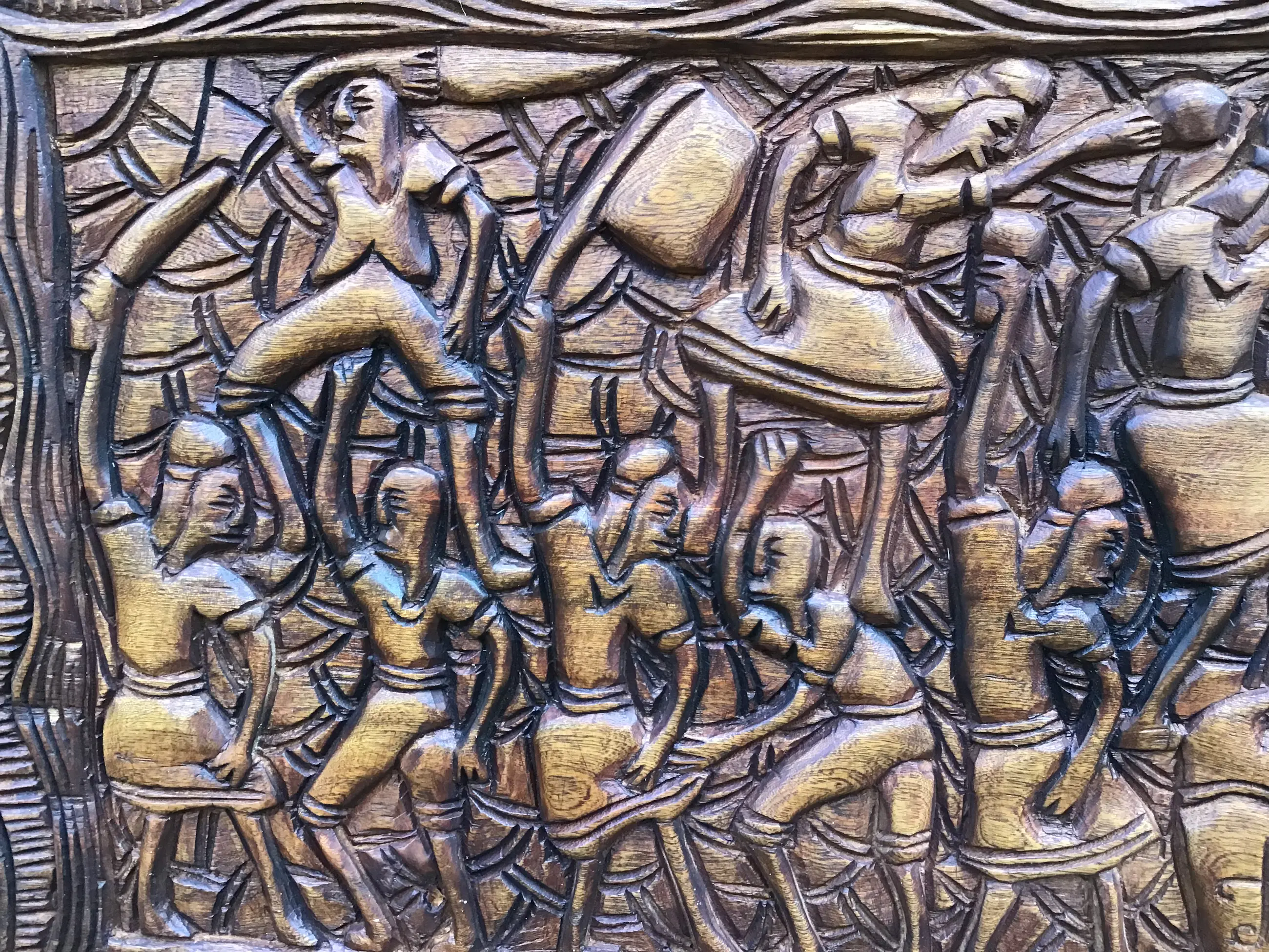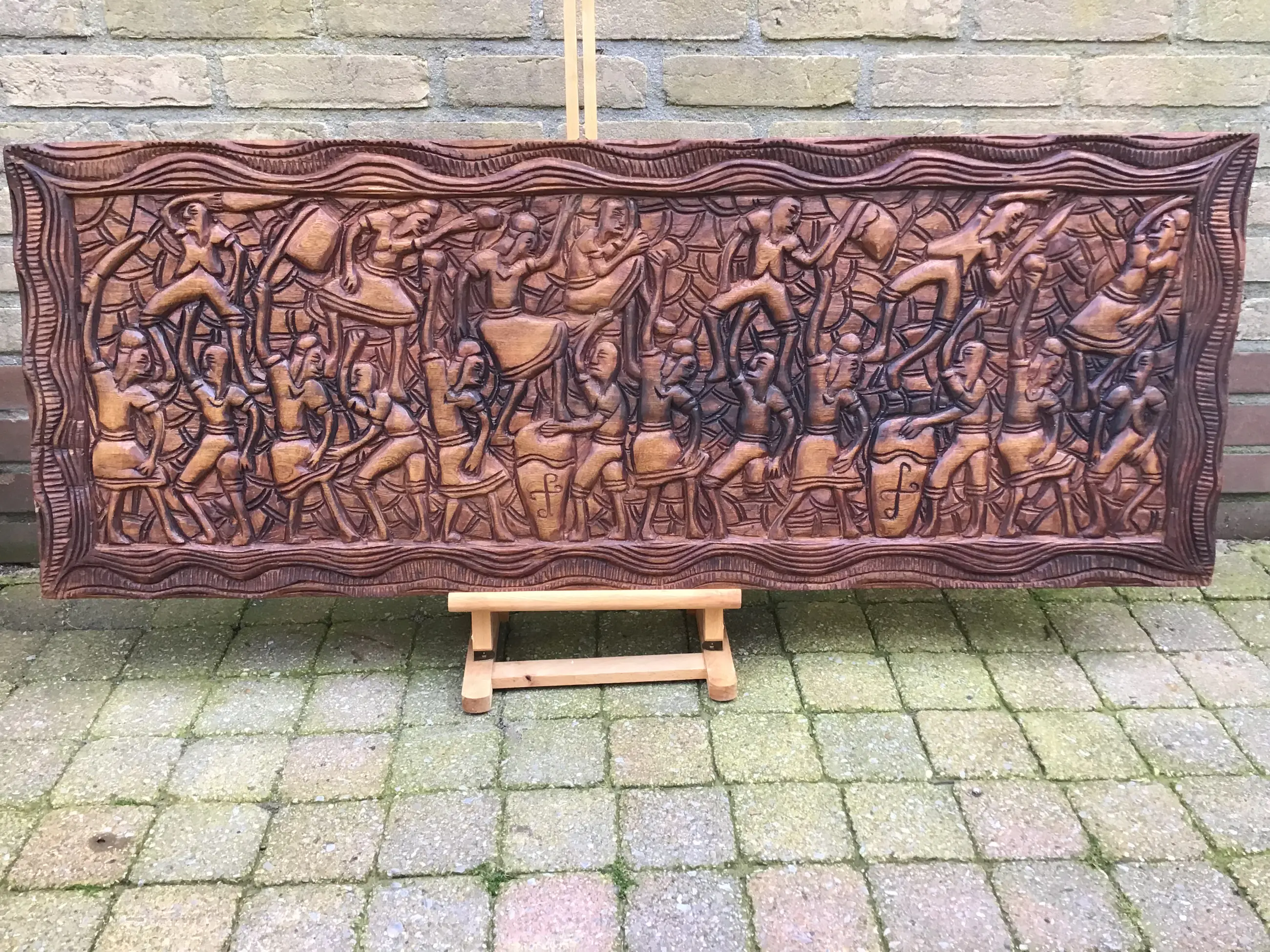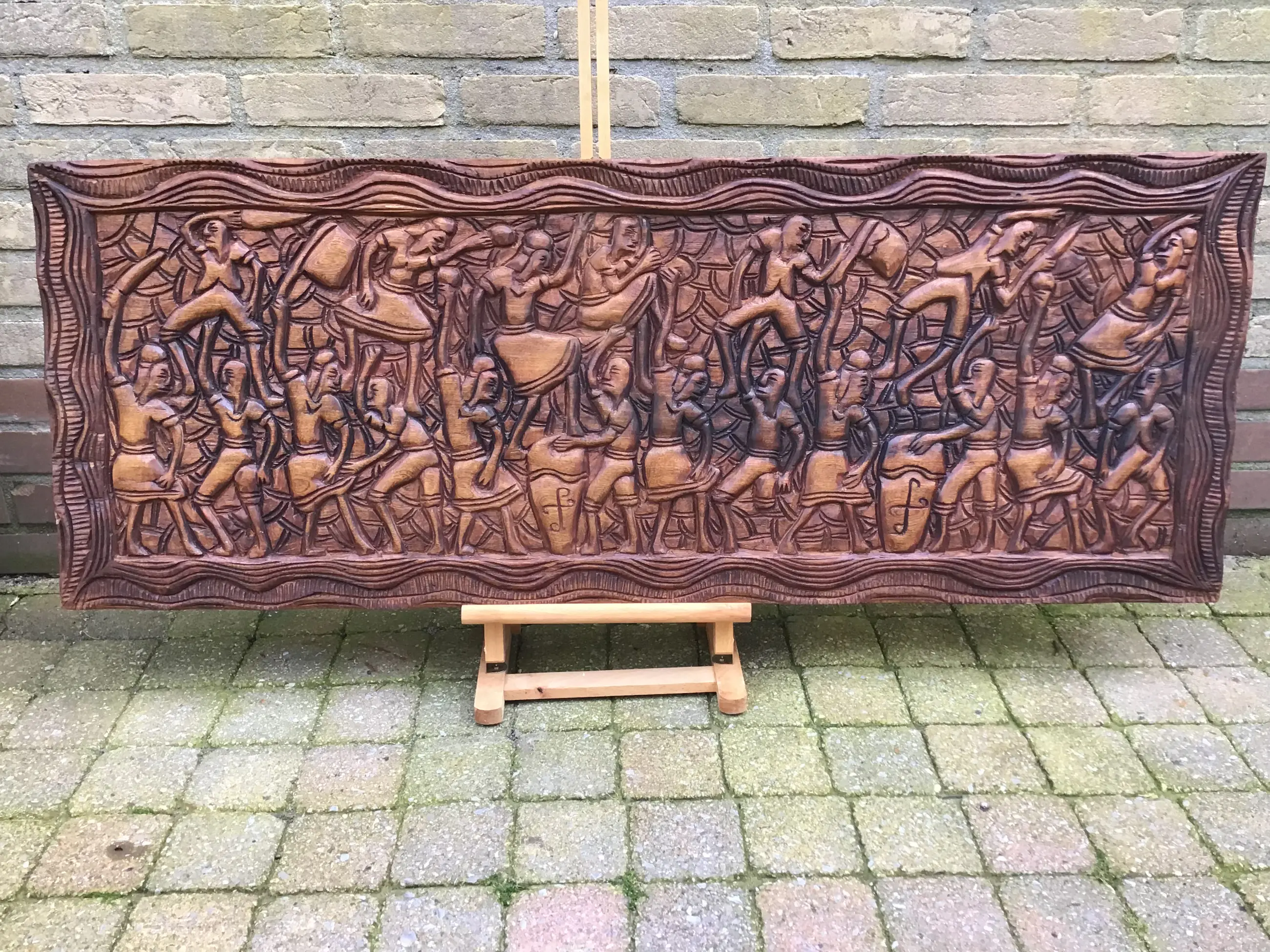 Groot Afrikaans blokreliëf van zwaar tropisch hardhout waarin strijders met wapens te zien zijn. Er is ook een man die een been mistige zien. Herkomst onbekend.