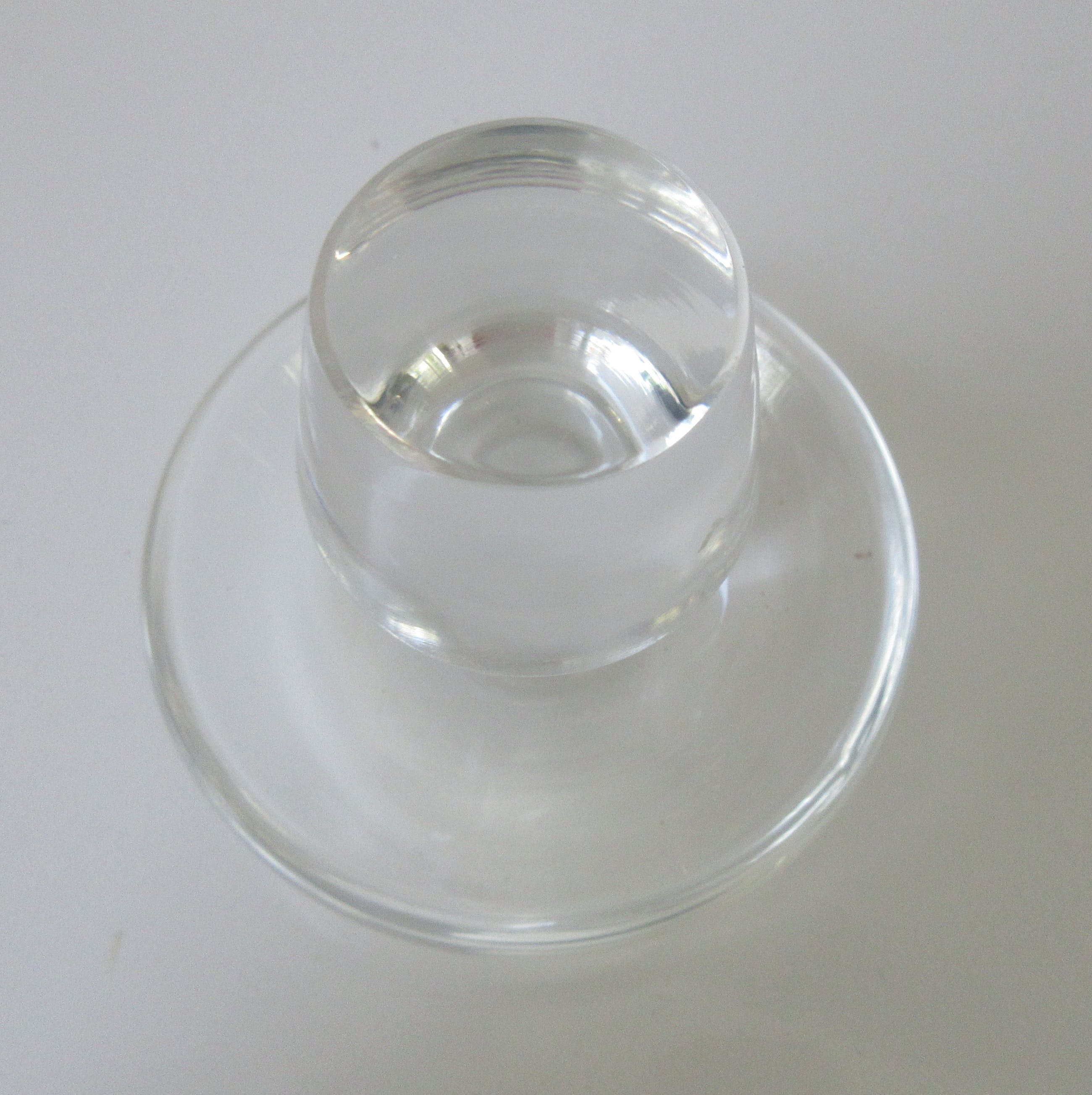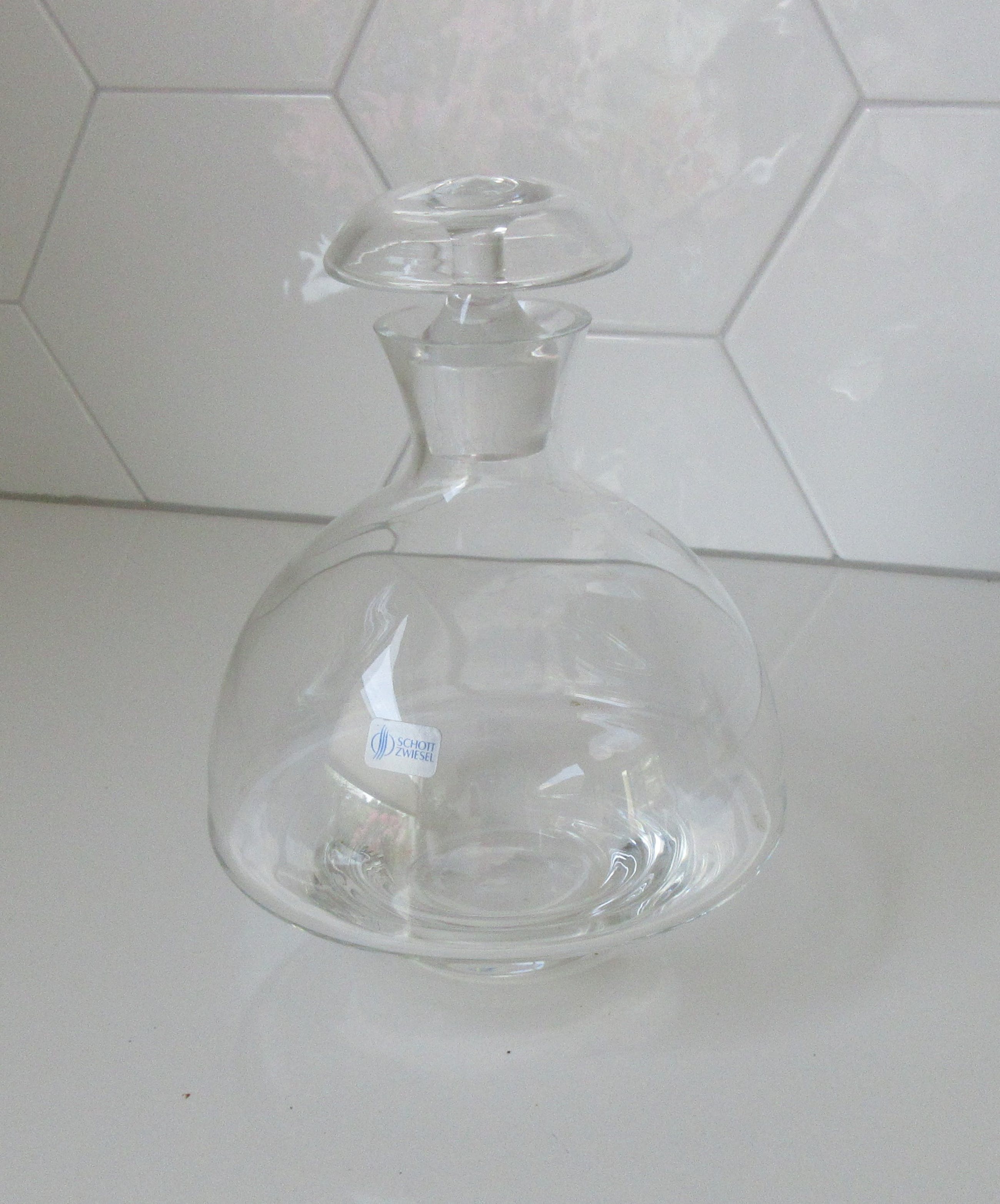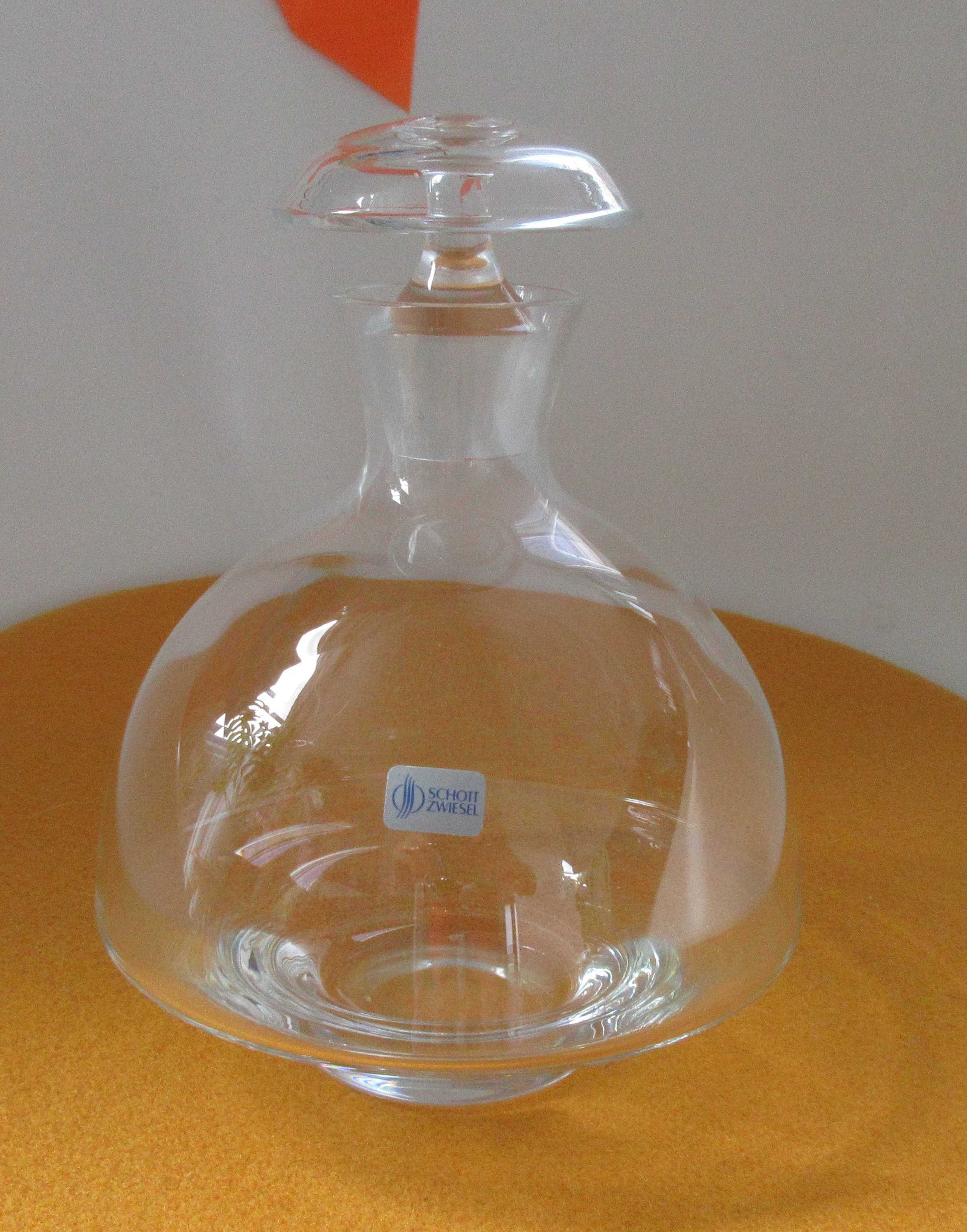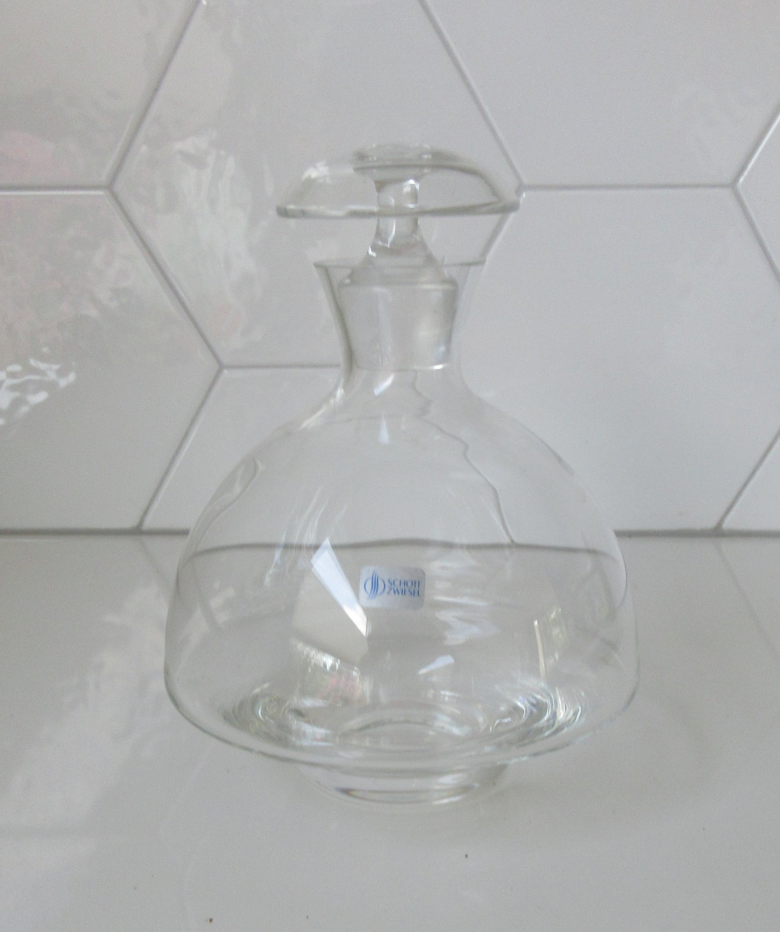 Kristallen design karaf van Schott Zwiesel in halve bolvorm ofwel 'mushroom' shape. Mooi elegant karafje, ontwerper onbekend. In prima ongebruikte conditie, voorzien van een merksticker.