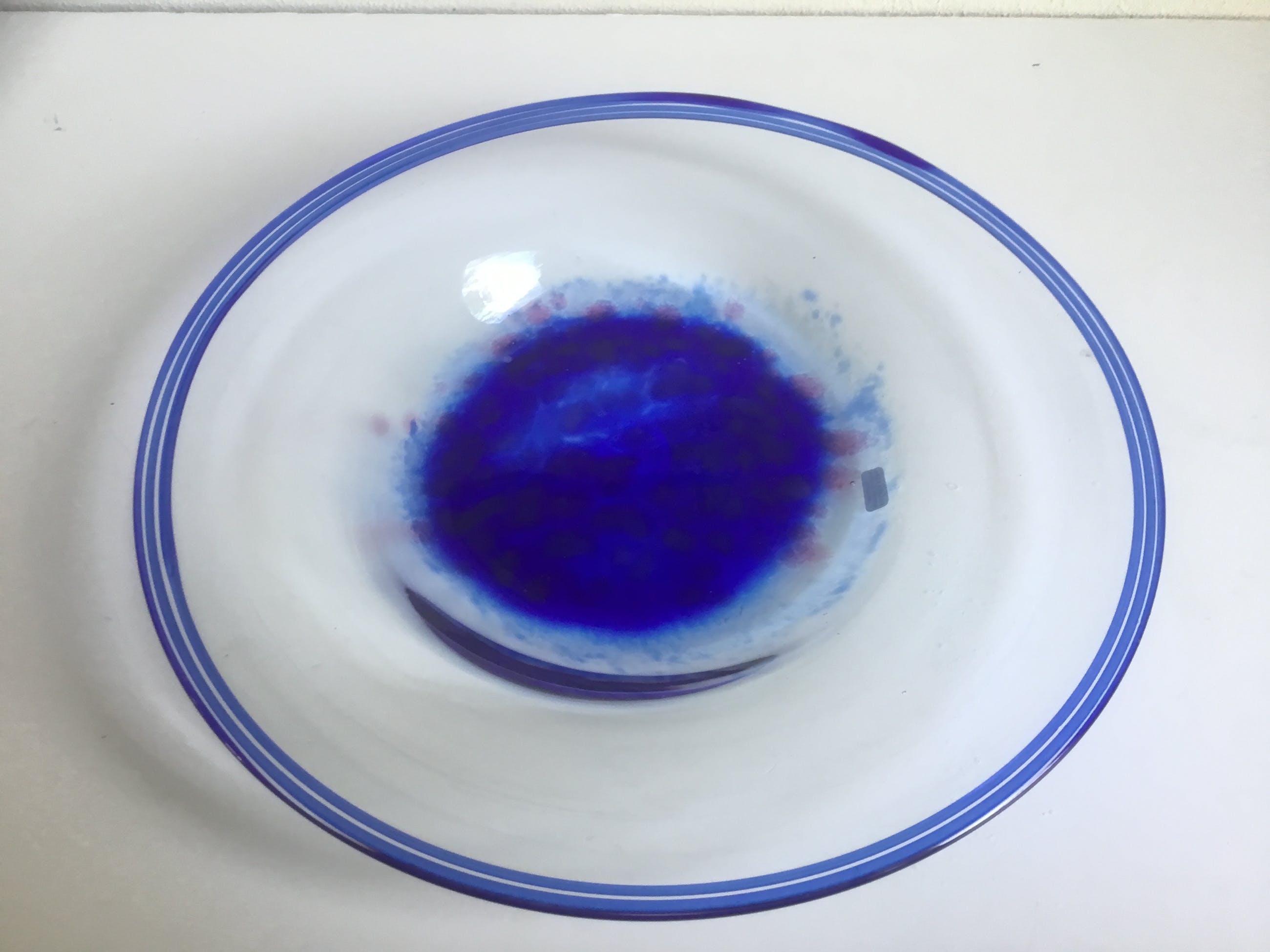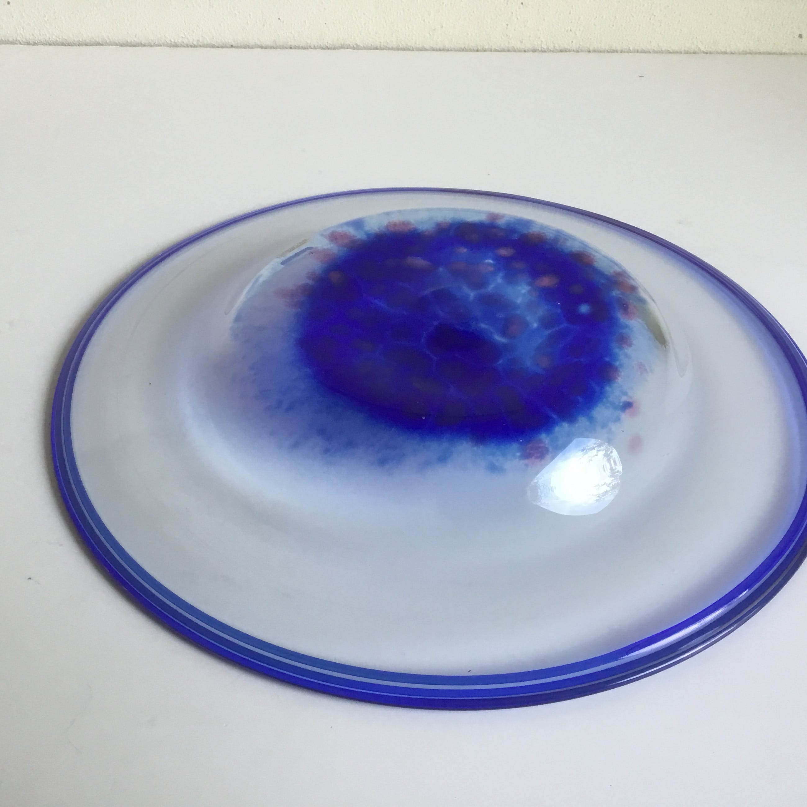 Mooie handgemaakte kristallen schaal uit Zweden. De schaal is deels van blauw glas met licht rosé/rode stippen. De diameter van de schaal is 31 cm.