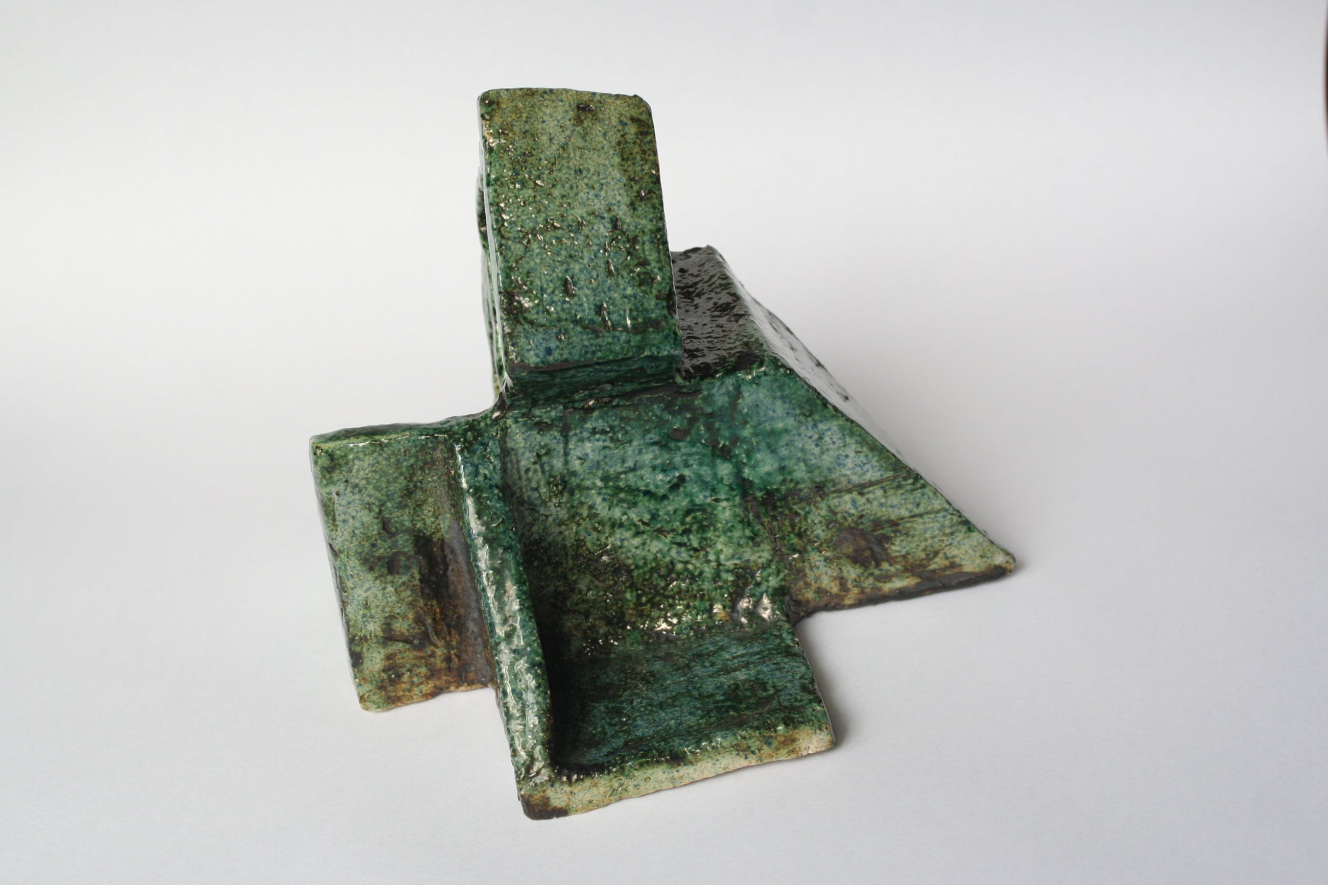 Kubistisch aardewerk object, Groen glazuur. Door kleur en glazuur lijkt kunstwerk me uit jaren 60 of eerder. Het is aan alle kanten gefotografeerd. Verkoop vanuit opheffen verzameling.
