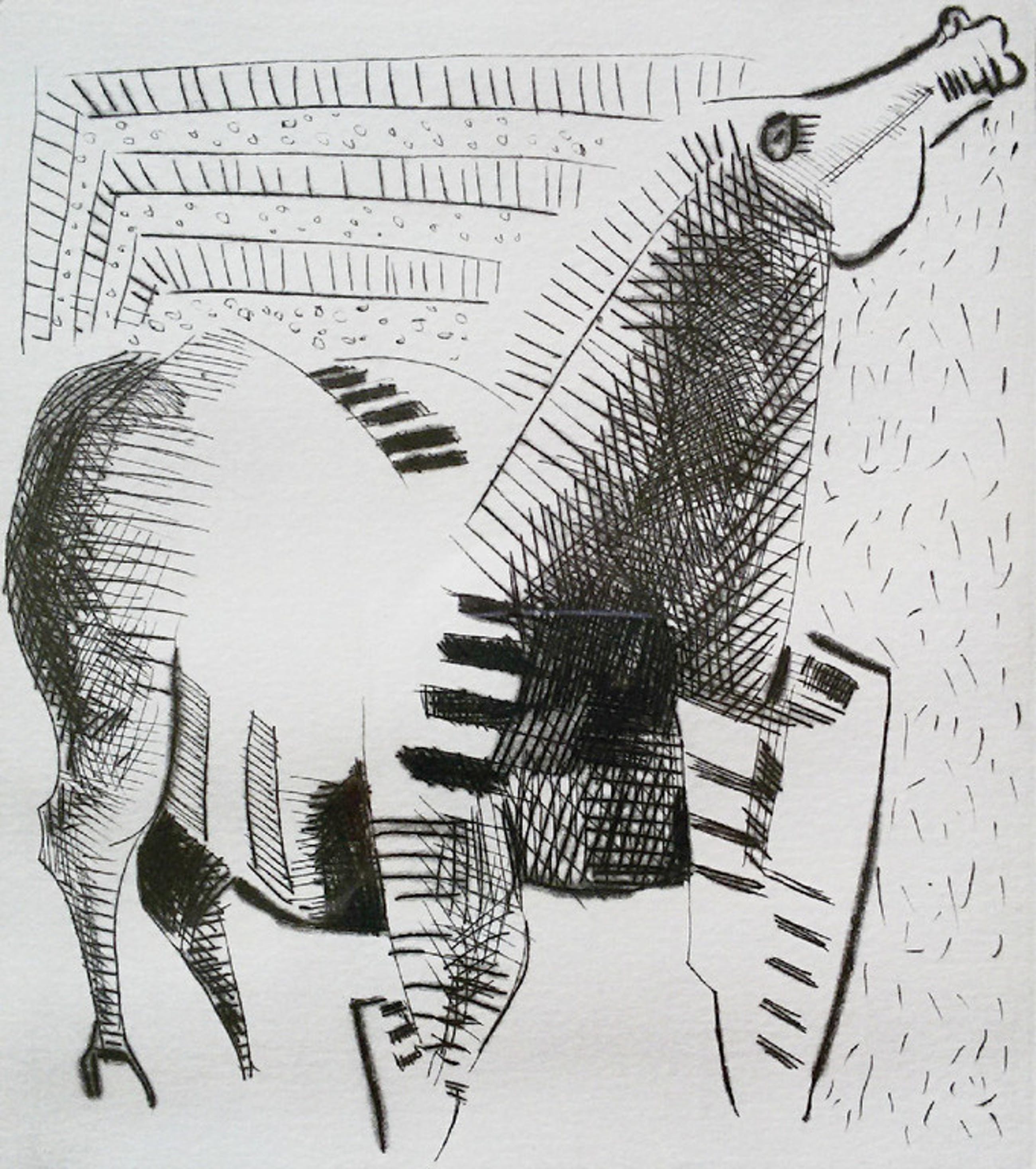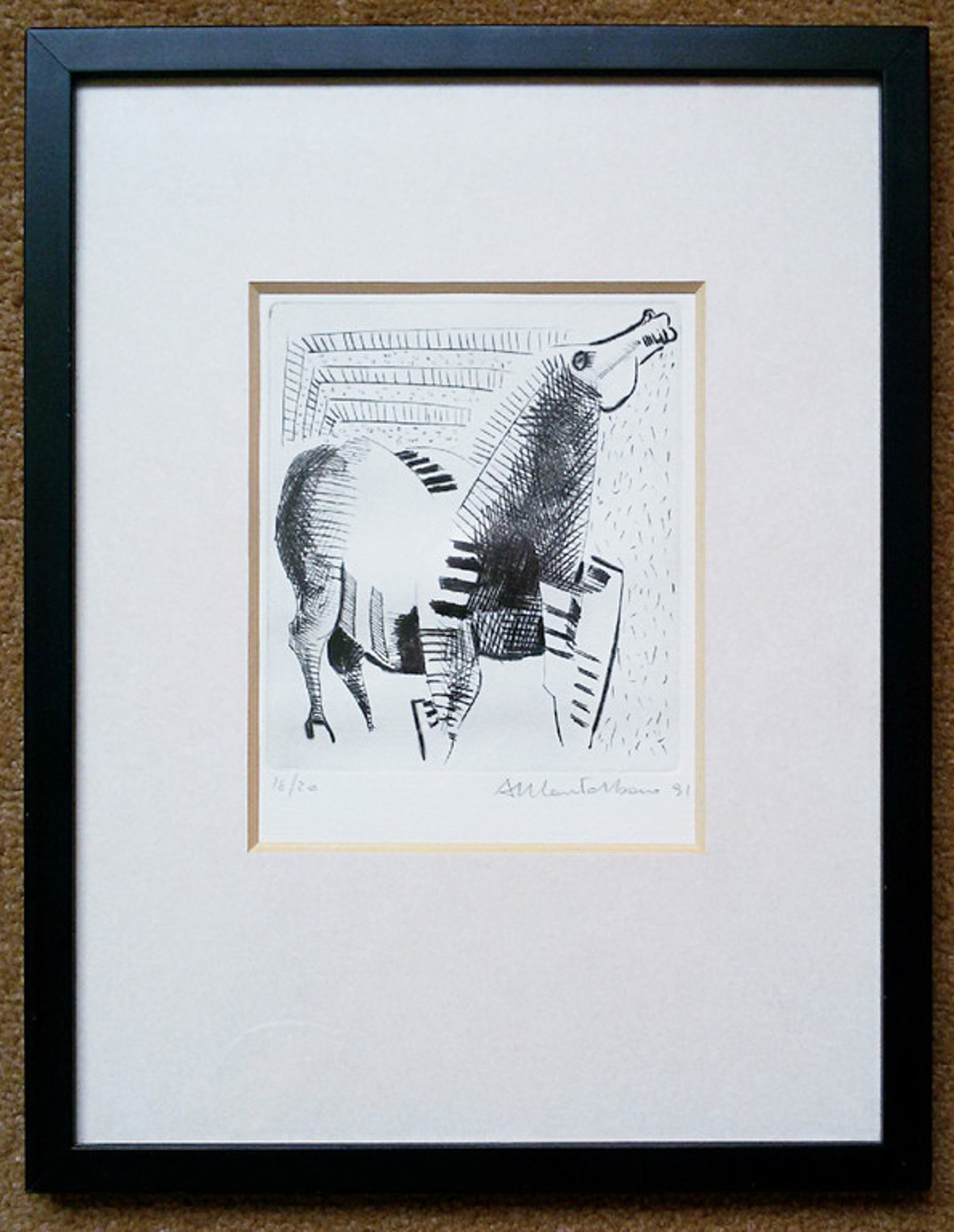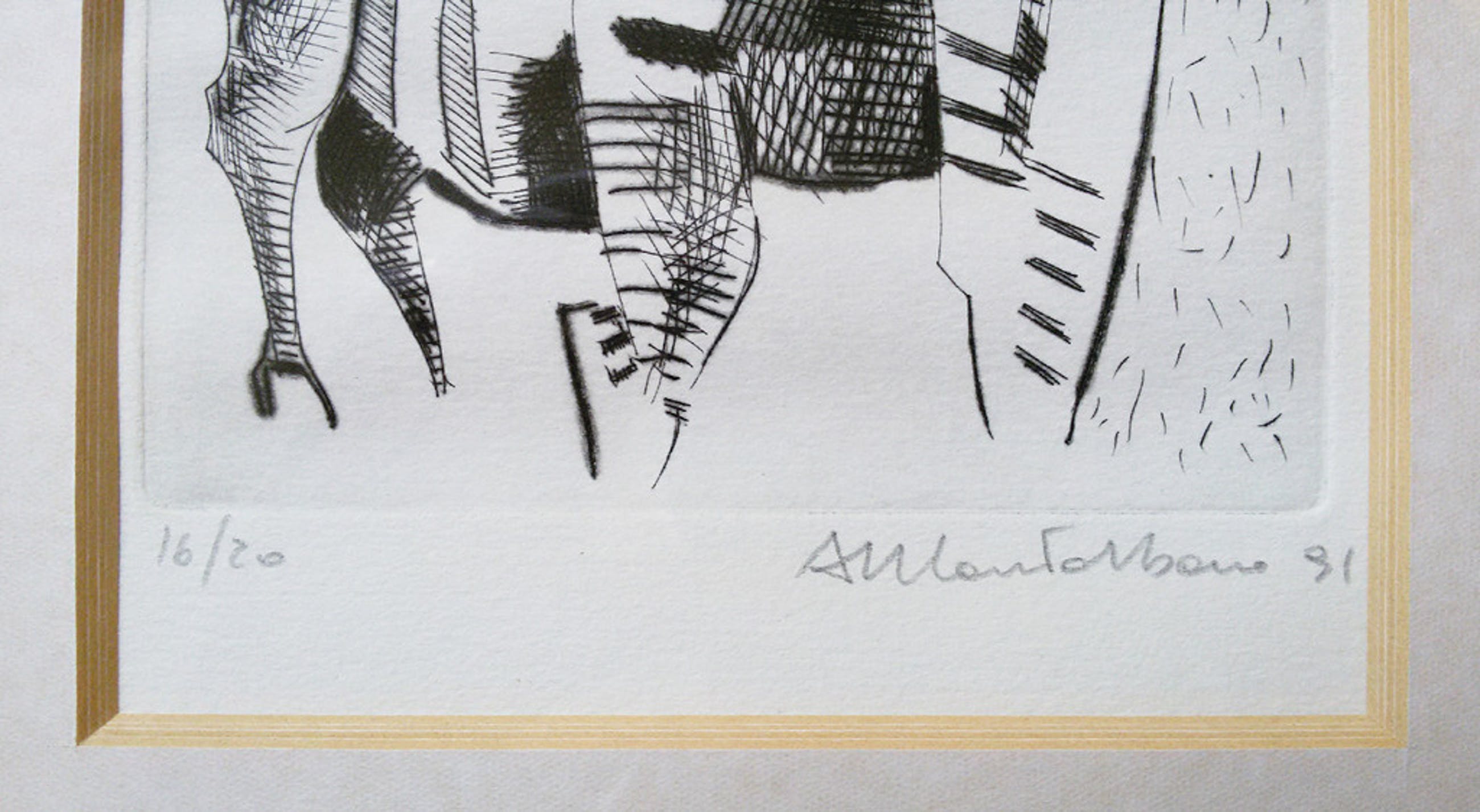 Krachtig werk van een vooralsnog onbekende kunstenaar (het zou van de hand van de Belgische kunstenaar Arie Mandelbaum kunnen zijn). Ets op papier, met potlood gesigneerd, gedateerd (91) en genummerd (16/20). In nette, zwarte houten lijst, achter glas en met passe-partout. In zeer goed conditie.