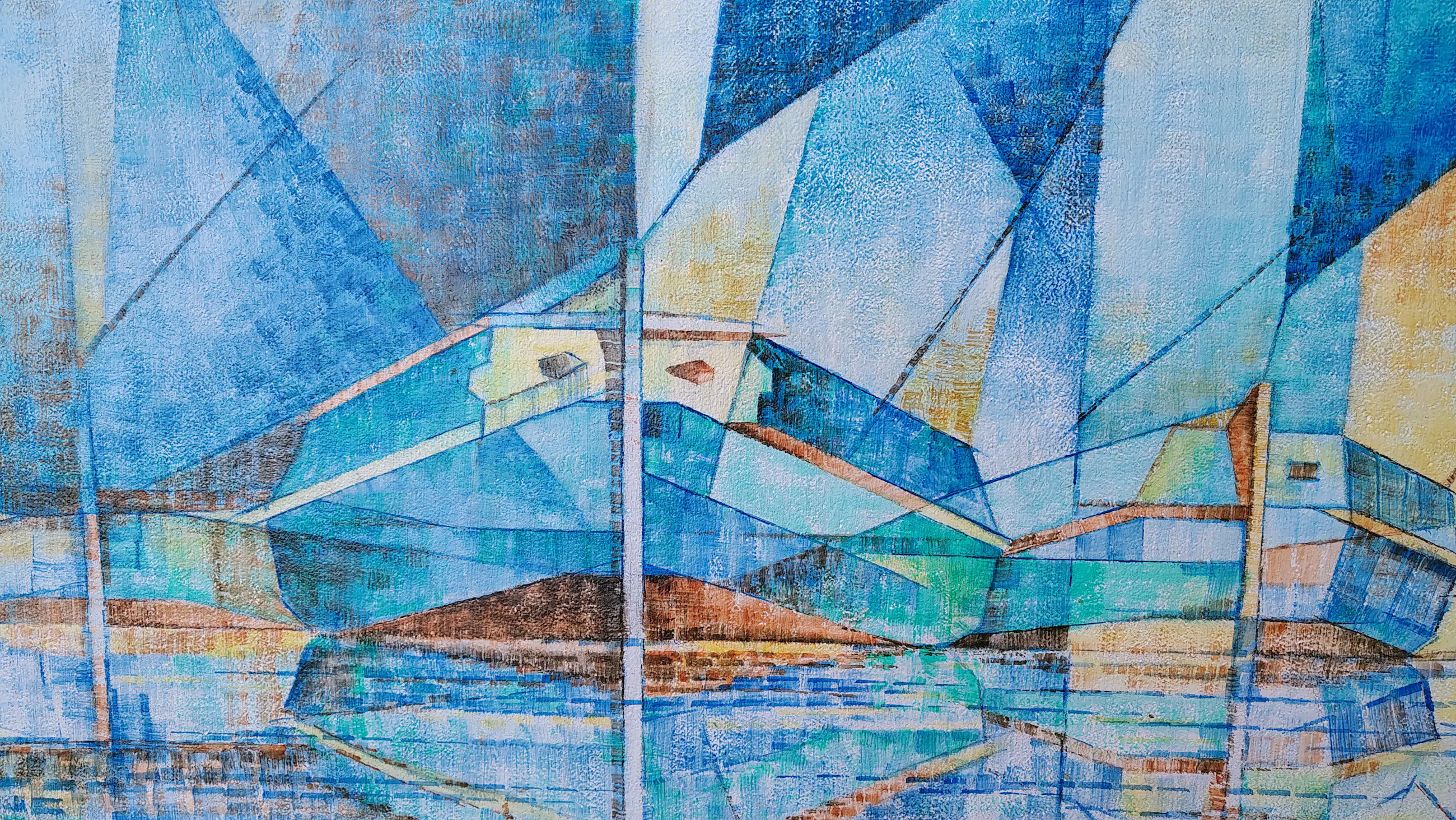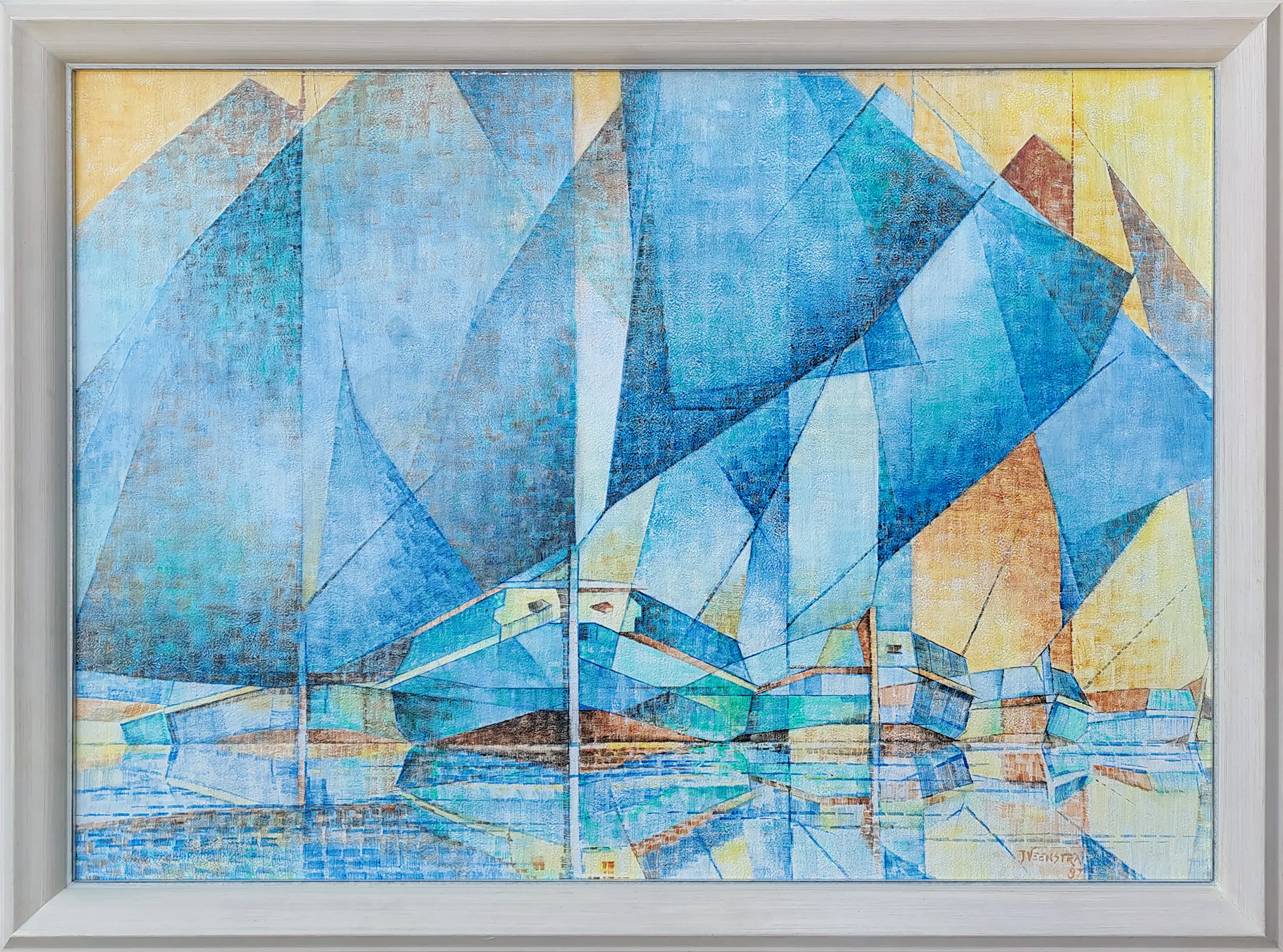 Onbekend - kubistische zeilboten in olieverf - INGELIJST - 25136