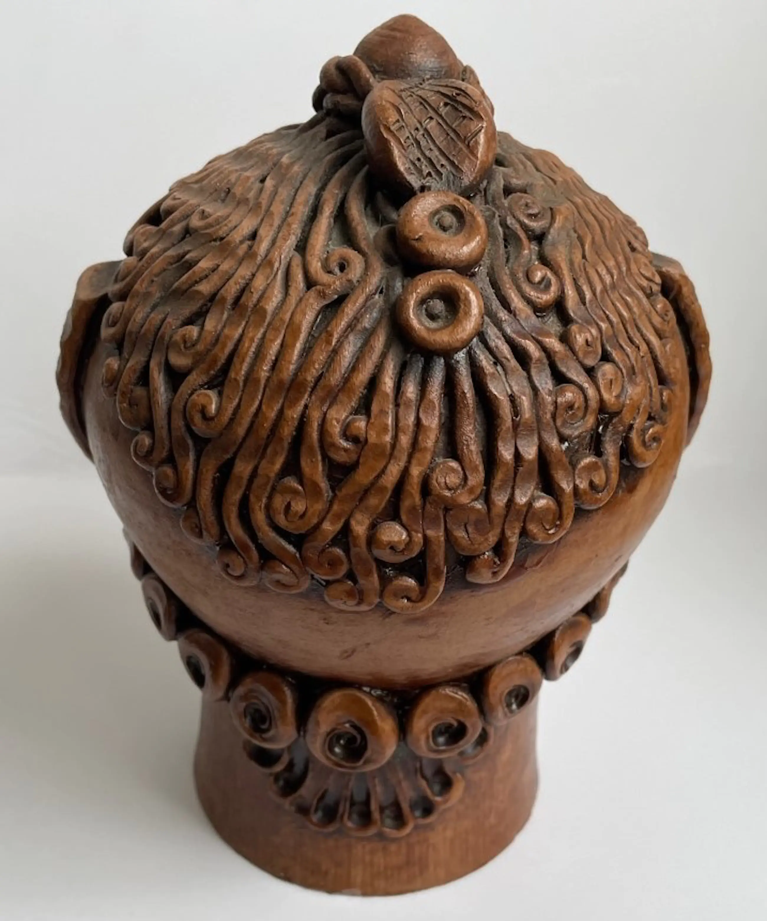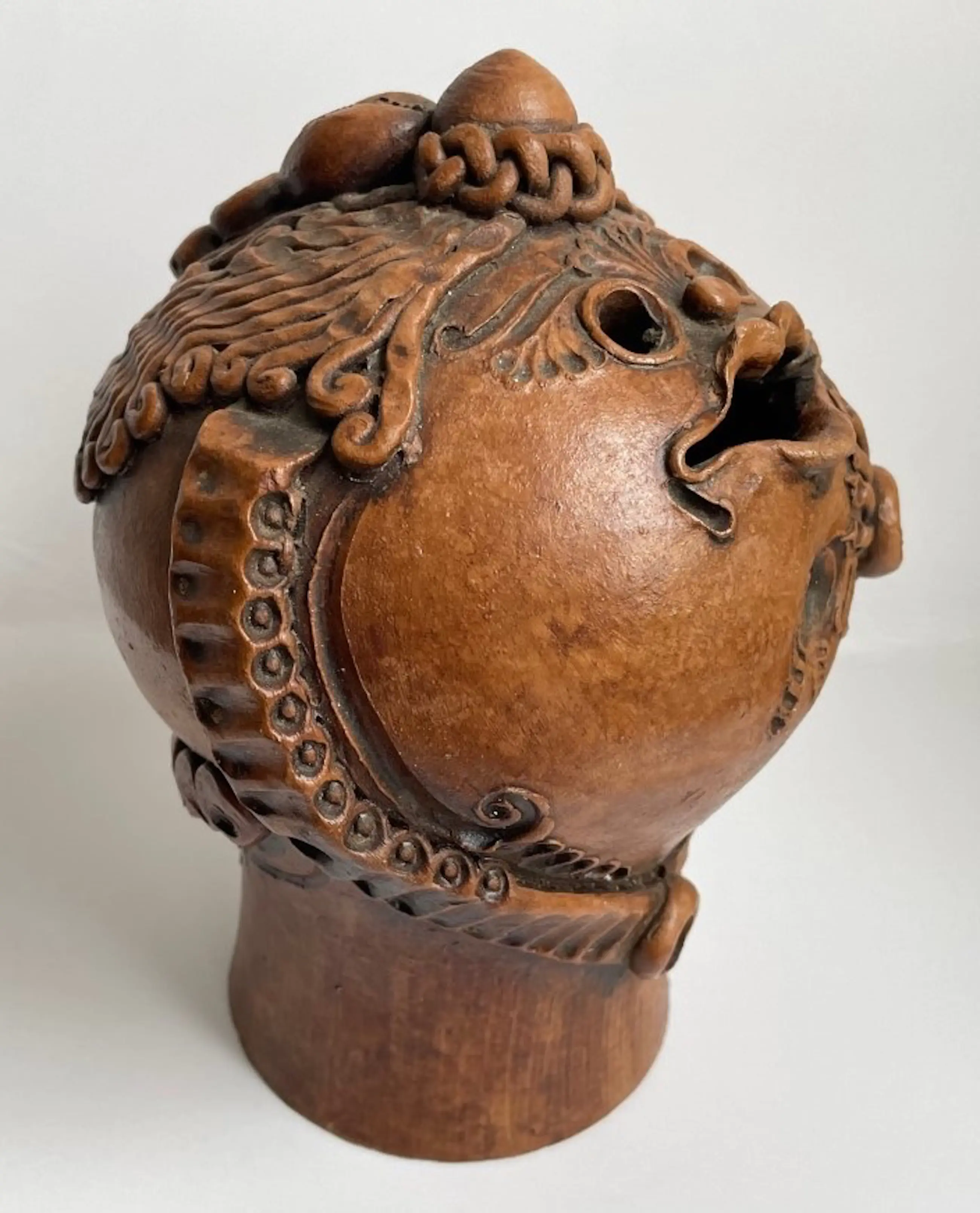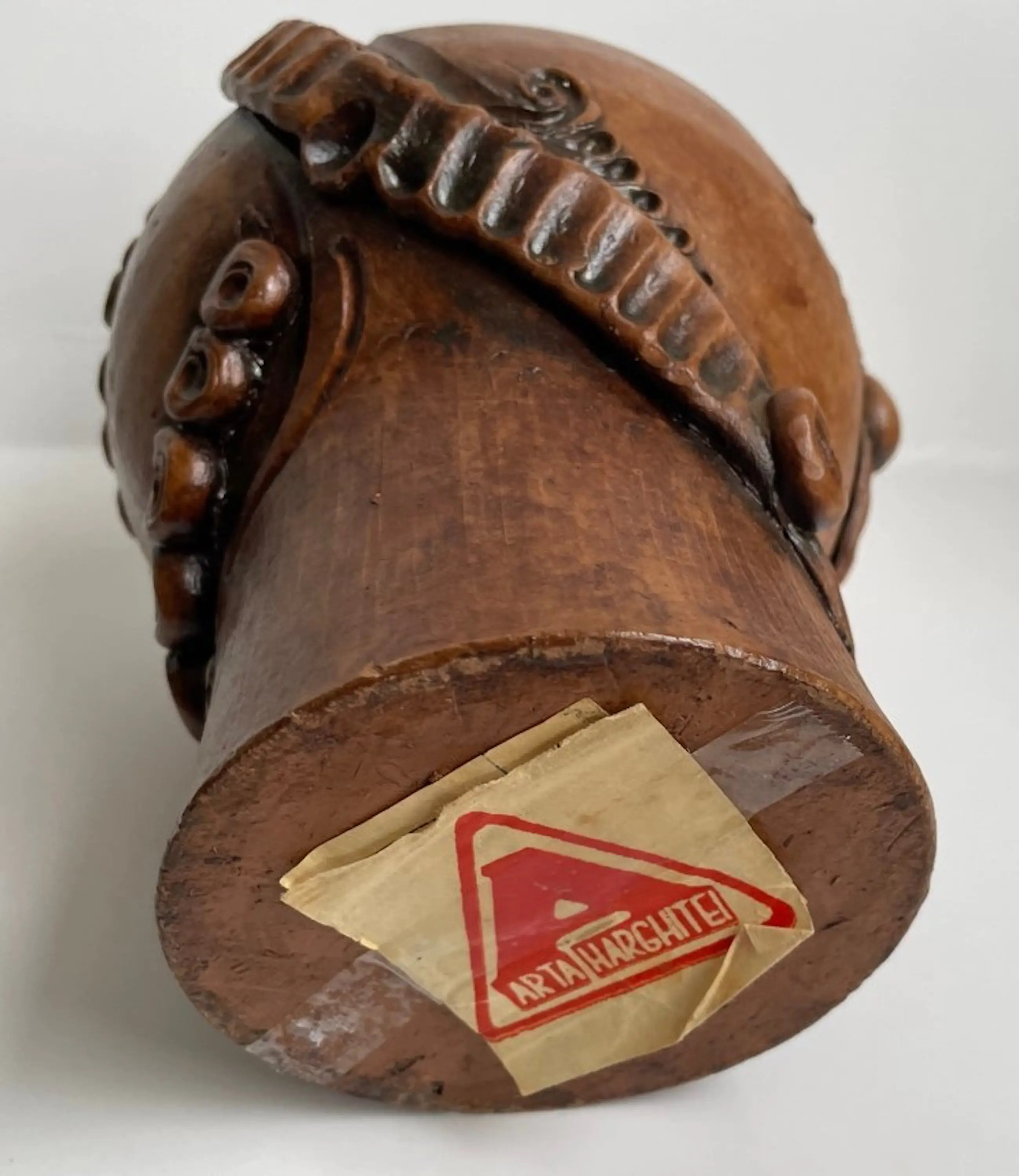 Kunst aardewerken fantasie figuur gemaakt in de jaren'60-'70 in Roemenie door Arta Harghitei. Voorzien van papieren label aan de onderzijde. Op de lip zit een klein chipje verder onbeschadigd.