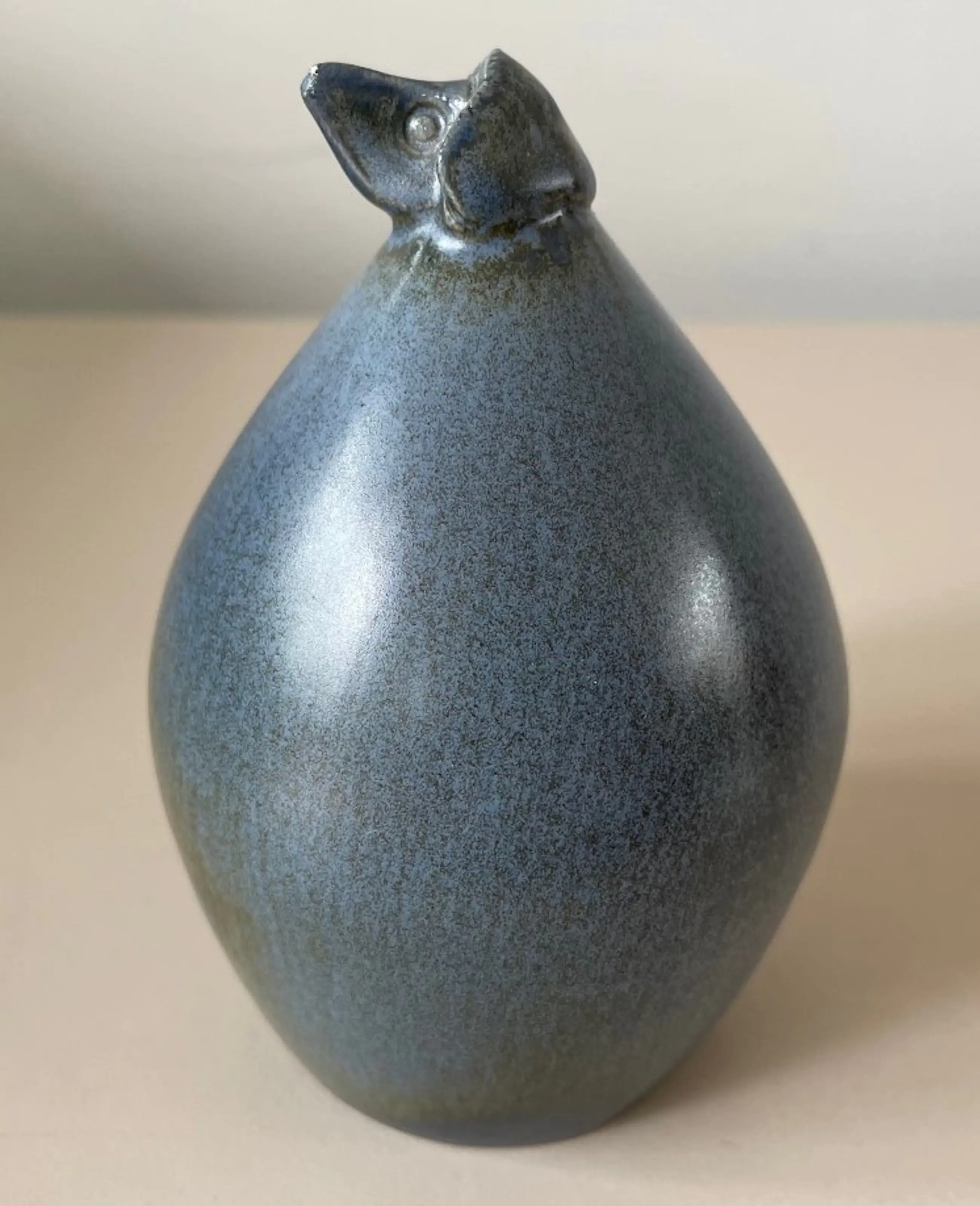 Kunst keramisch plastiek fantasie dier. In onbeschadigde conditie. voorzien van een gesloten blindmerk van een papegaaiduiker. Kunstenaar of keramist onbekend.
