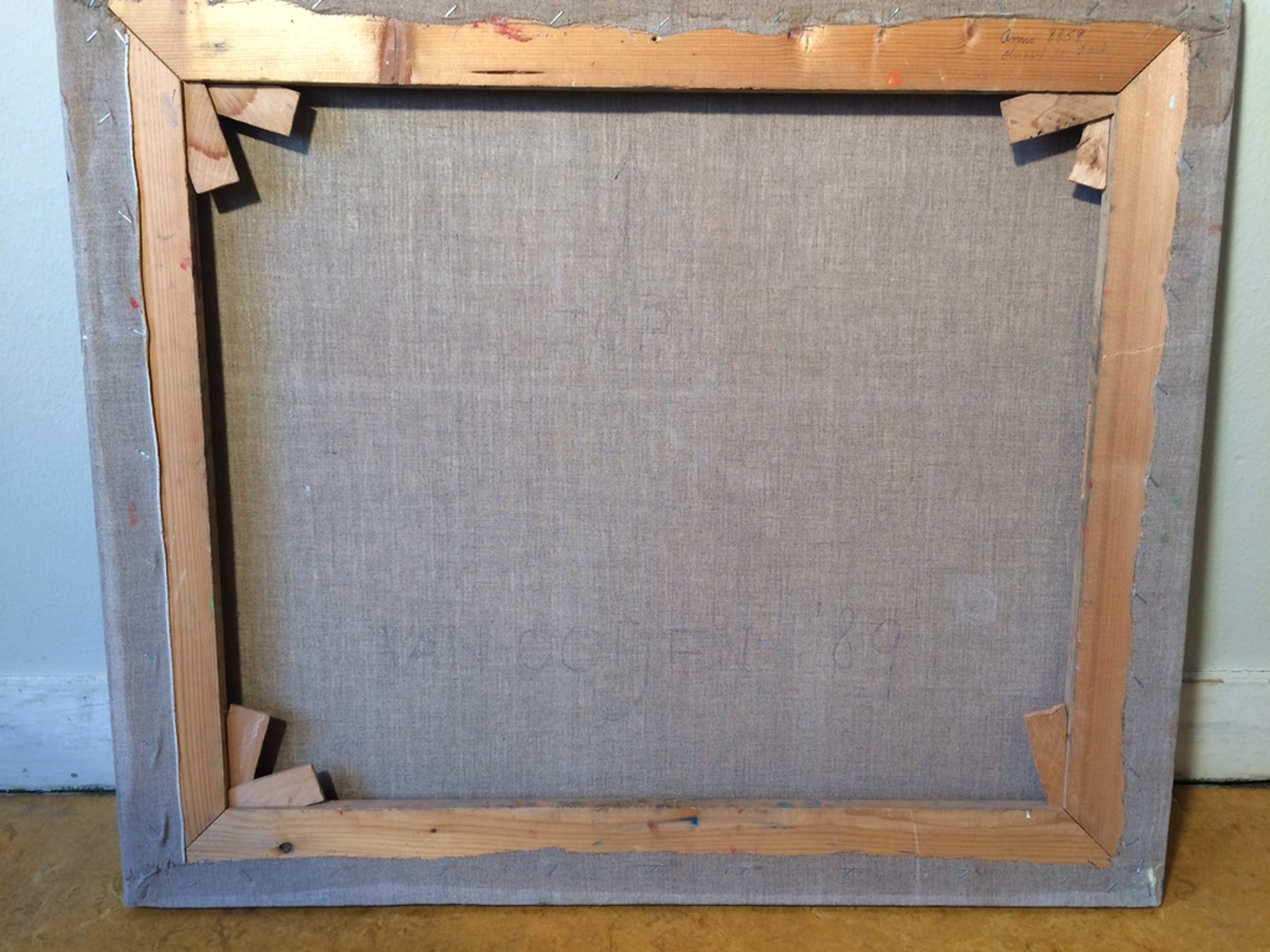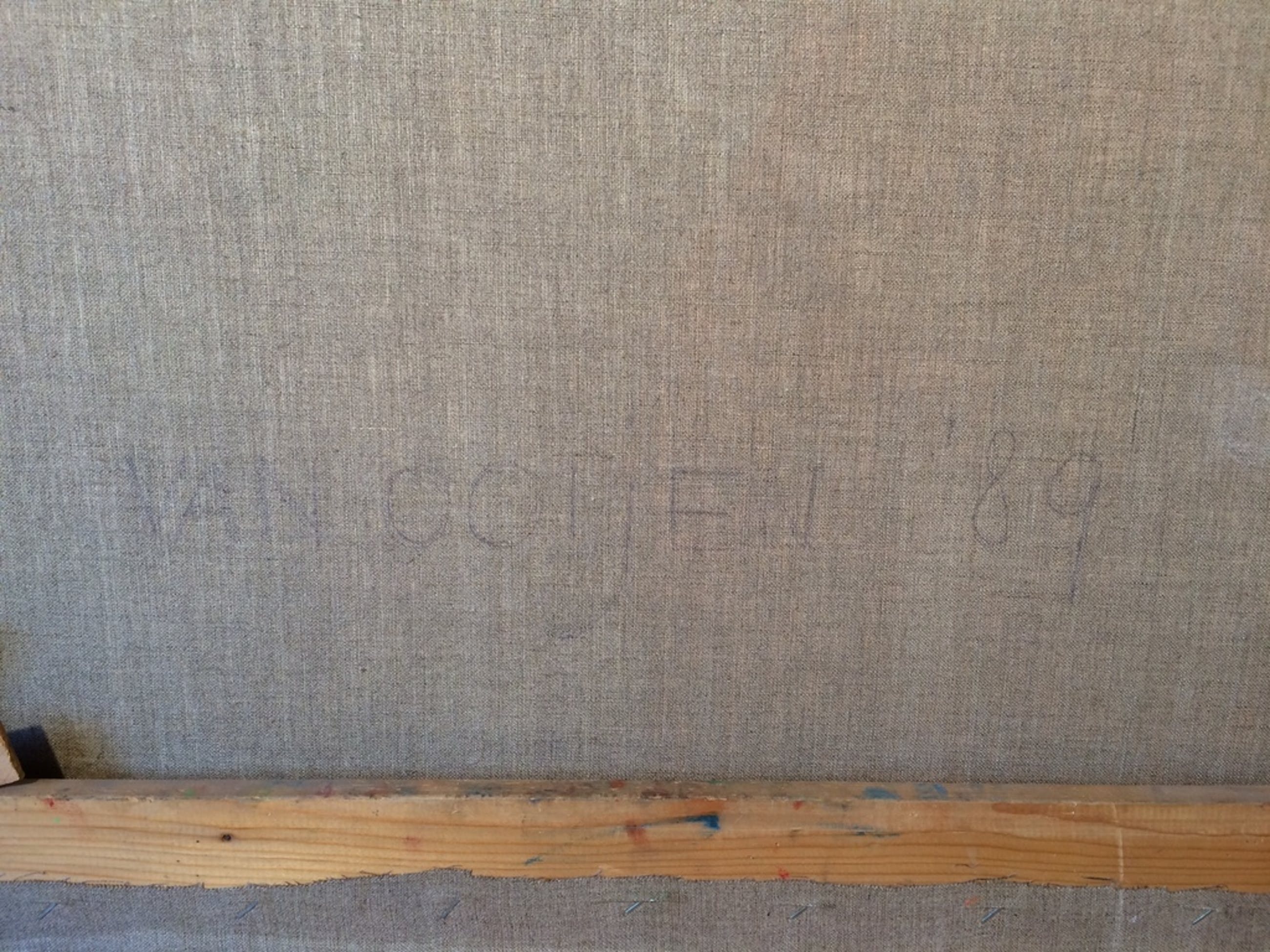 Olie op doek, aan de achterkant gesigneerd met 'van Ooijen' echter onduidelijk welke van Ooijen dit is. Naast de naam is er ook vermelding van een jaartal namelijk '89. Het werk is in de rechterbovenhoek niet goed gespannen. Daarnaast heeft het werk 2 kleine beschadigingen, zie foto's.