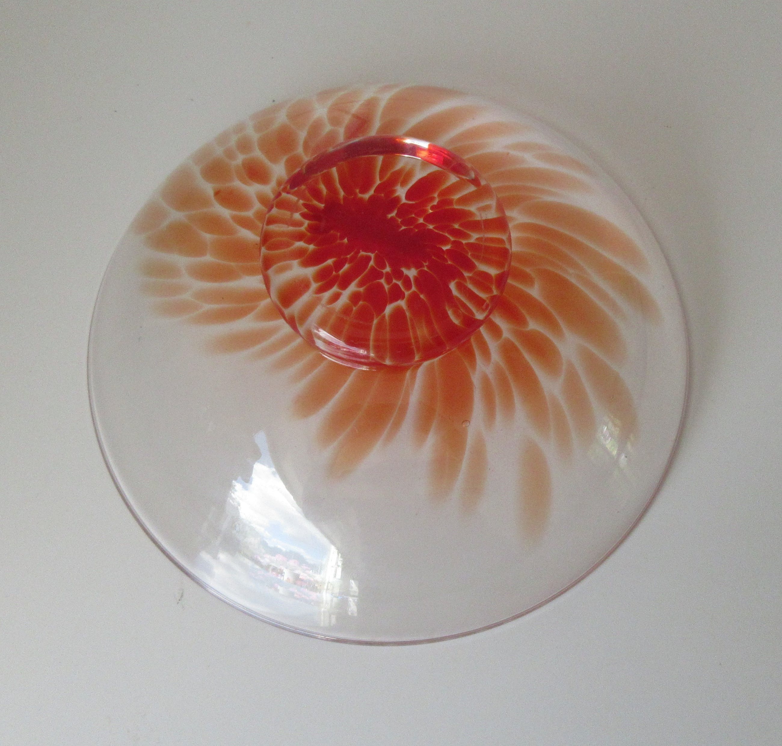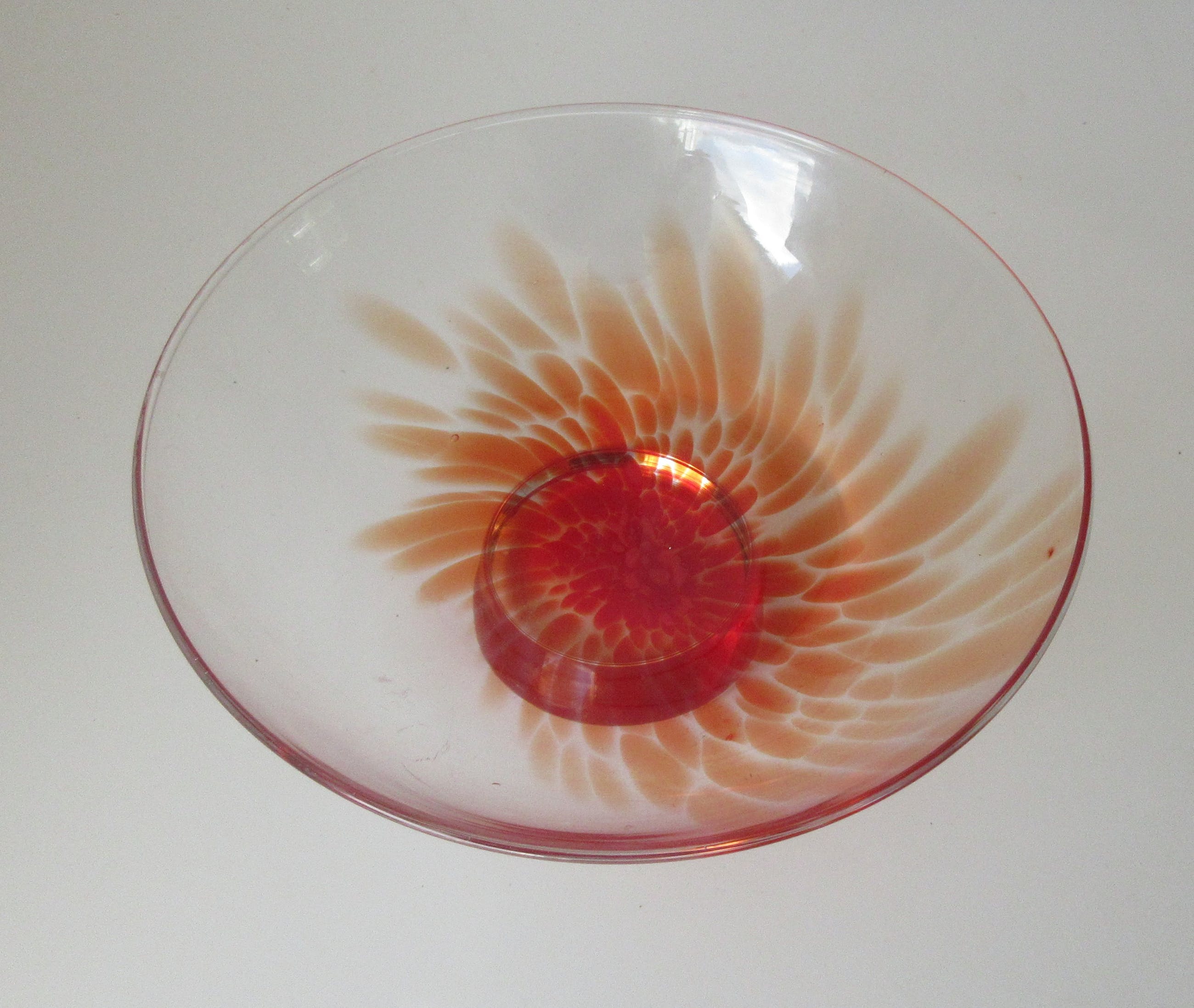 Kunstglazen schaal op voet met rode en oranje glaspoeders. Niet gemerkt of gesigneerd, maar zeer goed mogelijk in Scandinavie, Italie of Bohemen gemaakt.